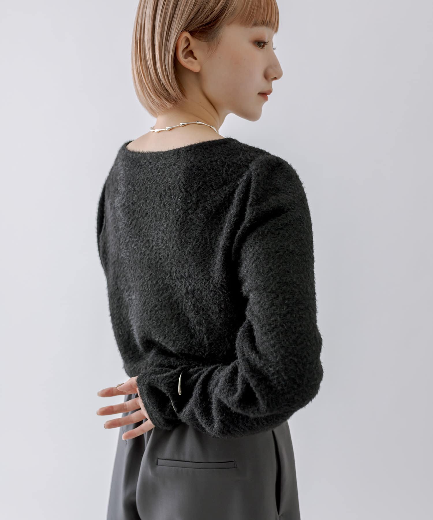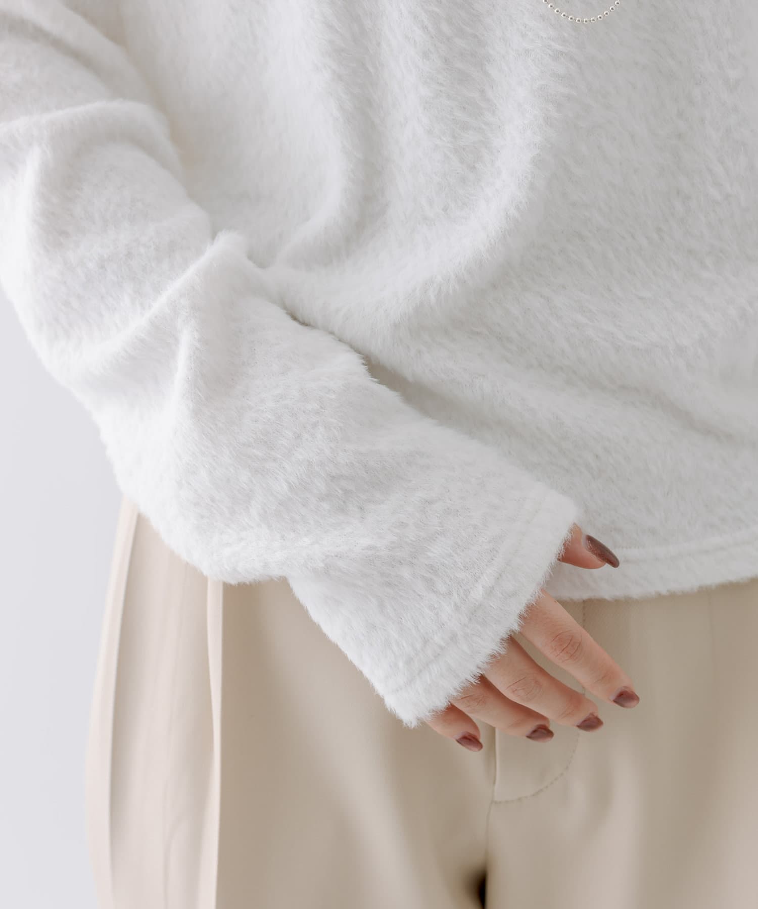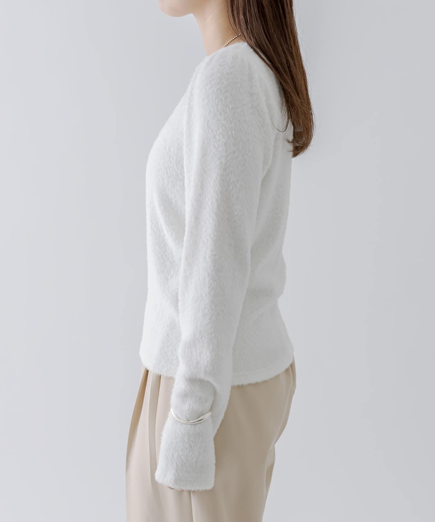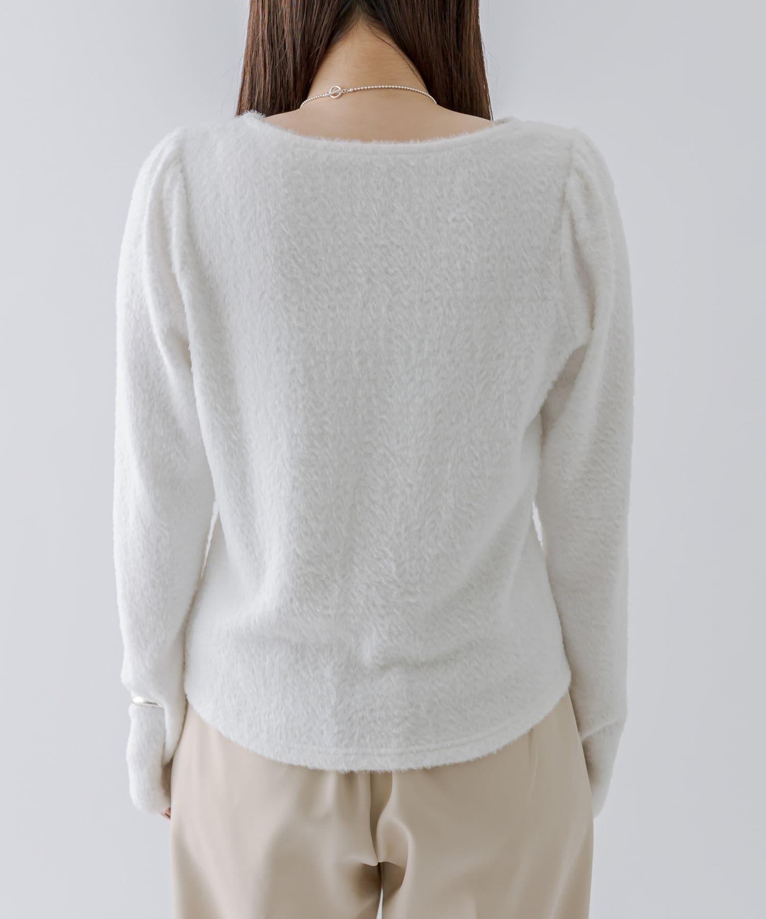 シャギー素材がスタイリングを華やかに見せてくれるシンプルトップス。