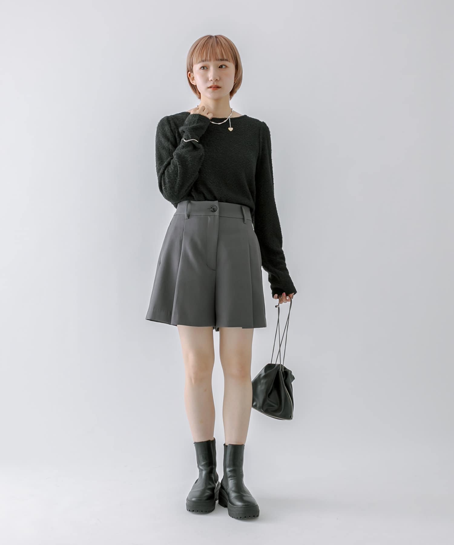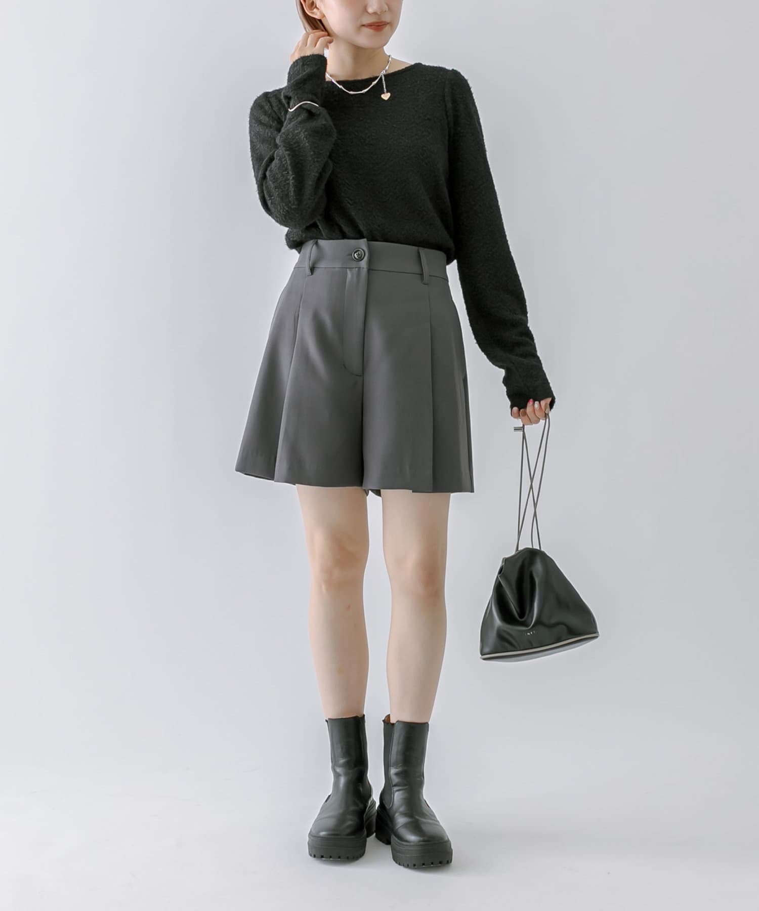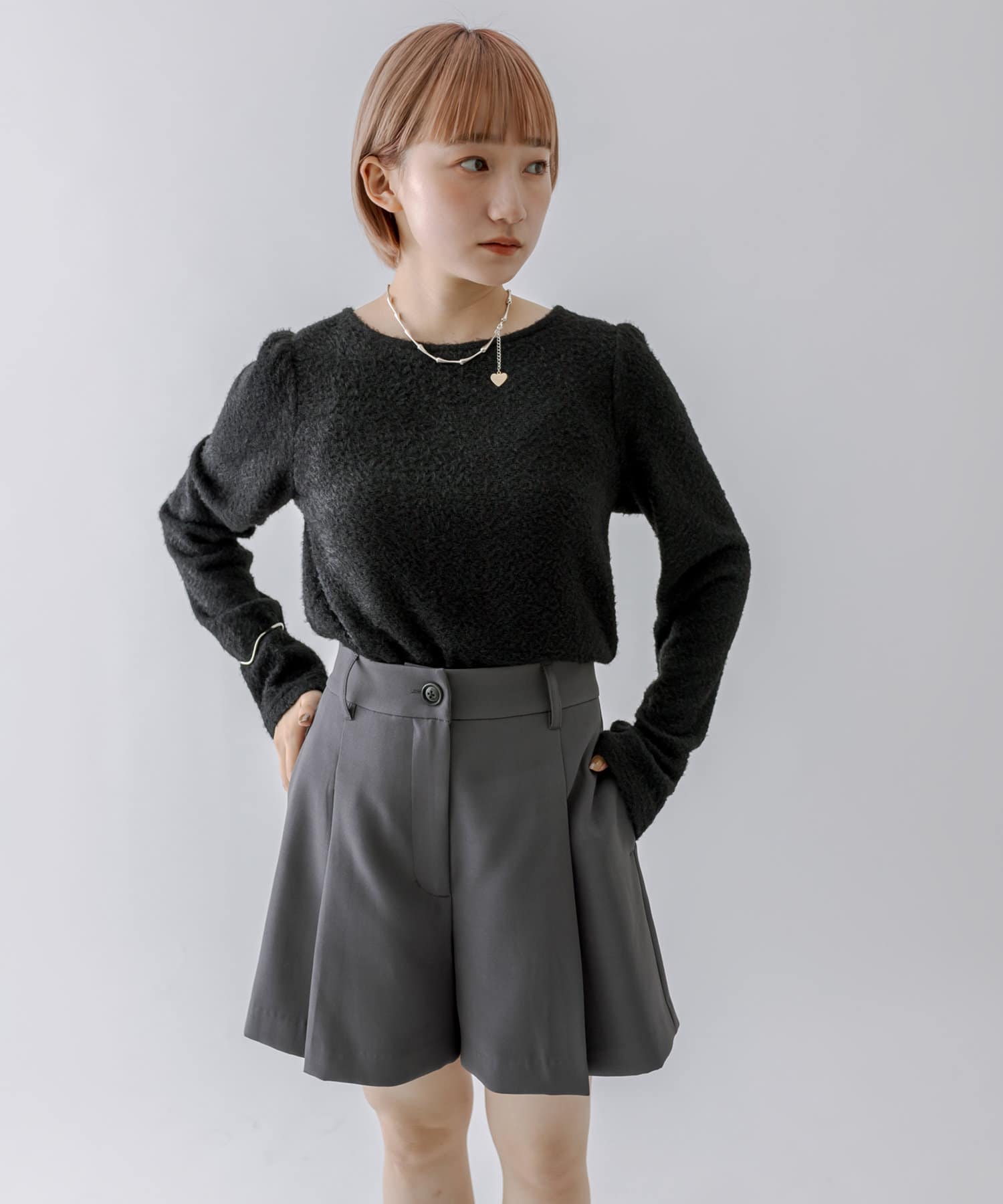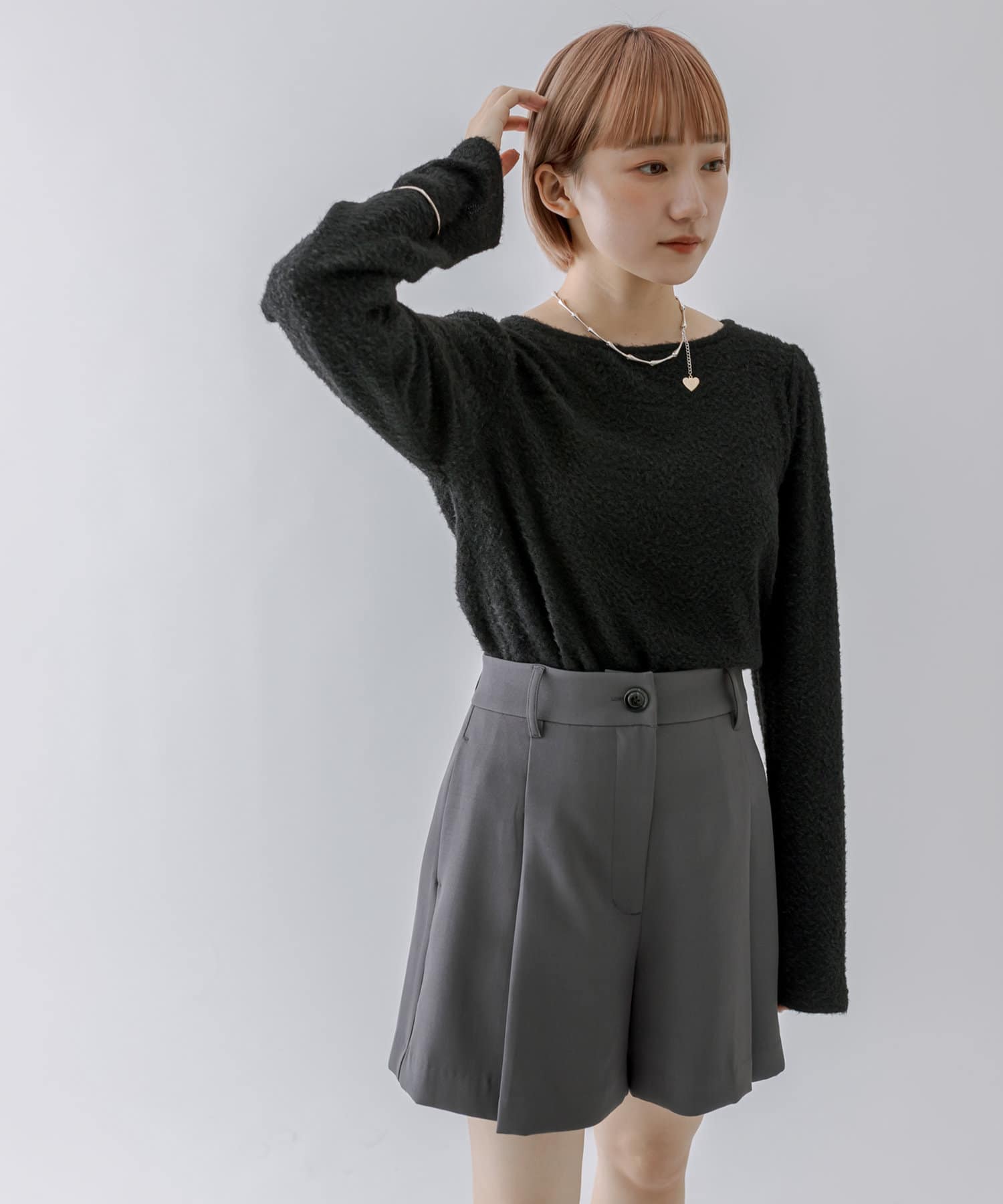 シャギー素材がスタイリングを華やかに見せてくれるシンプルトップス。