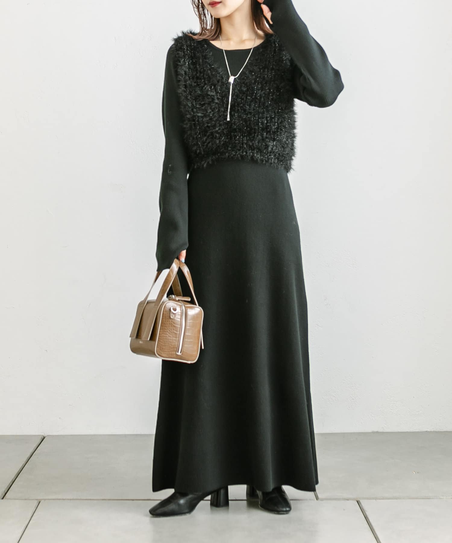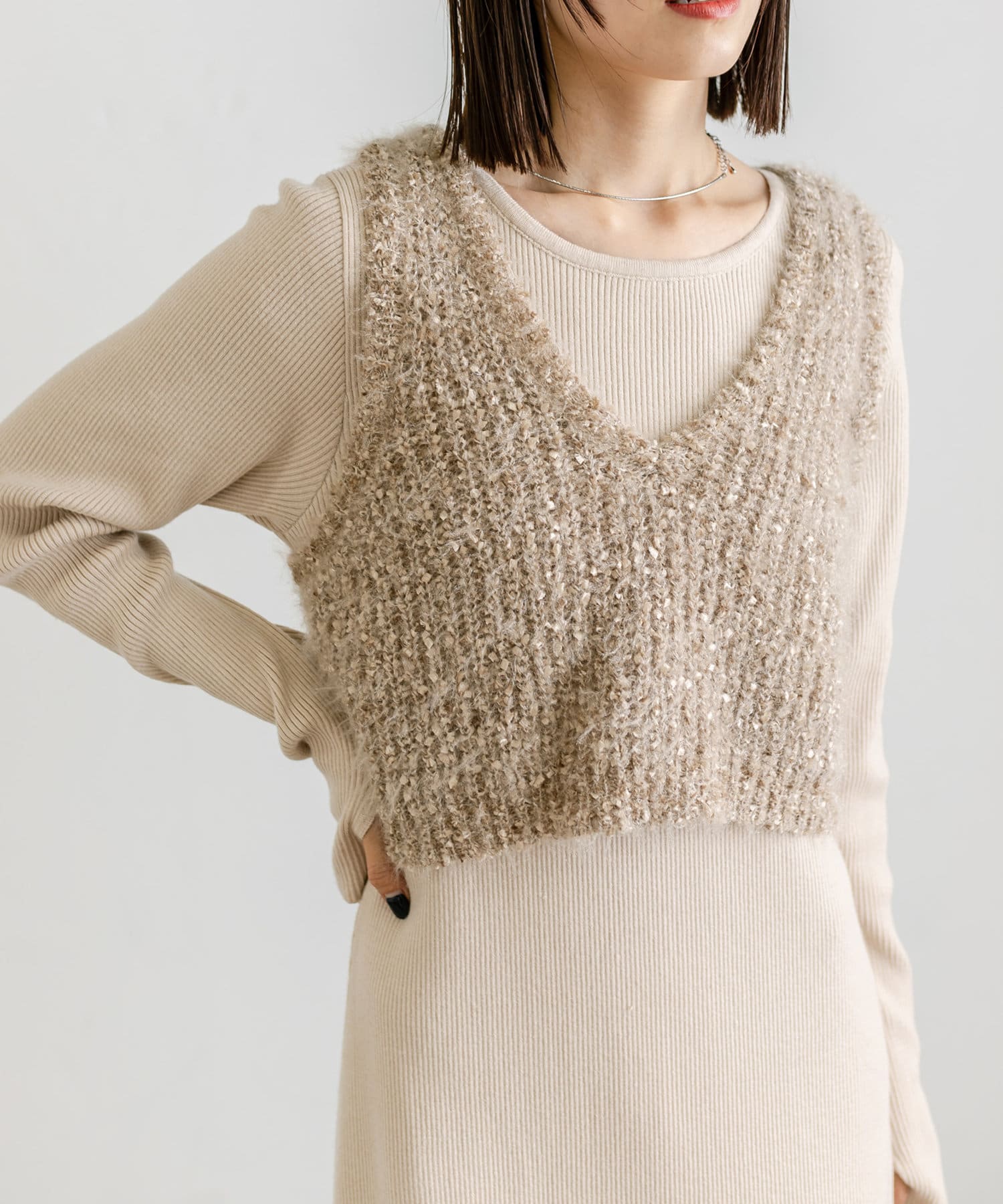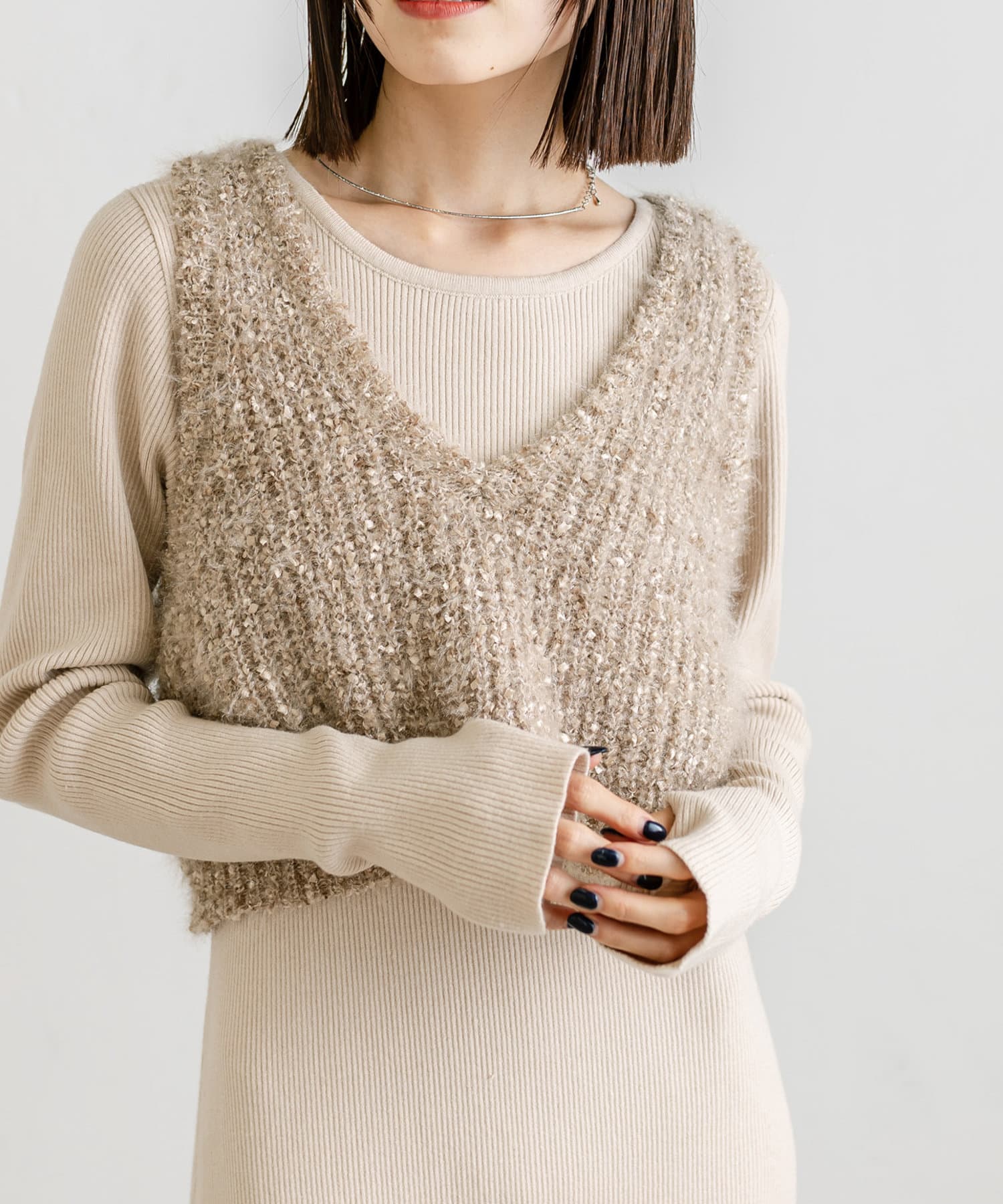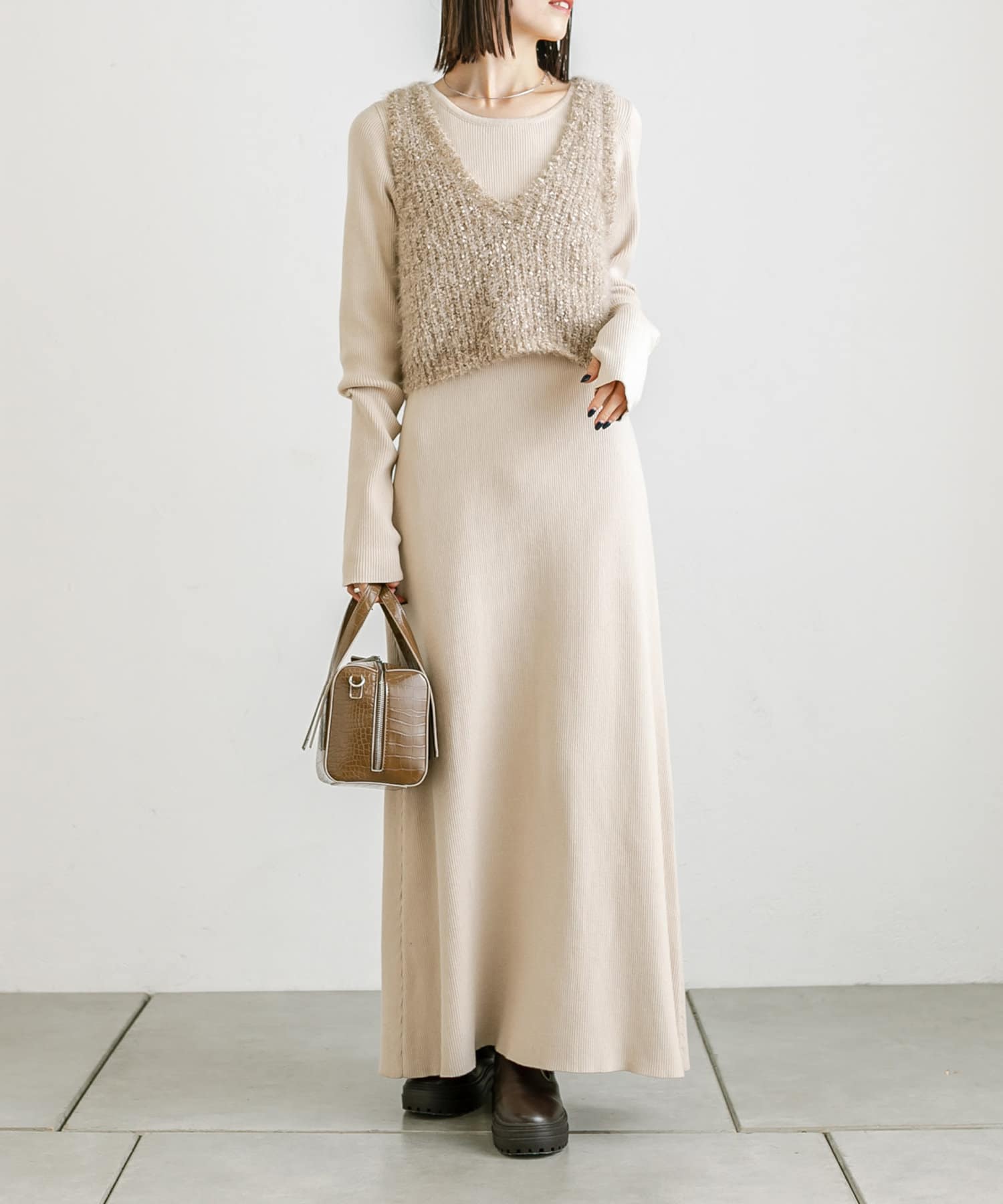 ・スタイルアップのリブワンピースとラメのニットベストがセットになったアイテム。