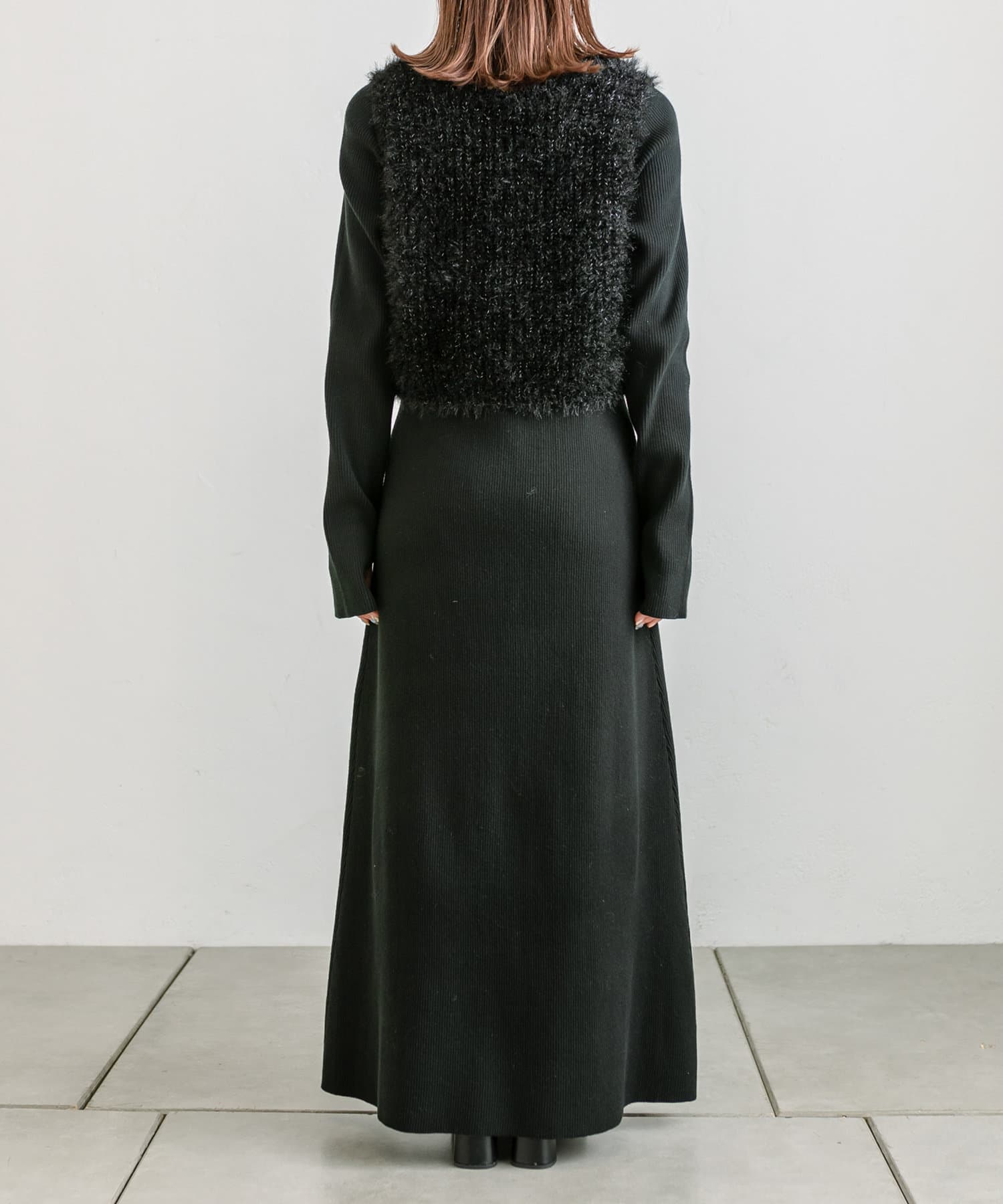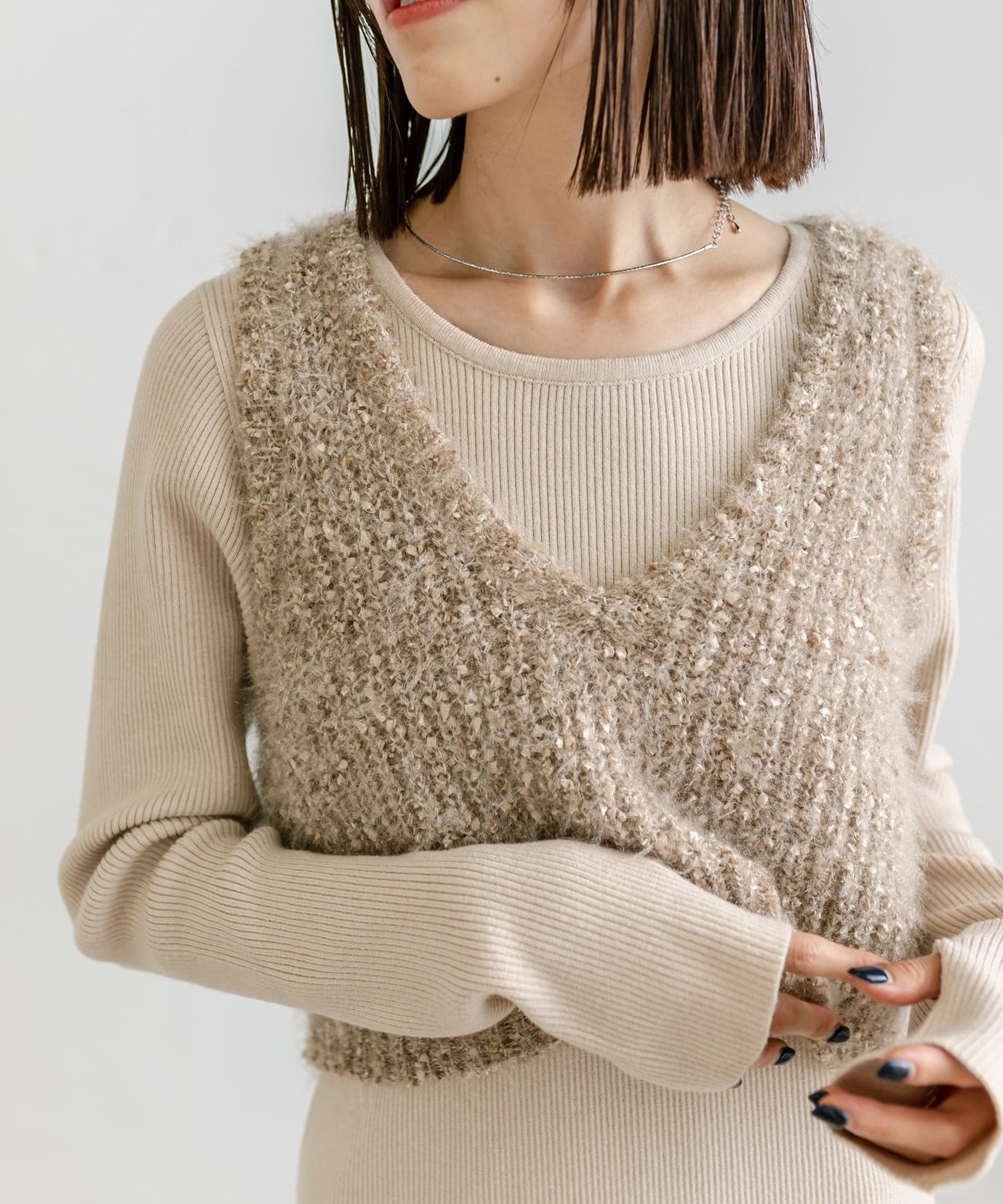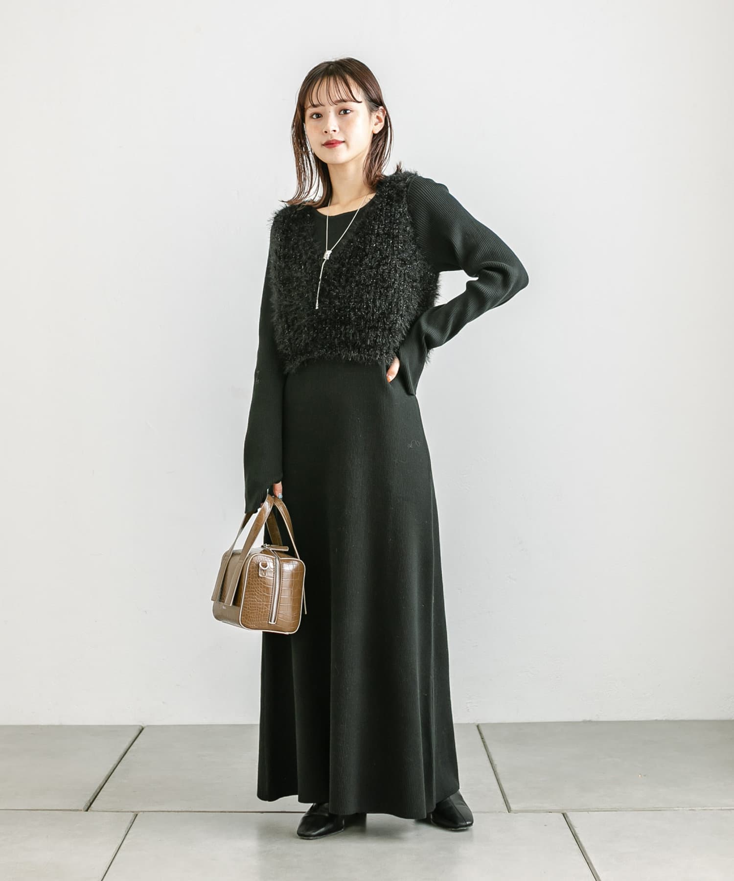 ・スタイルアップのリブワンピースとラメのニットベストがセットになったアイテム。
