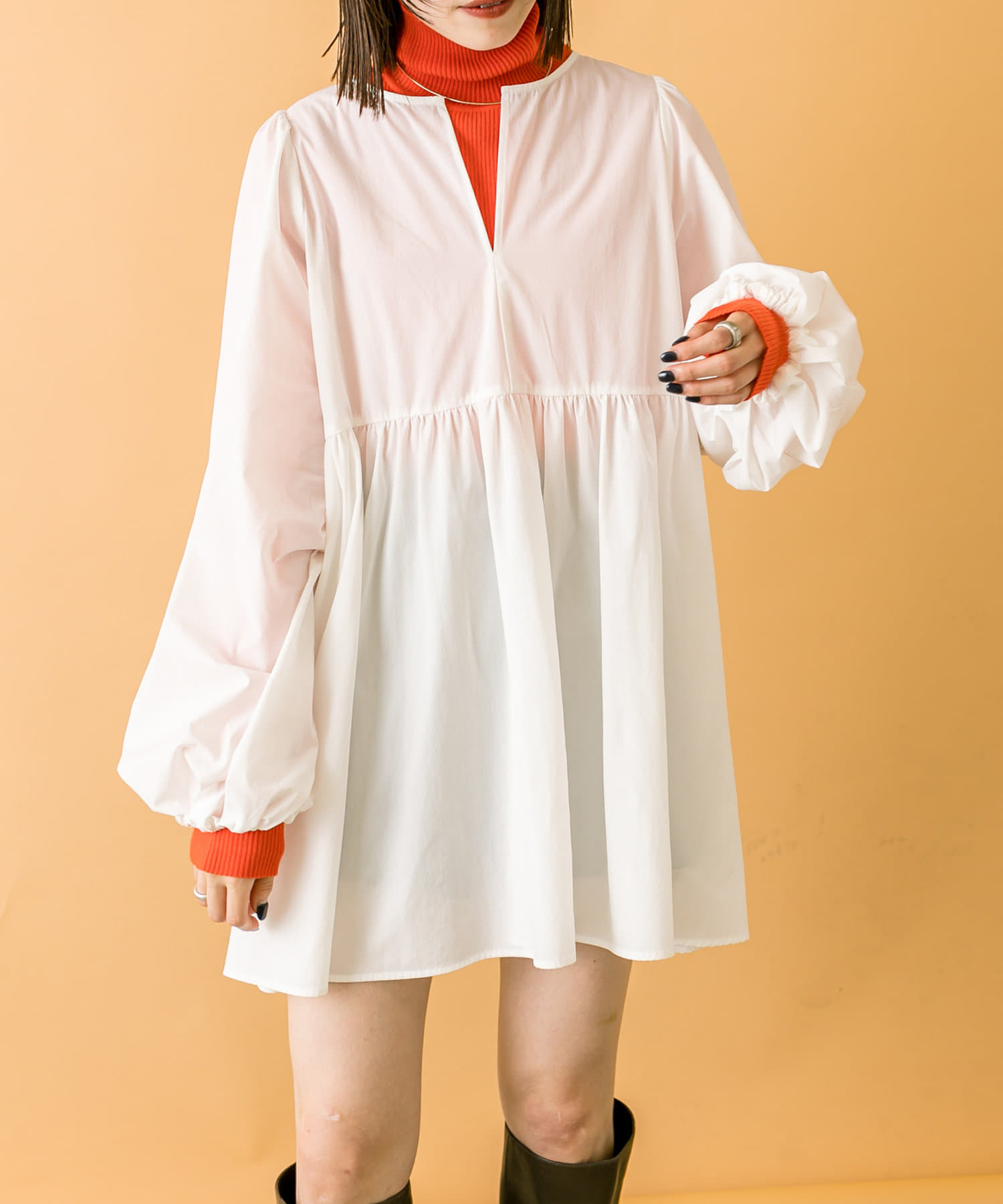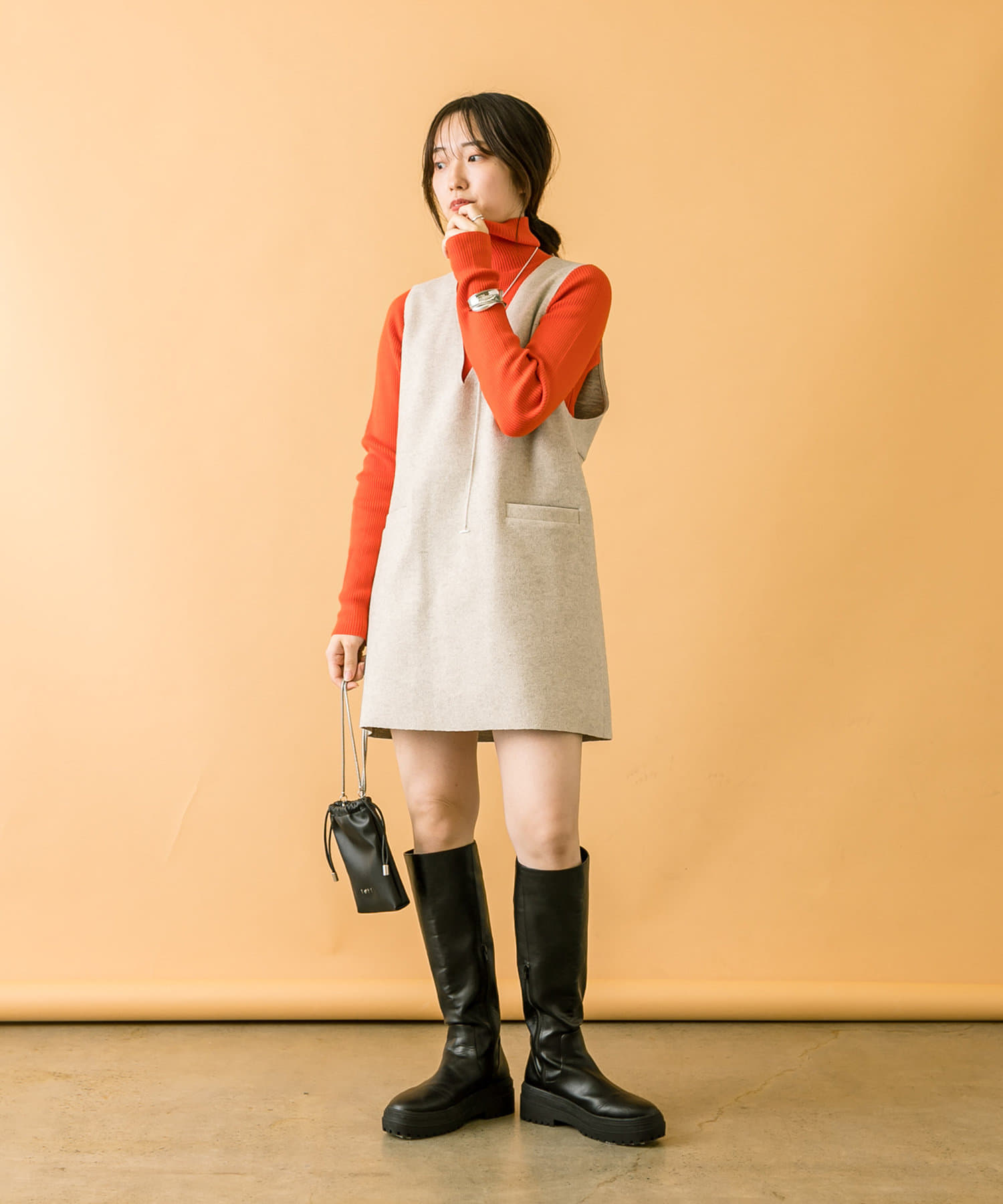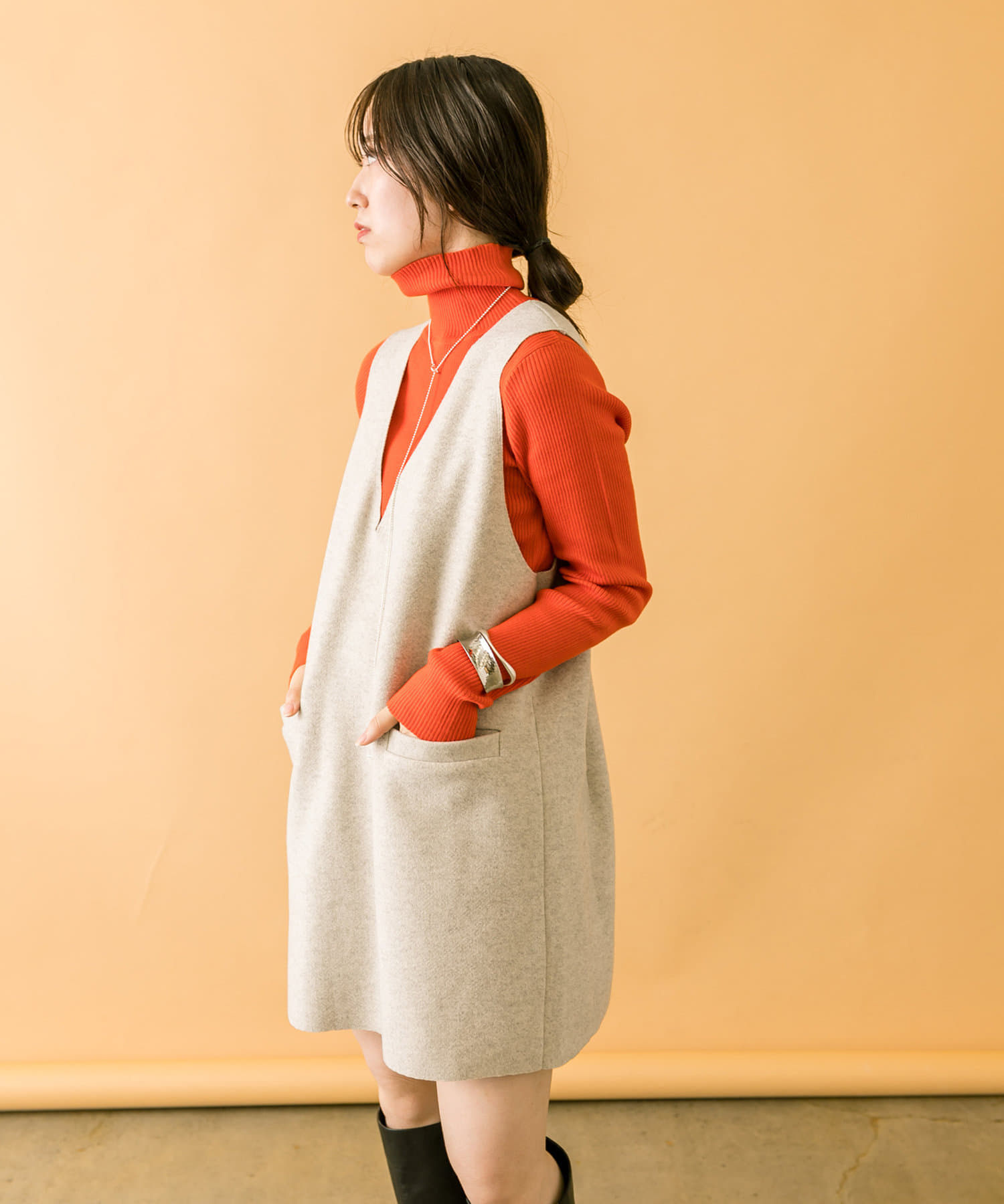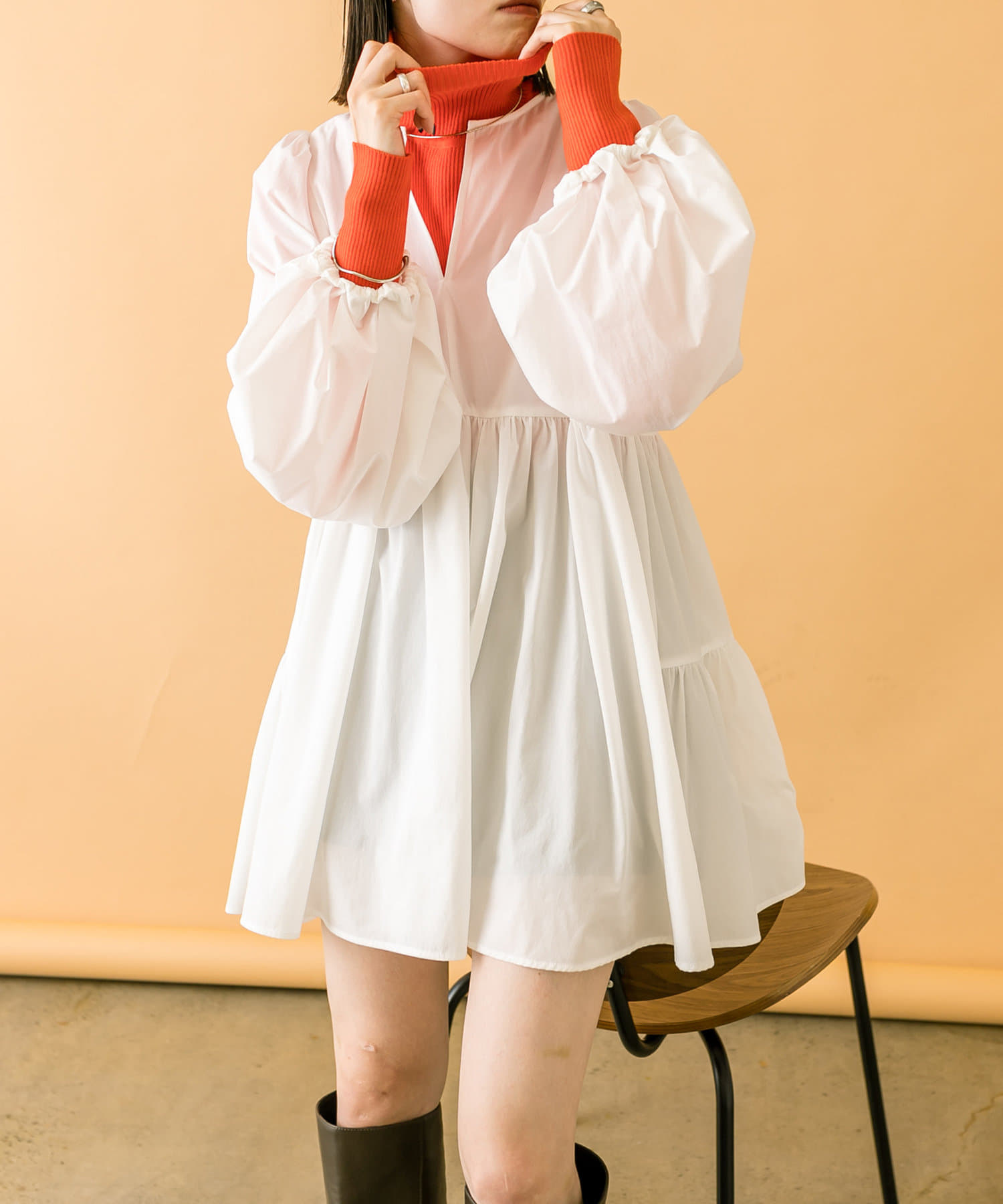 落ち着いたアイボリーのミニワンピに、目を惹くオレンジのタートルニットをプラスしたセット。