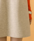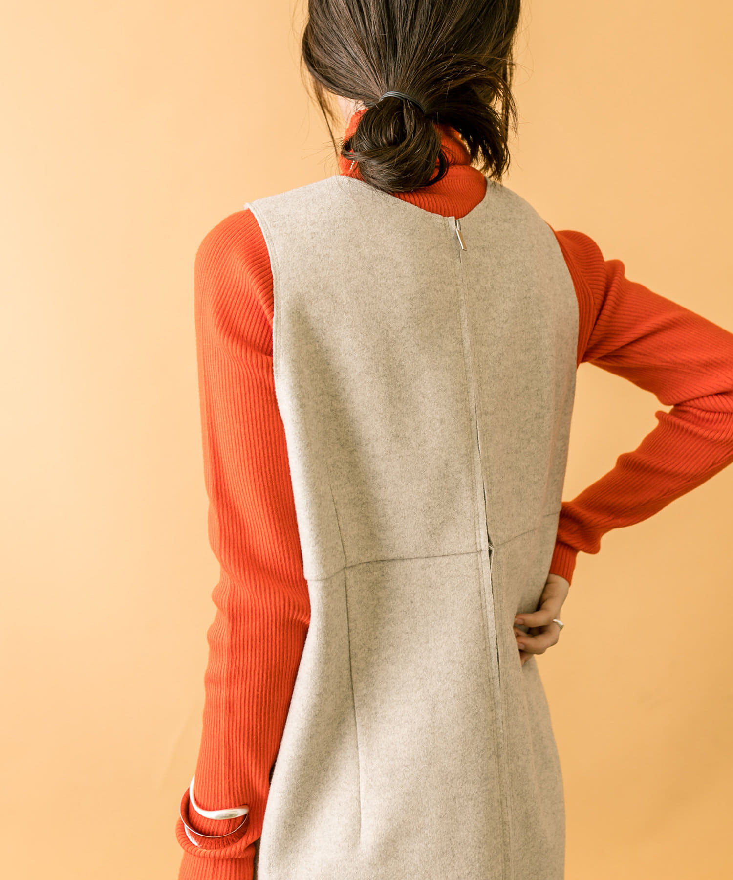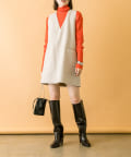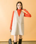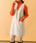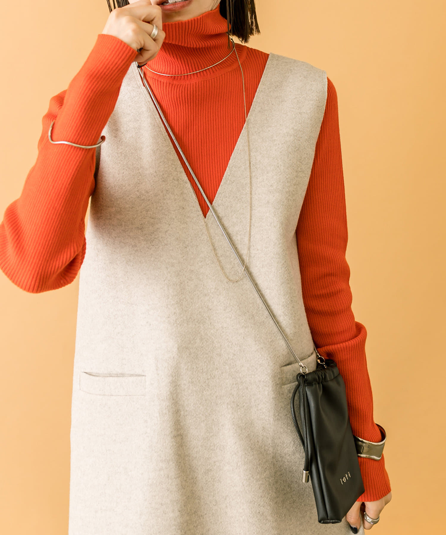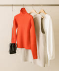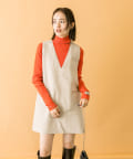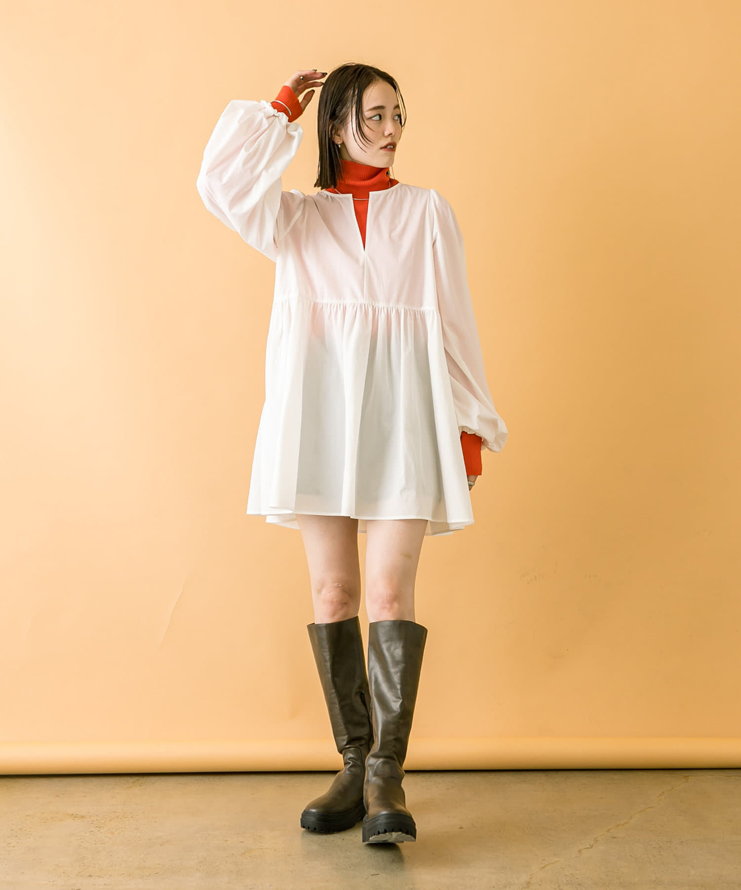 落ち着いたアイボリーのミニワンピに、目を惹くオレンジのタートルニットをプラスしたセット。