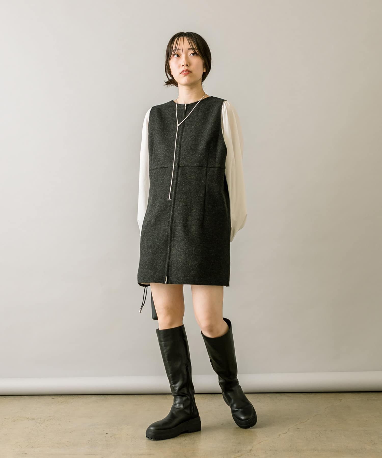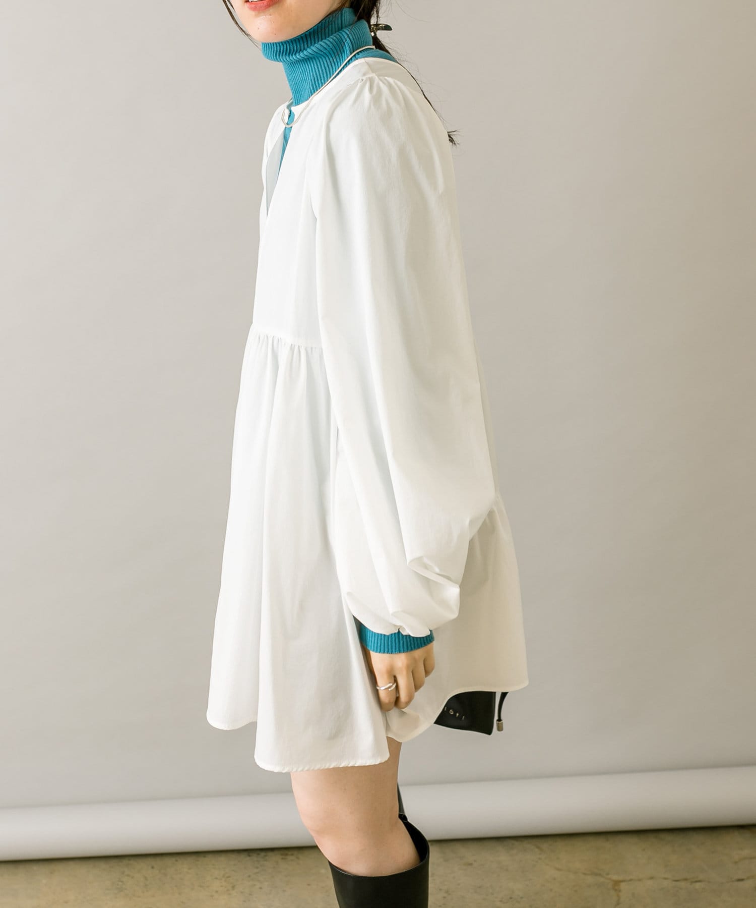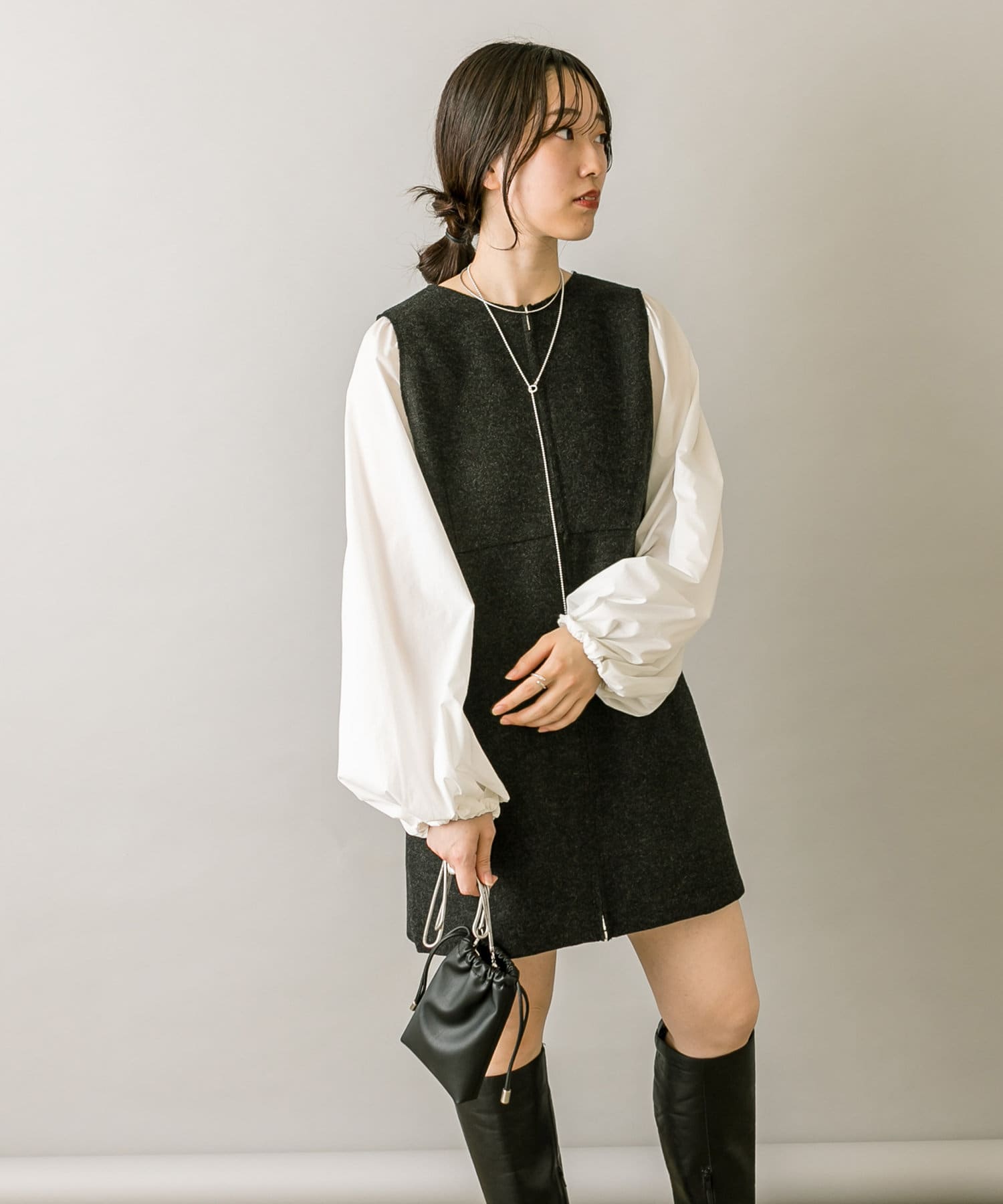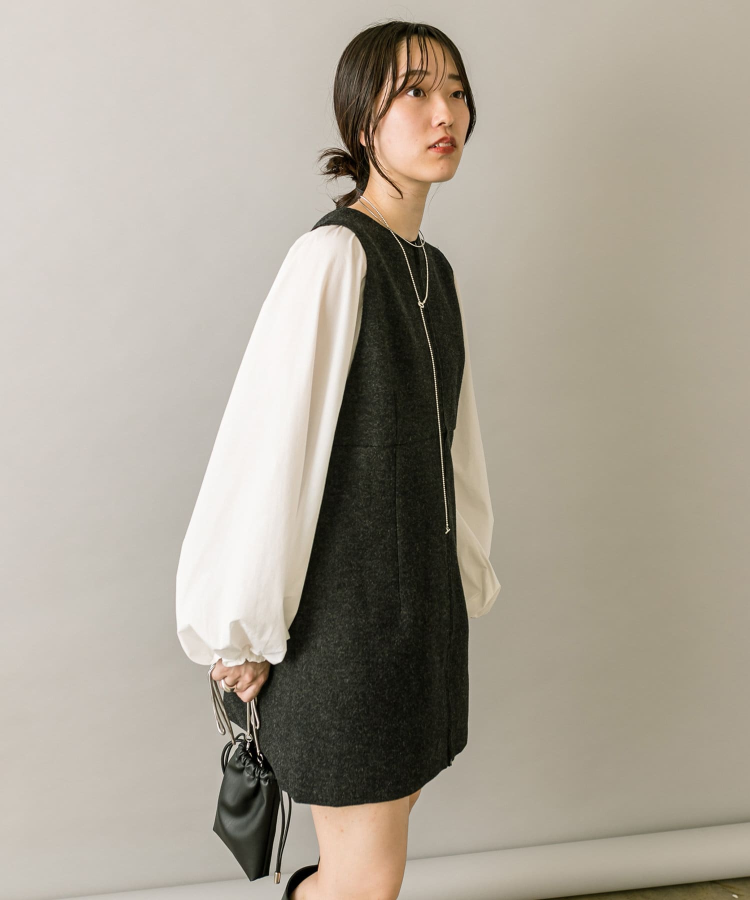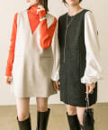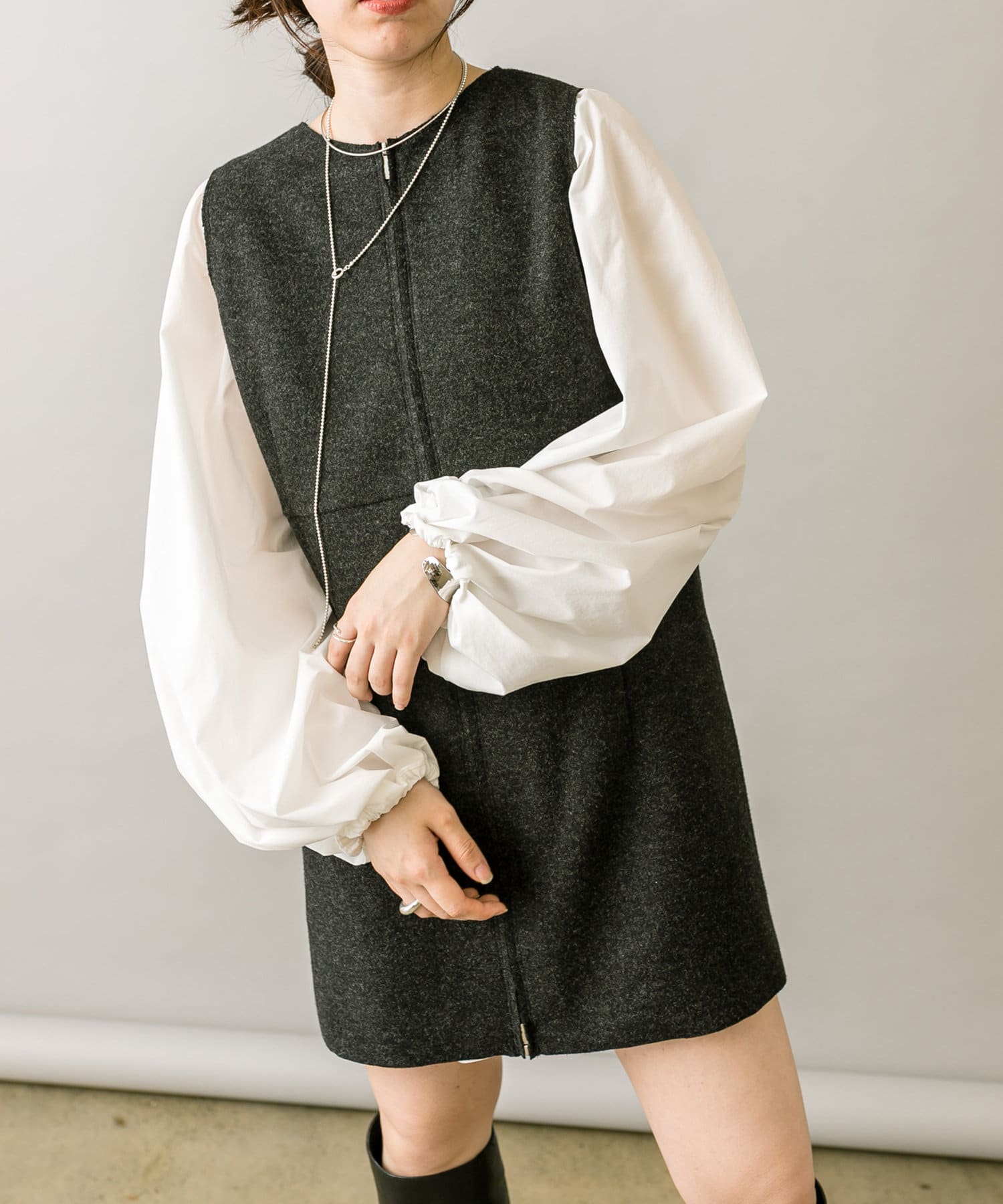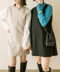 ミニワンピは前後両前で着用できるため、合わせるアイテムによって変えることで様々な雰囲気をお楽しみいただけます。