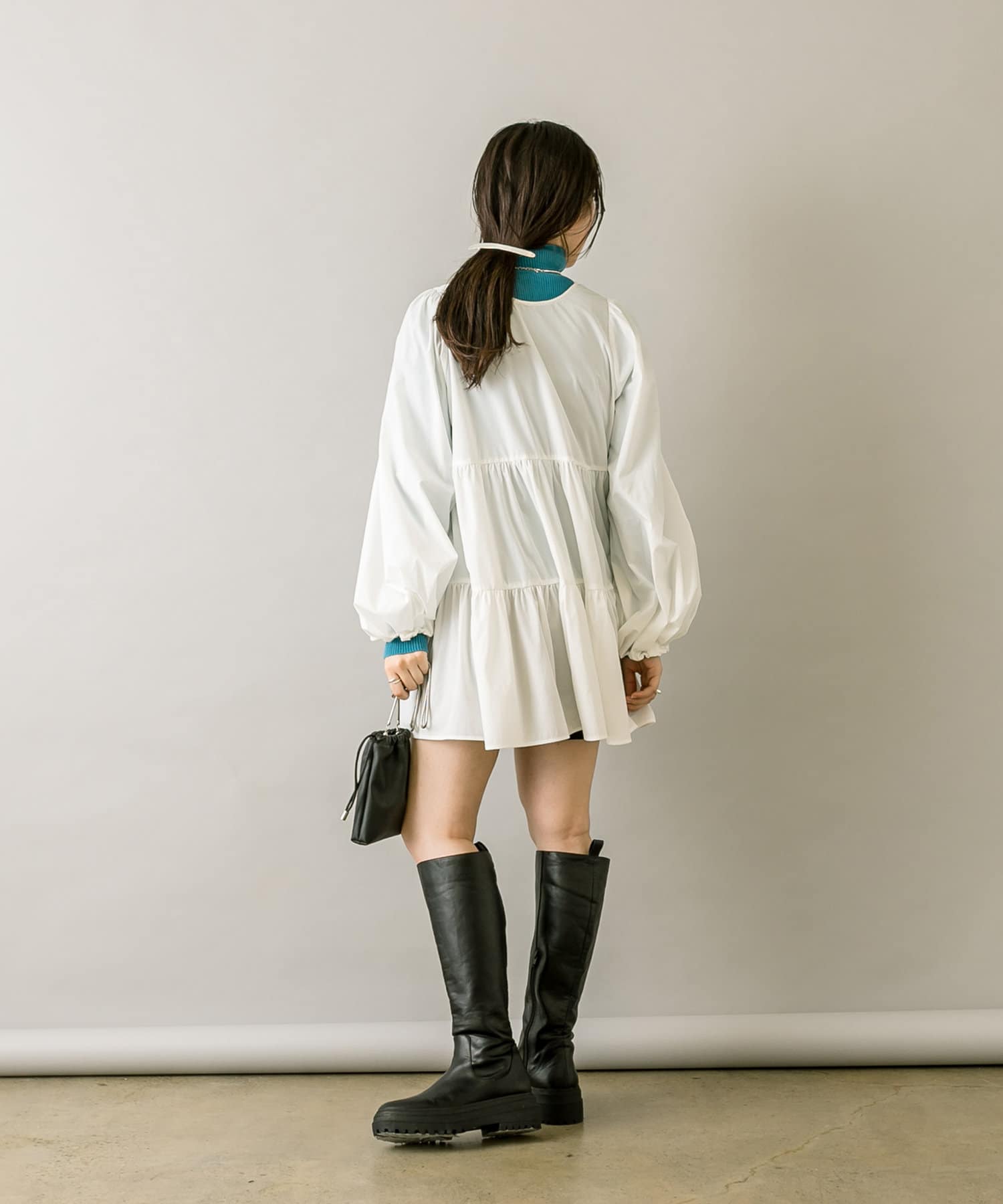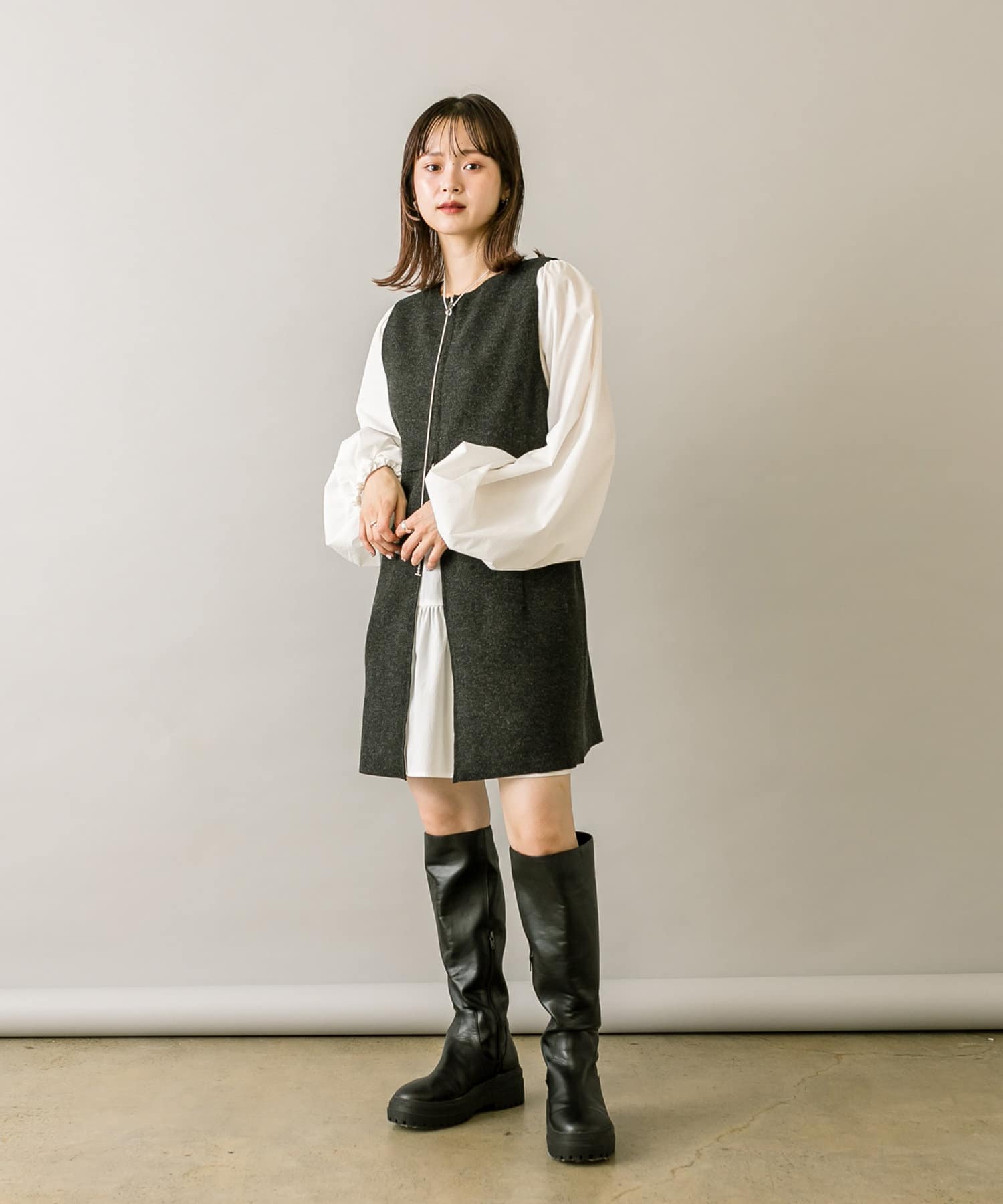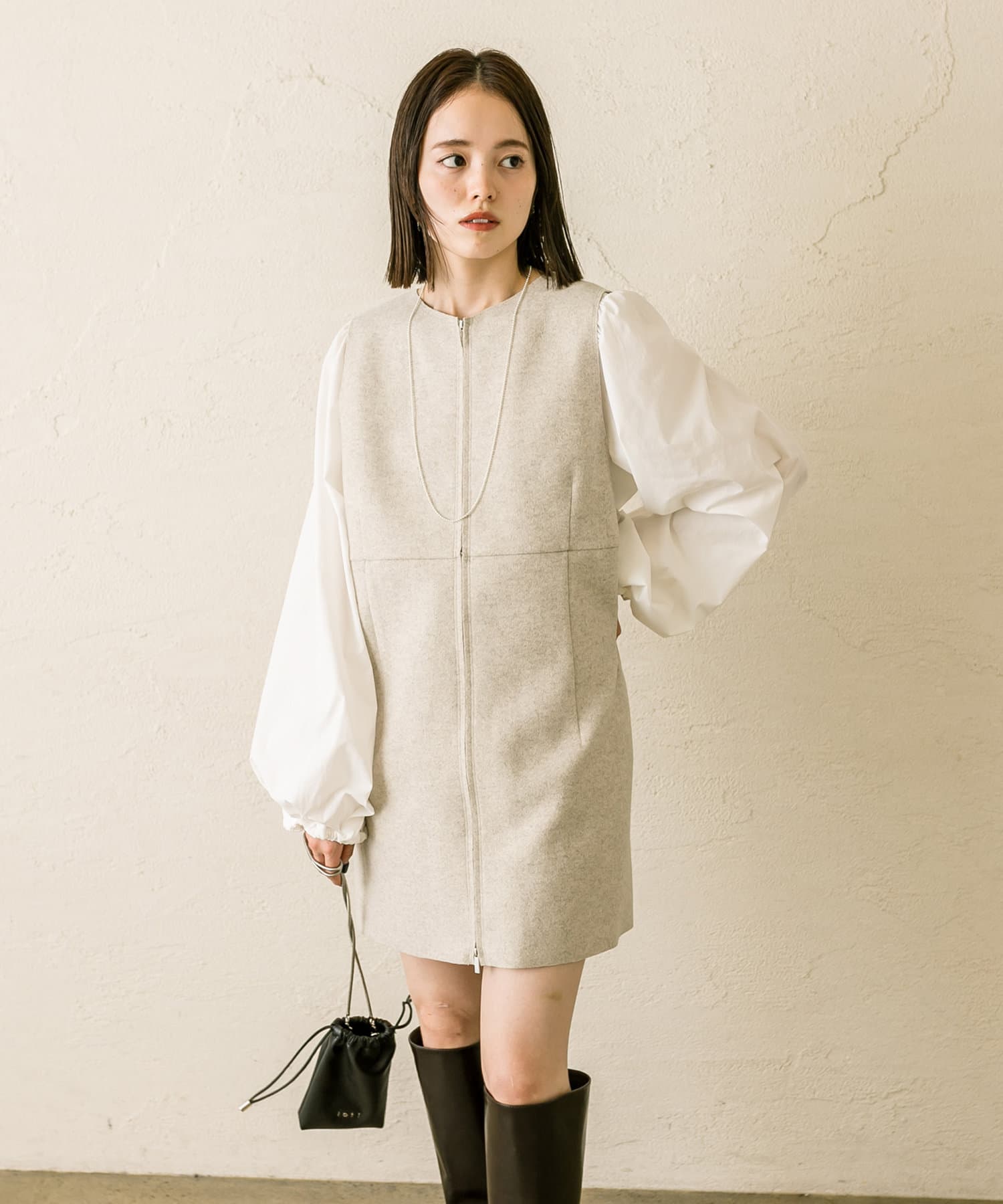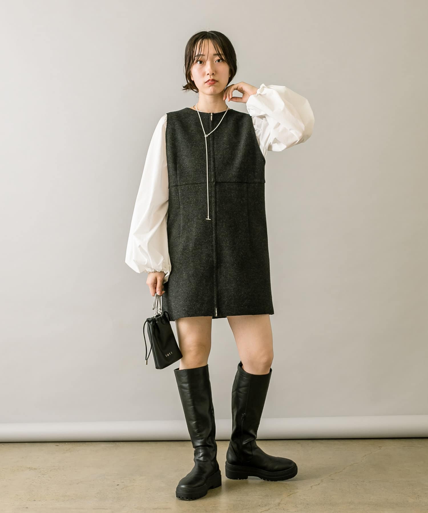 ミニワンピは前後両前で着用できるため、合わせるアイテムによって変えることで様々な雰囲気をお楽しみいただけます。