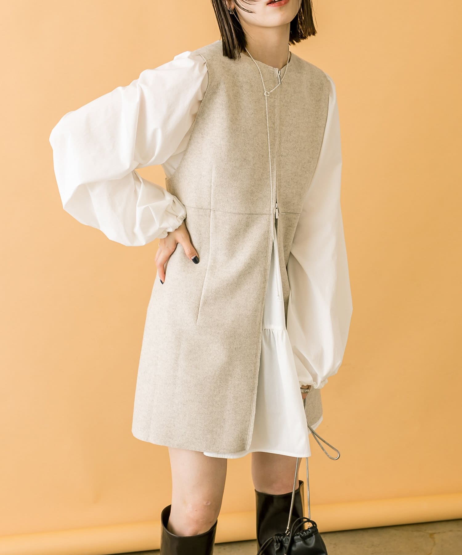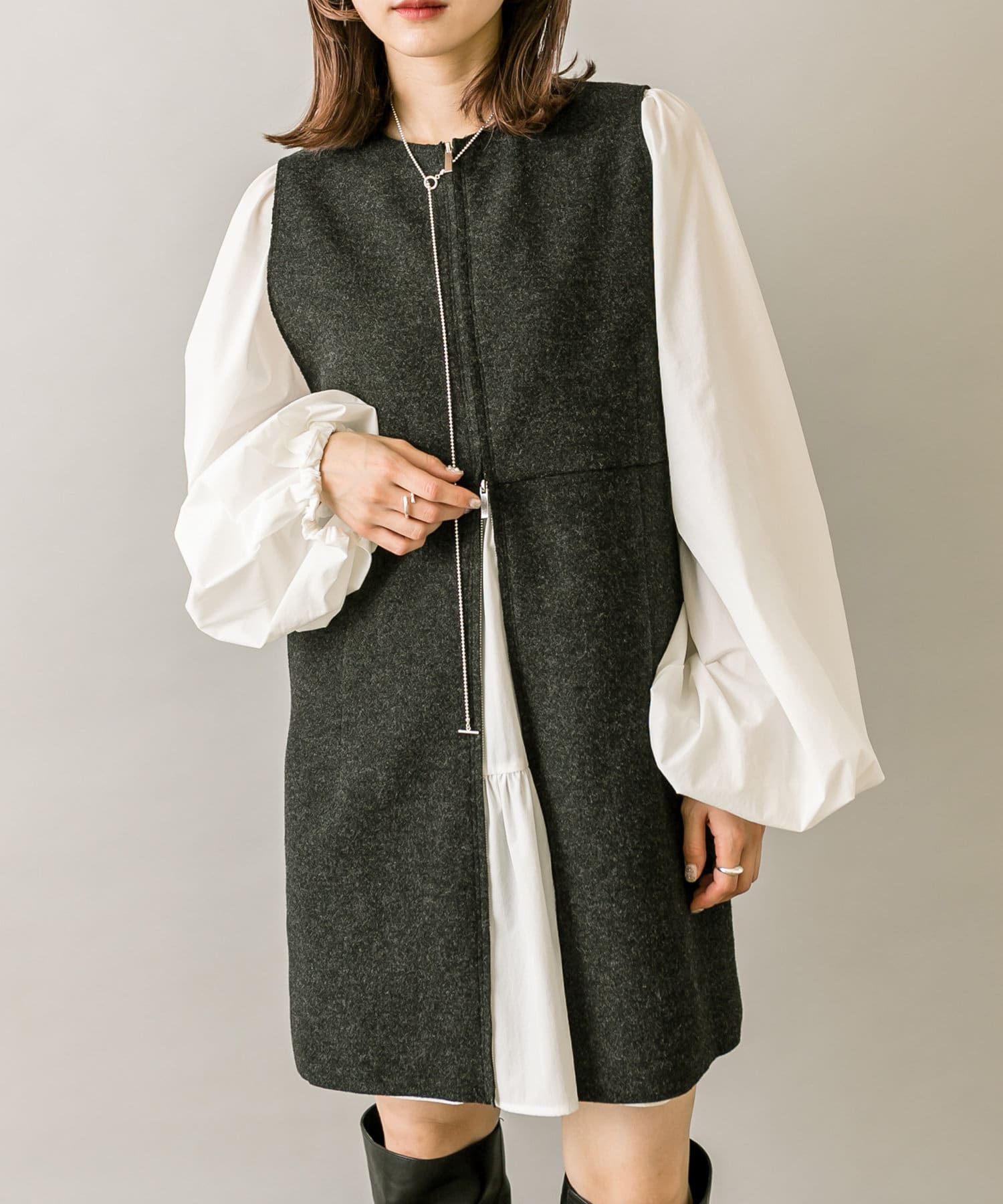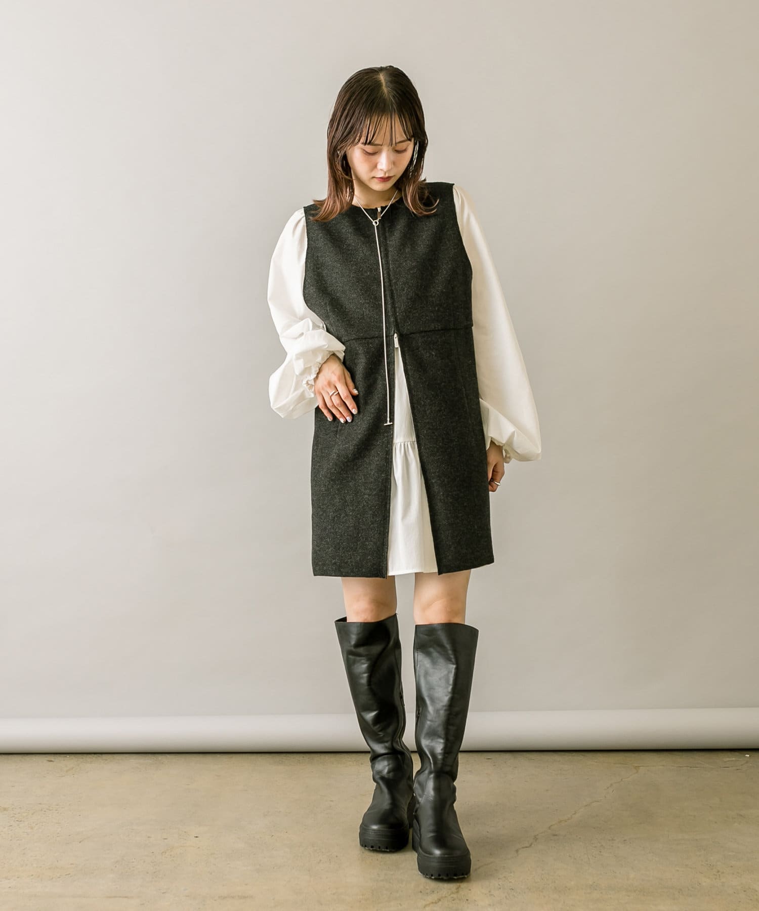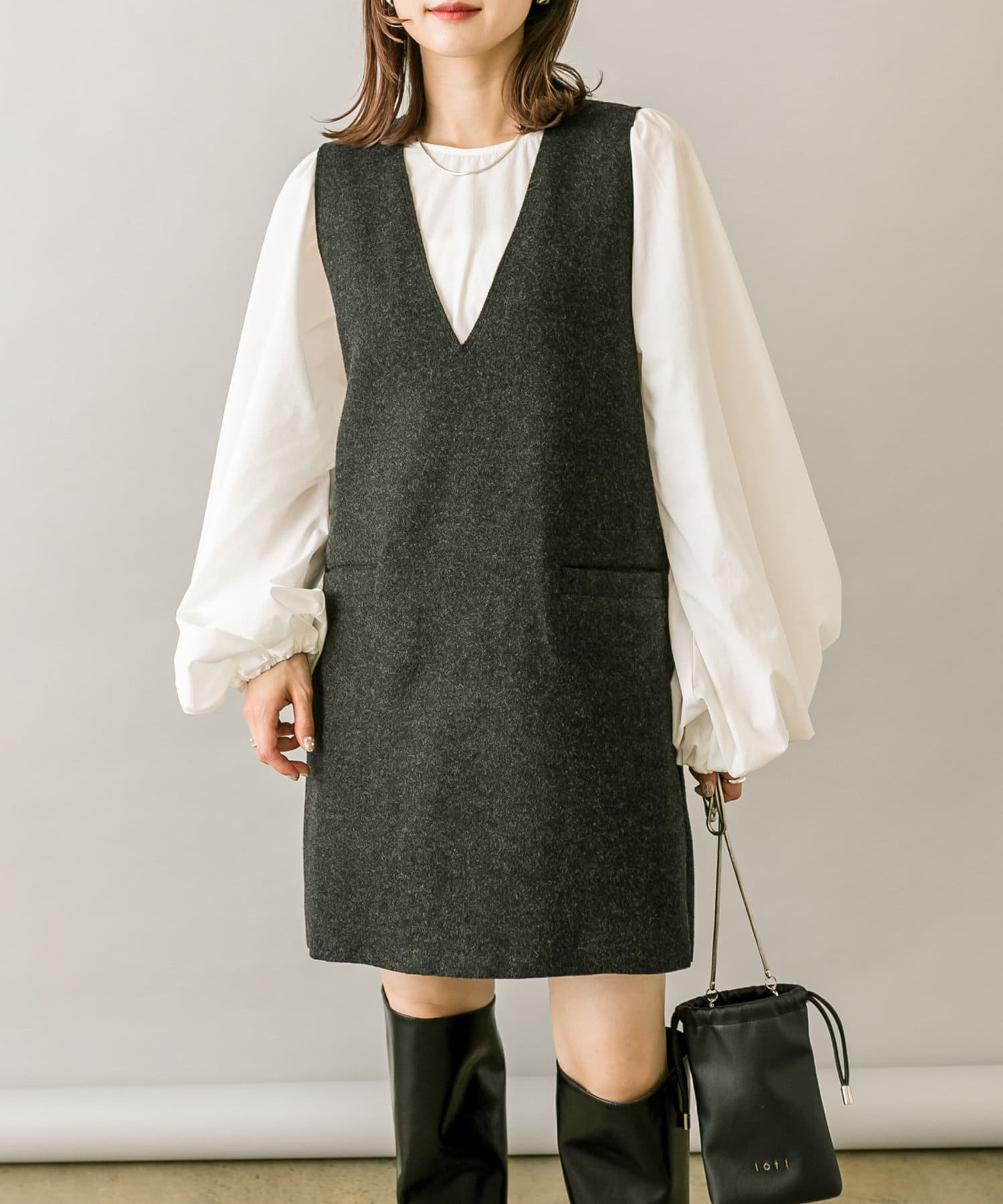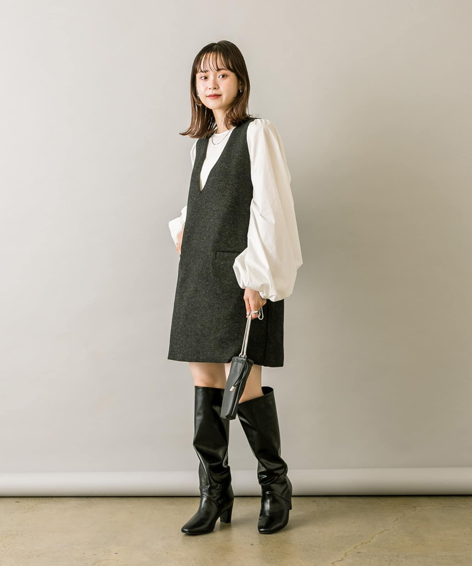 ミニワンピは前後両前で着用できるため、合わせるアイテムによって変えることで様々な雰囲気をお楽しみいただけます。