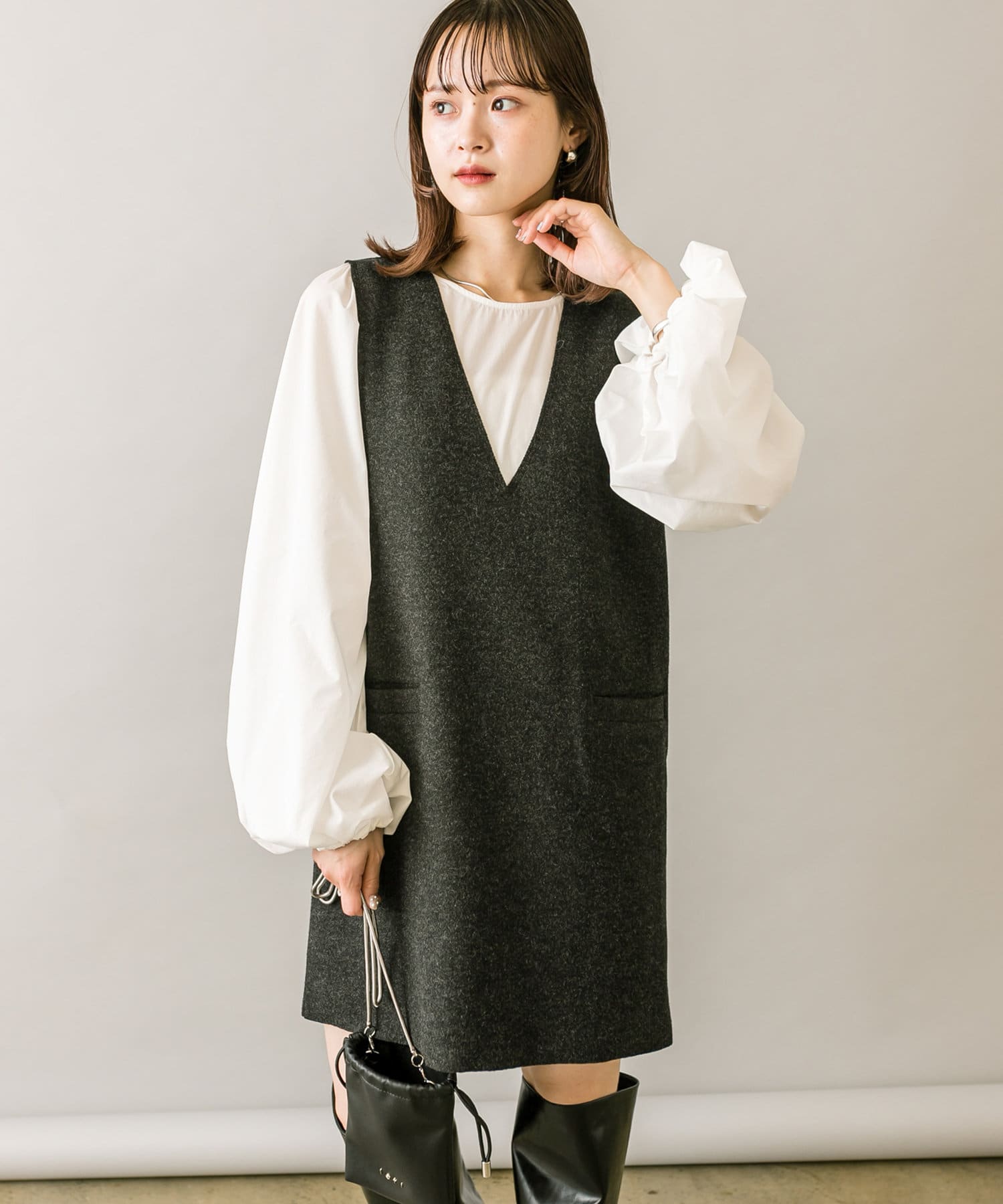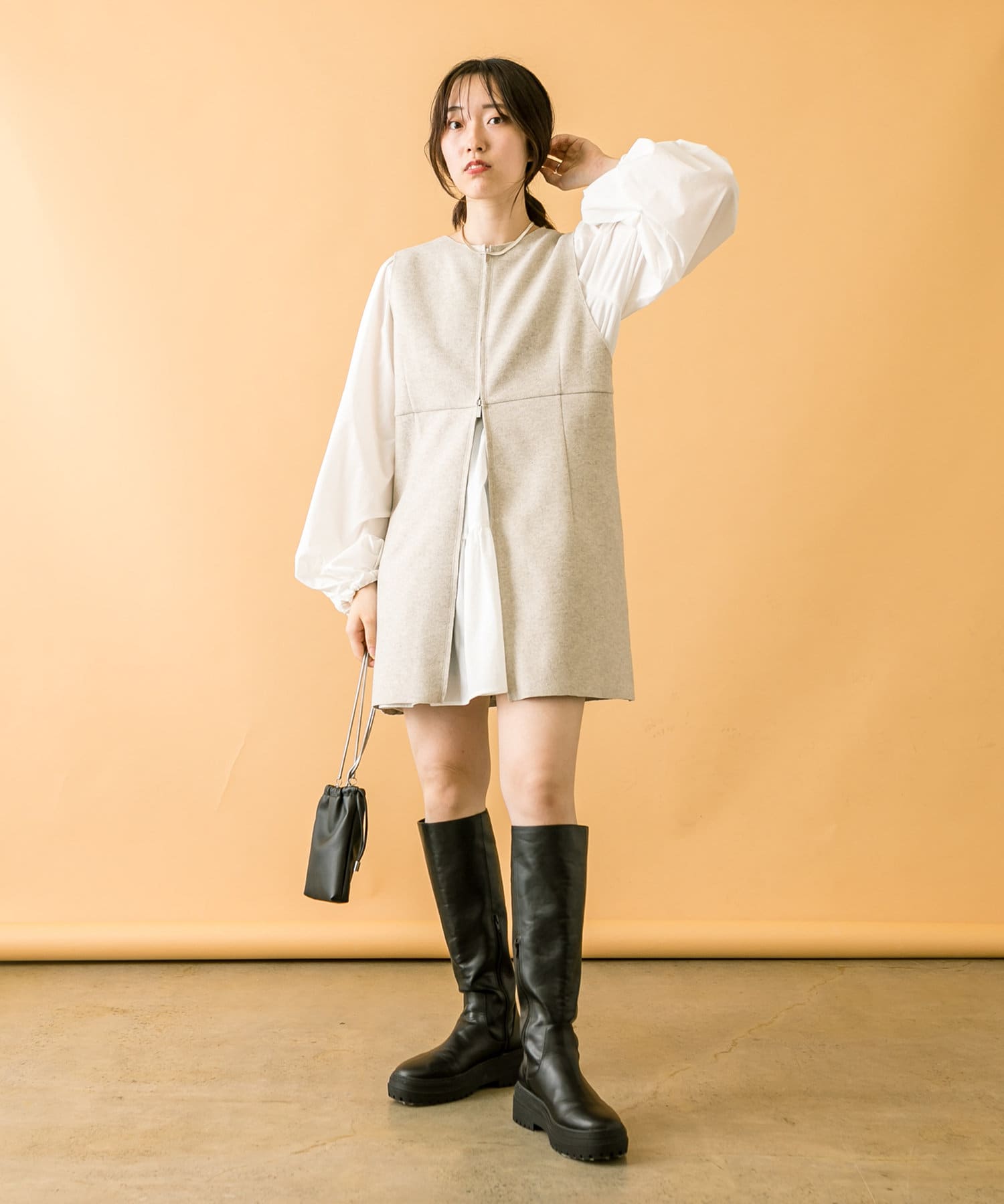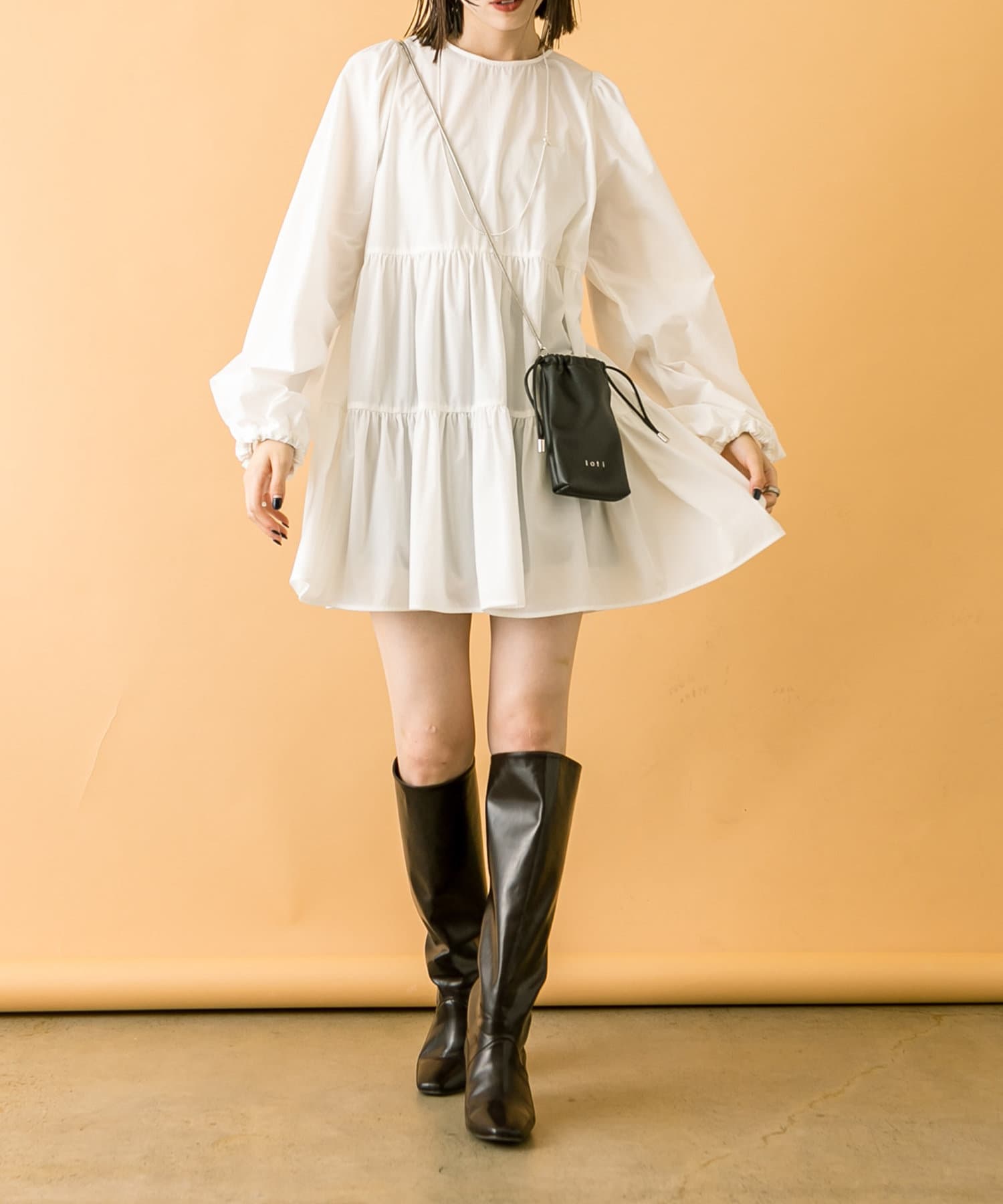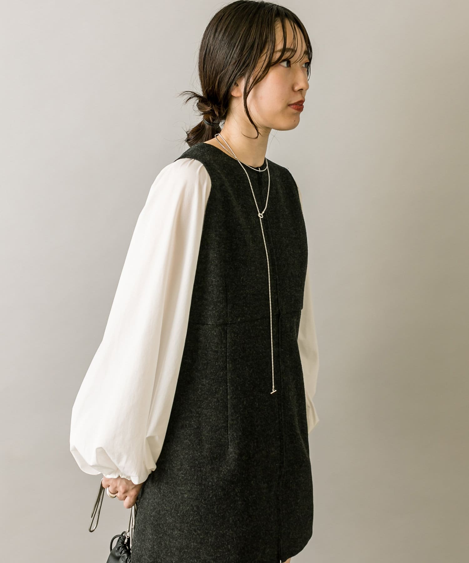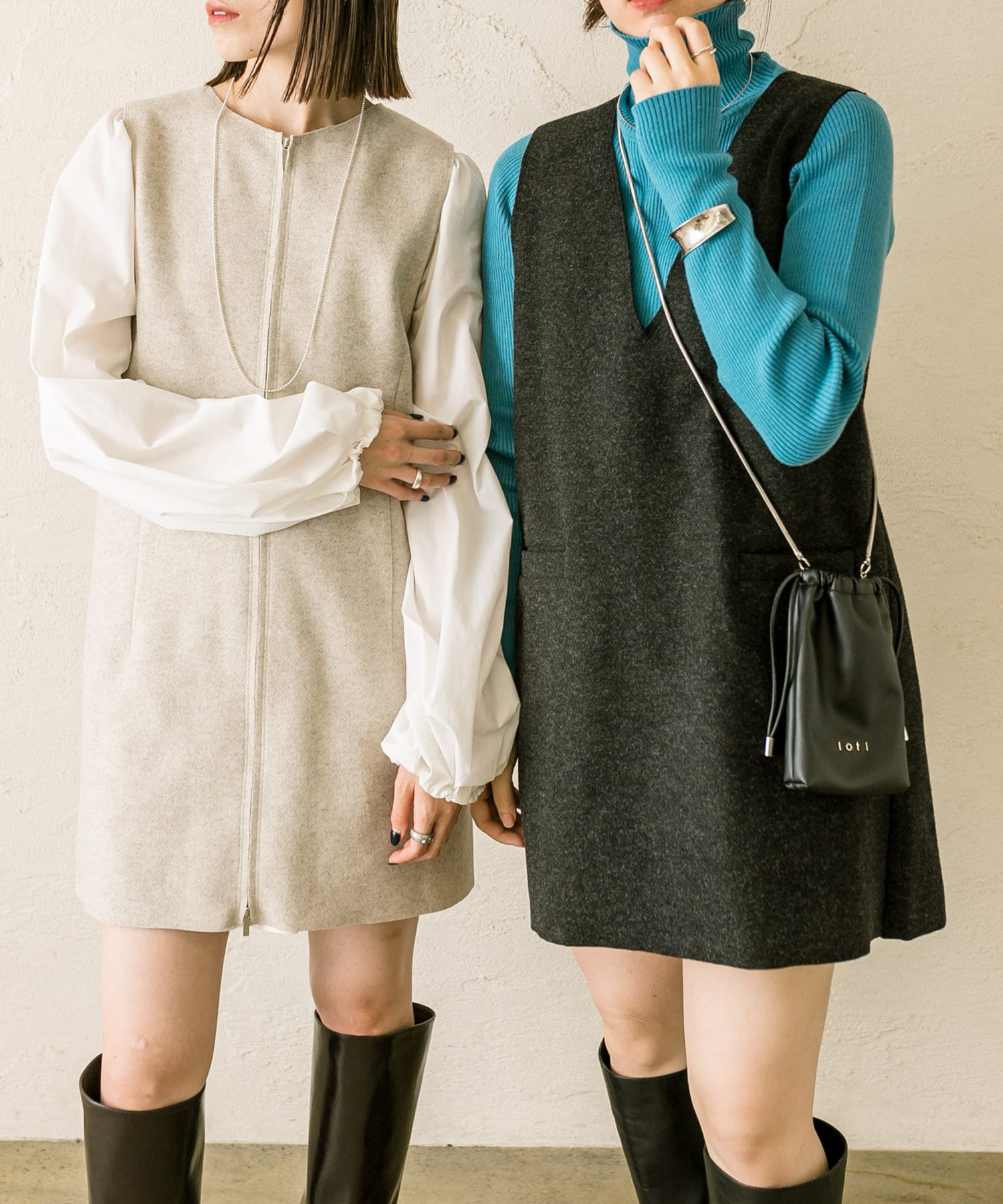 ミニワンピは前後両前で着用できるため、合わせるアイテムによって変えることで様々な雰囲気をお楽しみいただけます。