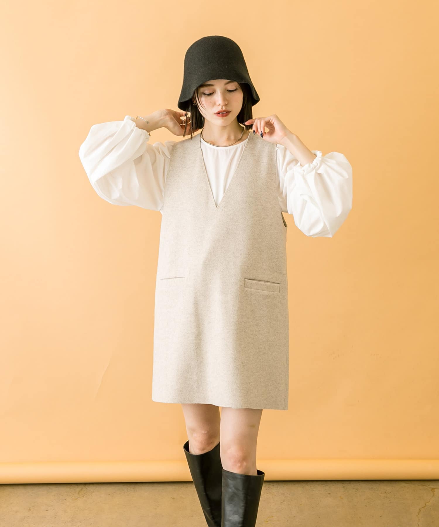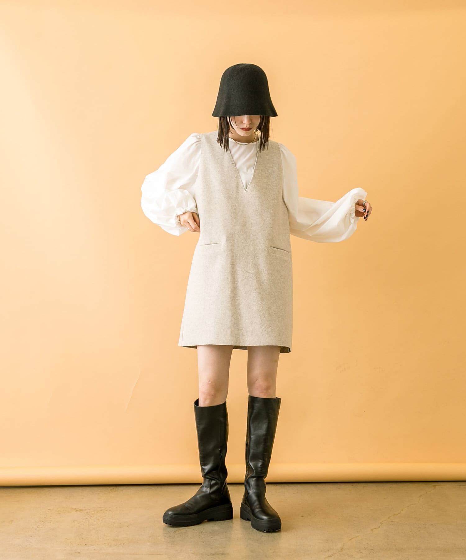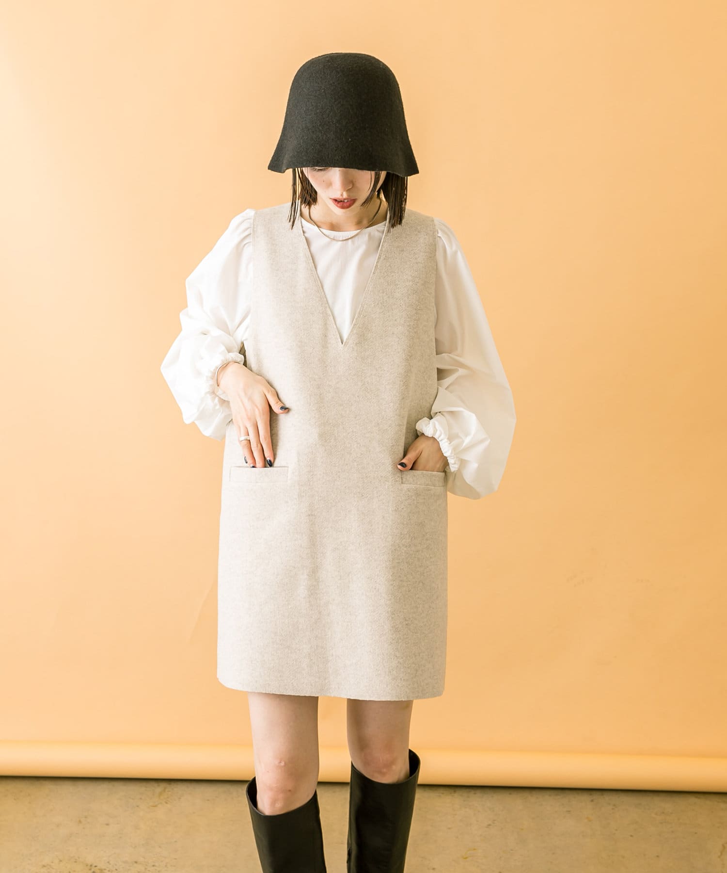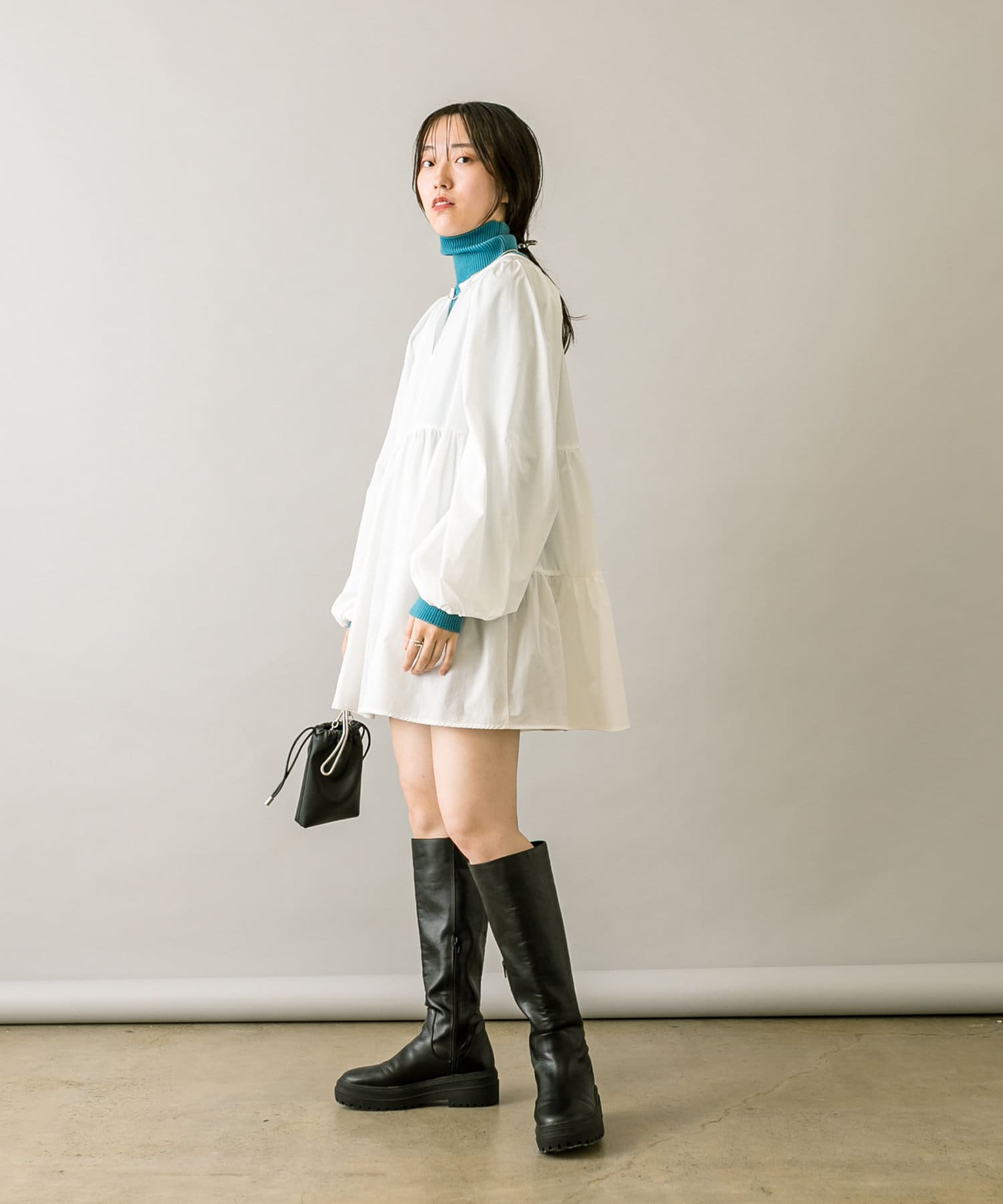 ミニワンピは前後両前で着用できるため、合わせるアイテムによって変えることで様々な雰囲気をお楽しみいただけます。