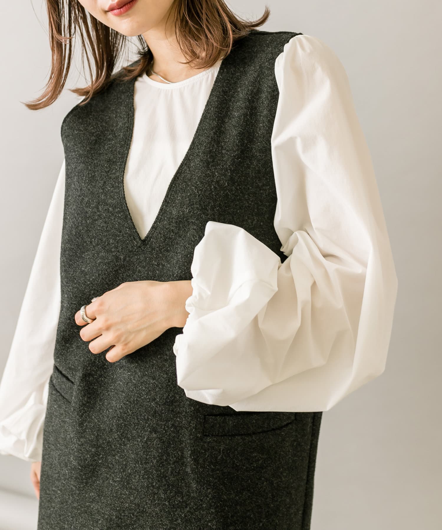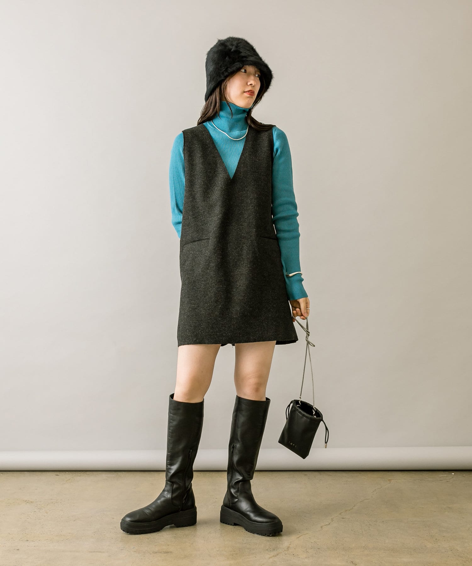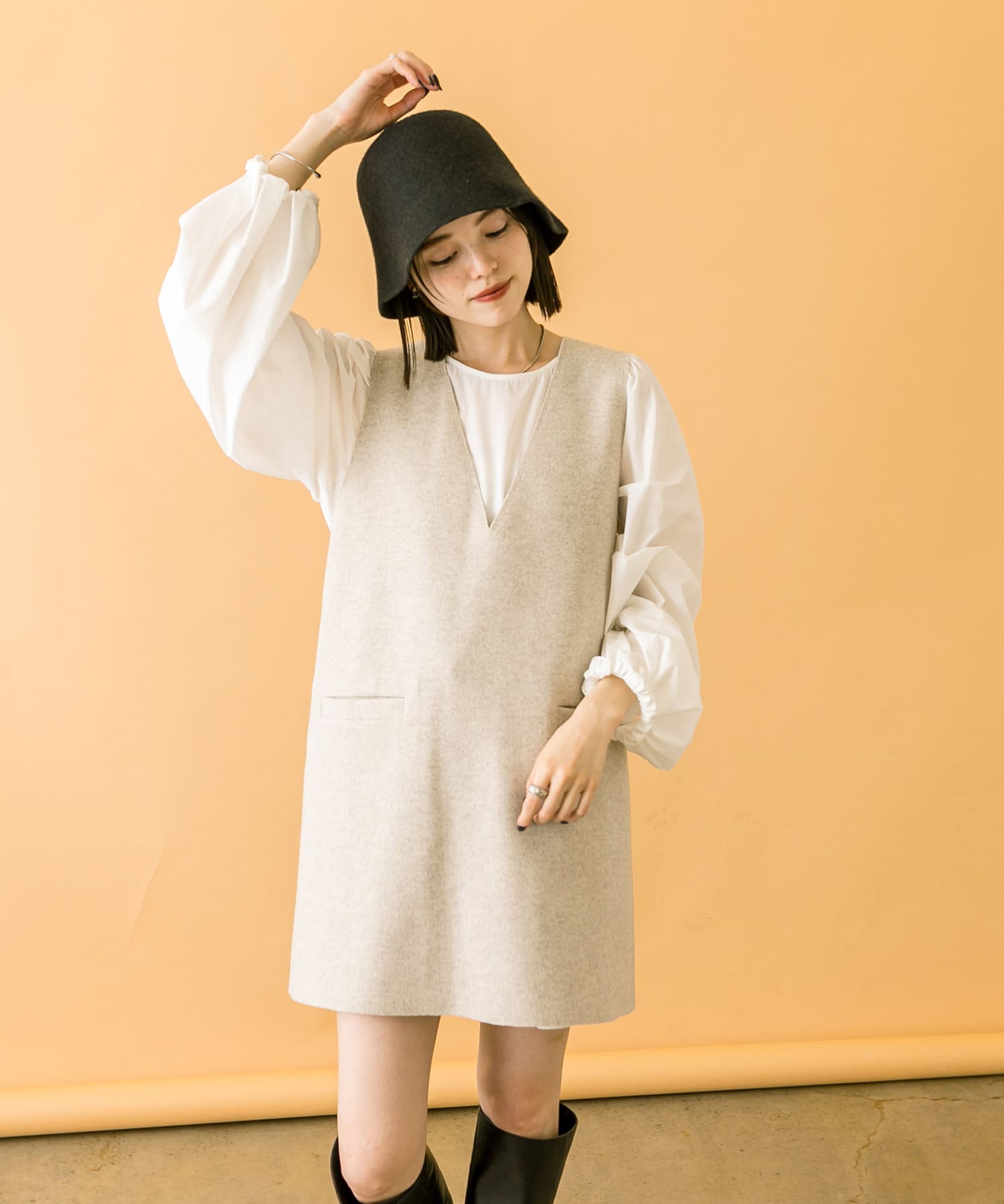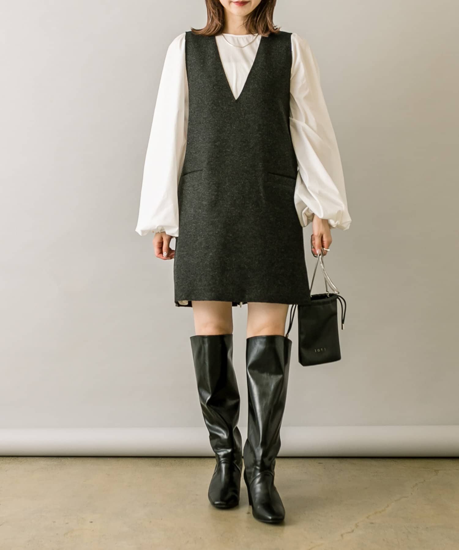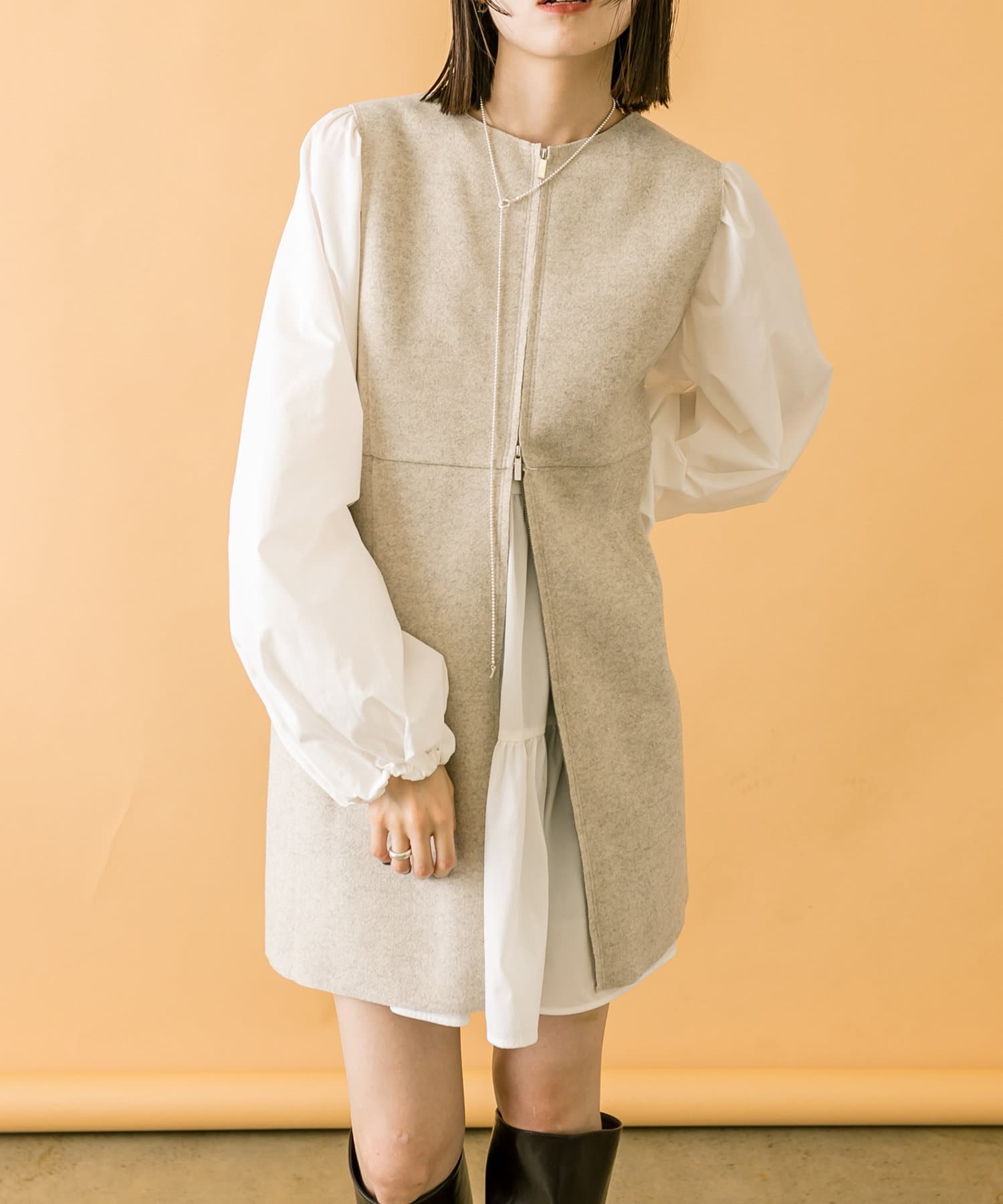 ミニワンピは前後両前で着用できるため、合わせるアイテムによって変えることで様々な雰囲気をお楽しみいただけます。