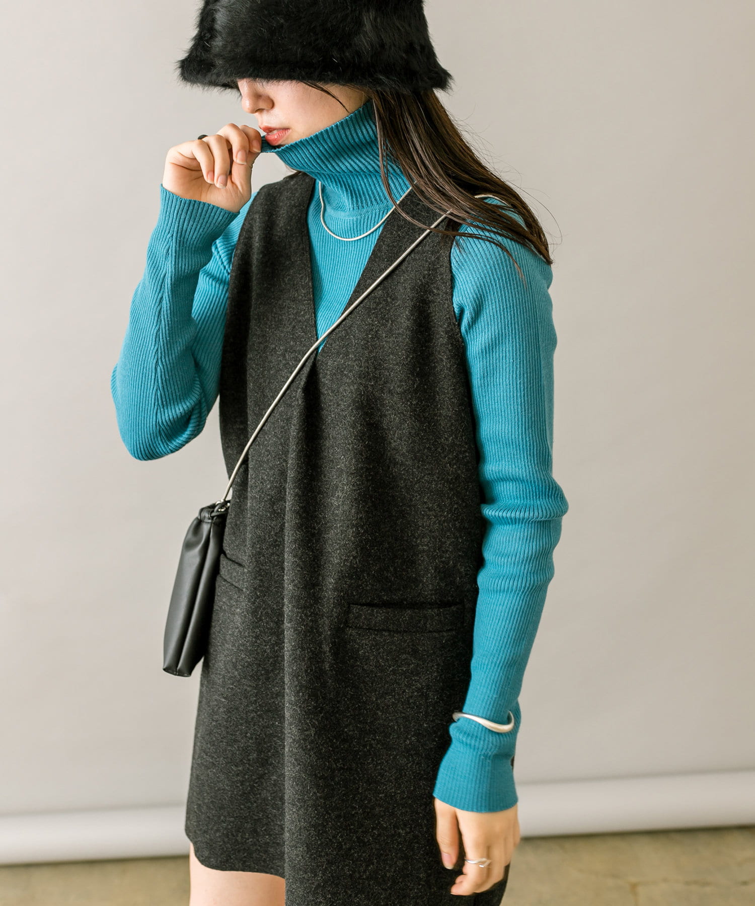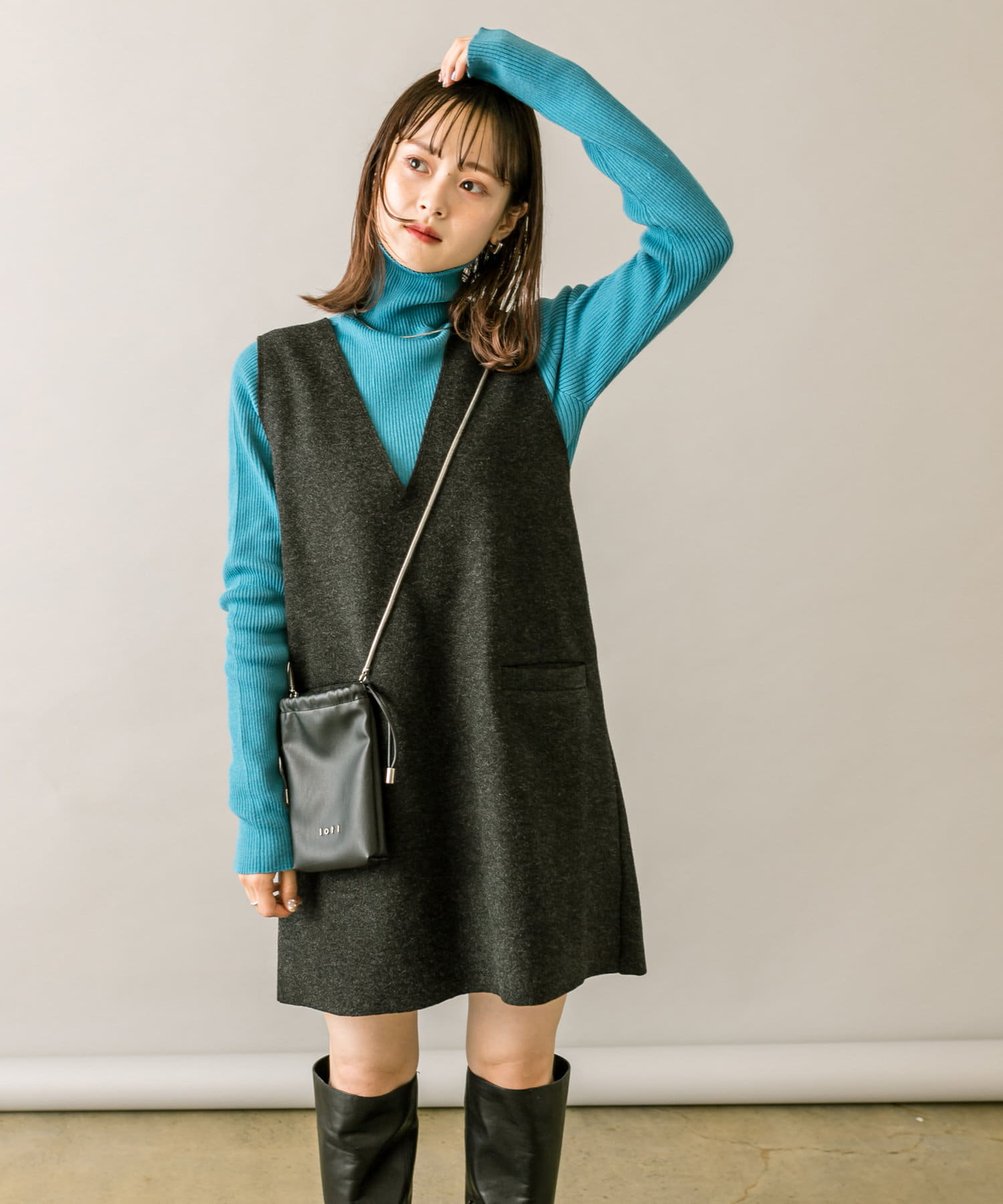 トレンドのチャコールグレーのミニワンピと、ブルーのニットのセットです。