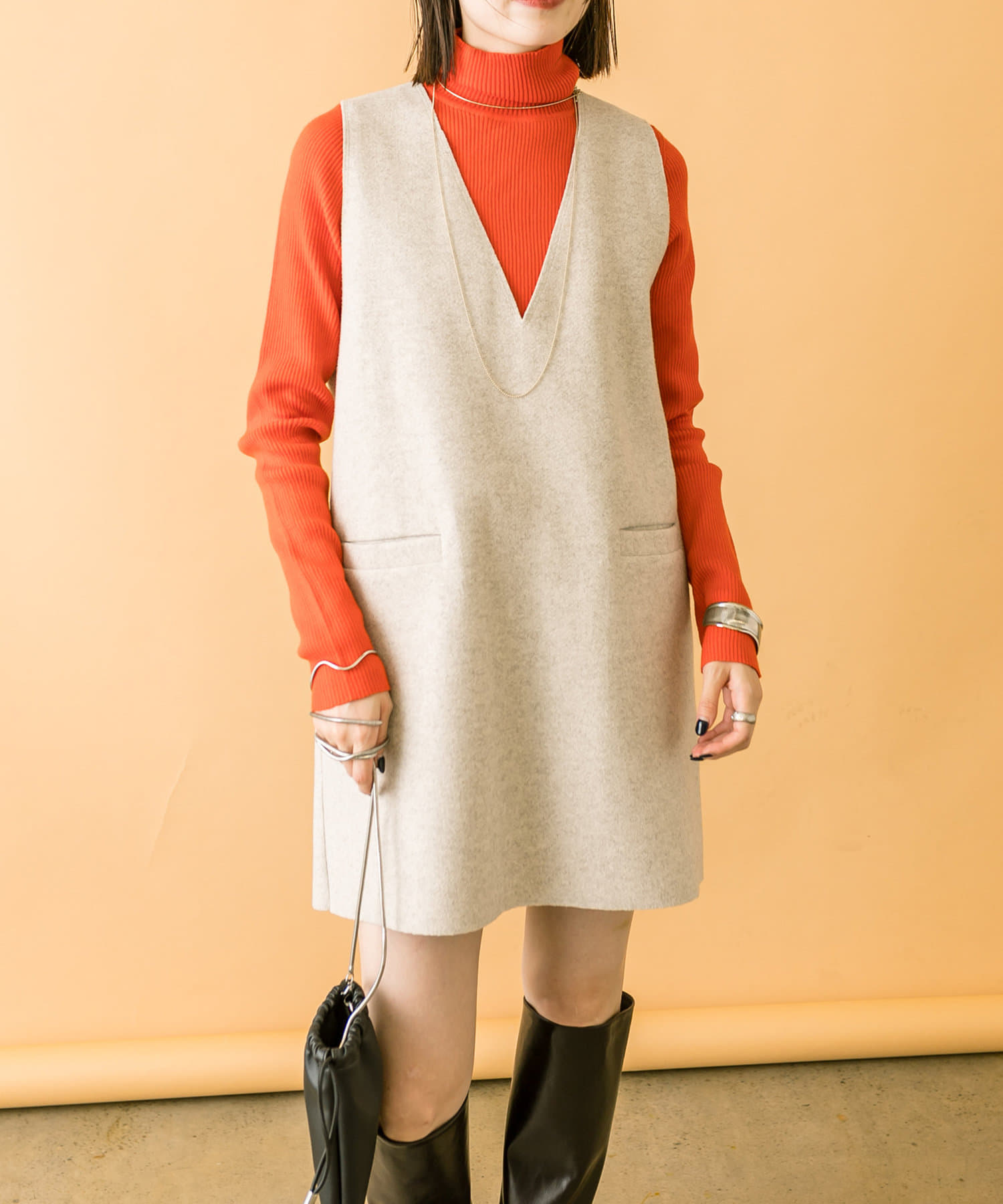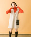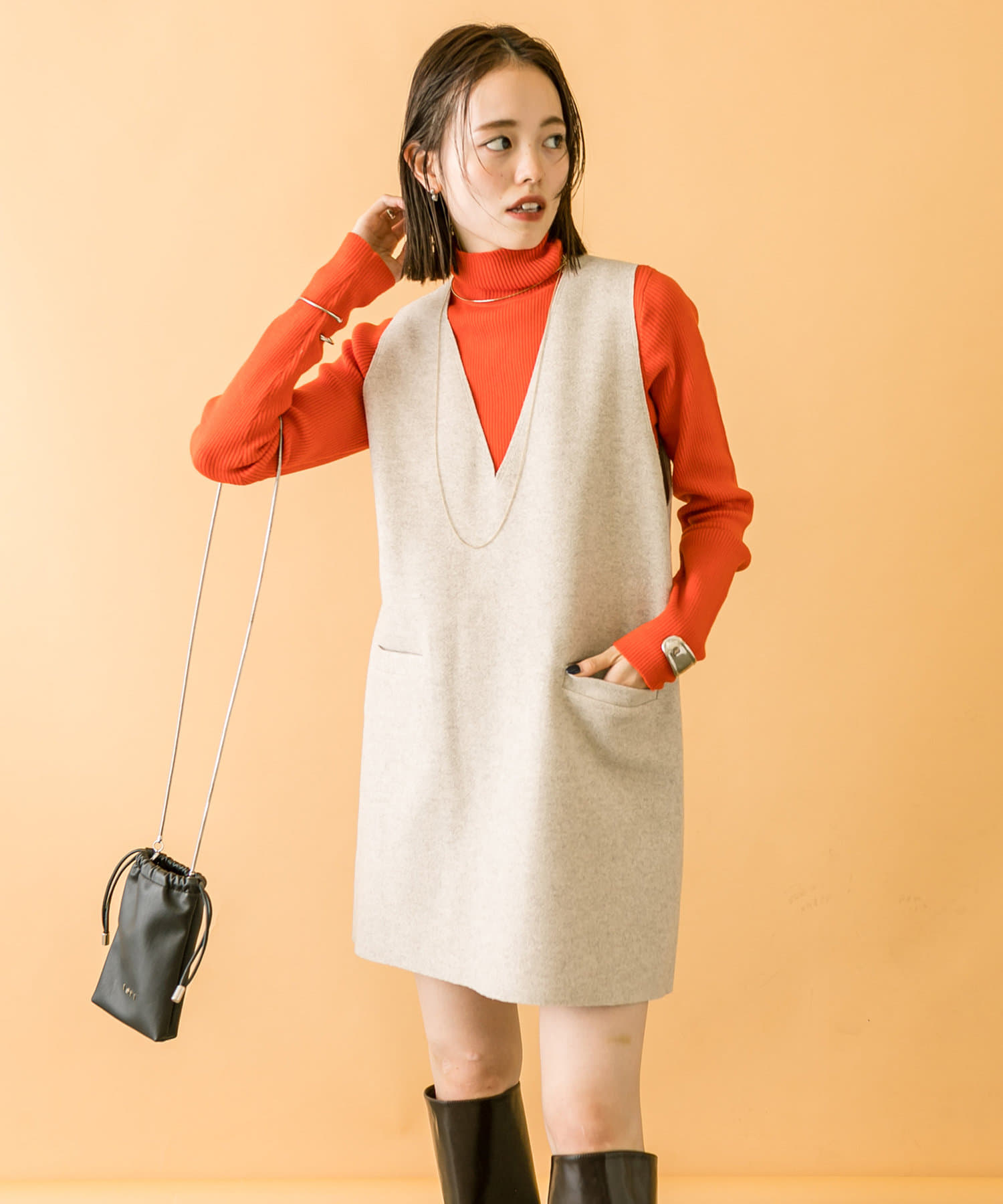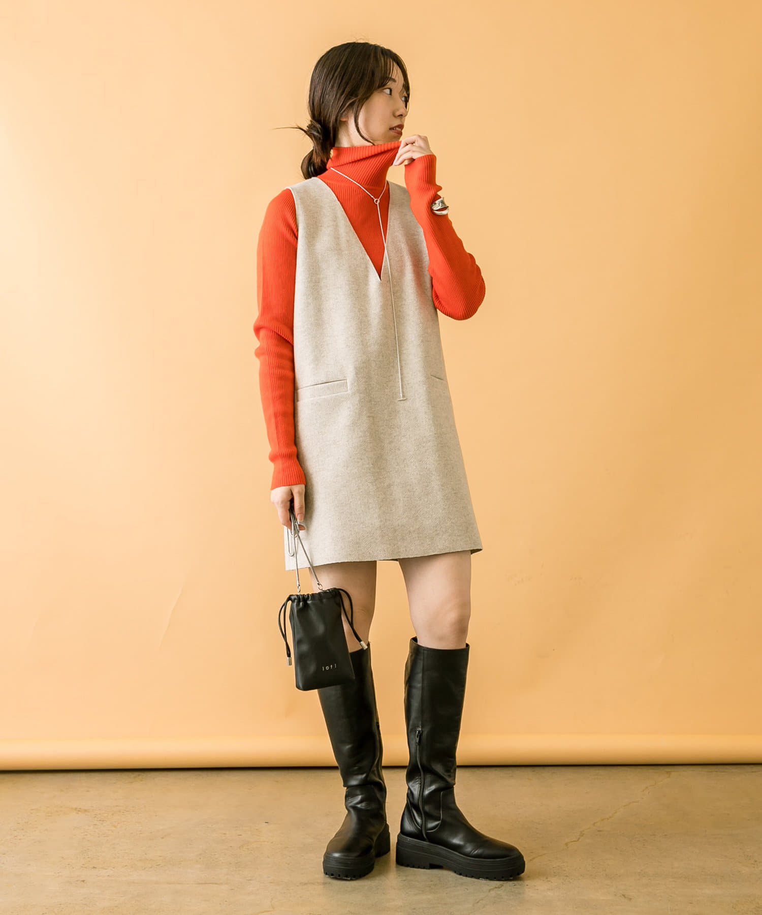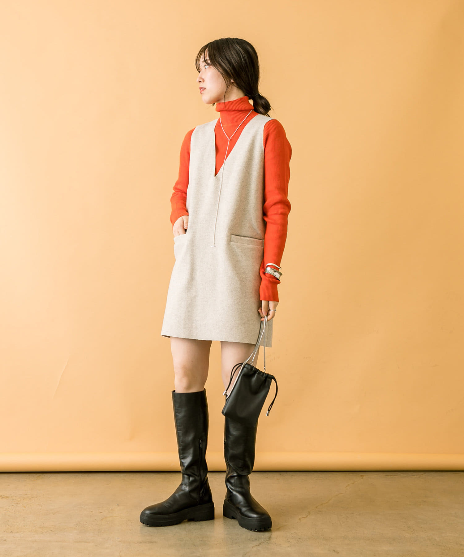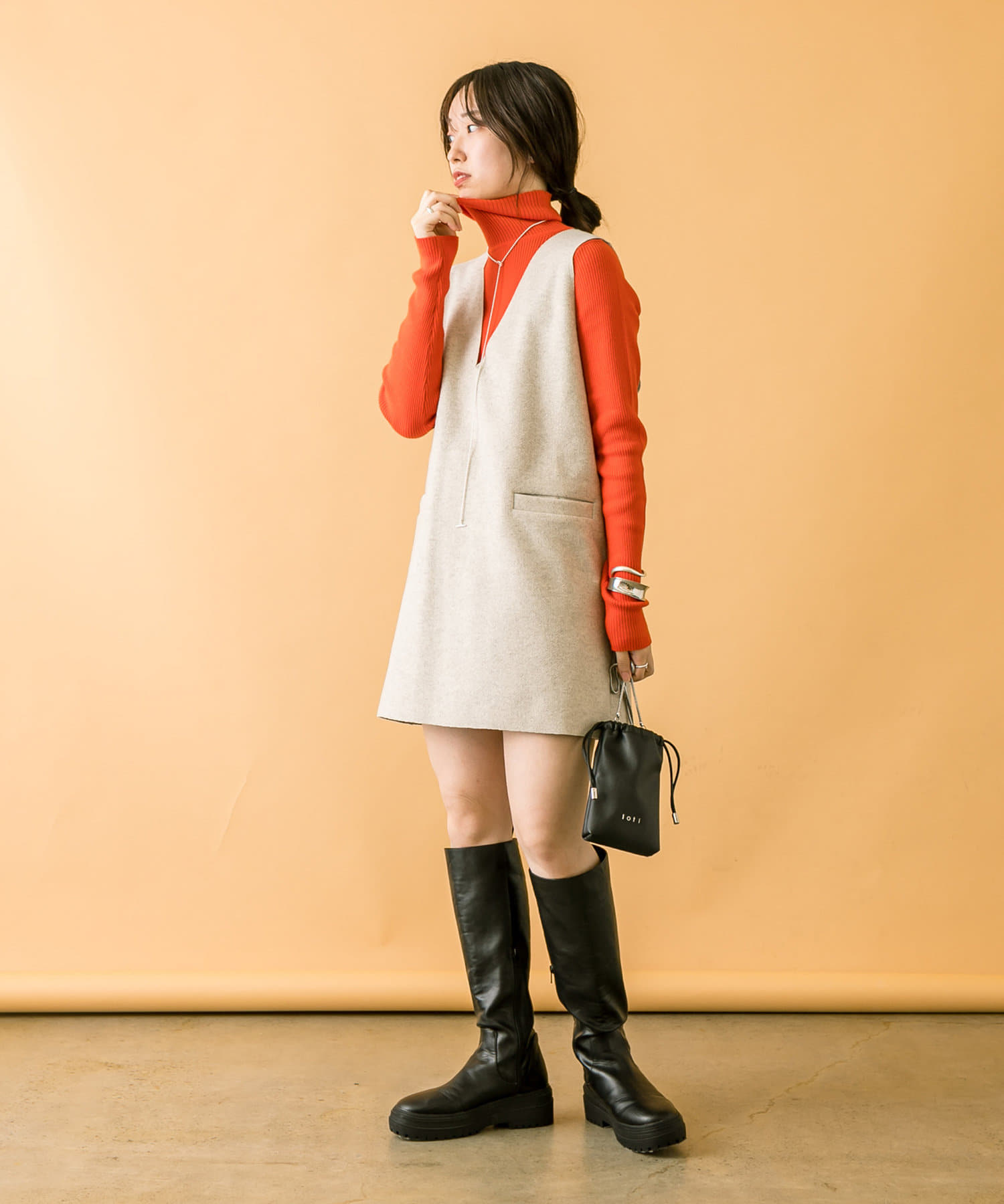 落ち着いたアイボリーのミニワンピに、目を惹くオレンジのタートルニットをプラスしたセット。