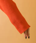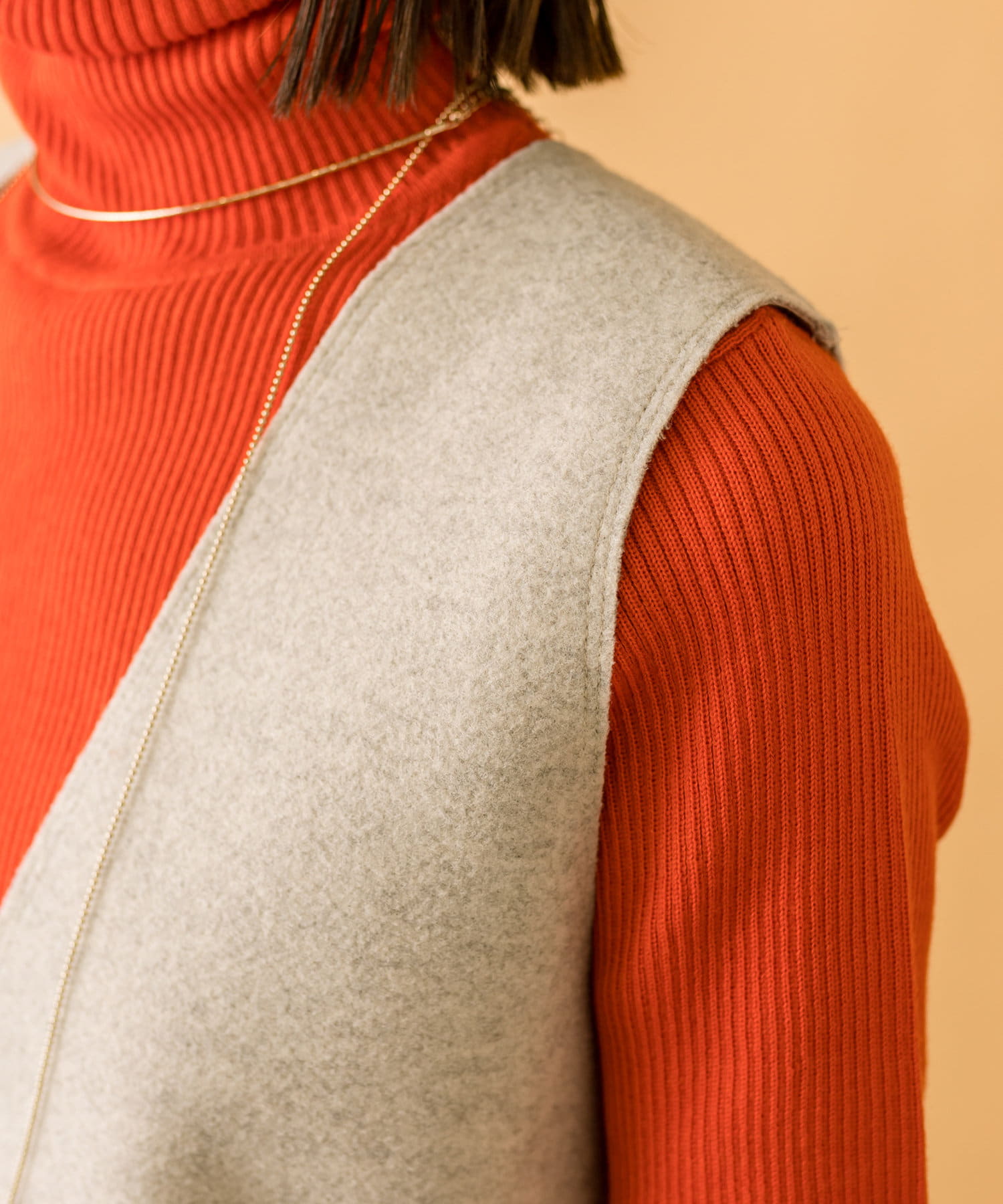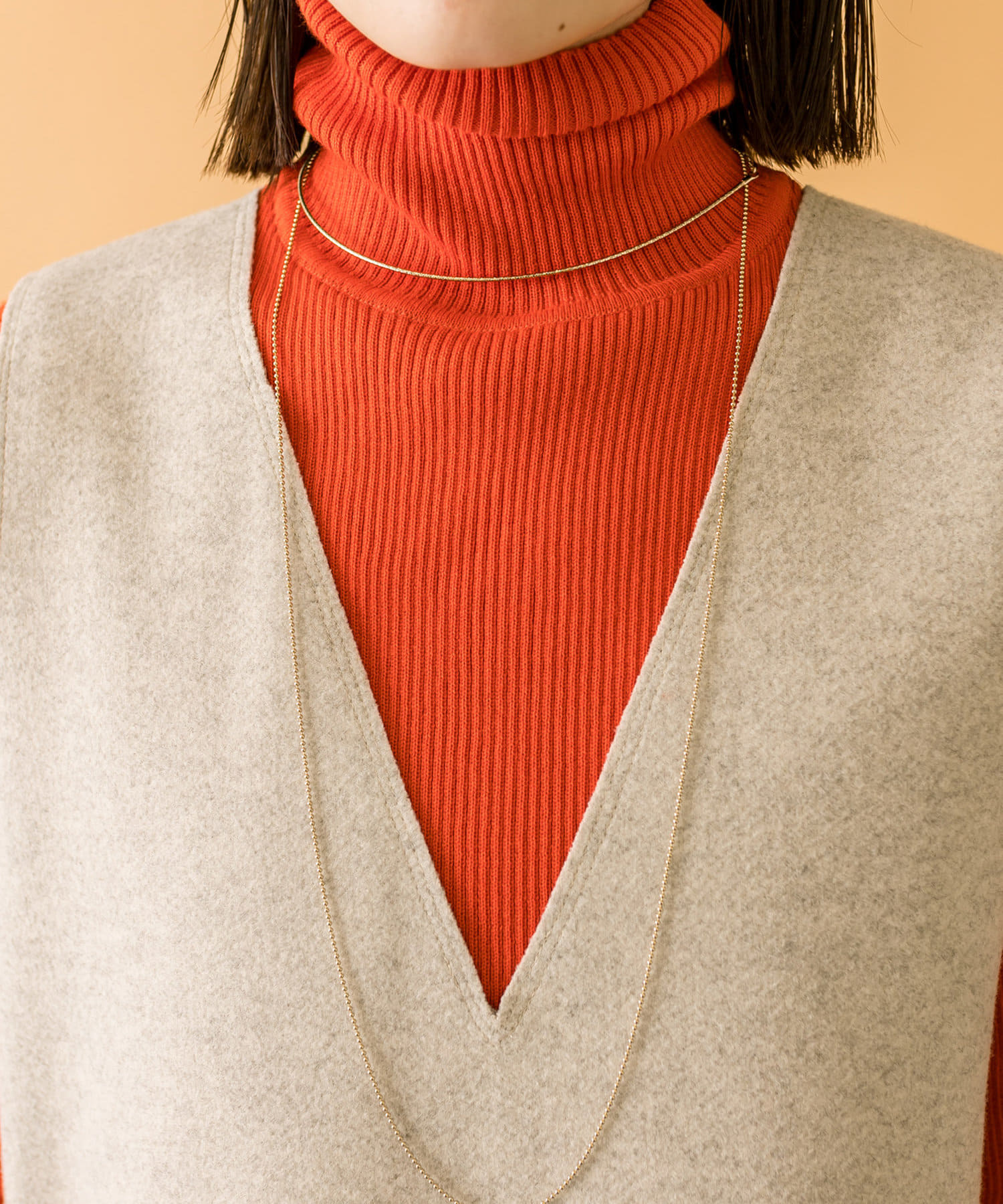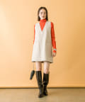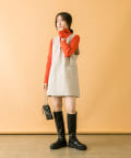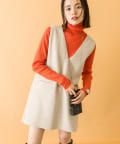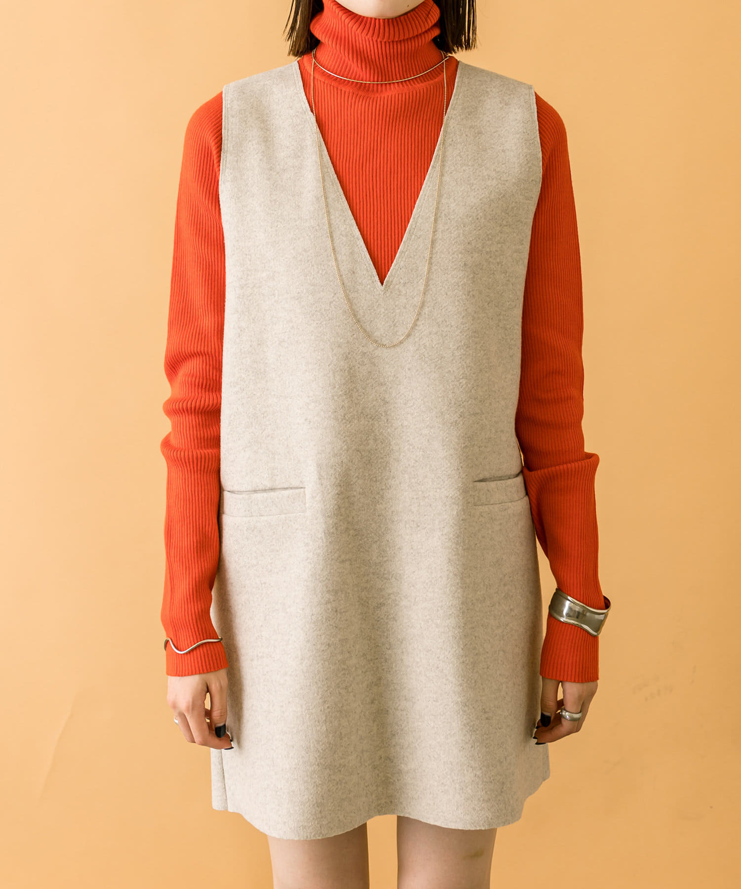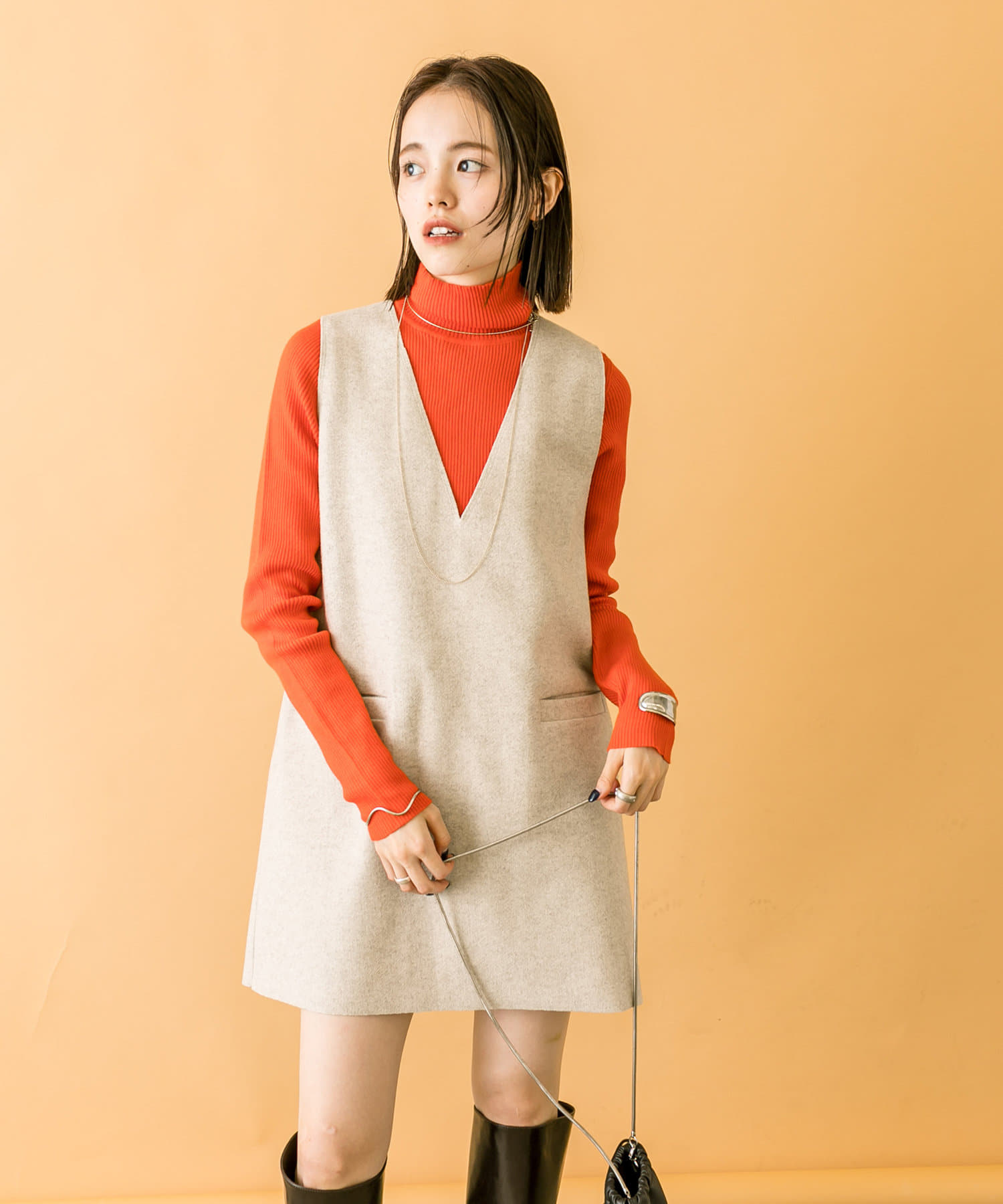落ち着いたアイボリーのミニワンピに、目を惹くオレンジのタートルニットをプラスしたセット。
