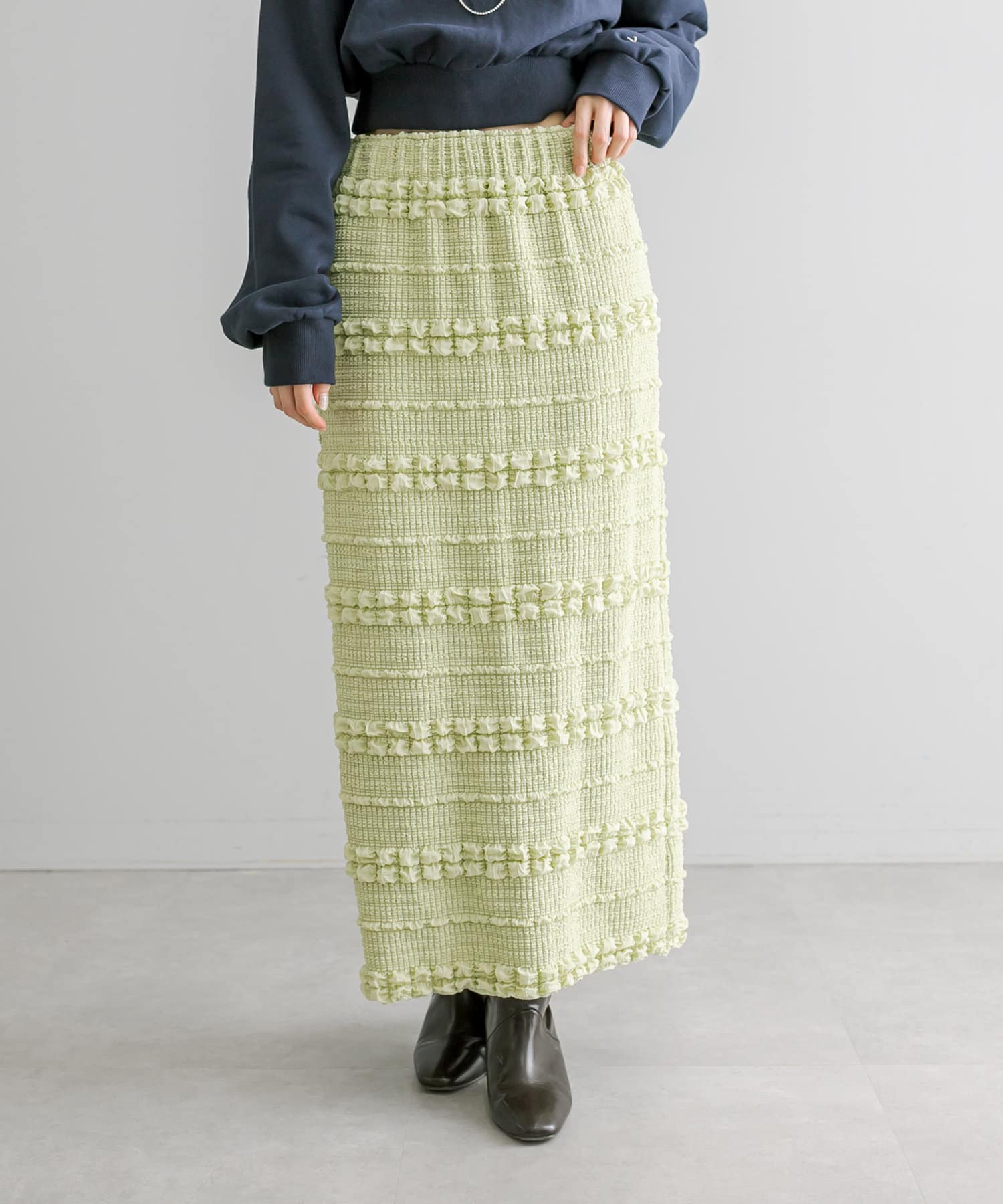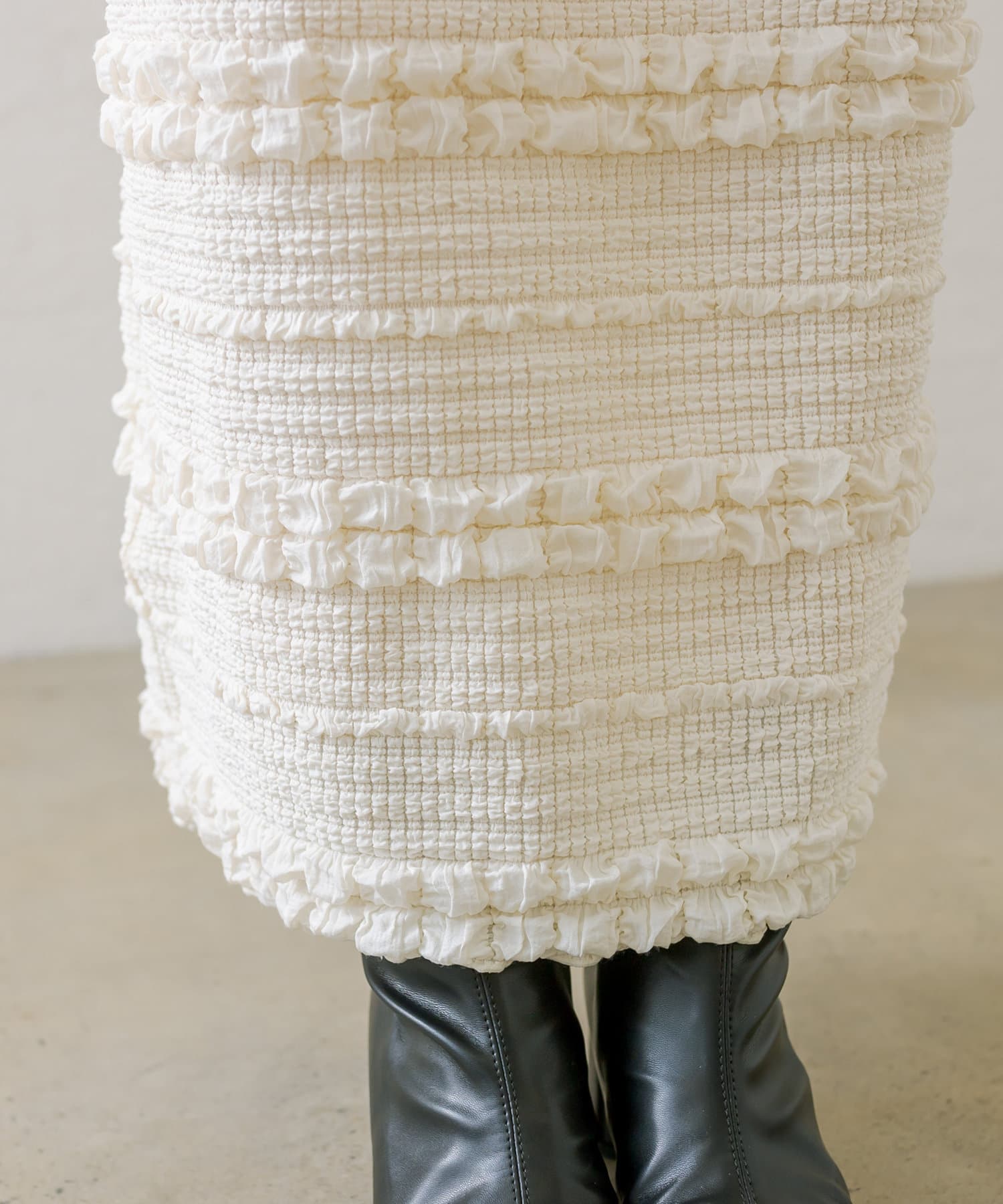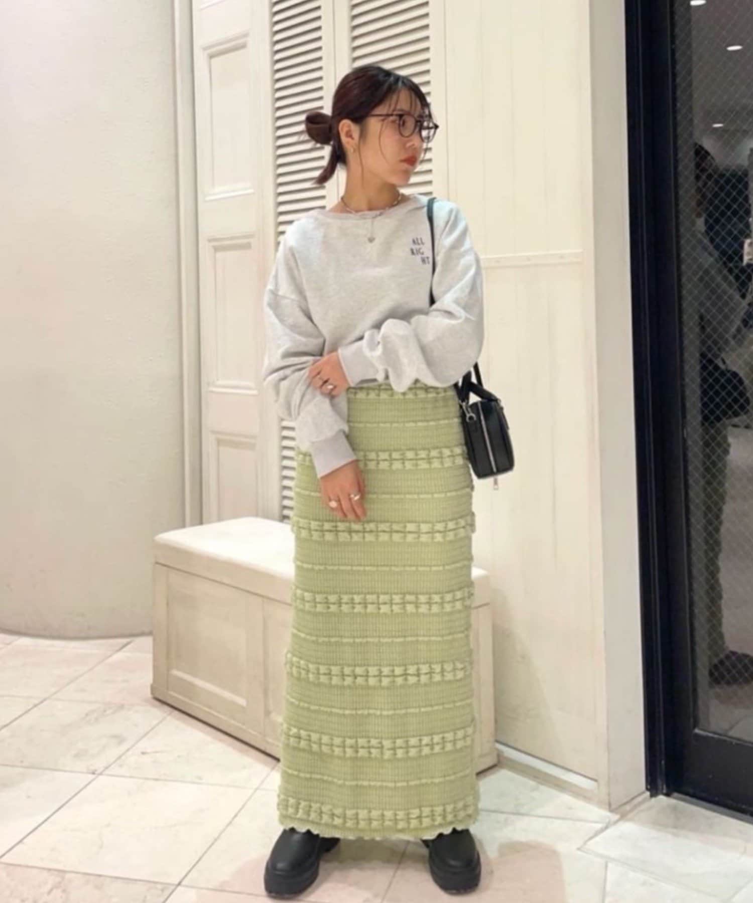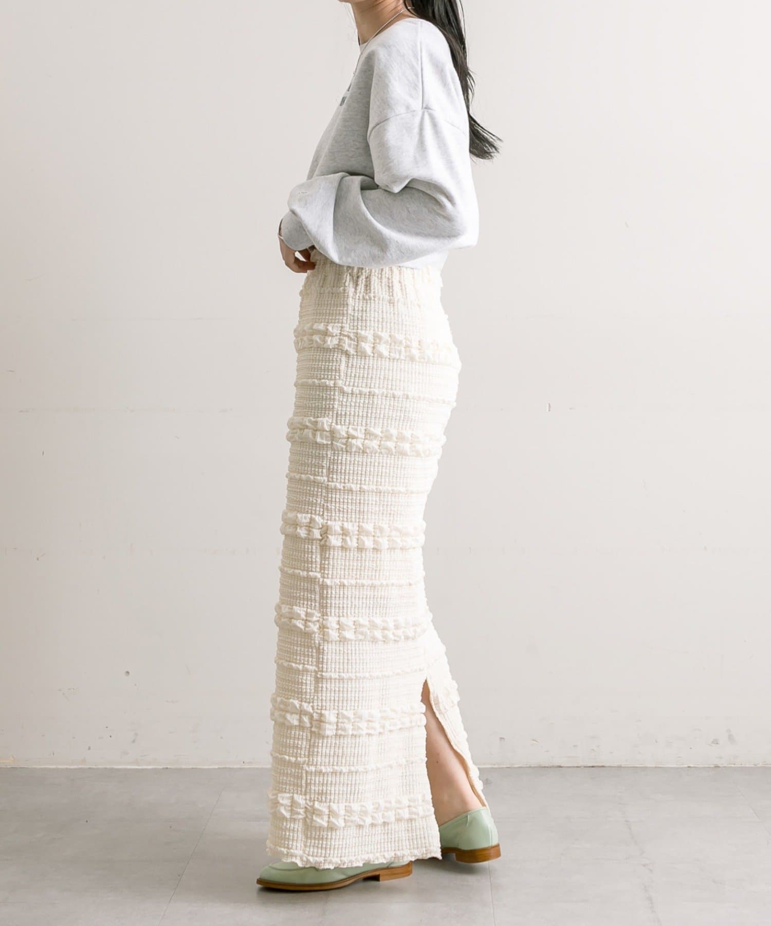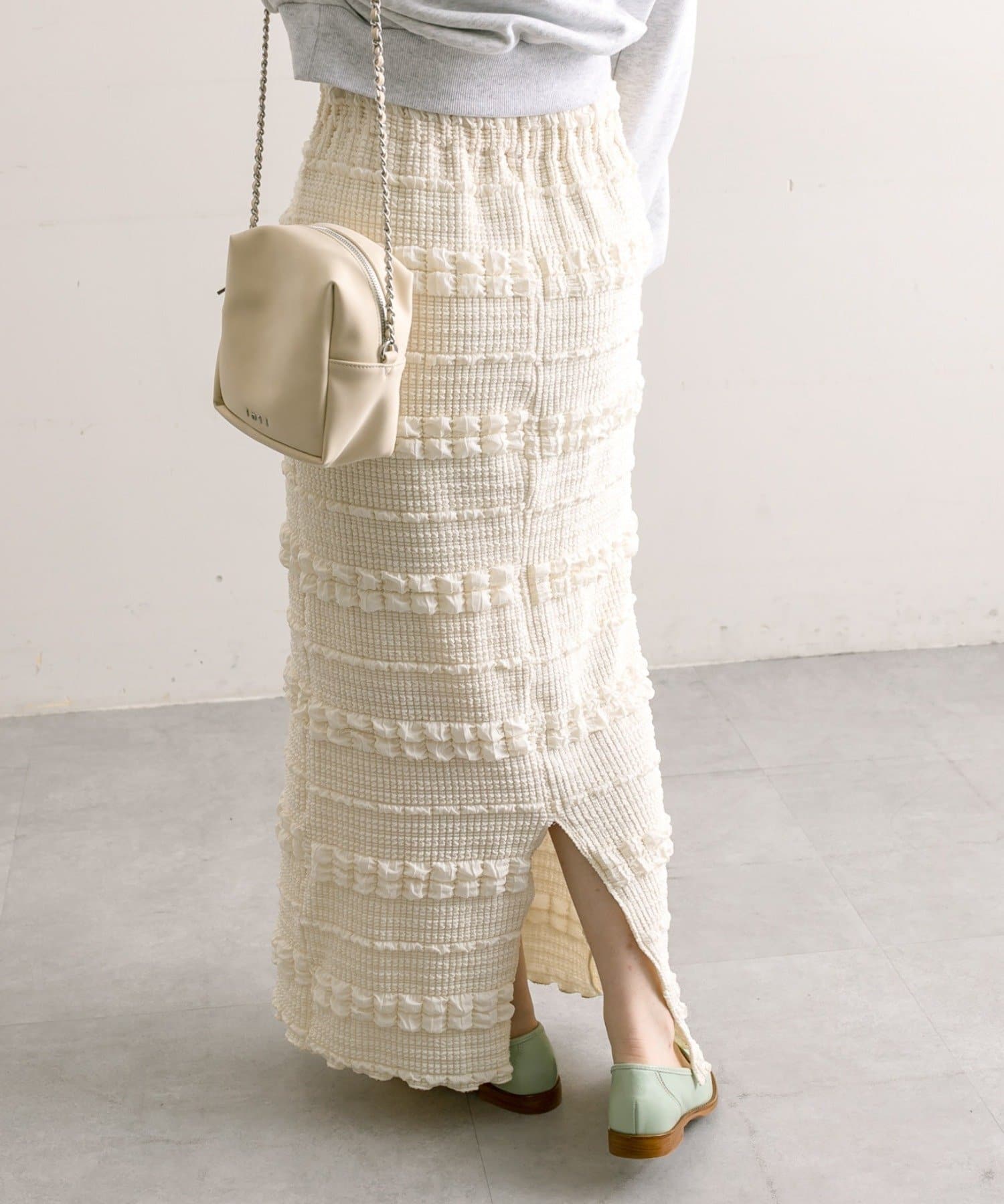 購入場所:店舗タイトスカートなので心配でしたが伸縮性がすごくて、もちもちとした素材がとても履きやすい!ぽこぽこした表面感のある素材もかわいい
