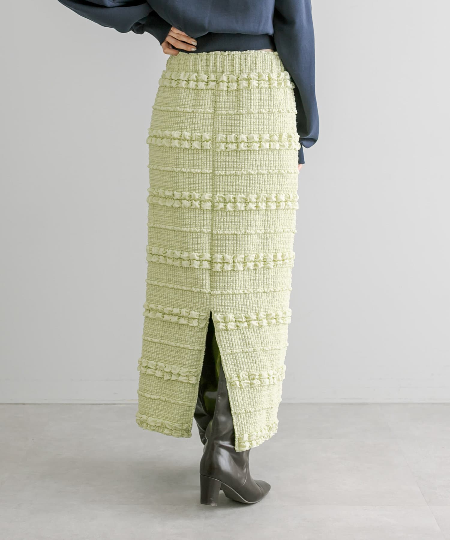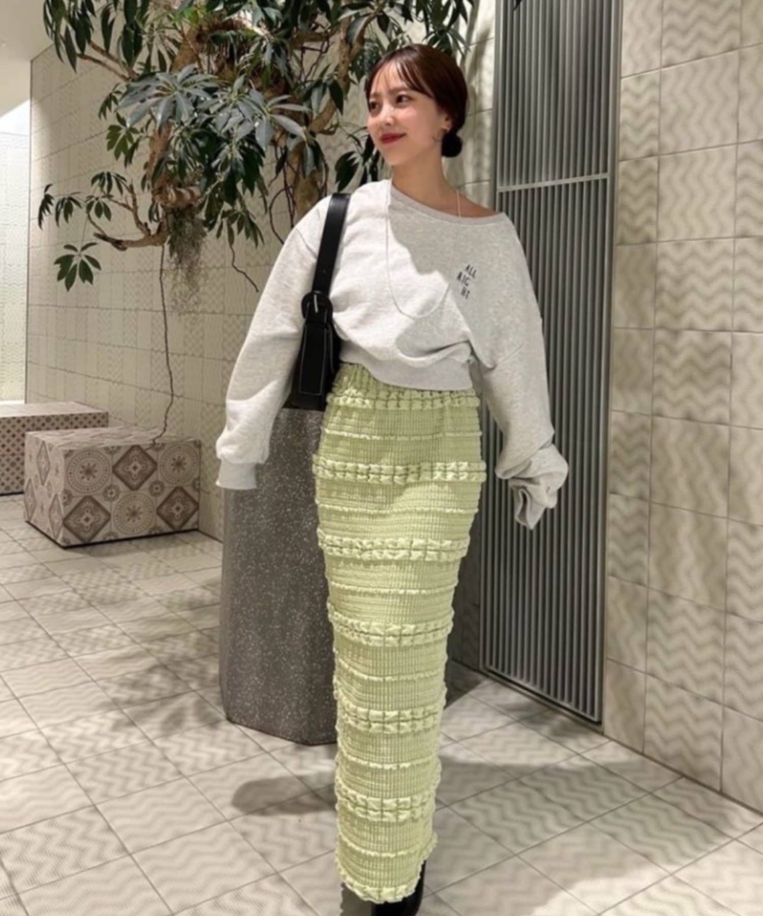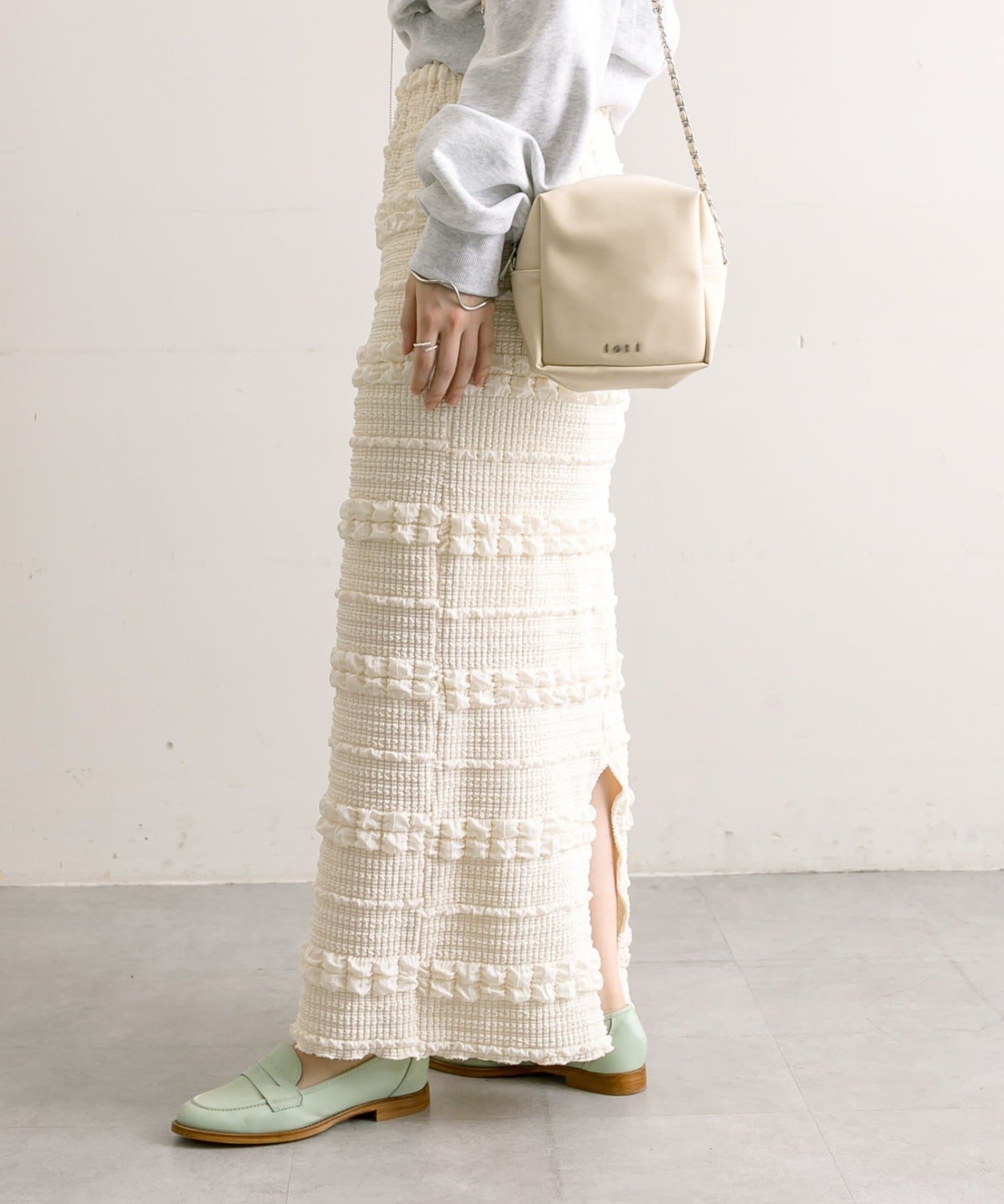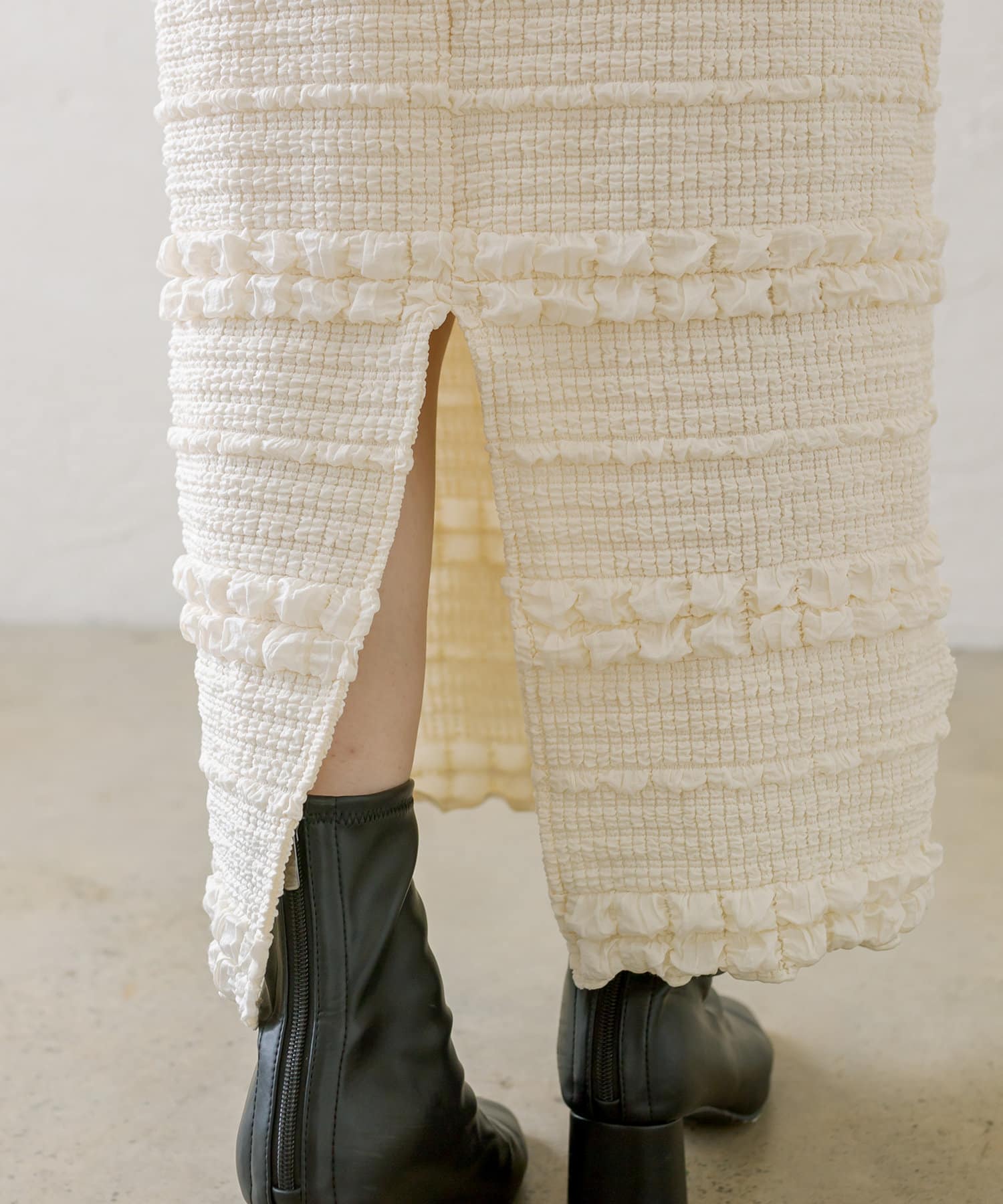 購入場所:店舗タイトスカートなので心配でしたが伸縮性がすごくて、もちもちとした素材がとても履きやすい!ぽこぽこした表面感のある素材もかわいい