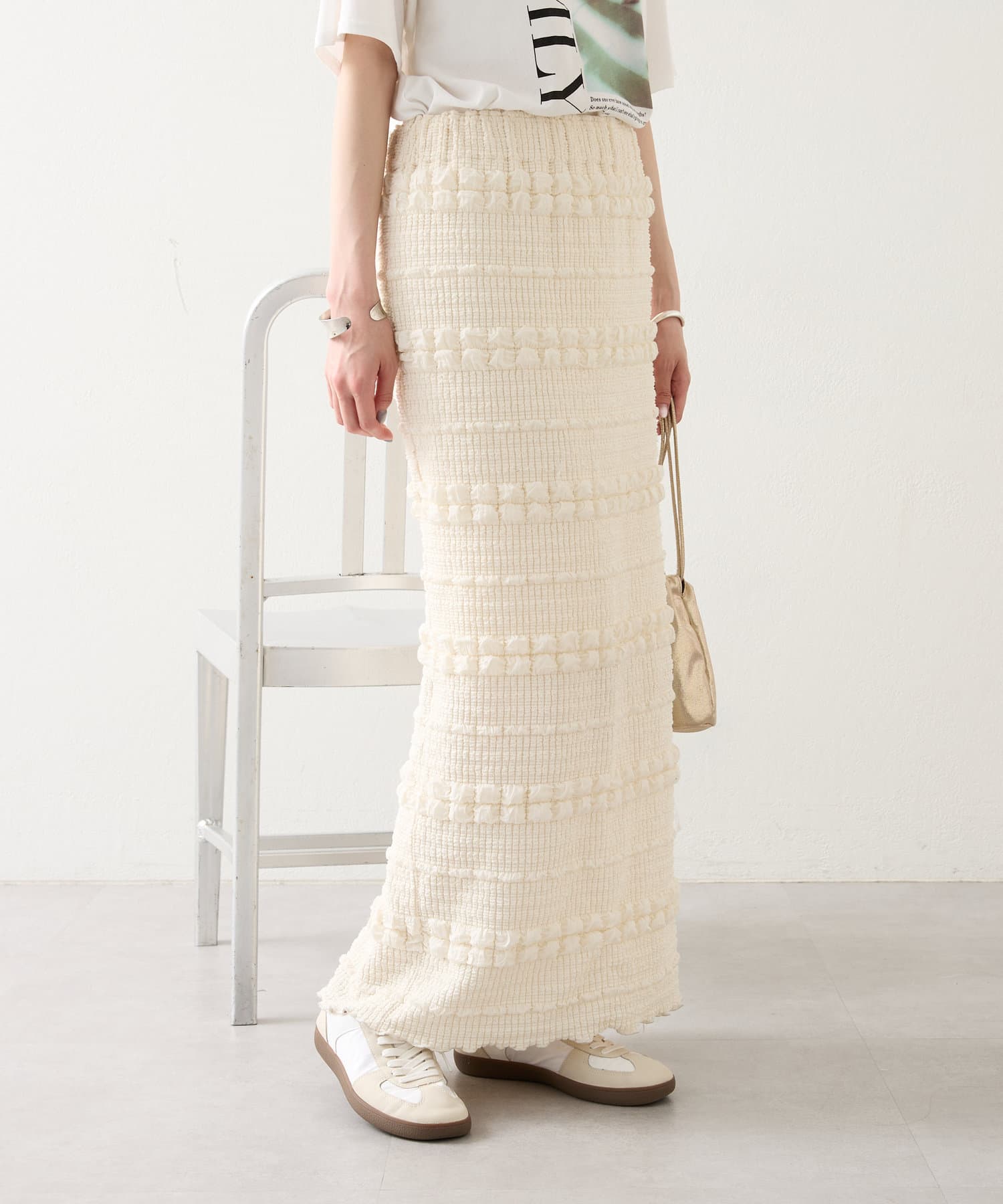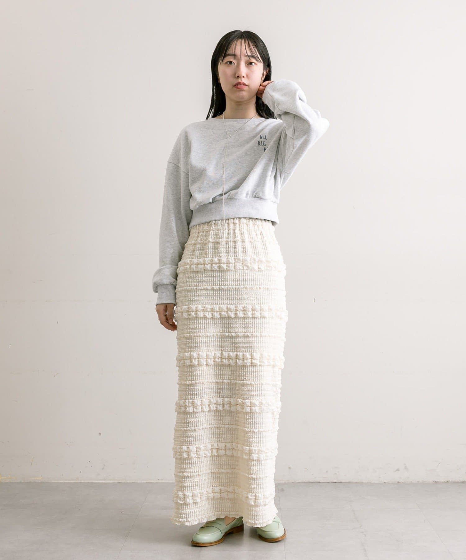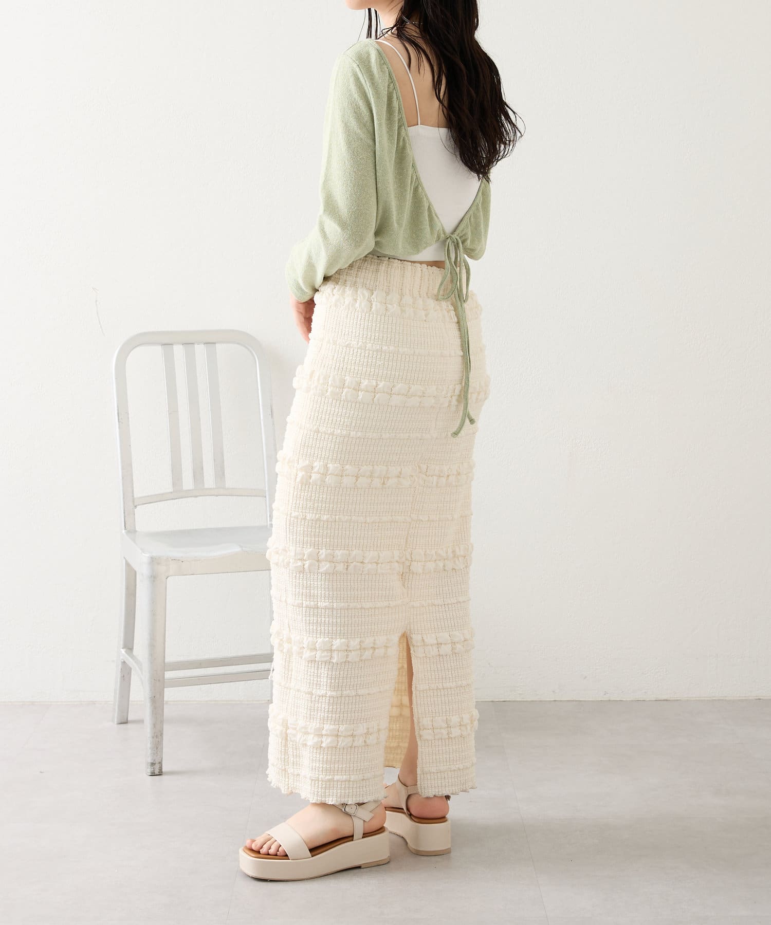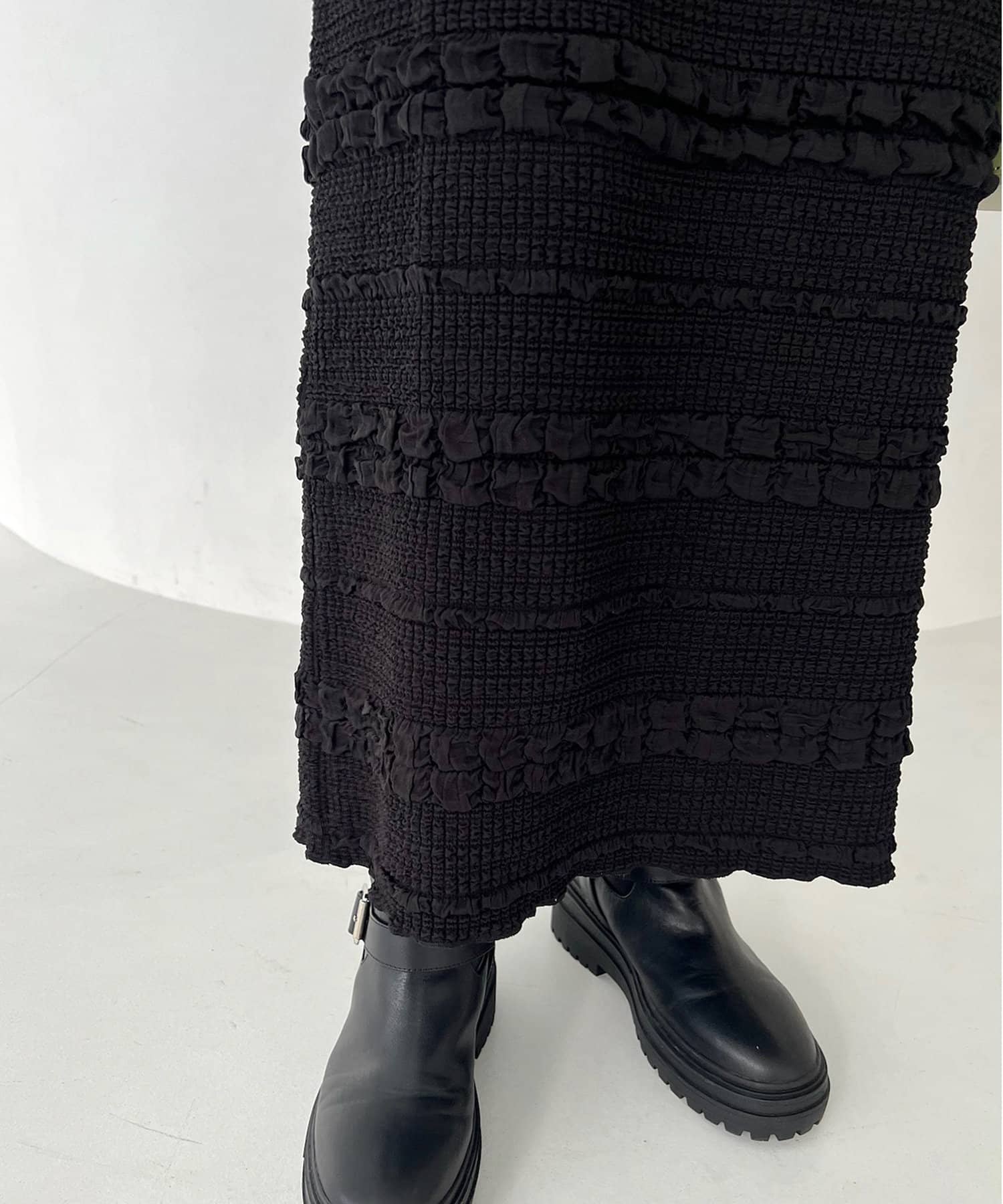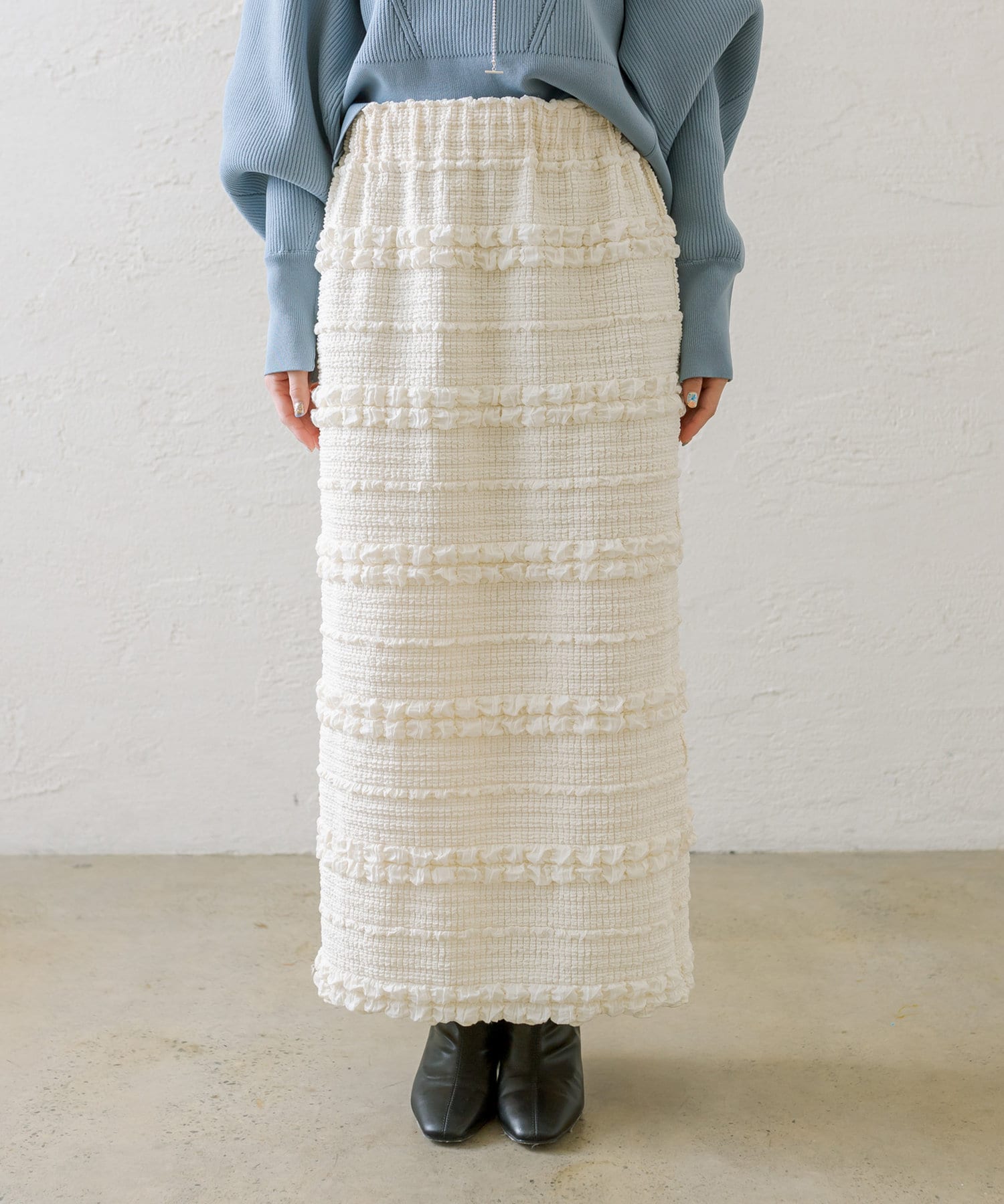 購入場所:店舗タイトスカートなので心配でしたが伸縮性がすごくて、もちもちとした素材がとても履きやすい!ぽこぽこした表面感のある素材もかわいい