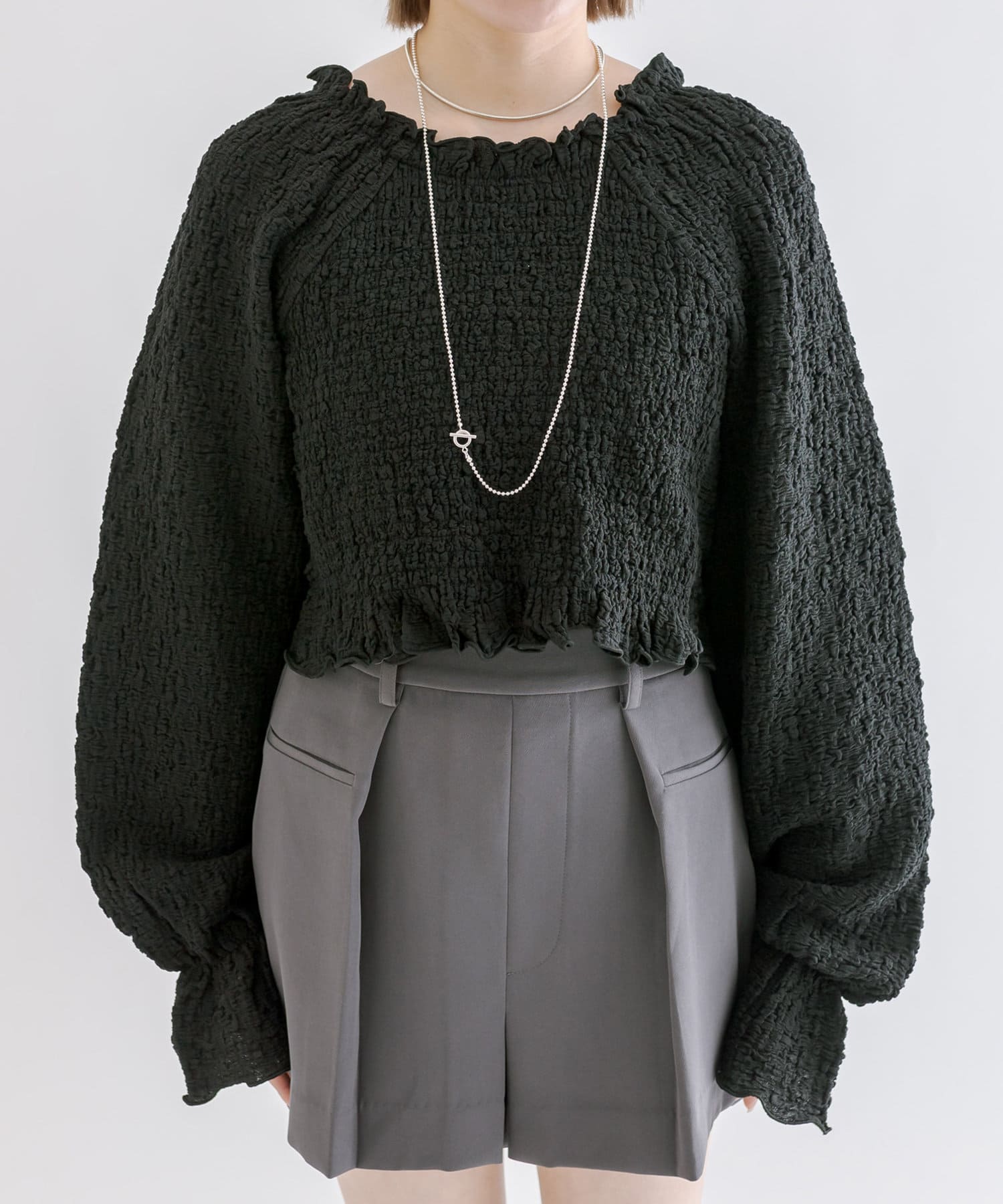 シャーリング素材で華やかな雰囲気で着ていただけるブラウス。