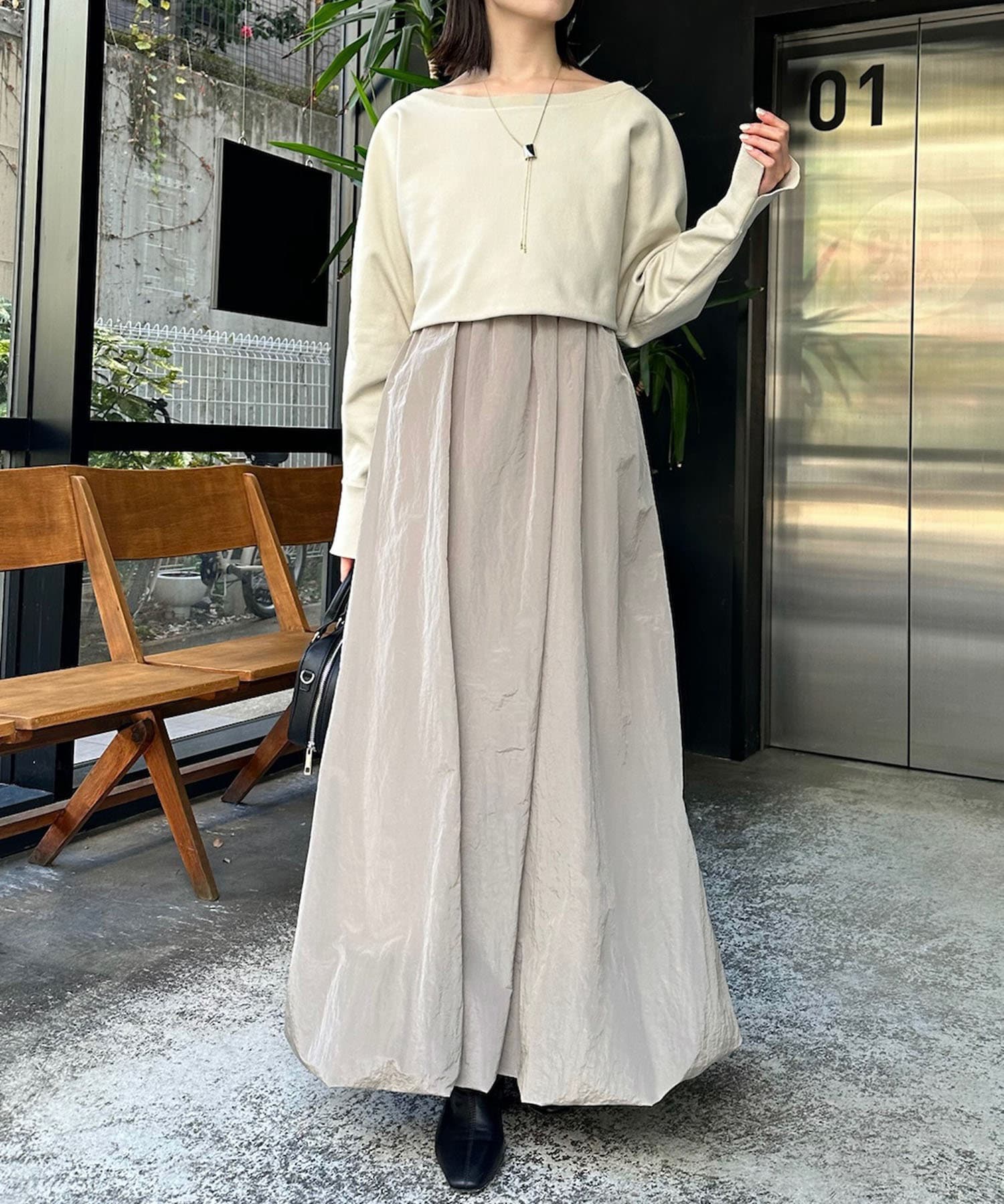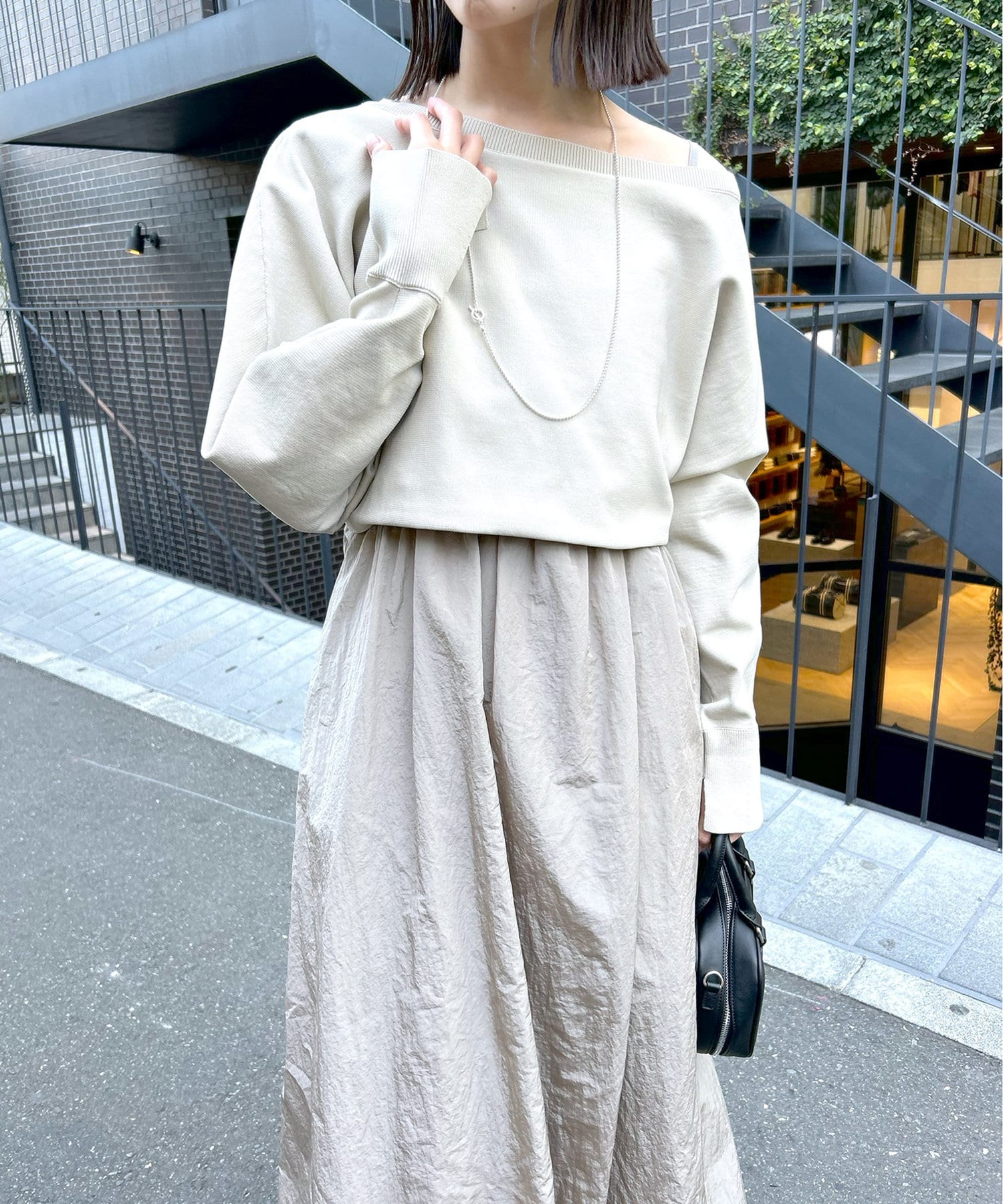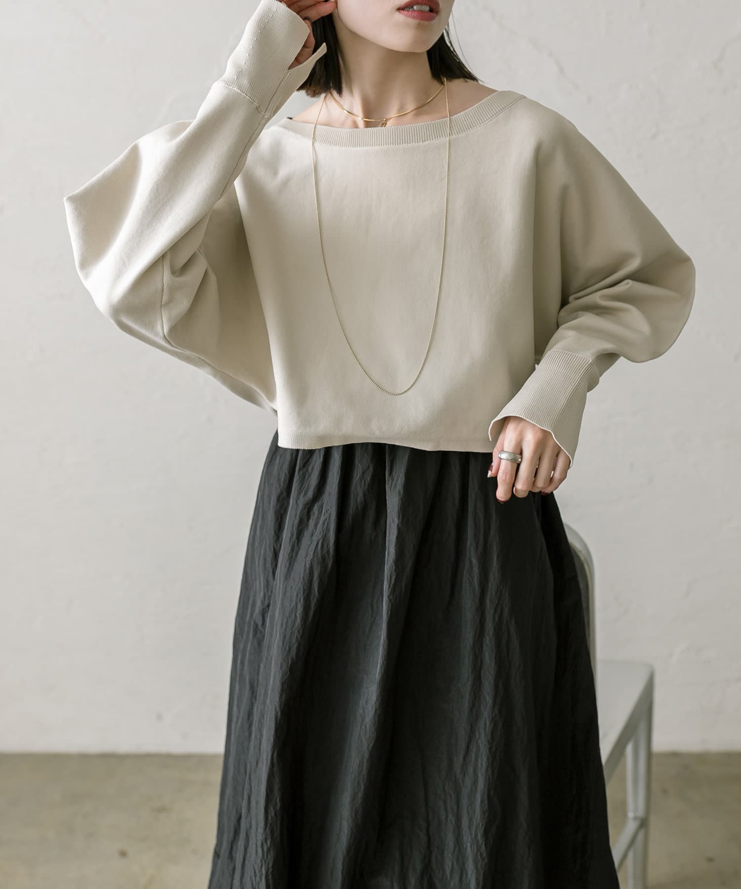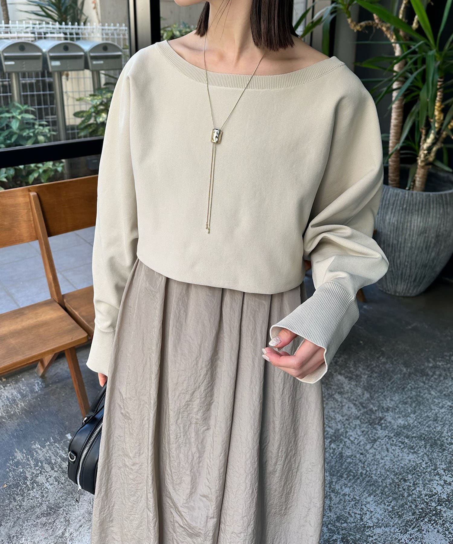・ニットは首回りが広めに開いており、ボリューム感のあるワンピースとバランス良く決まります。