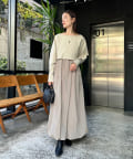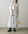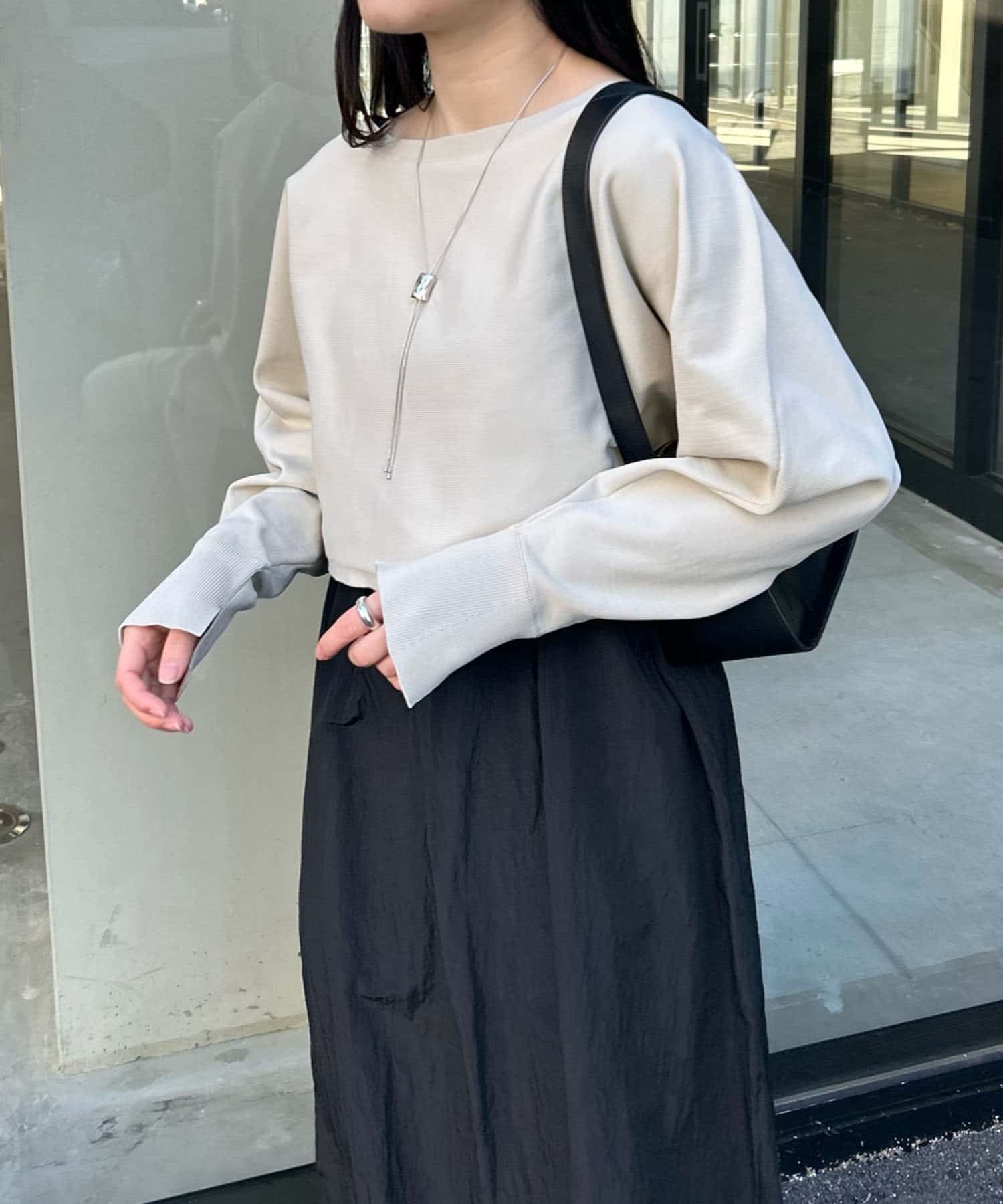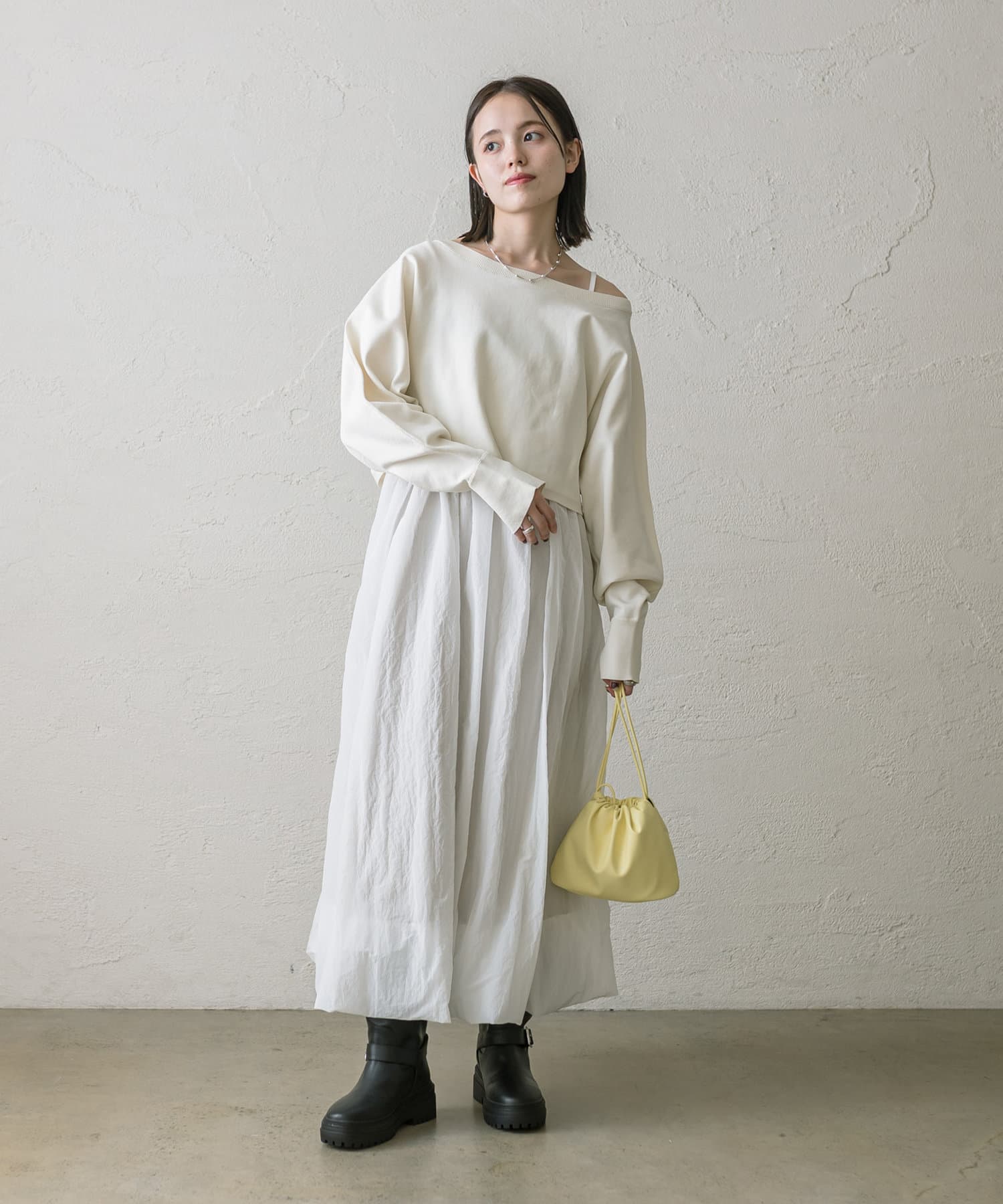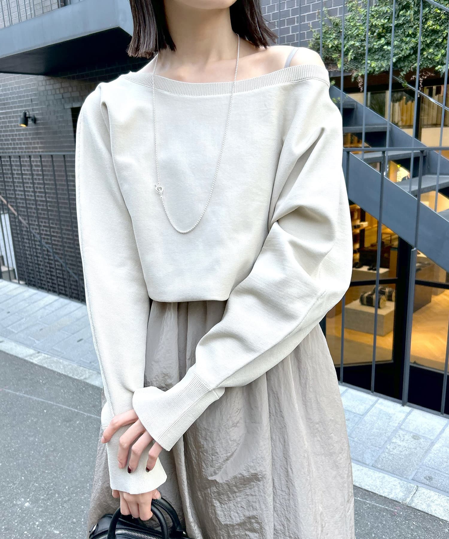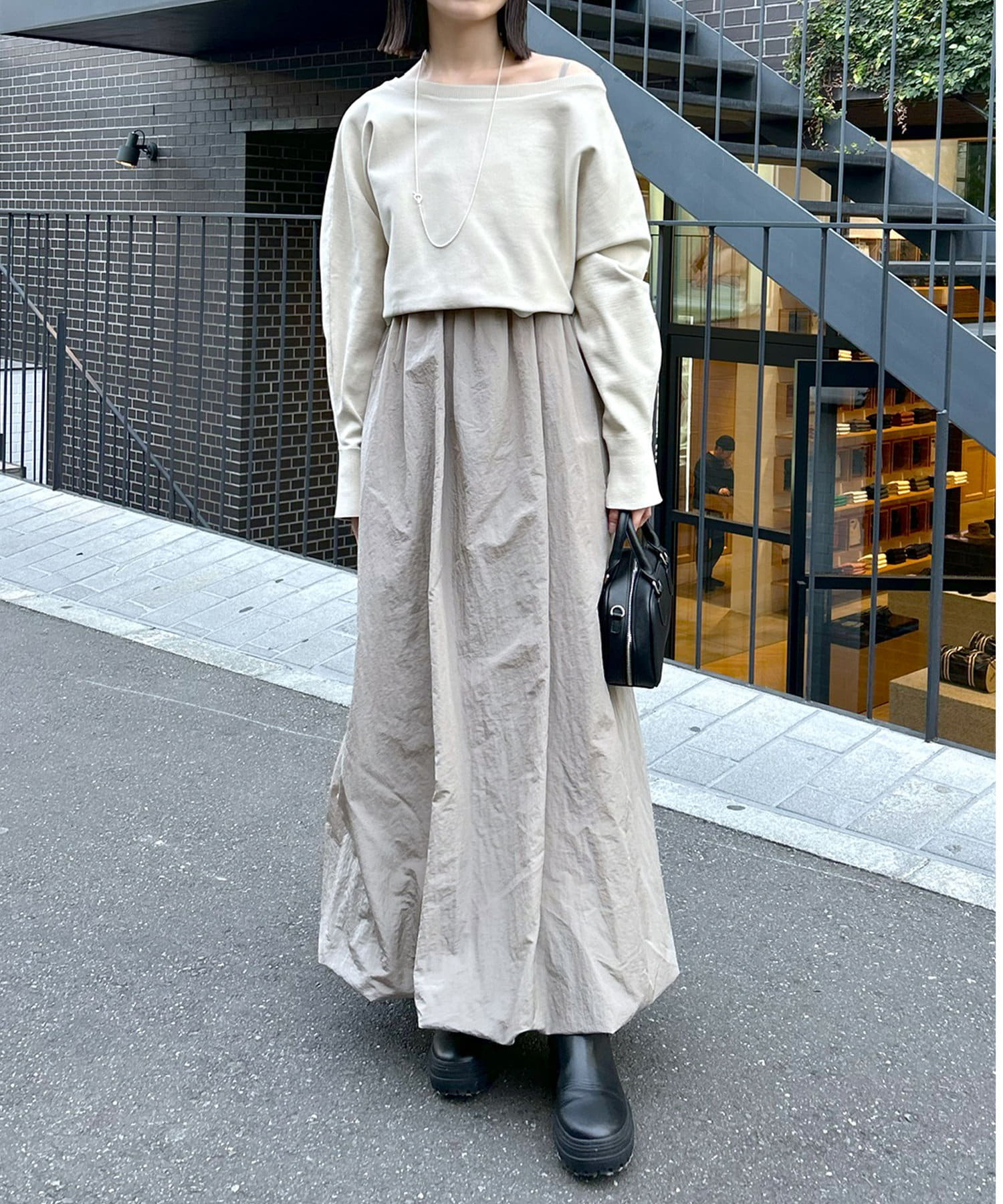 ・ニットは首回りが広めに開いており、ボリューム感のあるワンピースとバランス良く決まります。