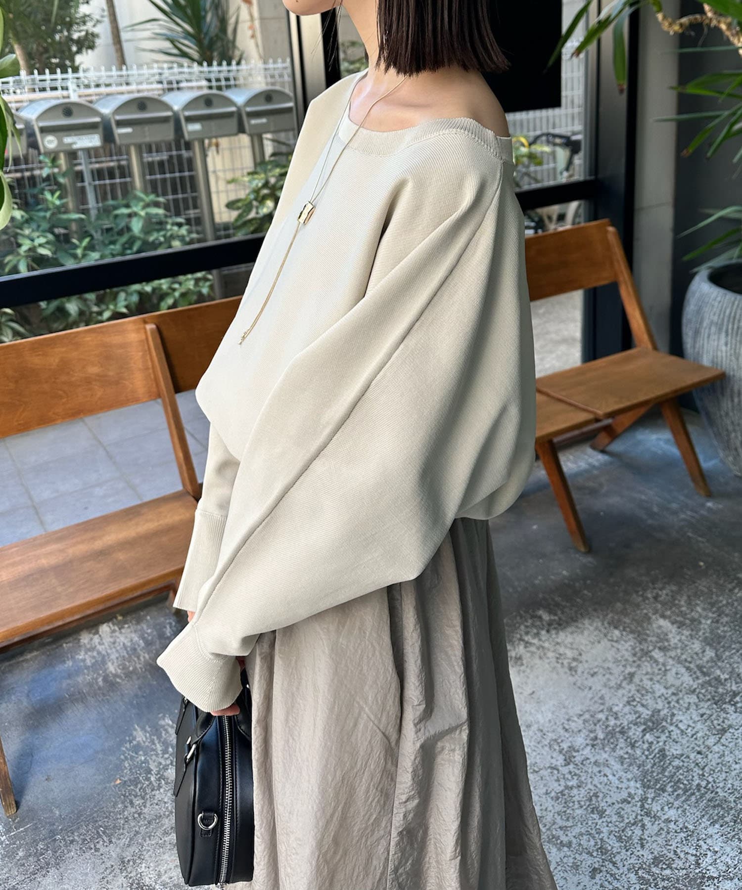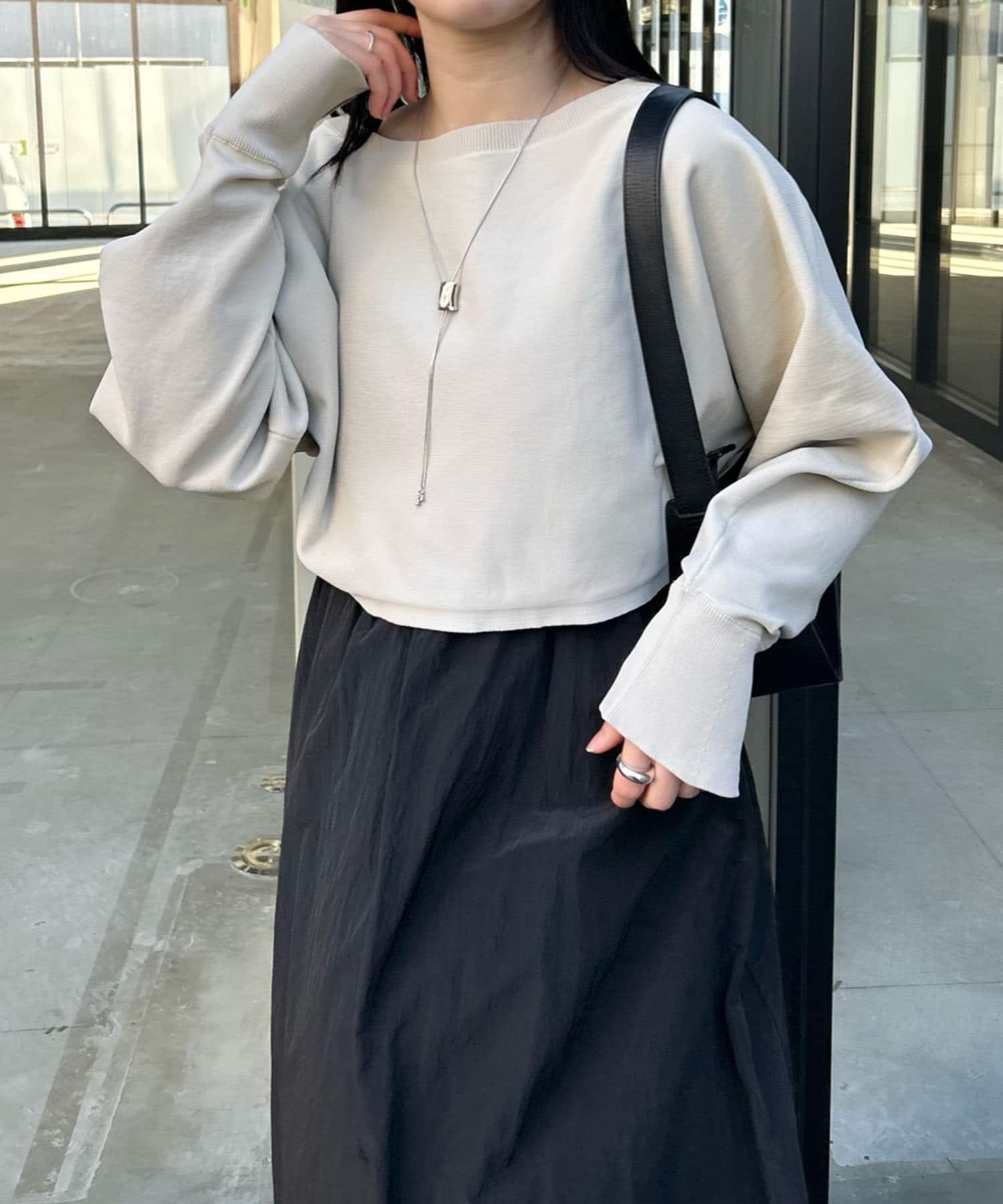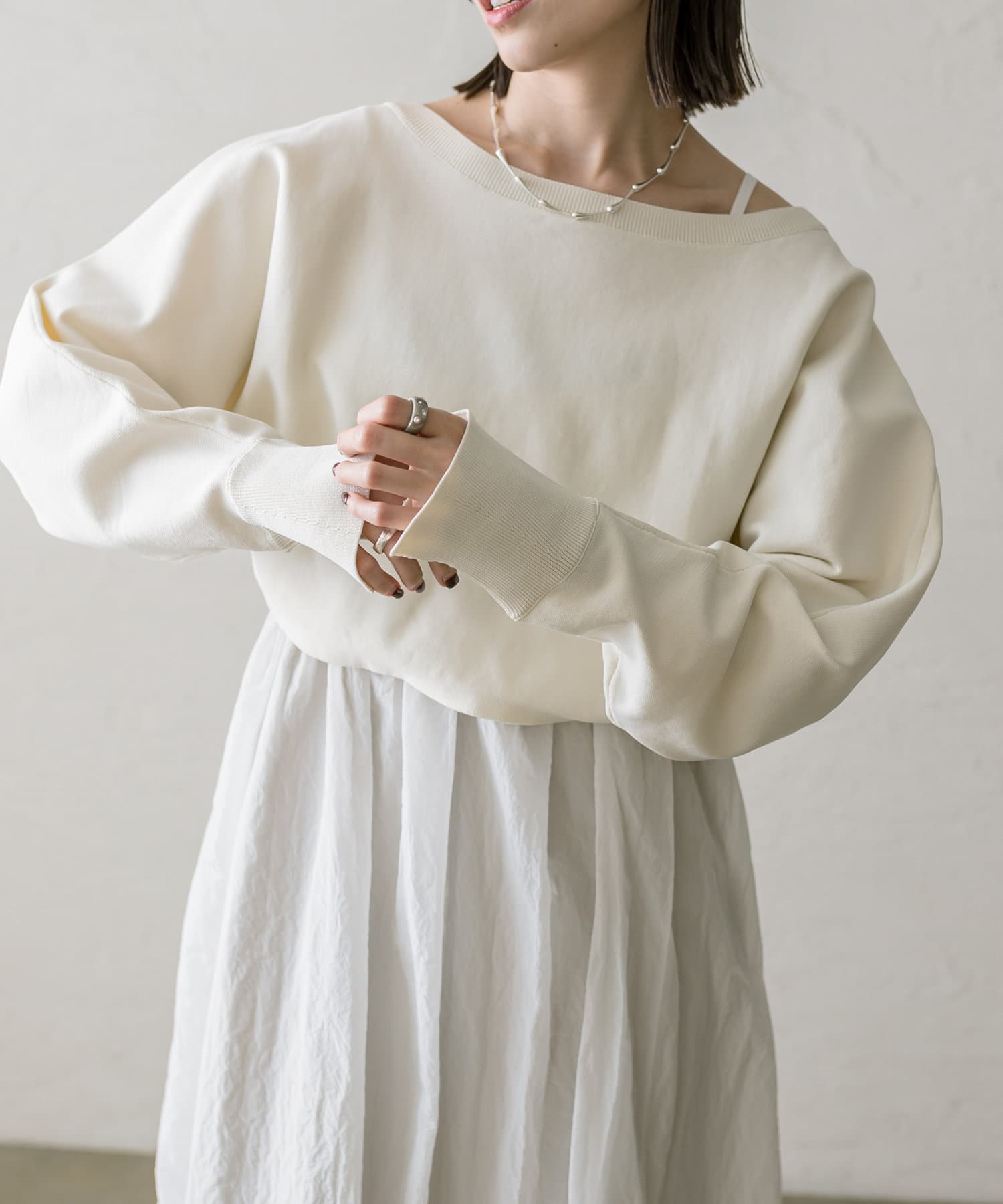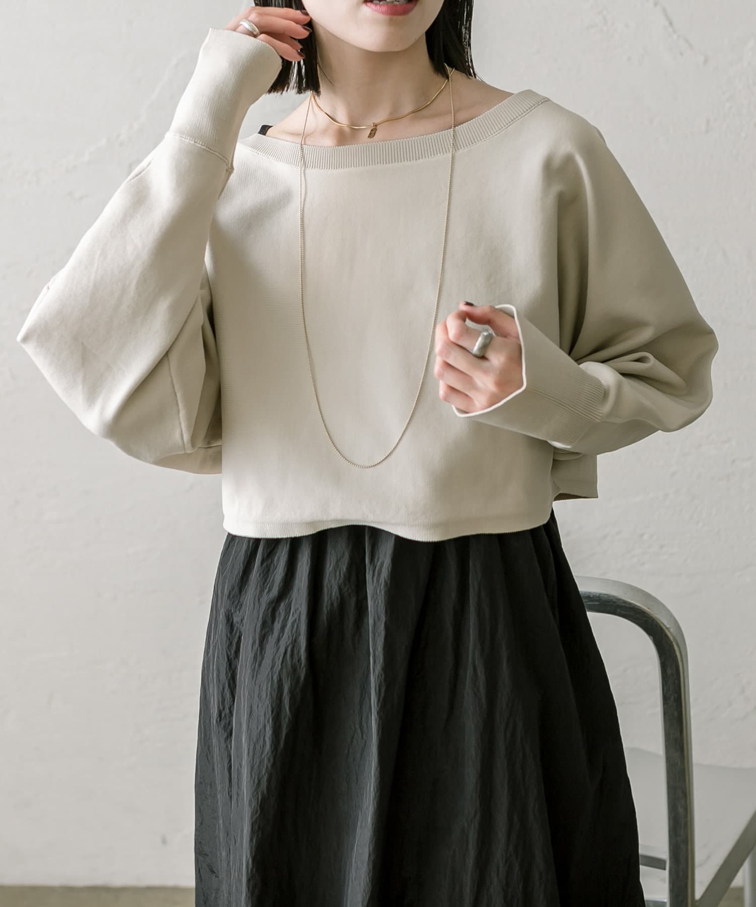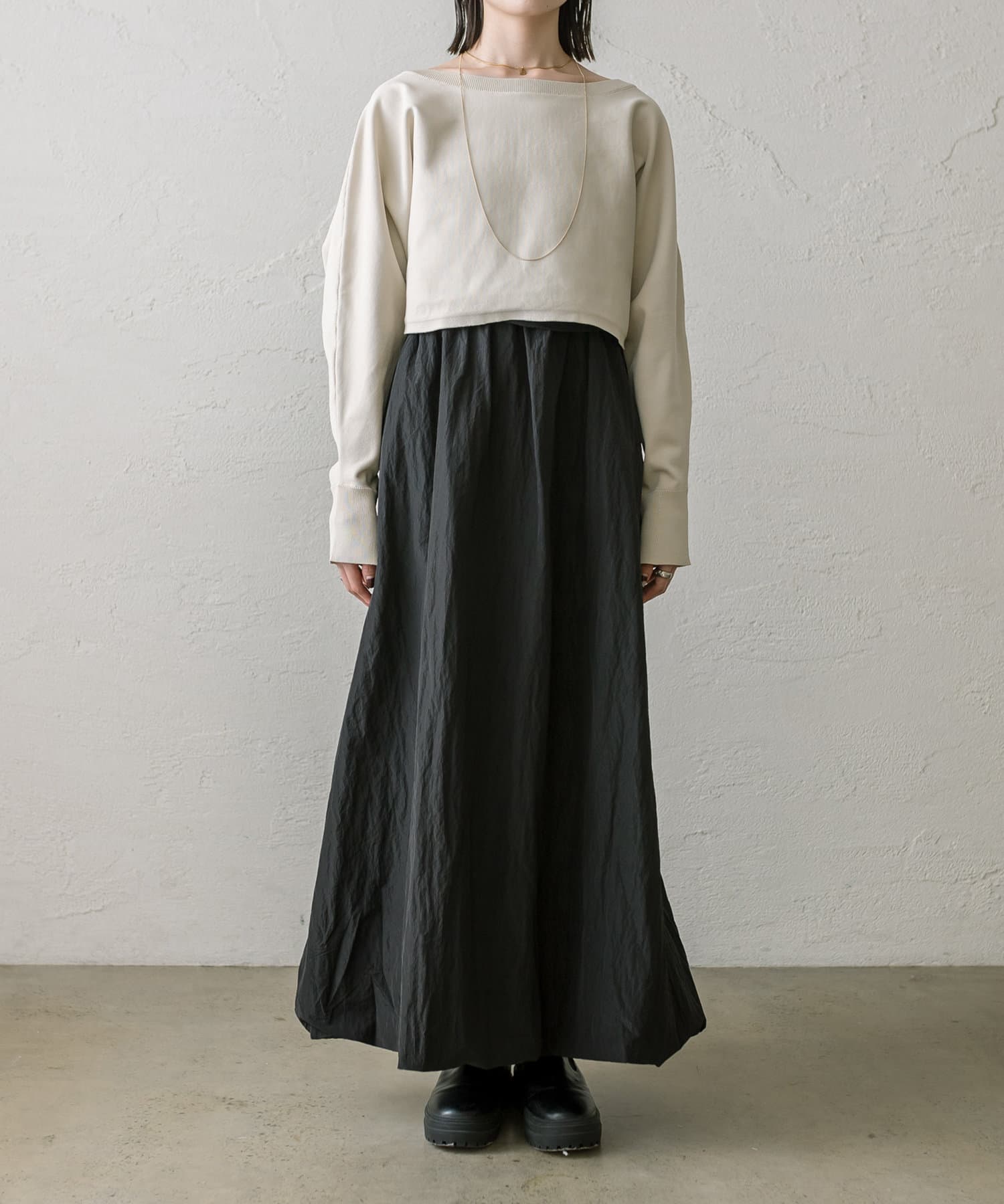 ・ニットは首回りが広めに開いており、ボリューム感のあるワンピースとバランス良く決まります。