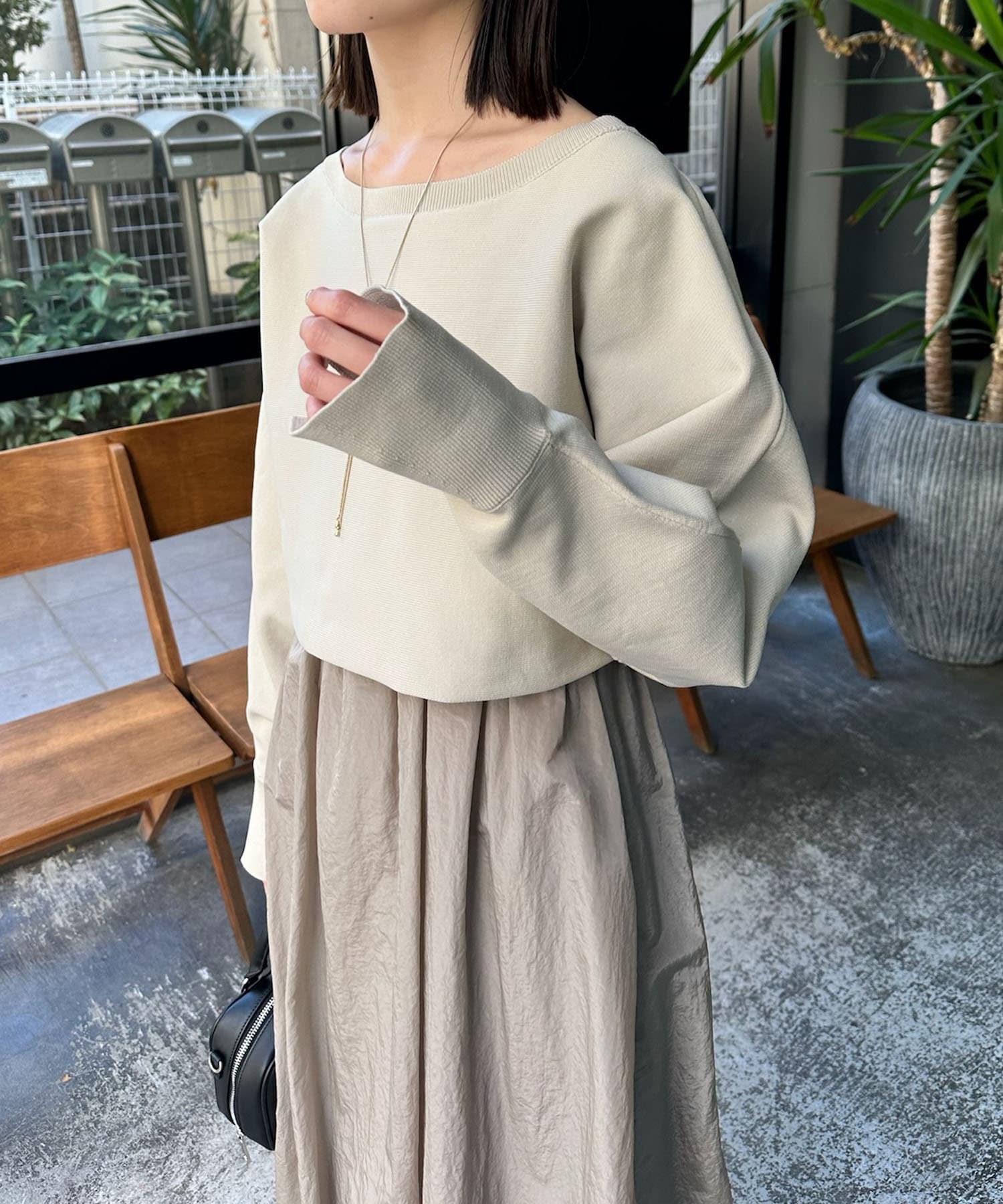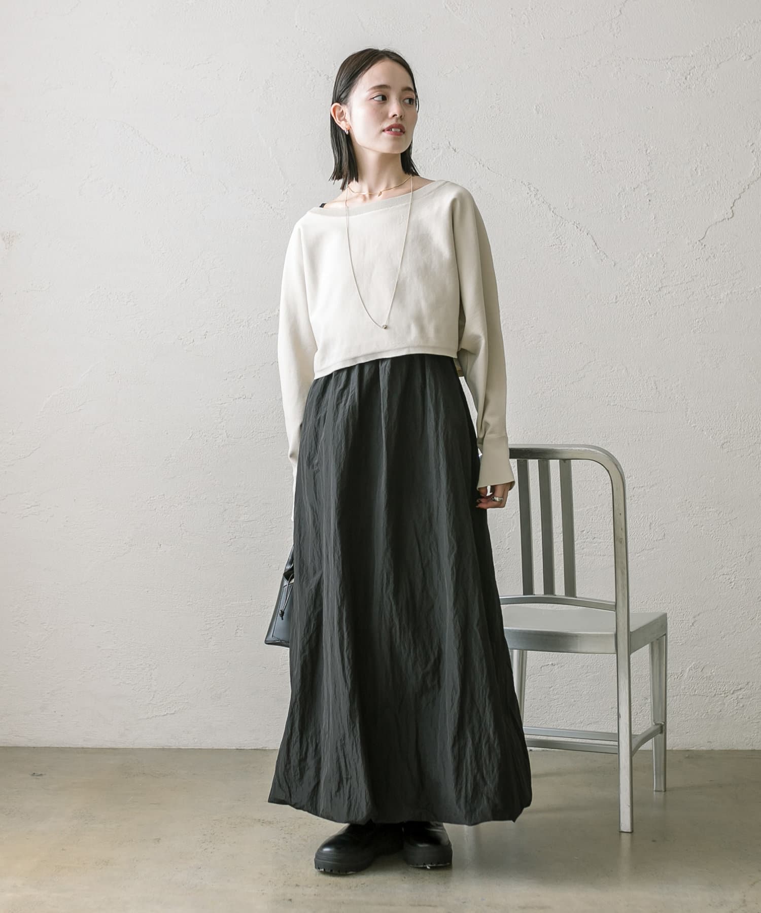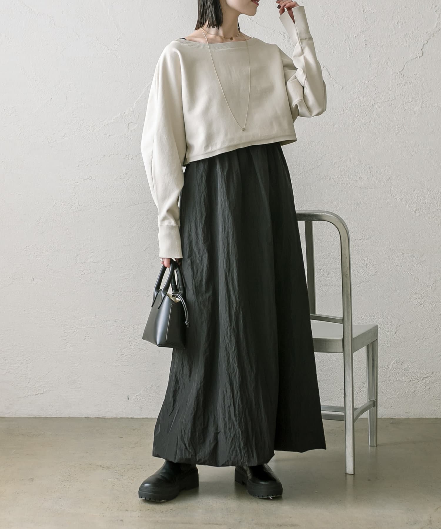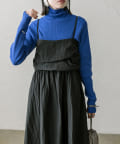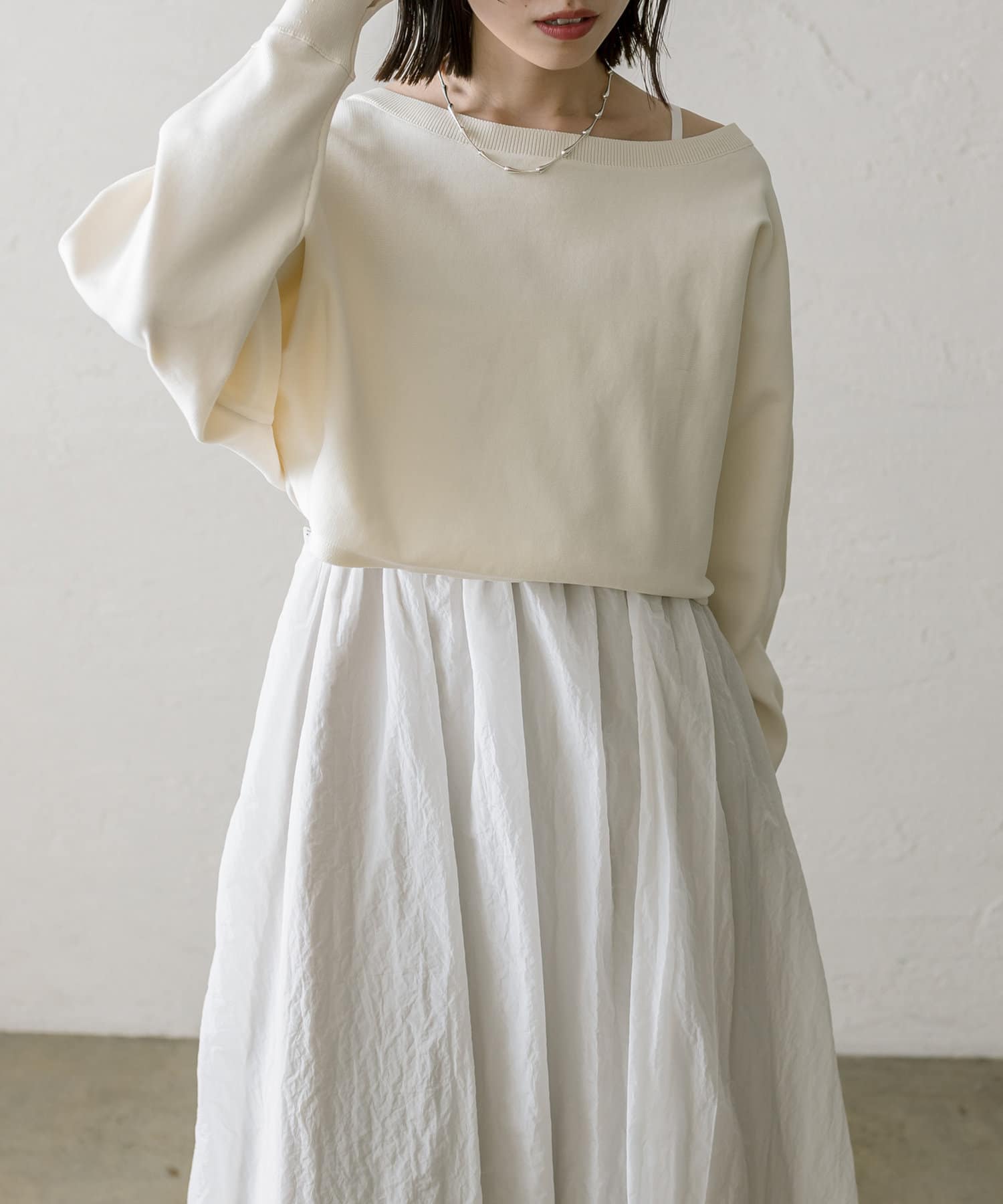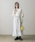 ・ニットは首回りが広めに開いており、ボリューム感のあるワンピースとバランス良く決まります。