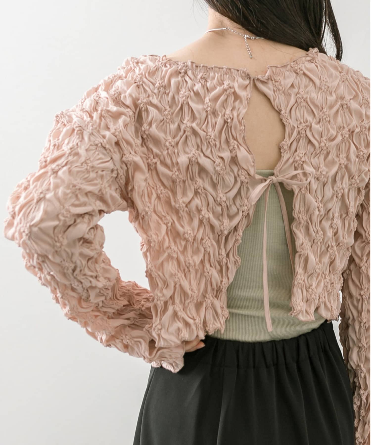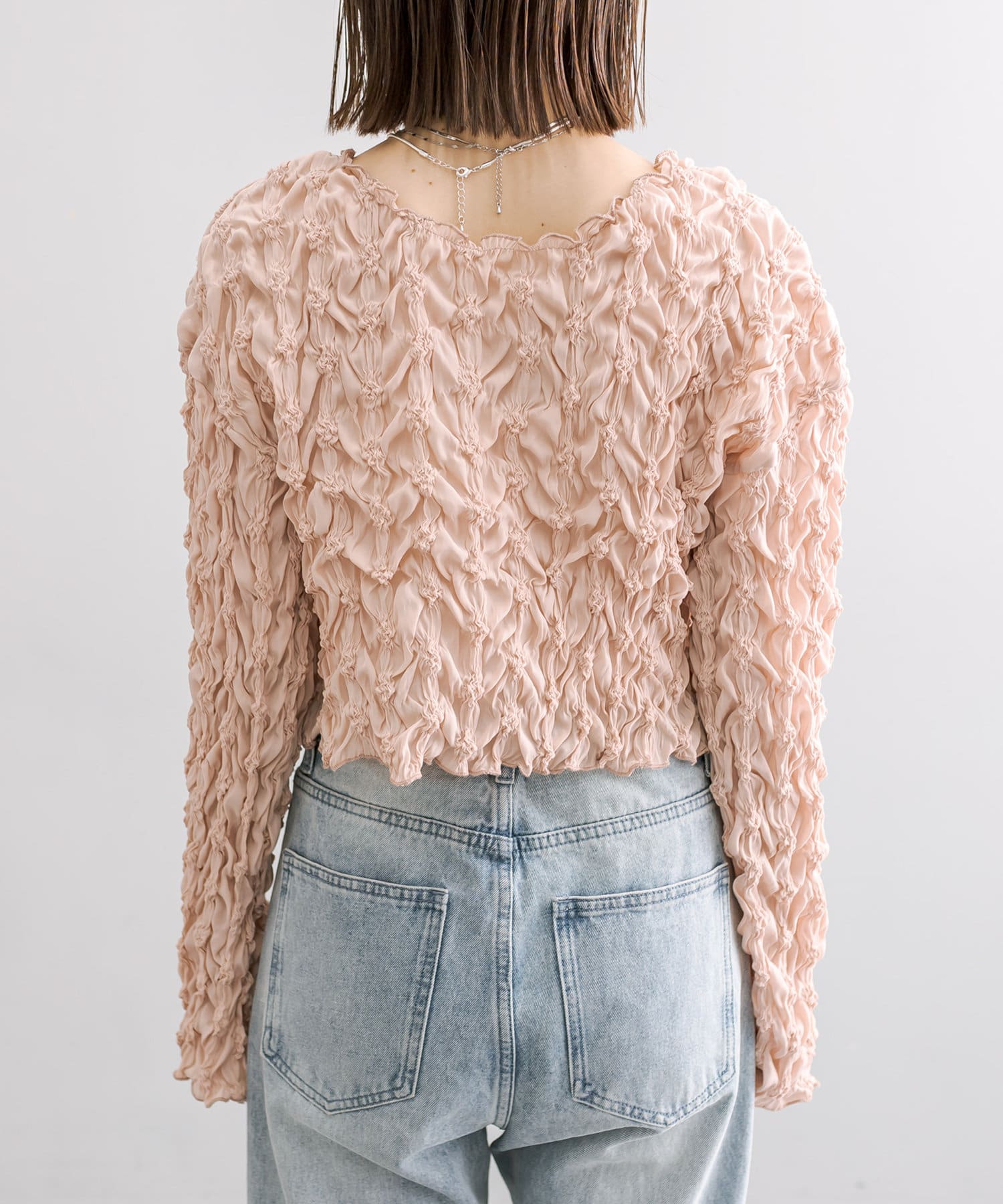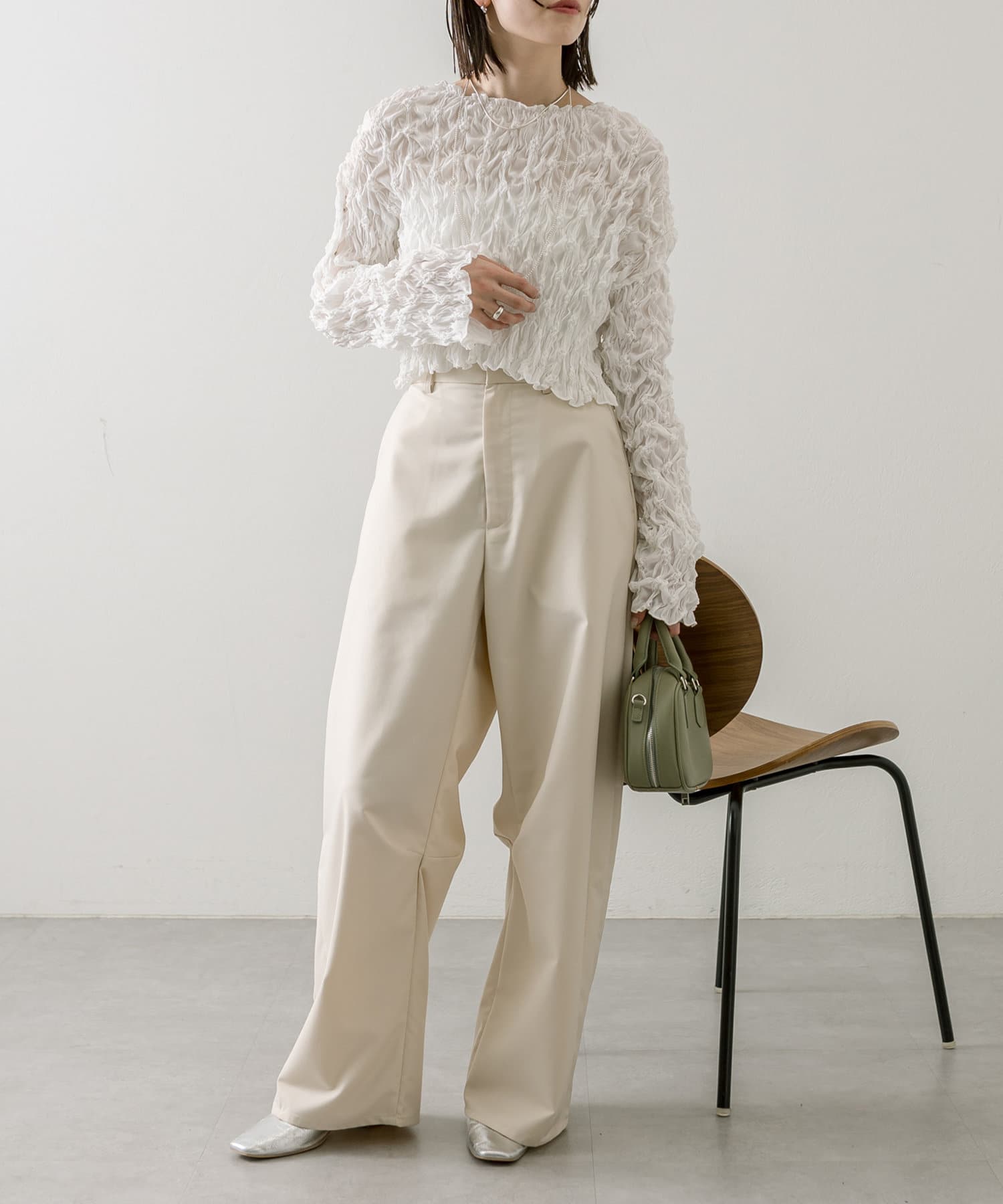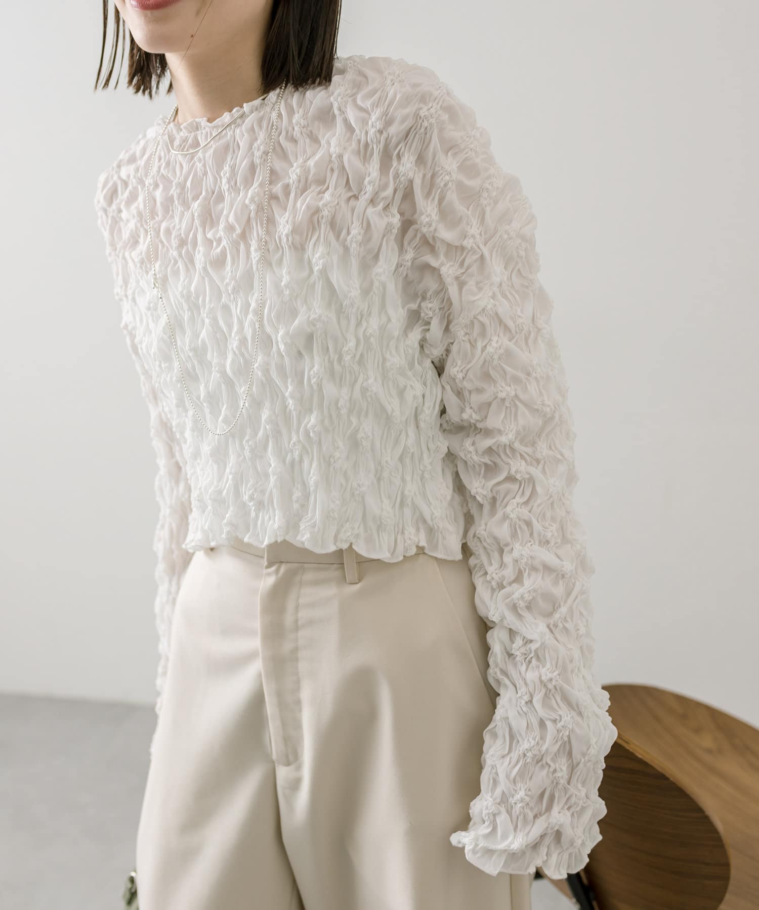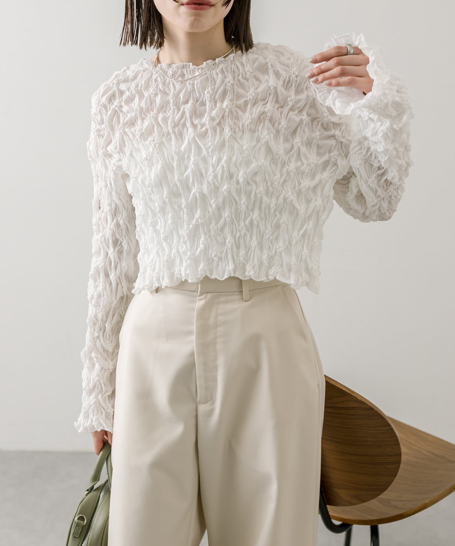 ・目を惹くシャーリング素材のコンパクトブラウス。