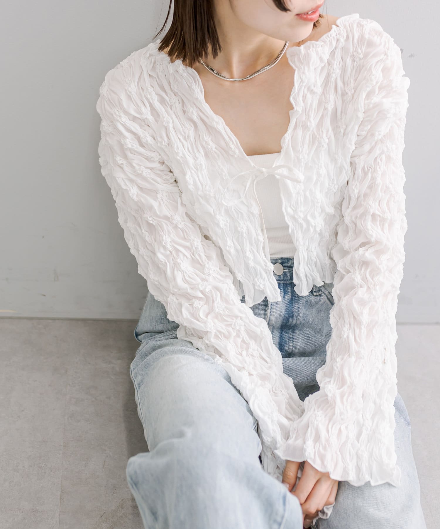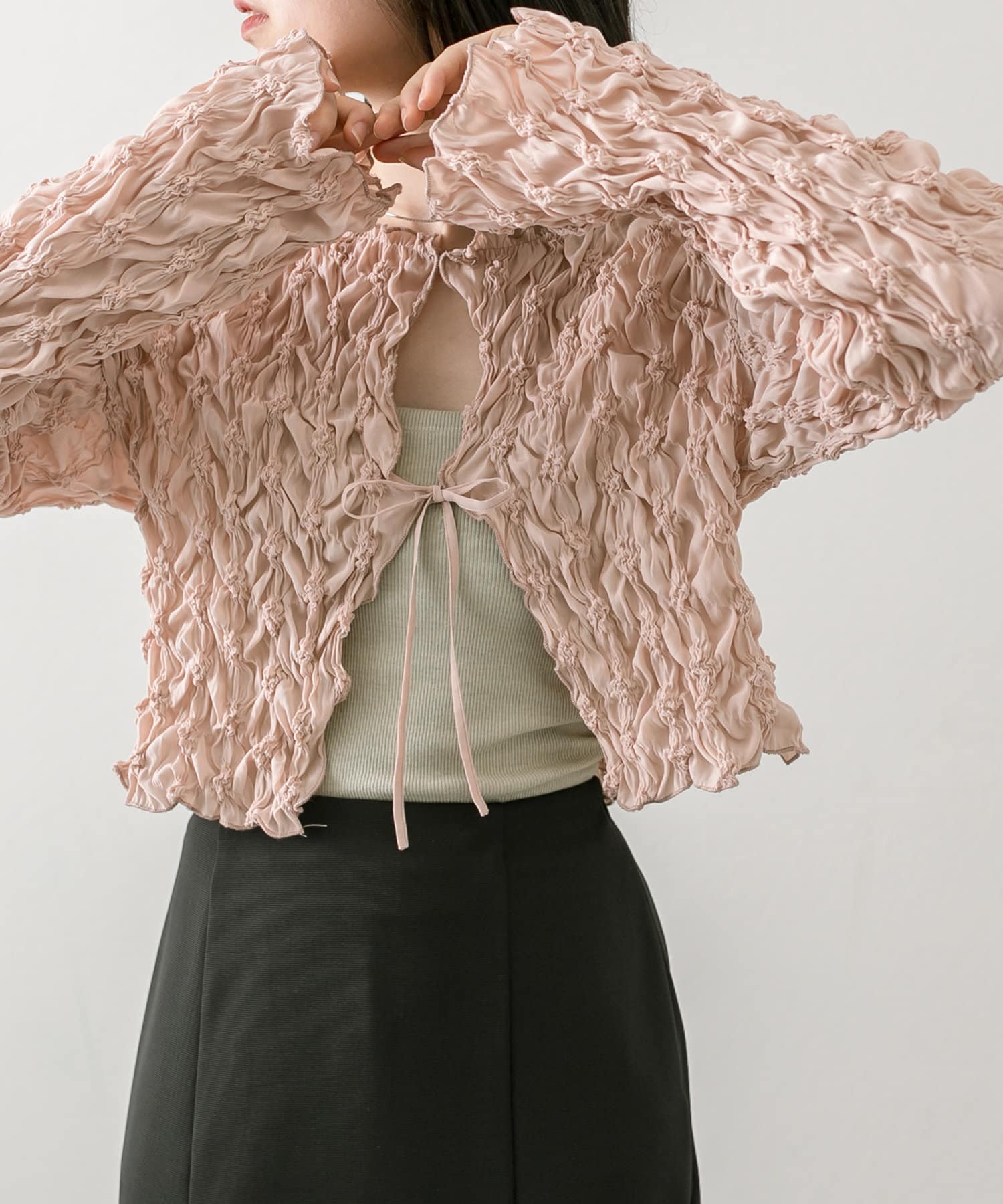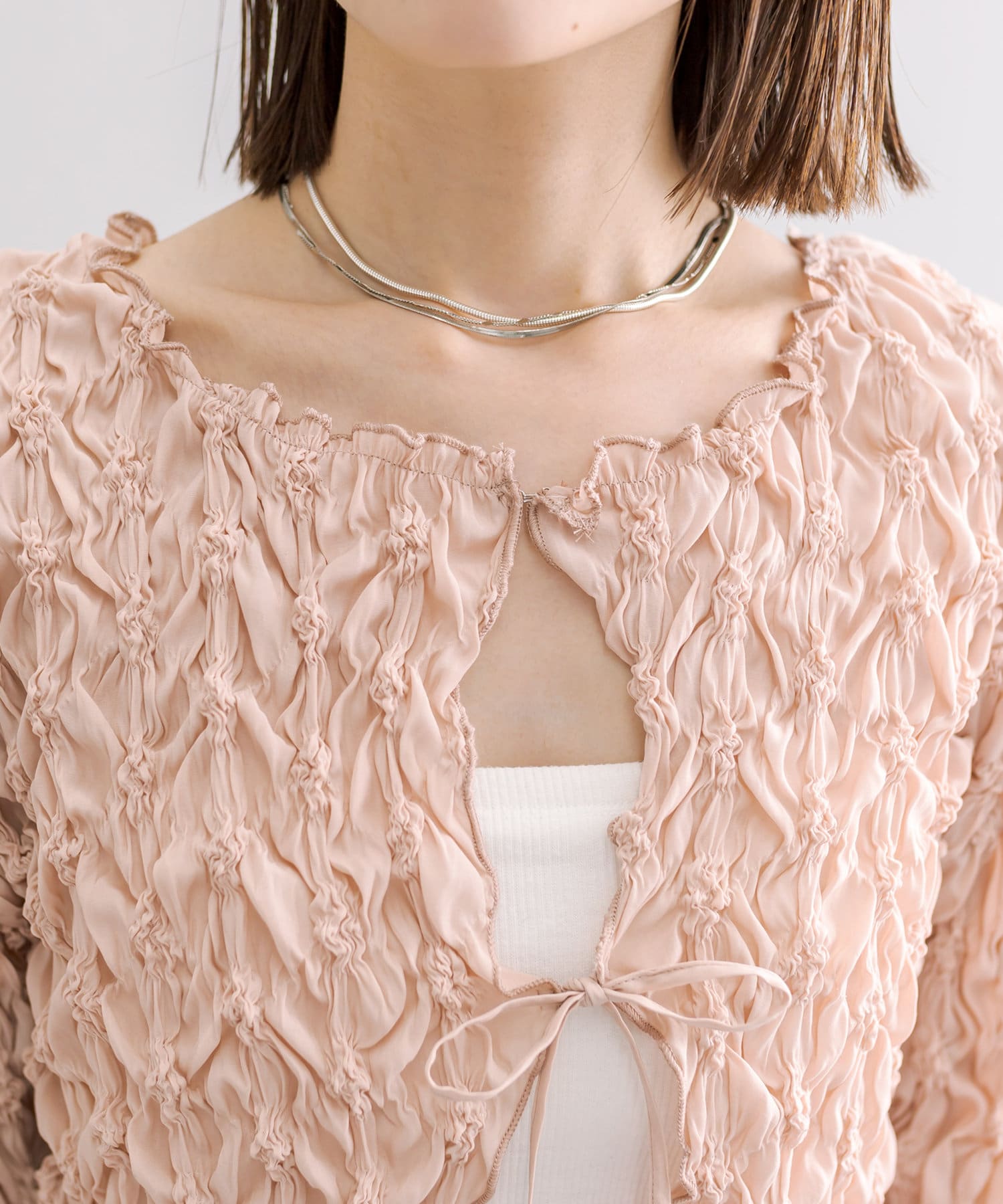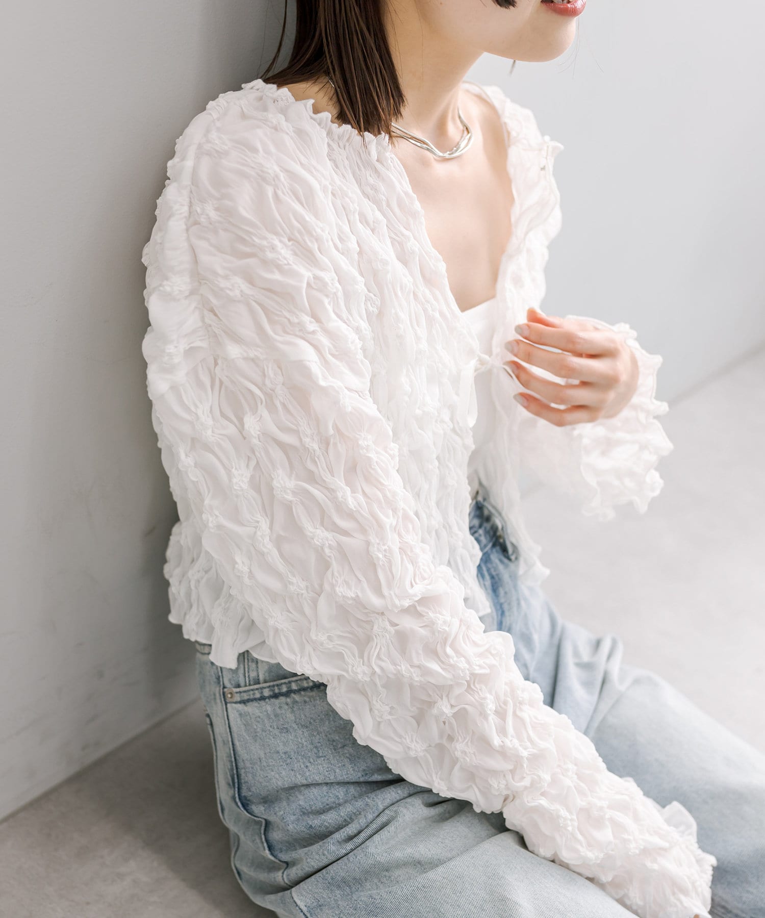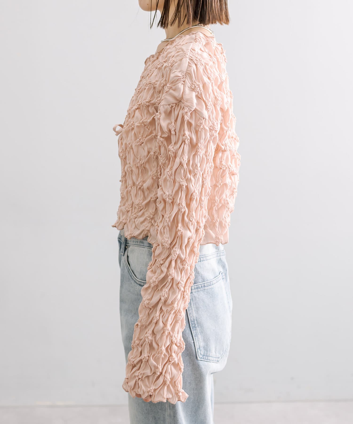 ・目を惹くシャーリング素材のコンパクトブラウス。