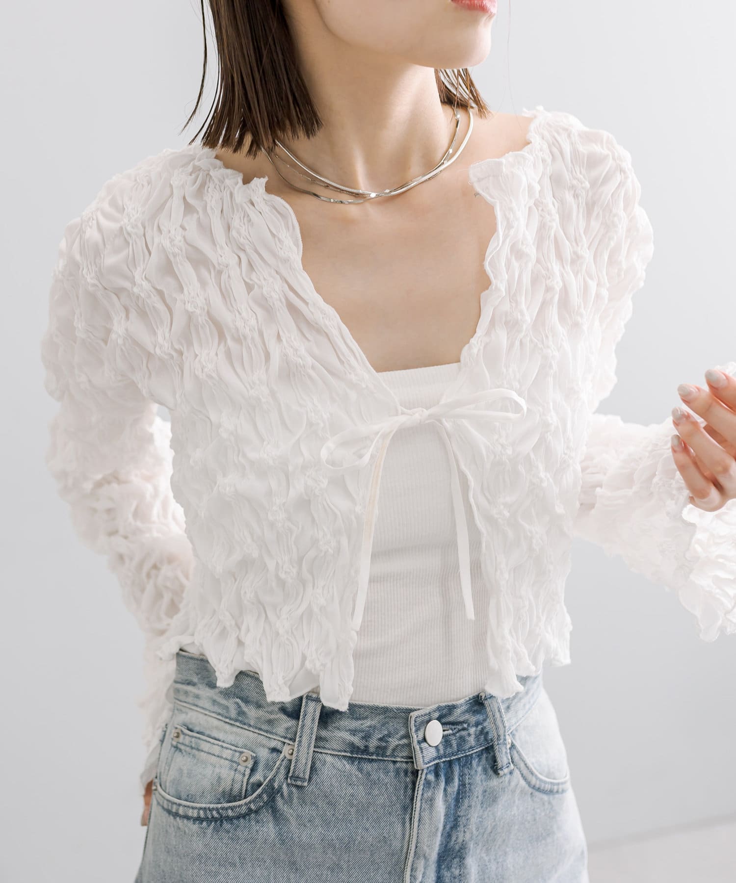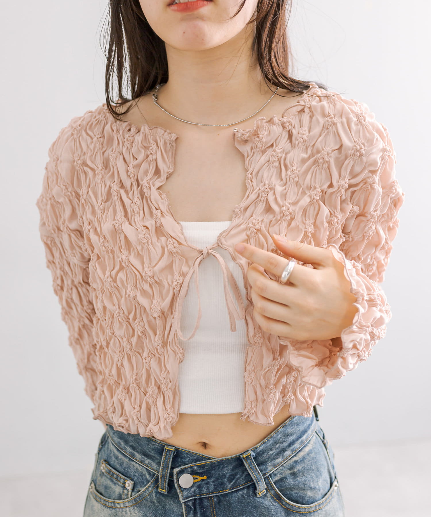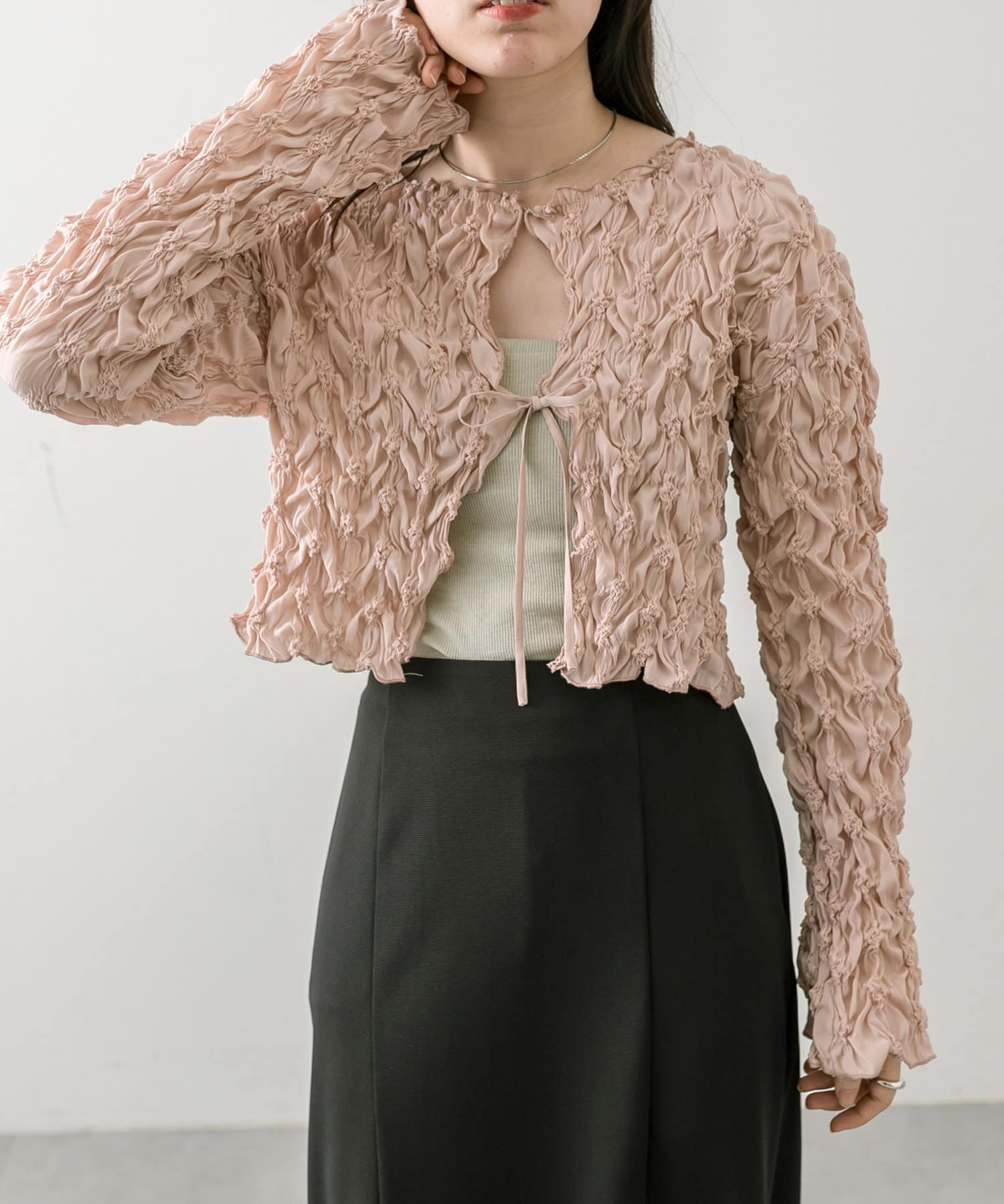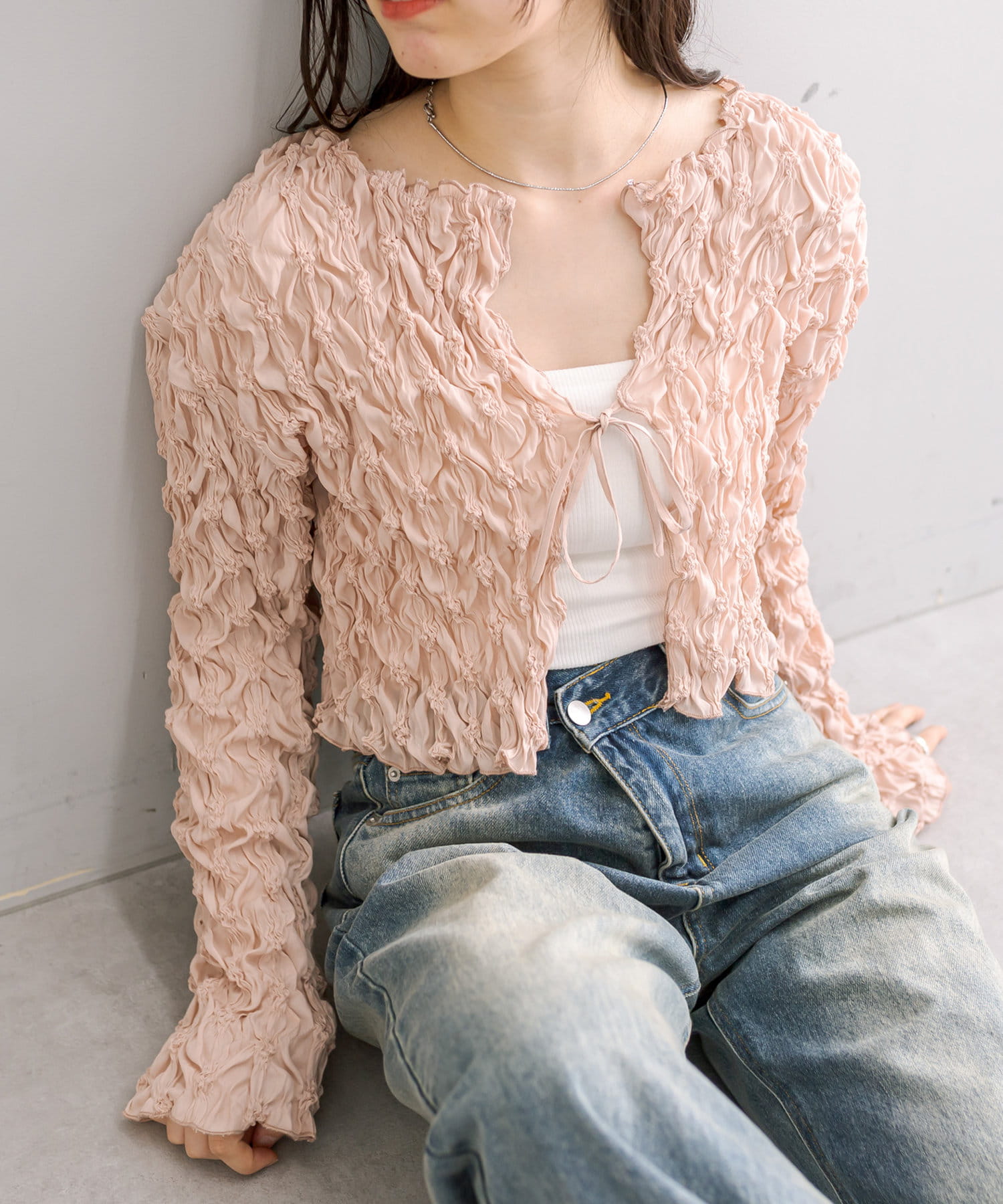 ・目を惹くシャーリング素材のコンパクトブラウス。