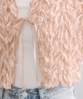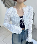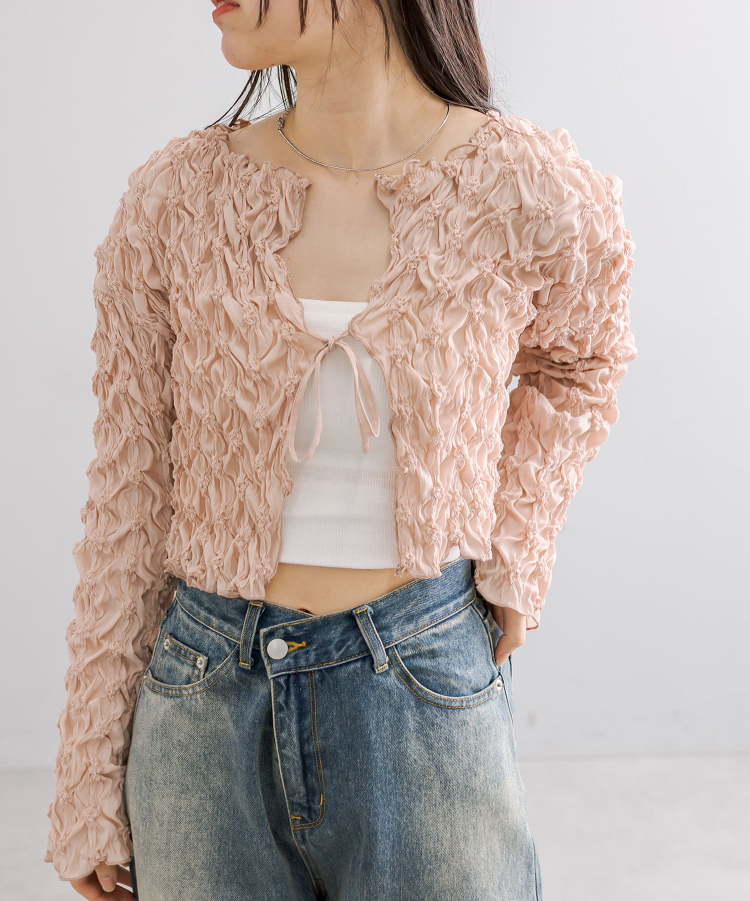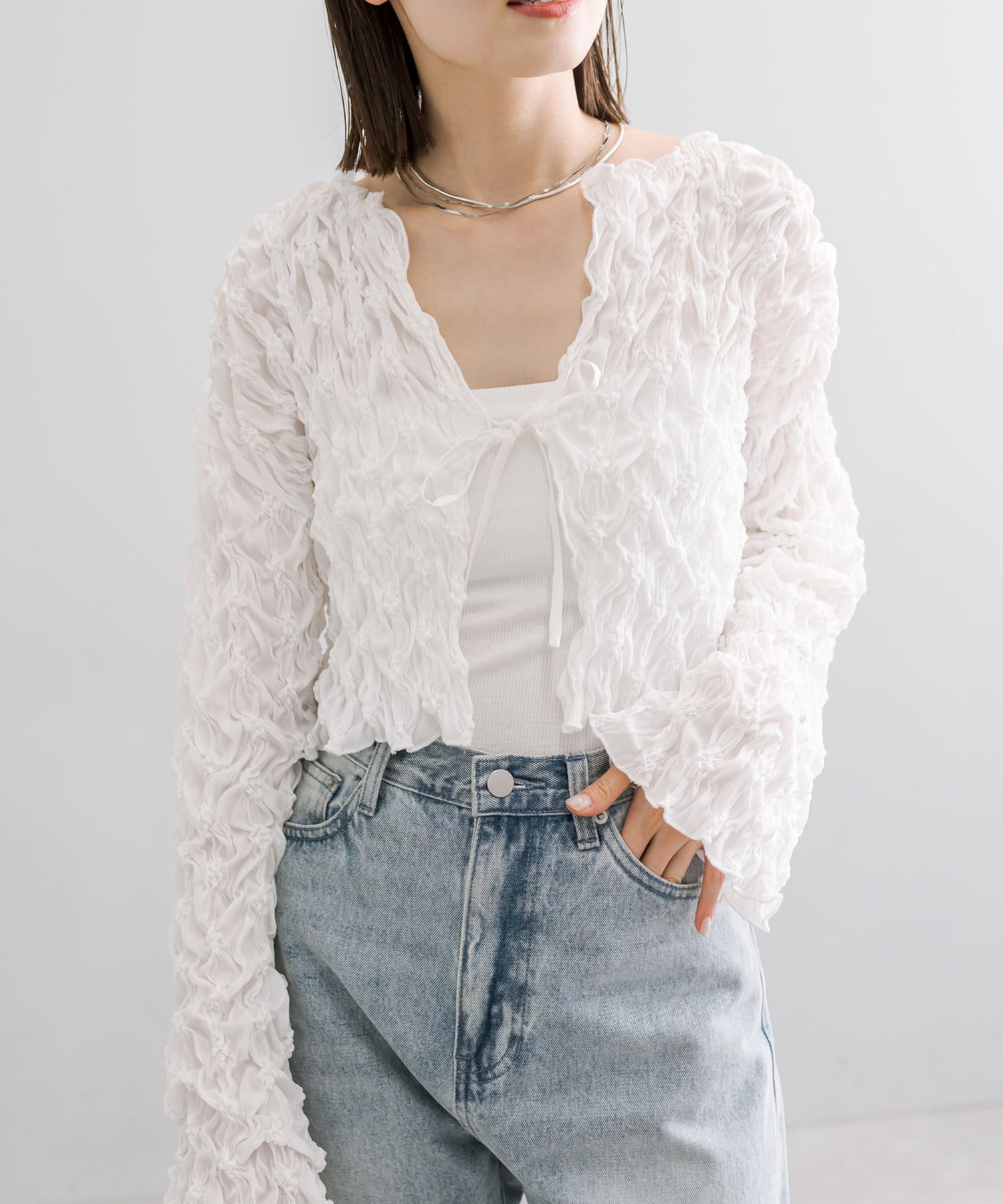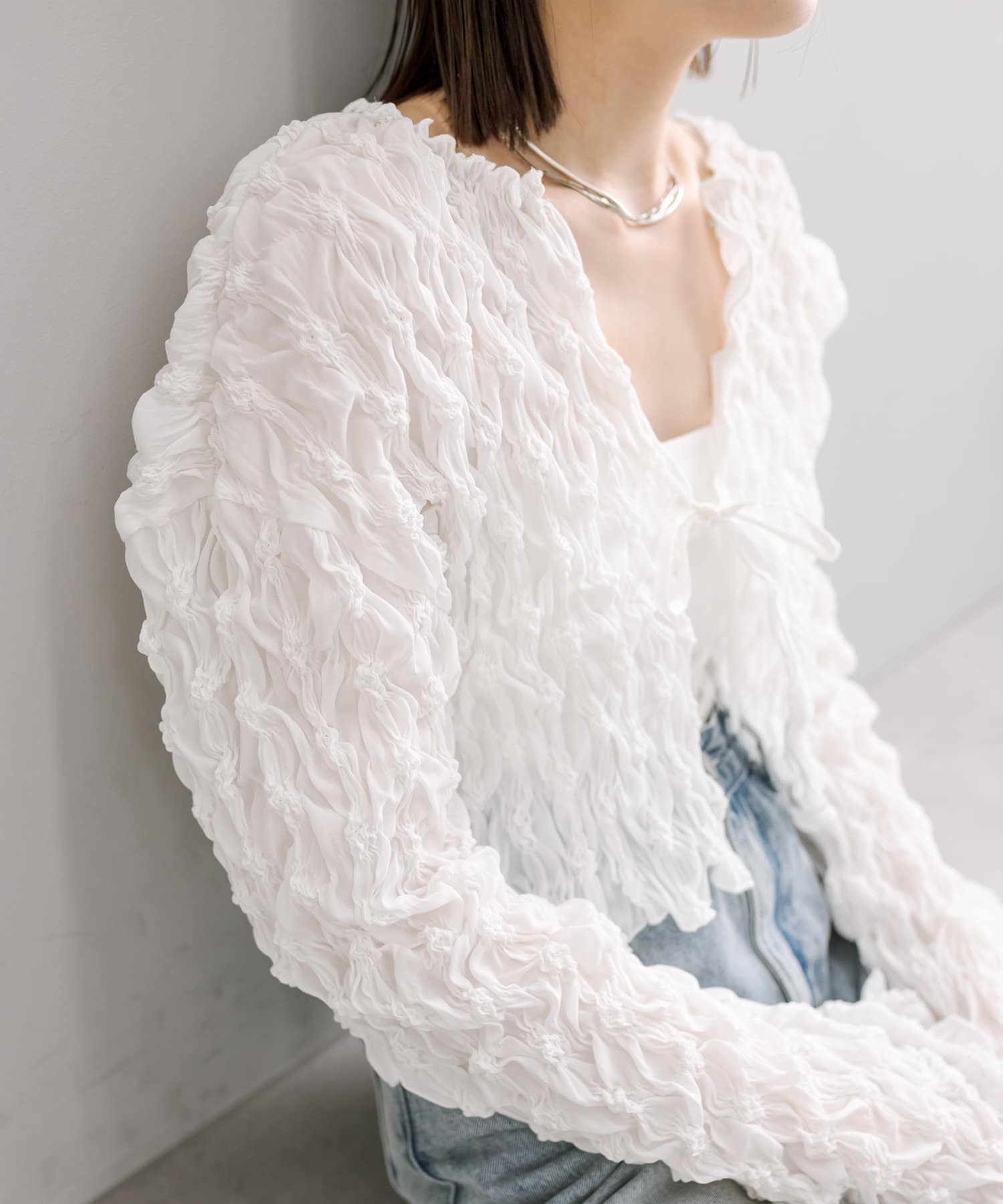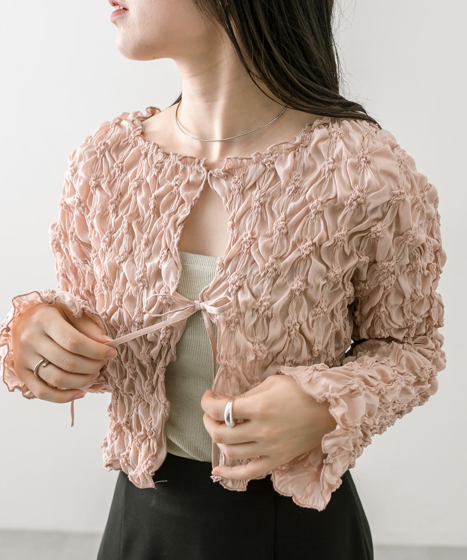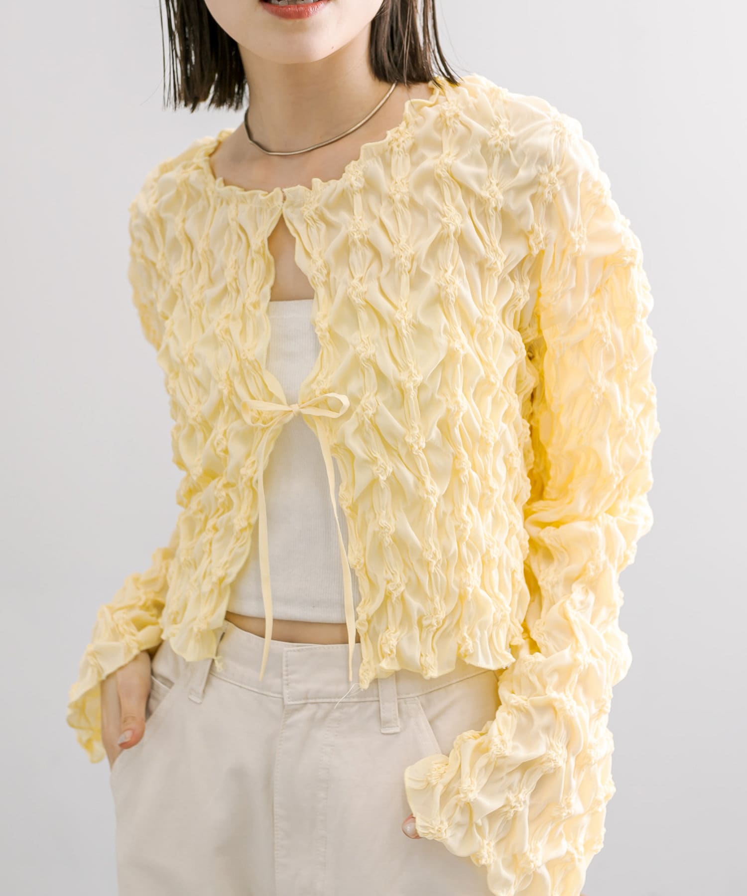 ・目を惹くシャーリング素材のコンパクトブラウス。