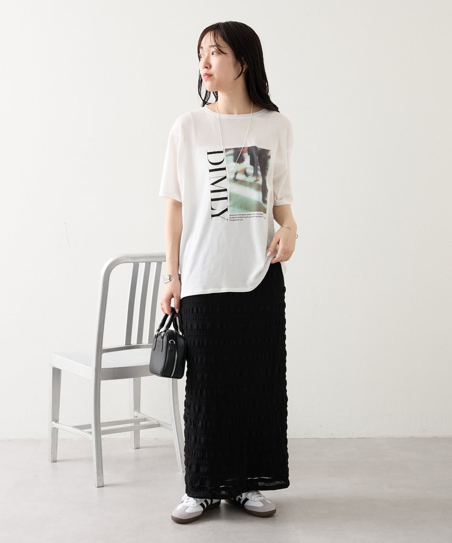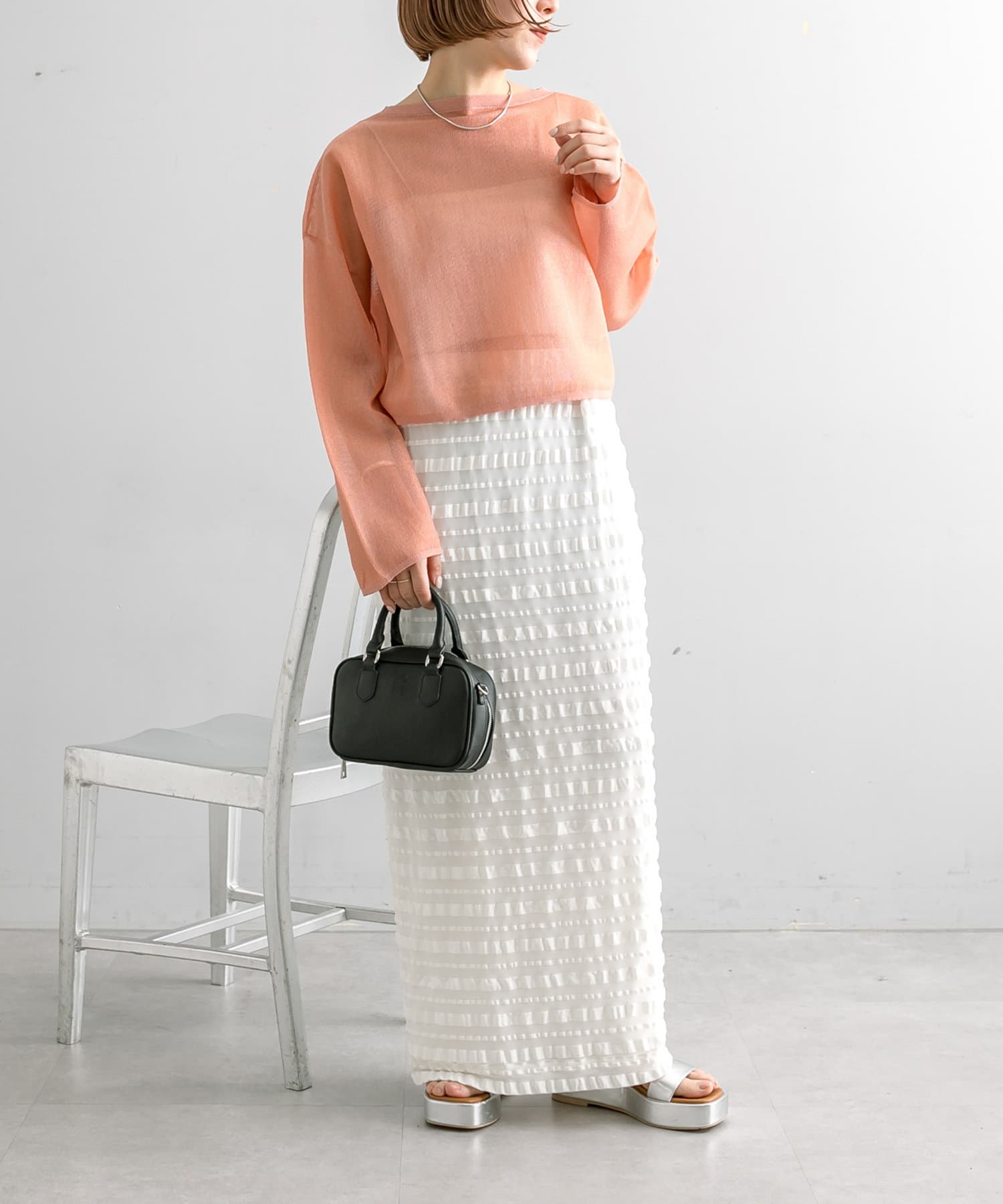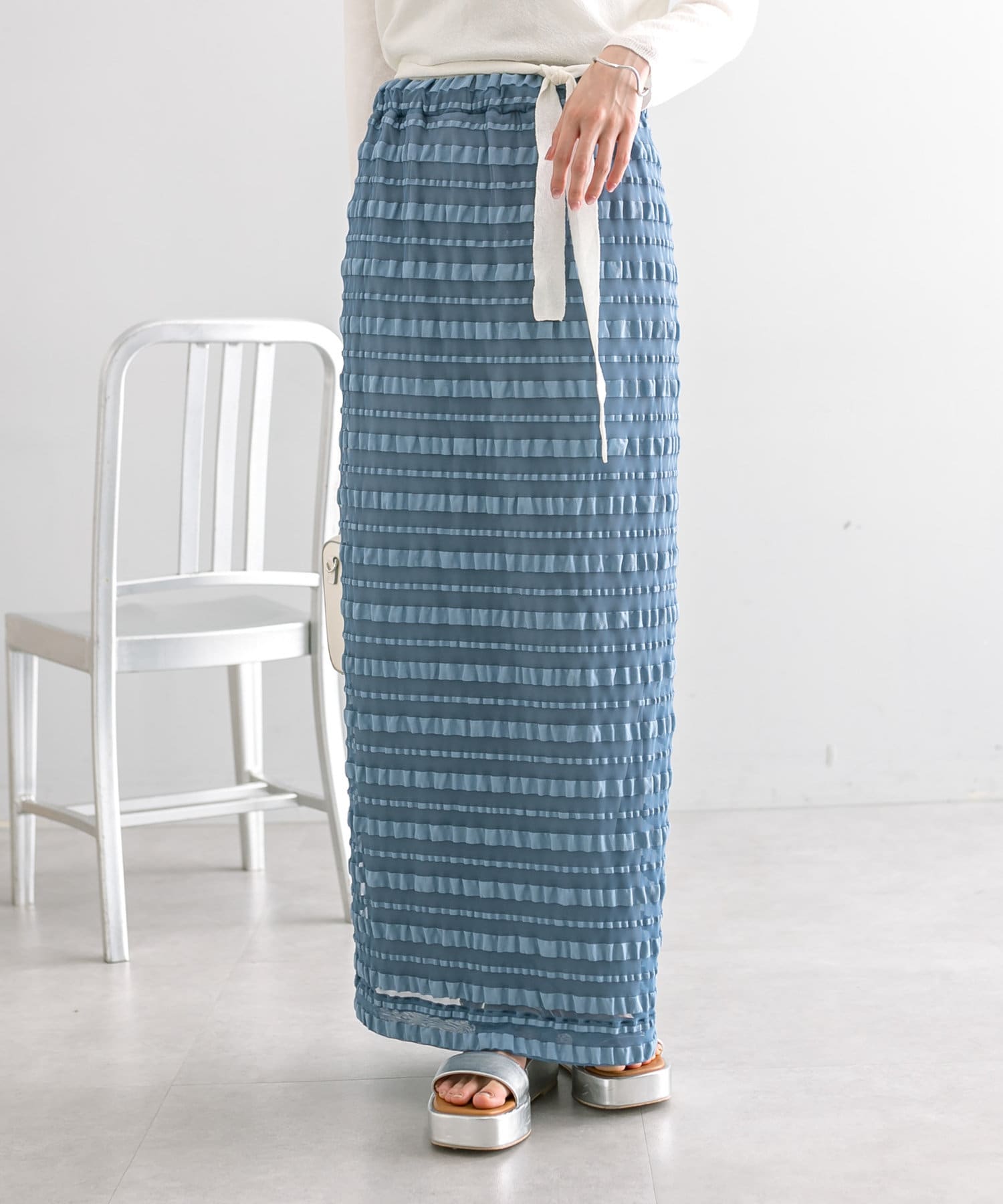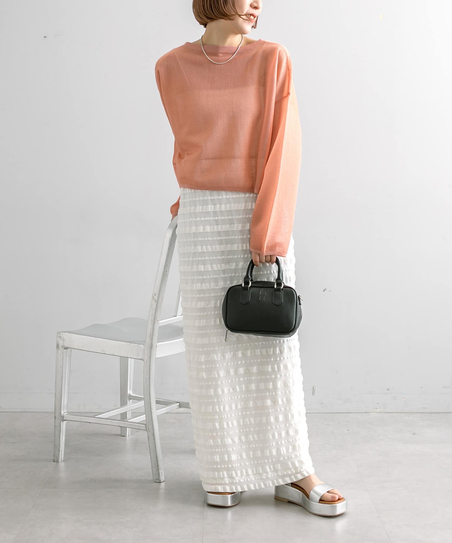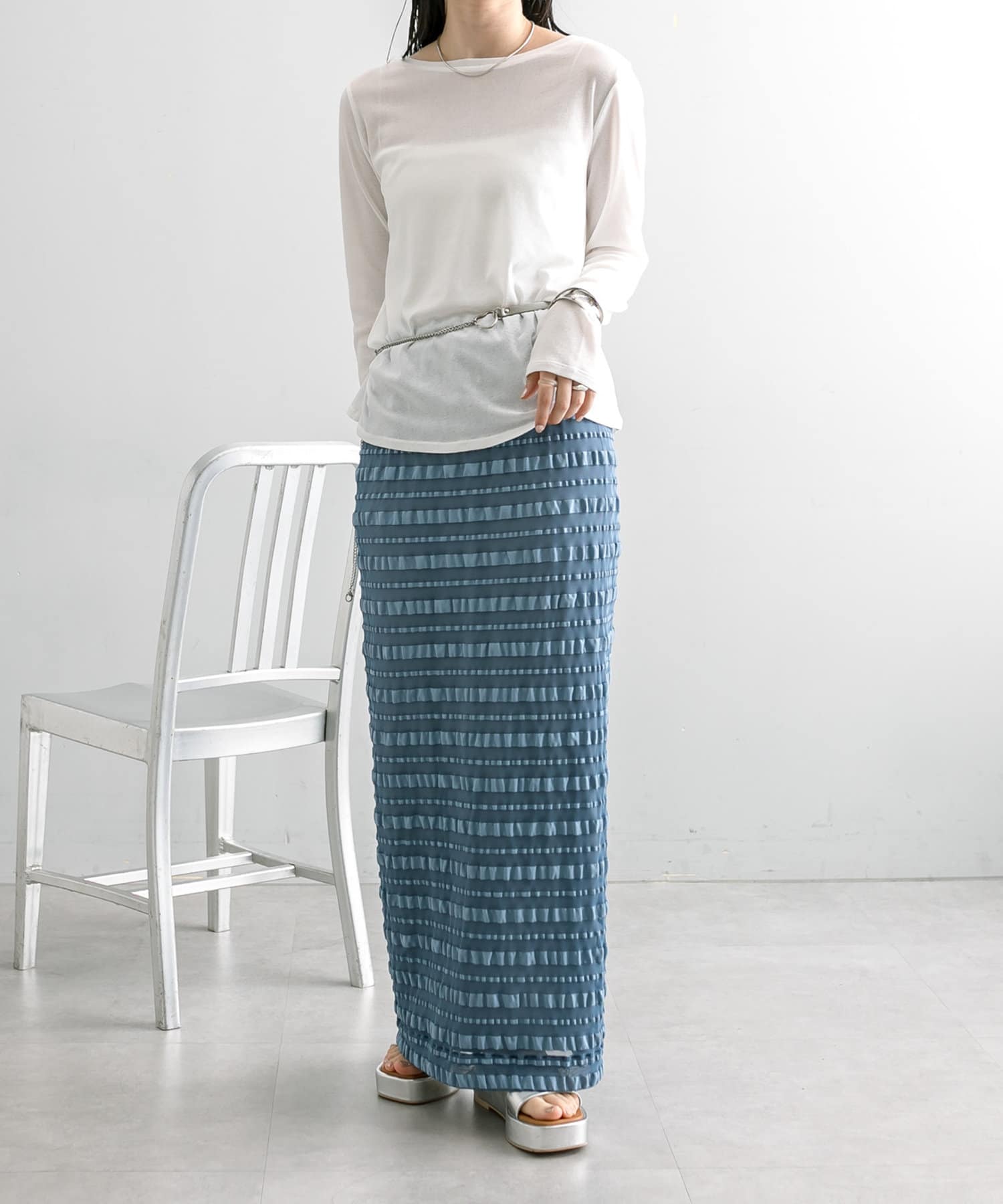 シアー素材が抜け感のあるスタイリングに仕上げてくれるロングスカート。