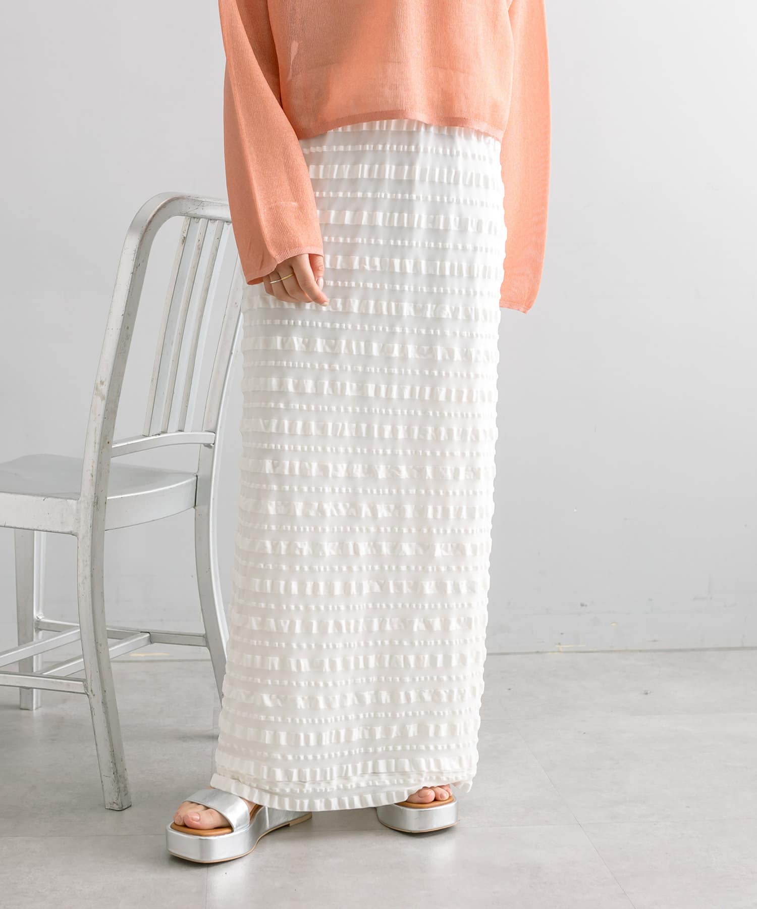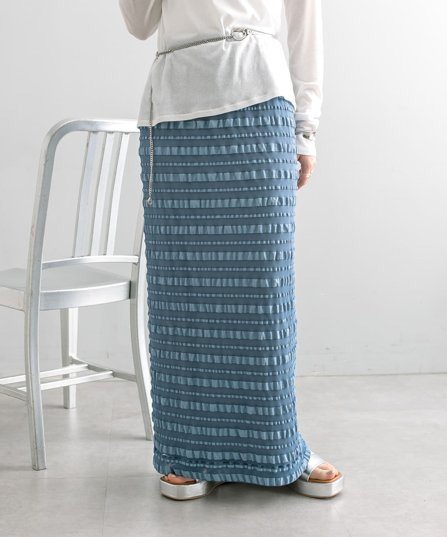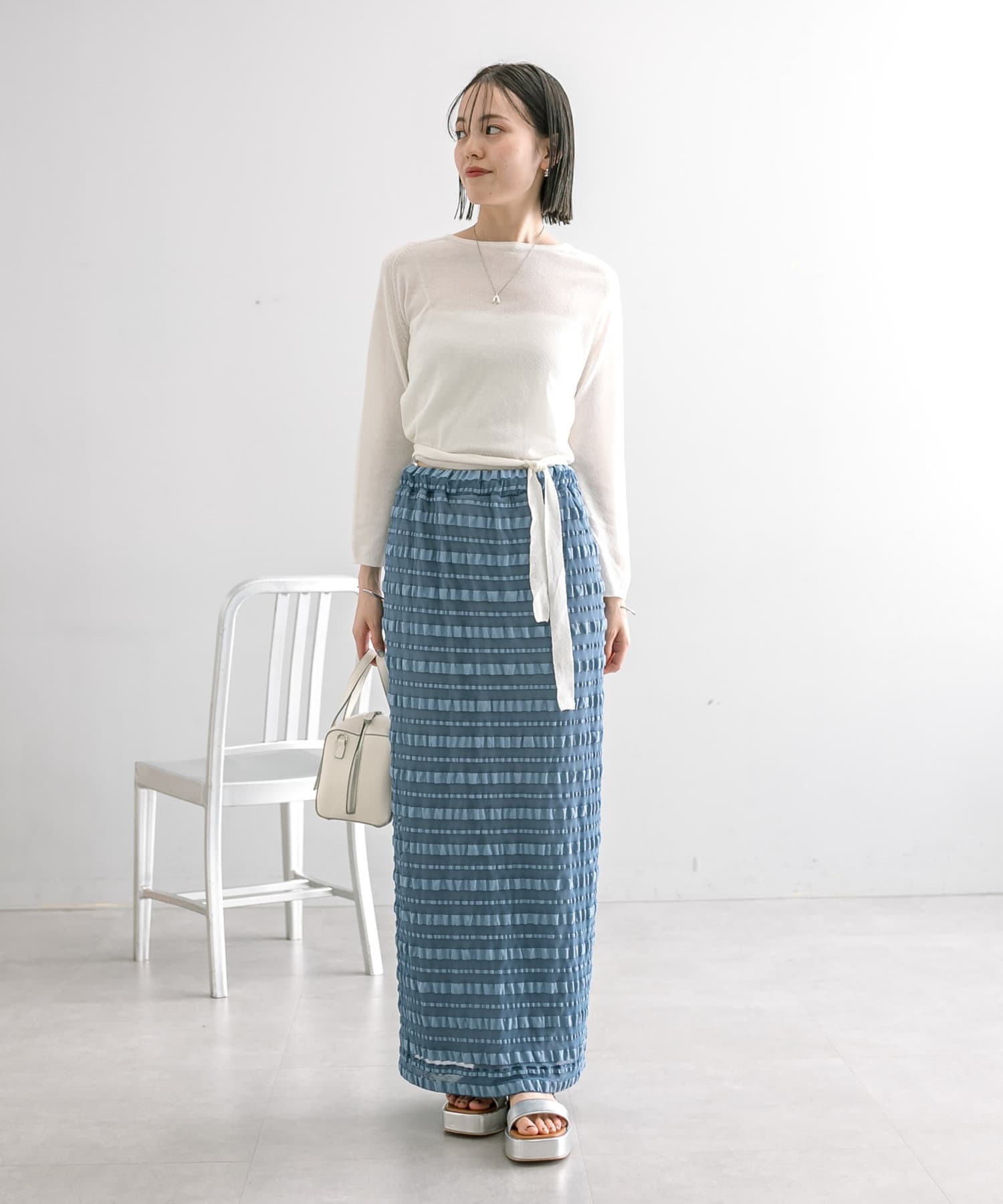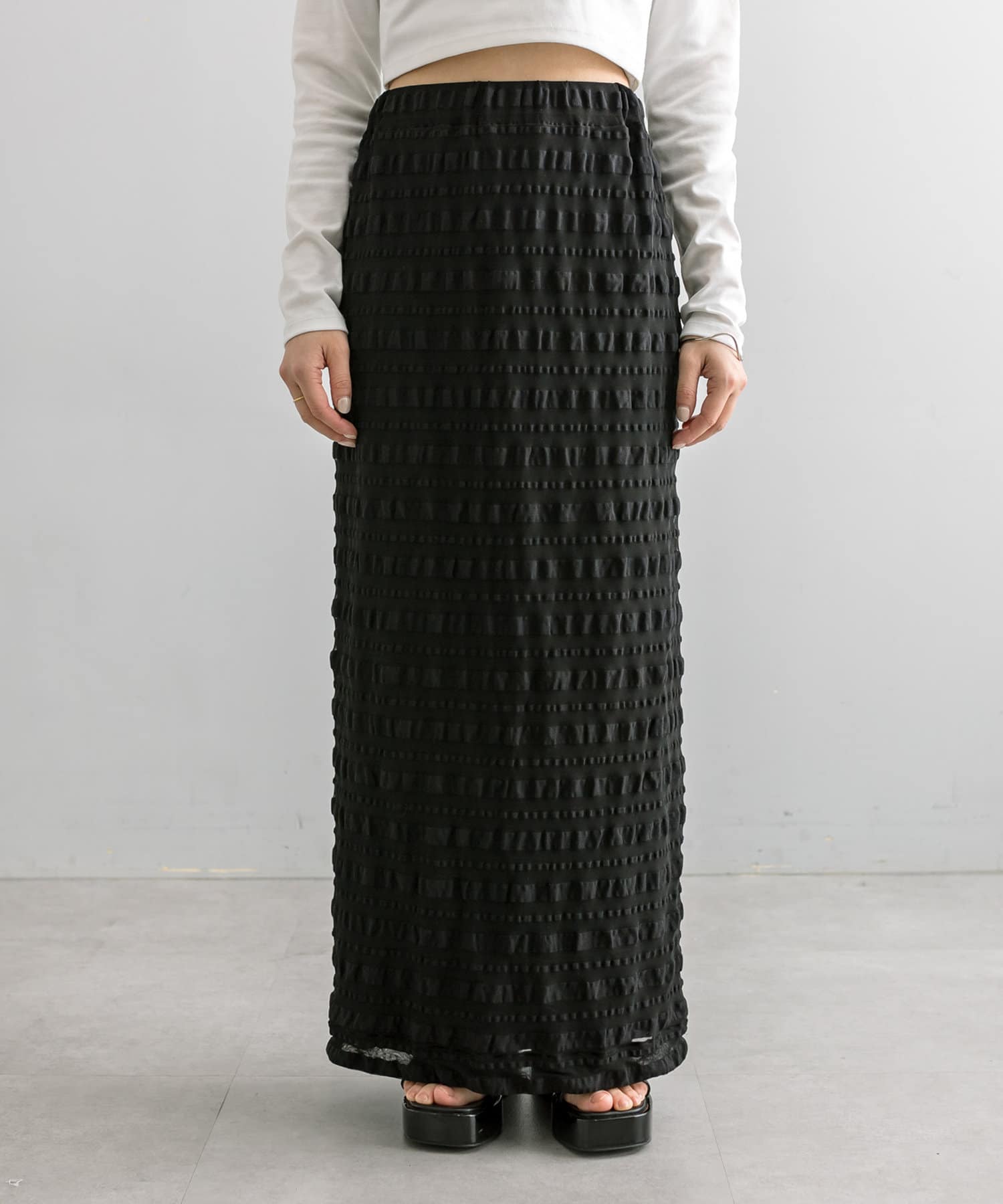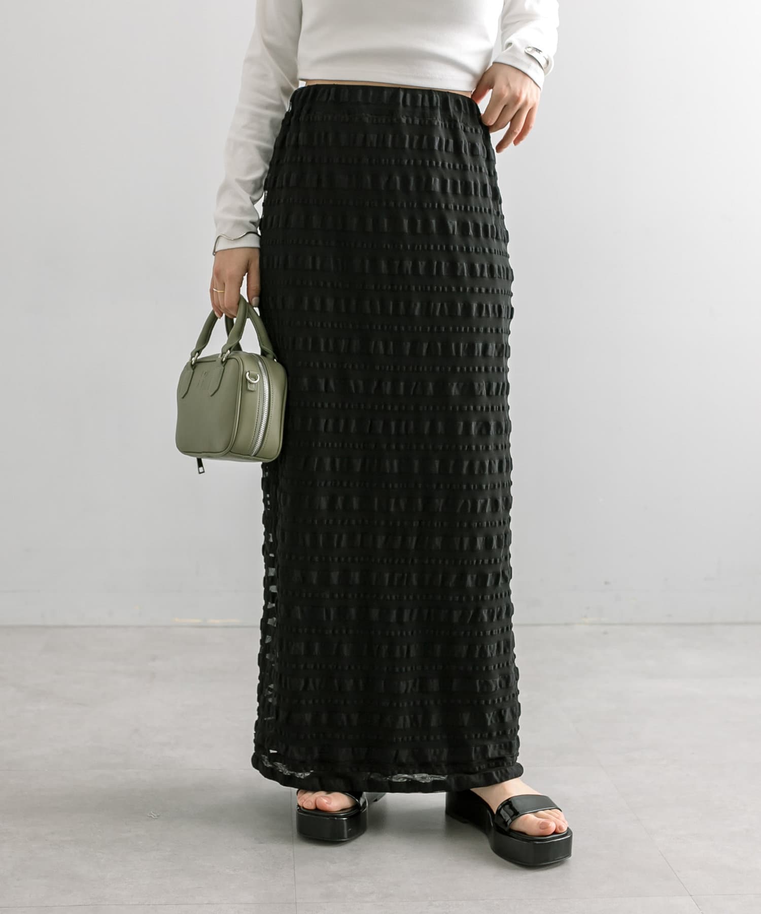 シアー素材が抜け感のあるスタイリングに仕上げてくれるロングスカート。