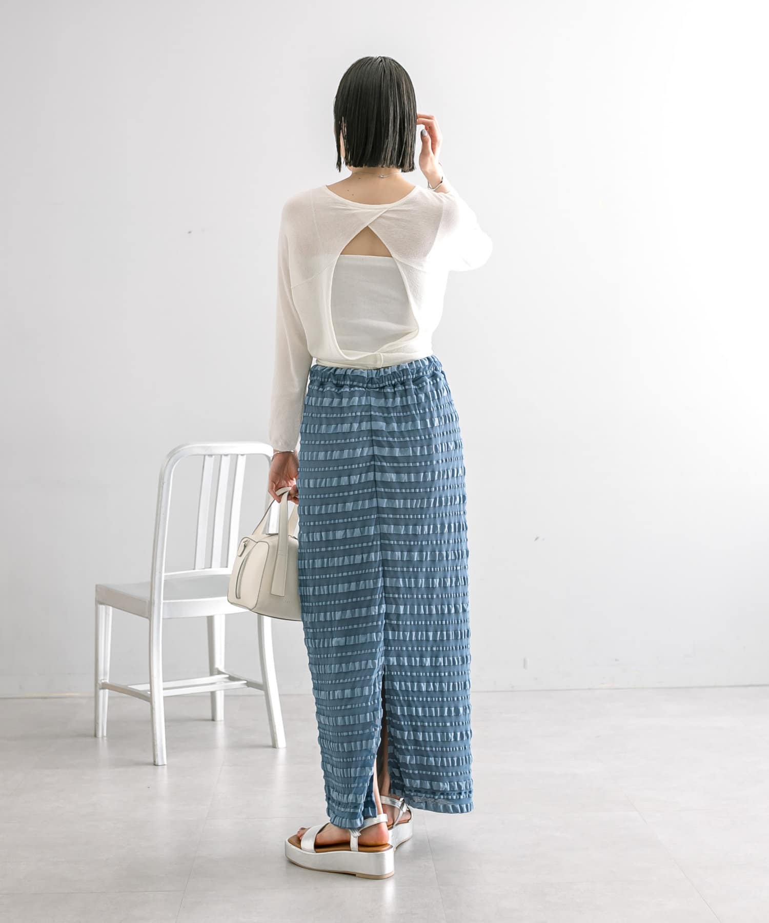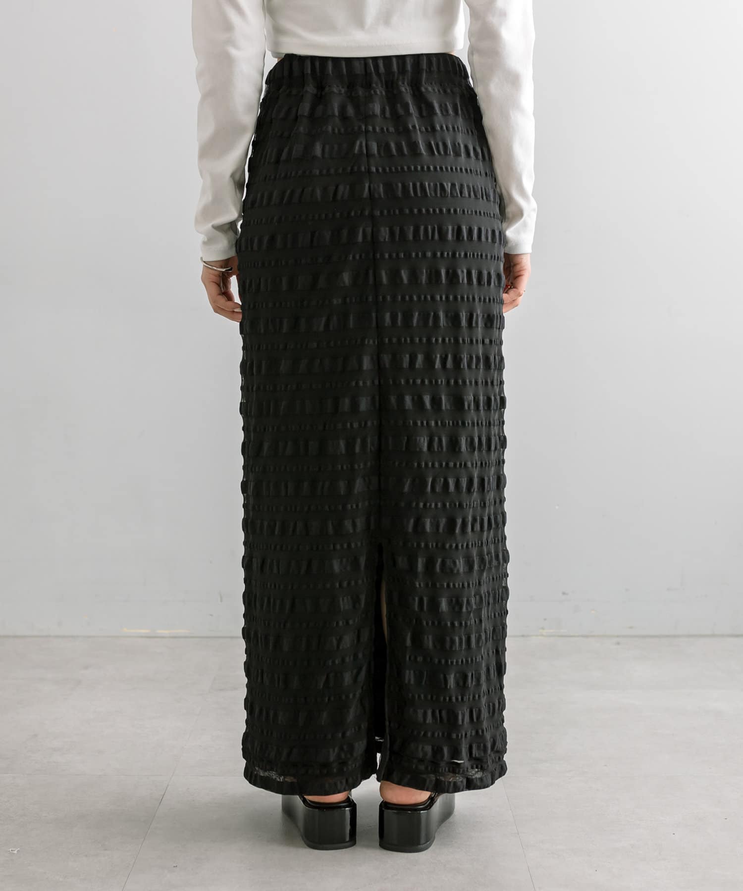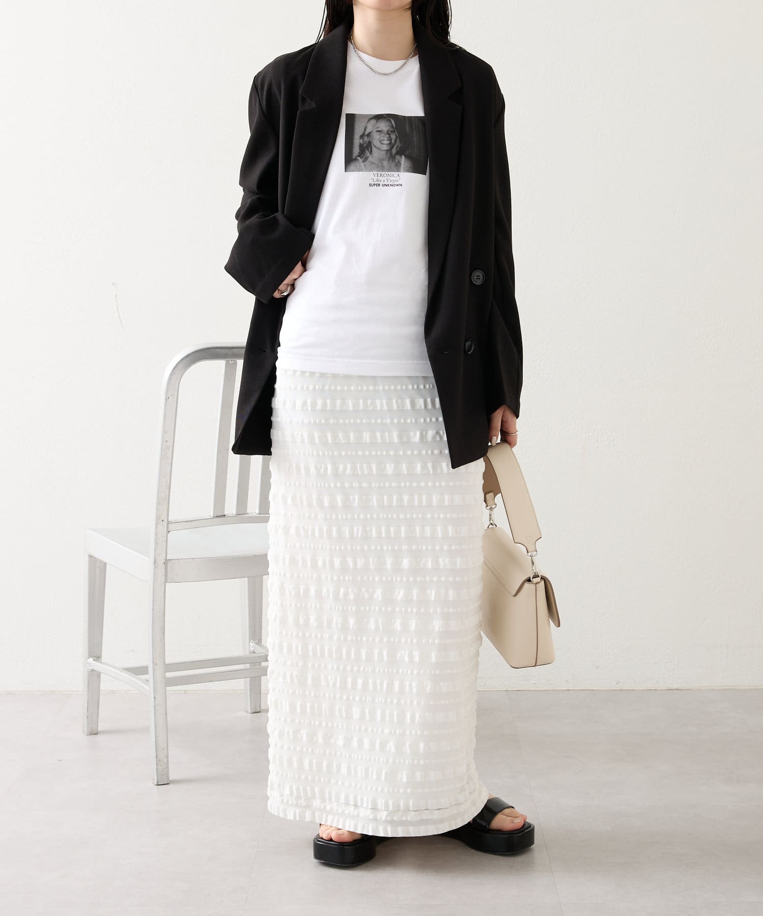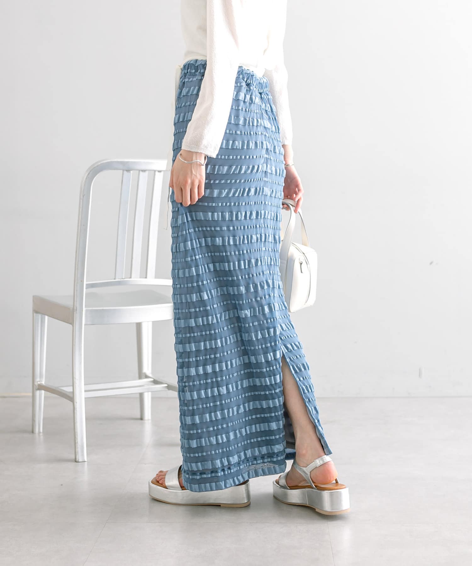 シアー素材が抜け感のあるスタイリングに仕上げてくれるロングスカート。