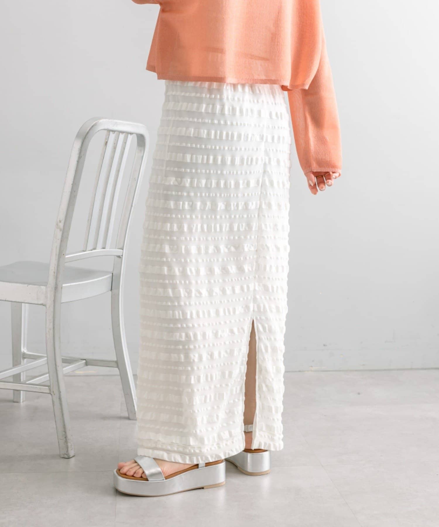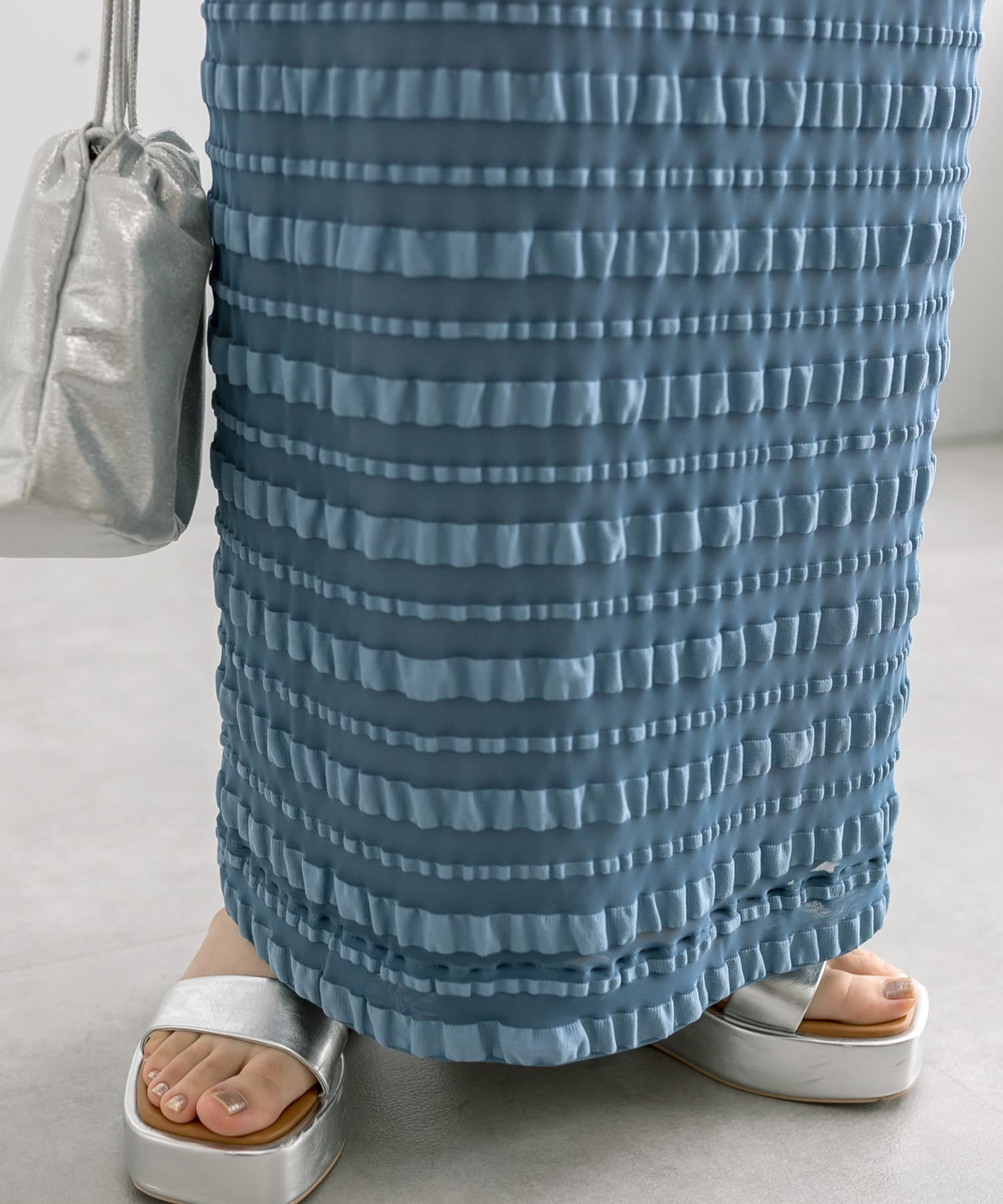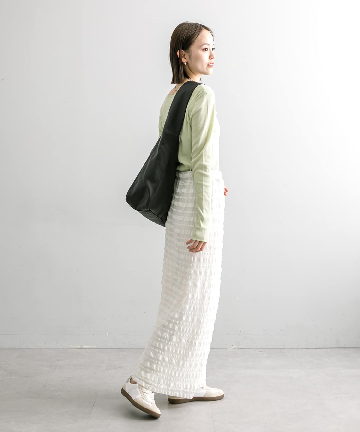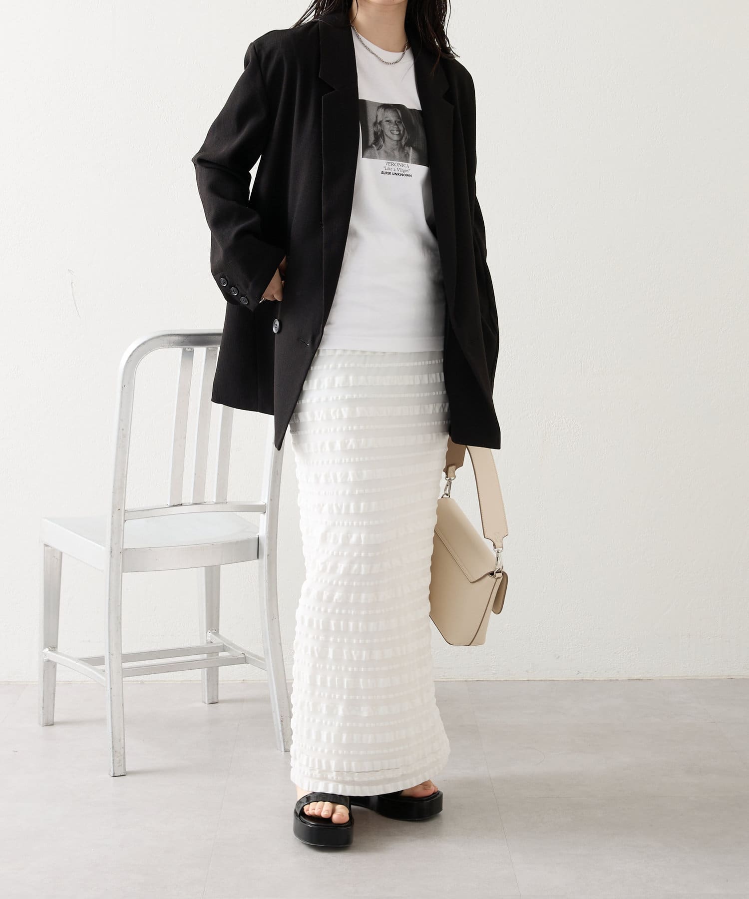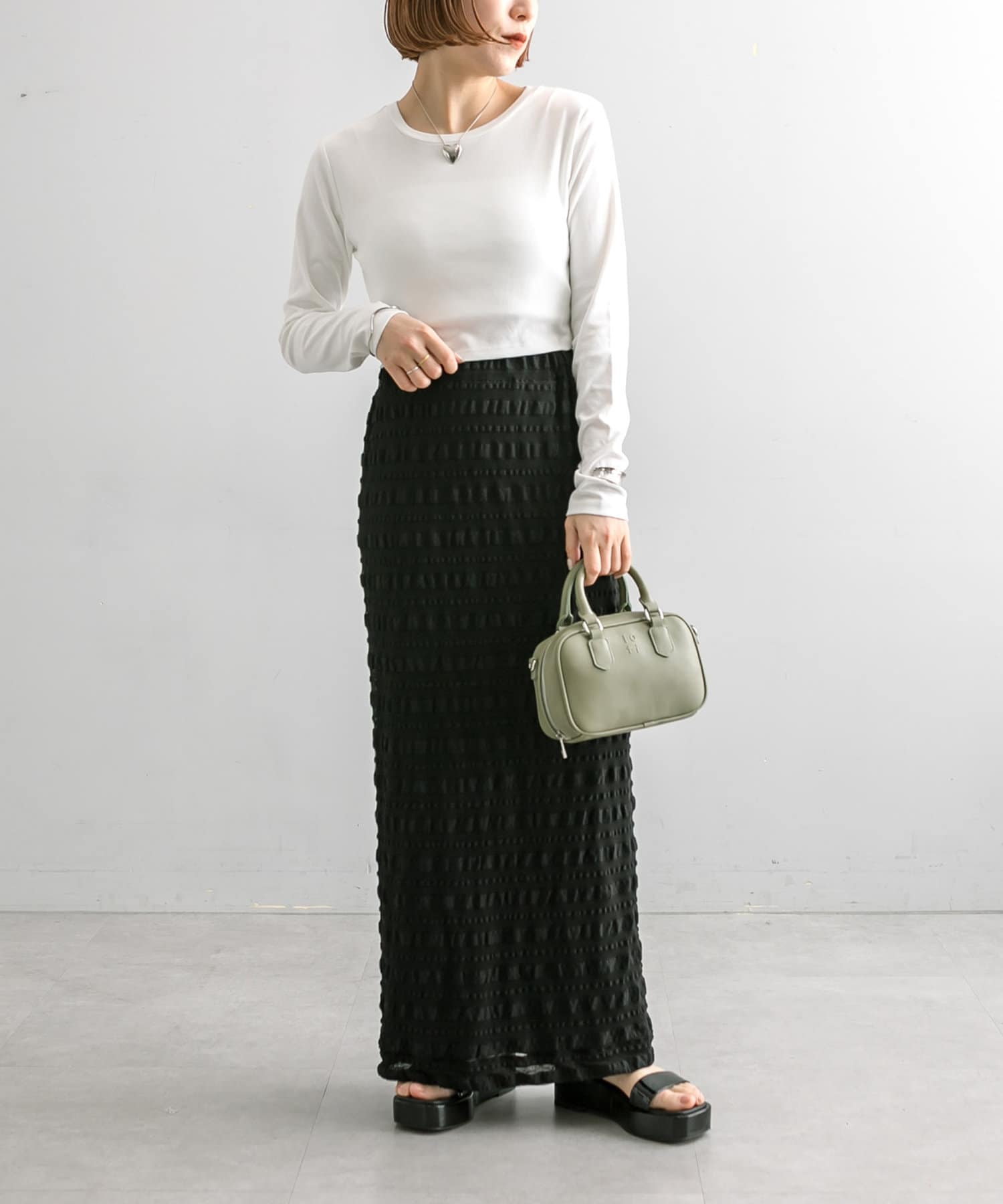 シアー素材が抜け感のあるスタイリングに仕上げてくれるロングスカート。