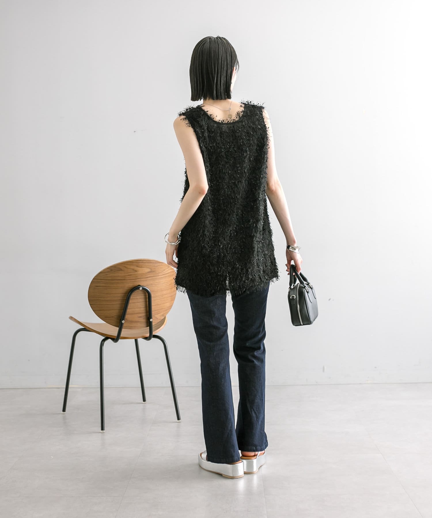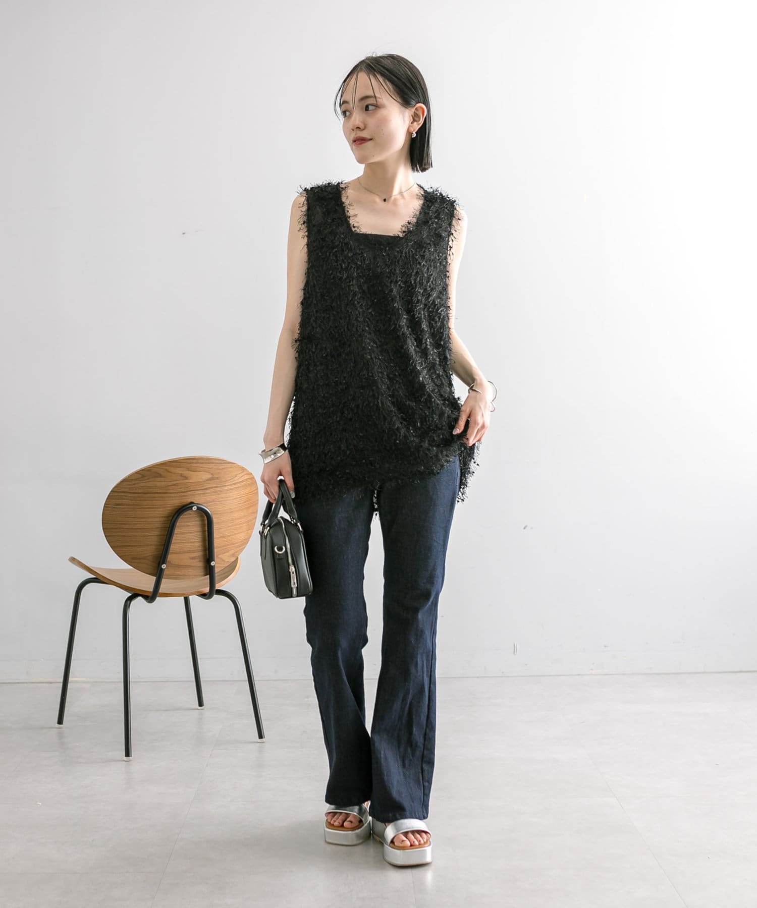 ・表面感のあるトップスやロング丈のアイテムと合わせてもスタイリッシュな印象をプラスしてくれます。