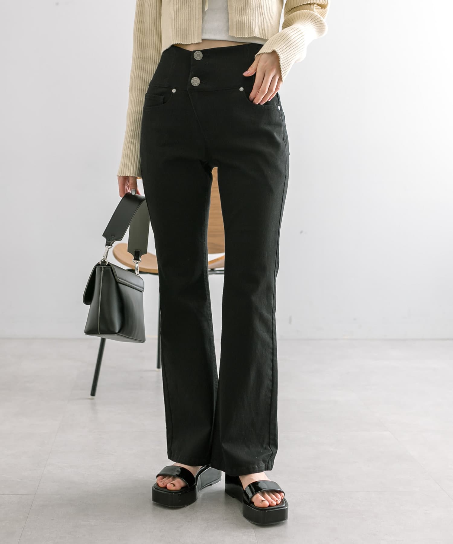 ・ハイウエストなので短丈のトップスやお腹チラ見せでも着ていただけます。