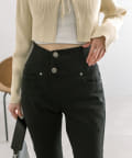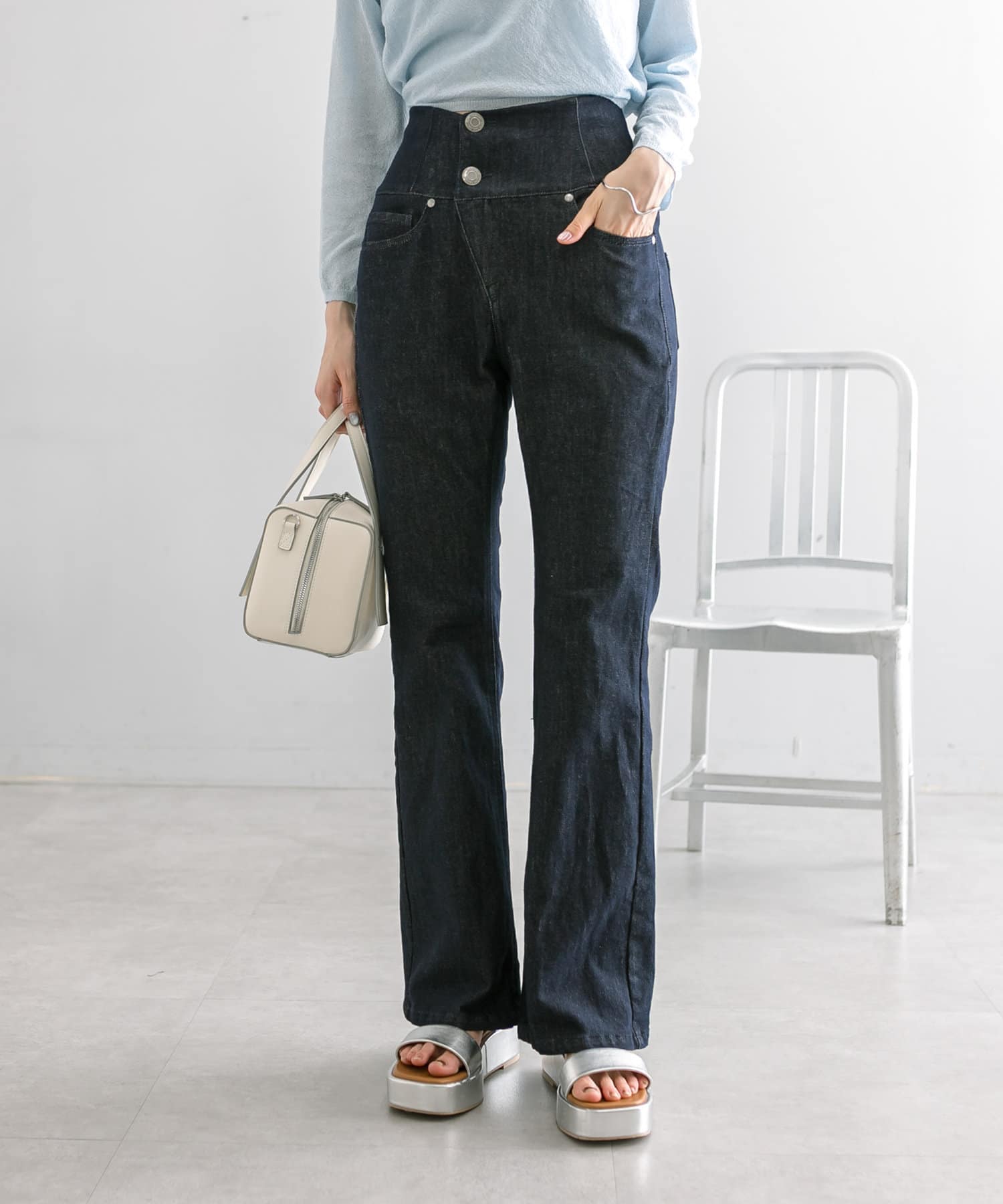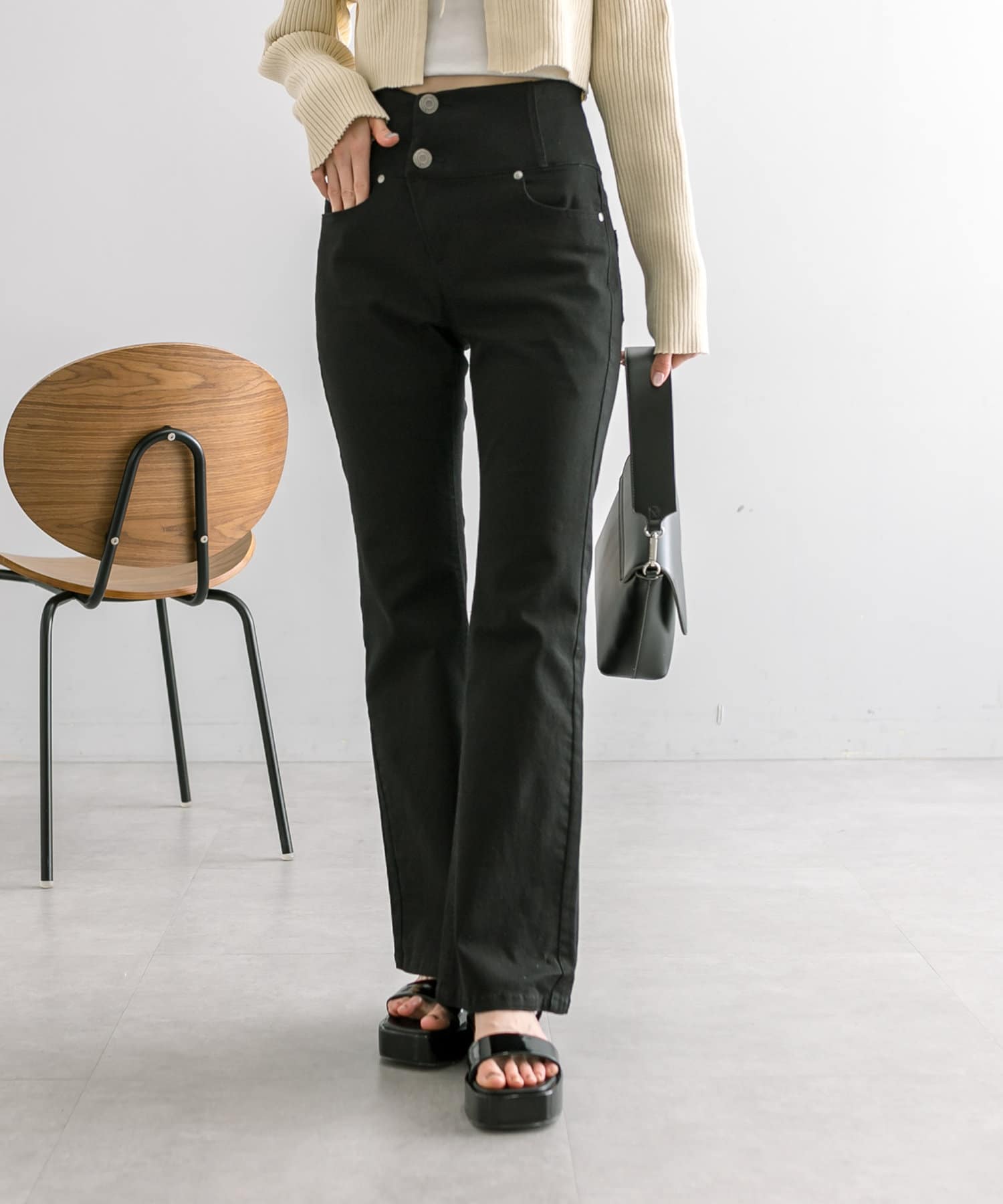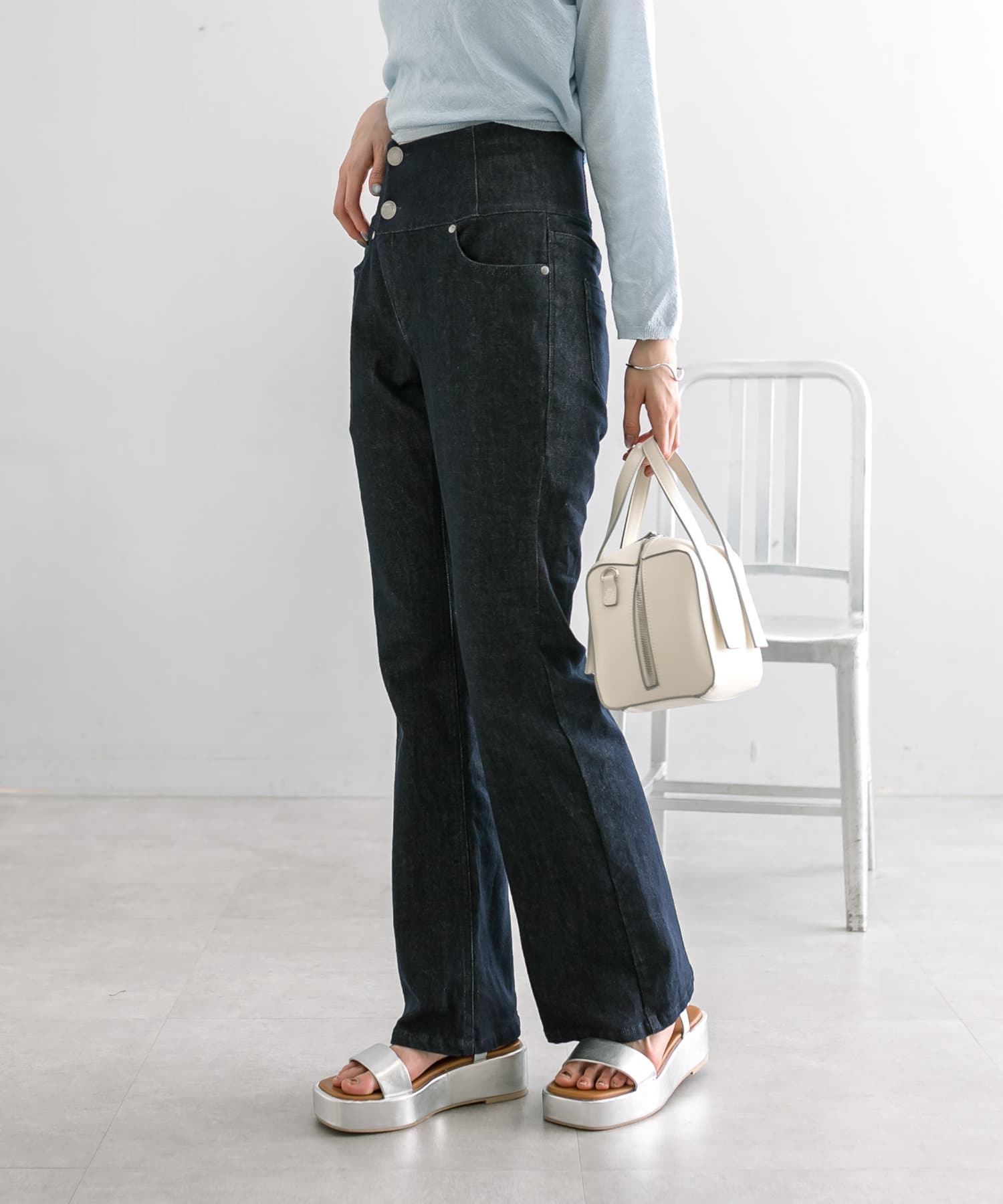 ・ハイウエストなので短丈のトップスやお腹チラ見せでも着ていただけます。