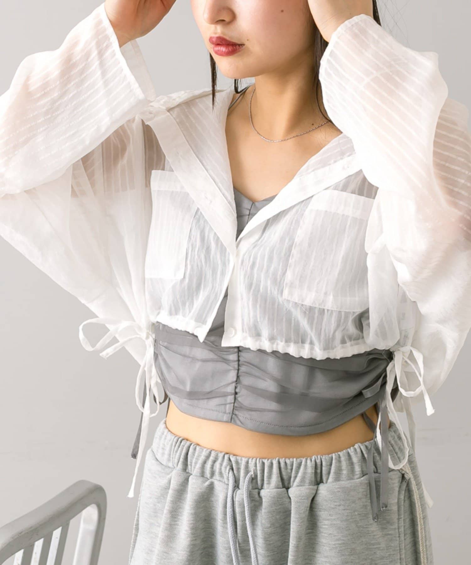 ・シアー素材なのでインナーの色でスタイリングを楽しんでいただけます。