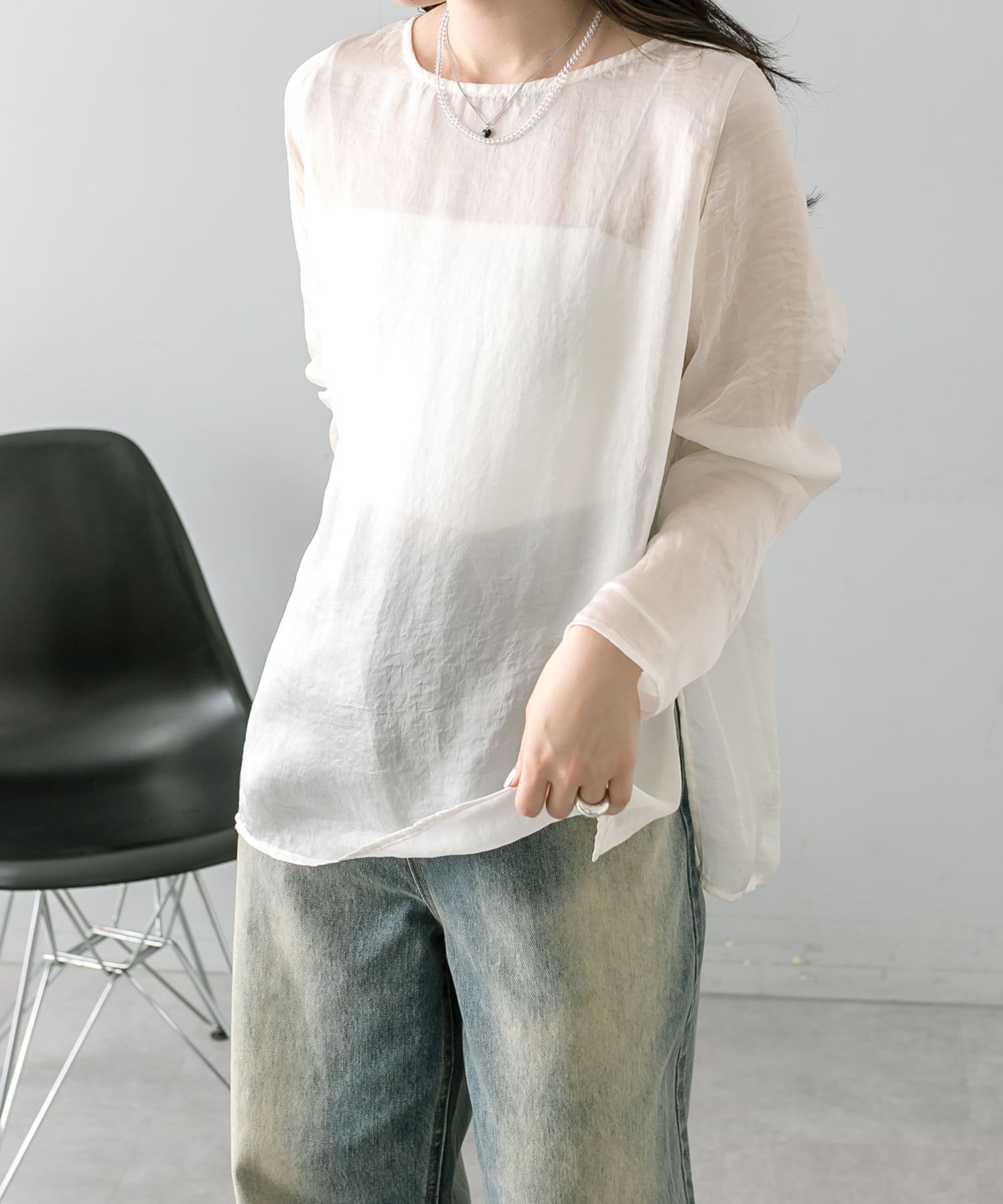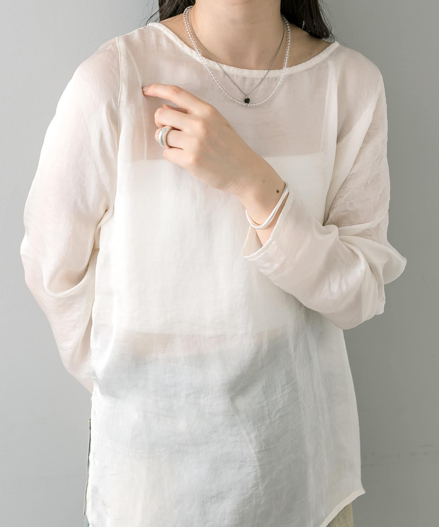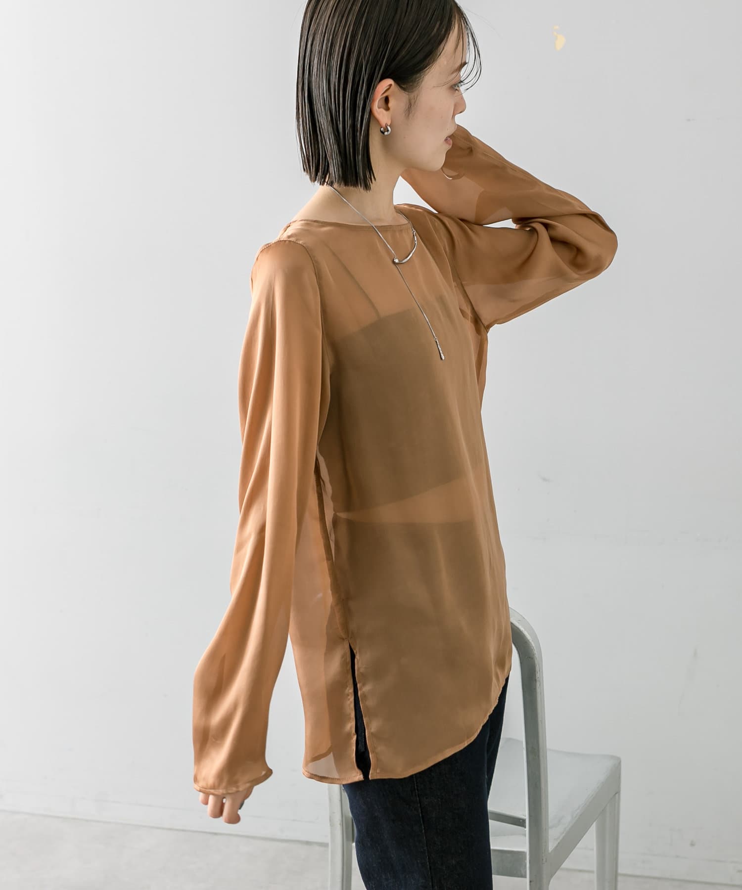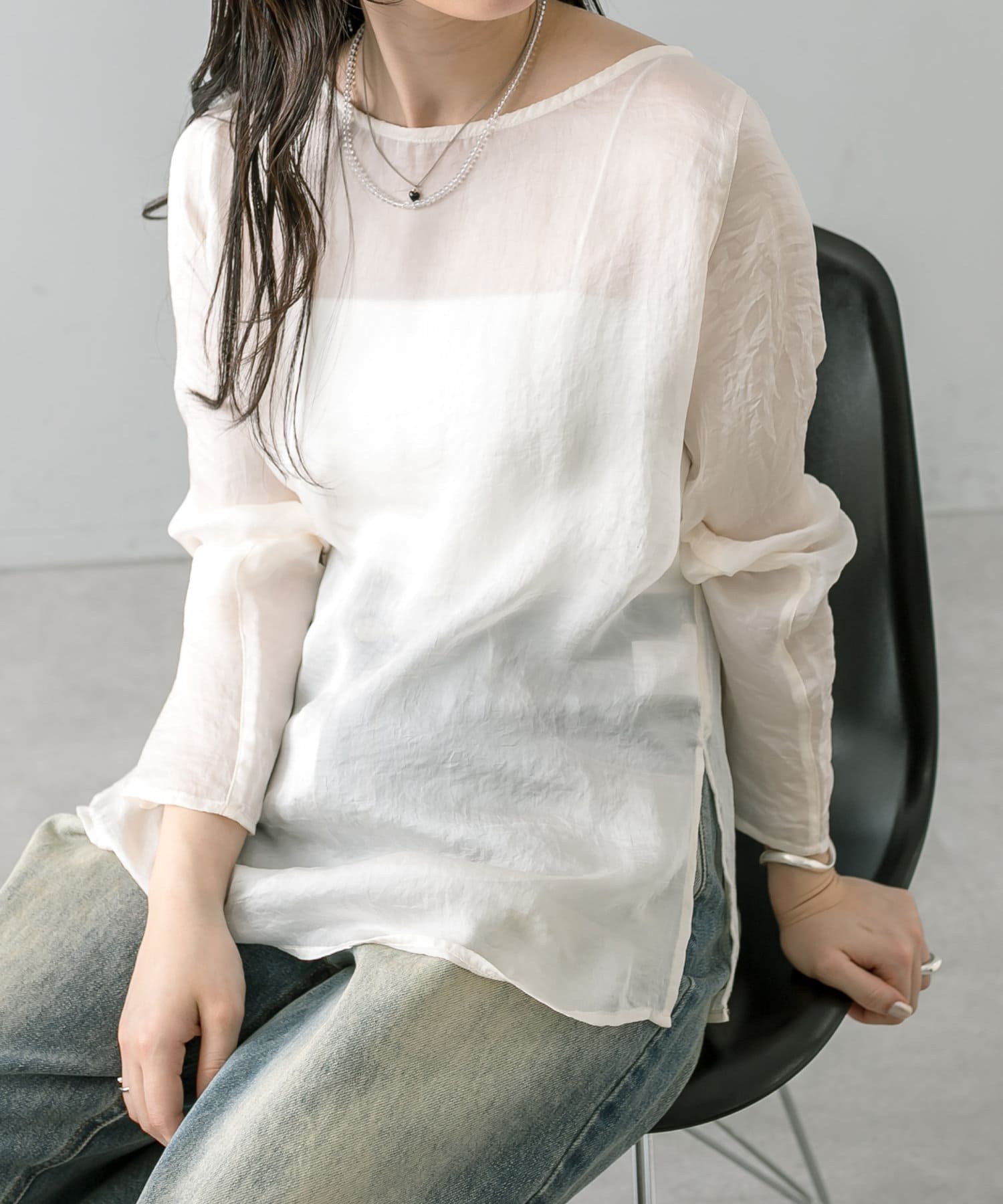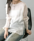 ・透け感あるトップスなのでインナー使いも楽しめます。