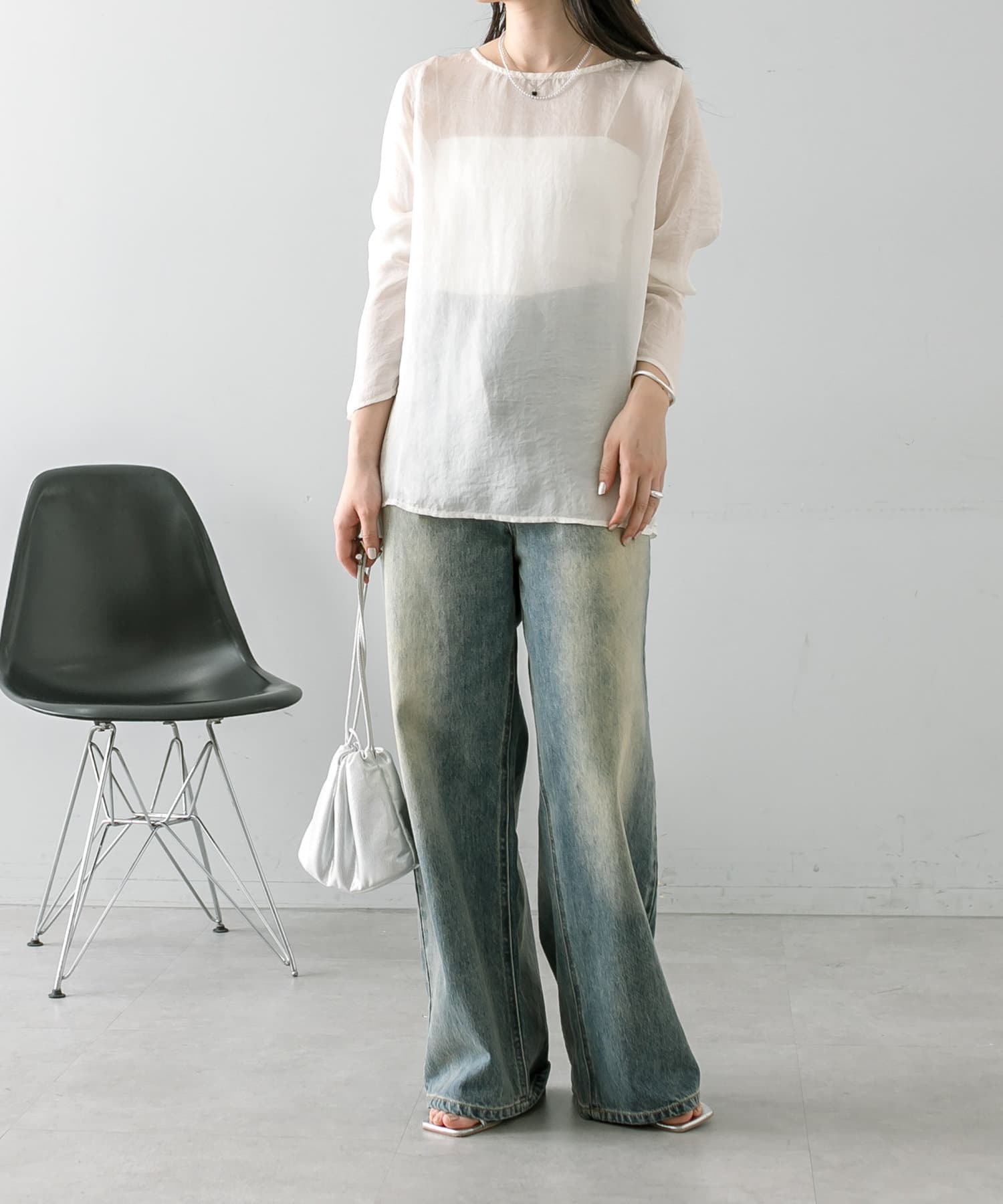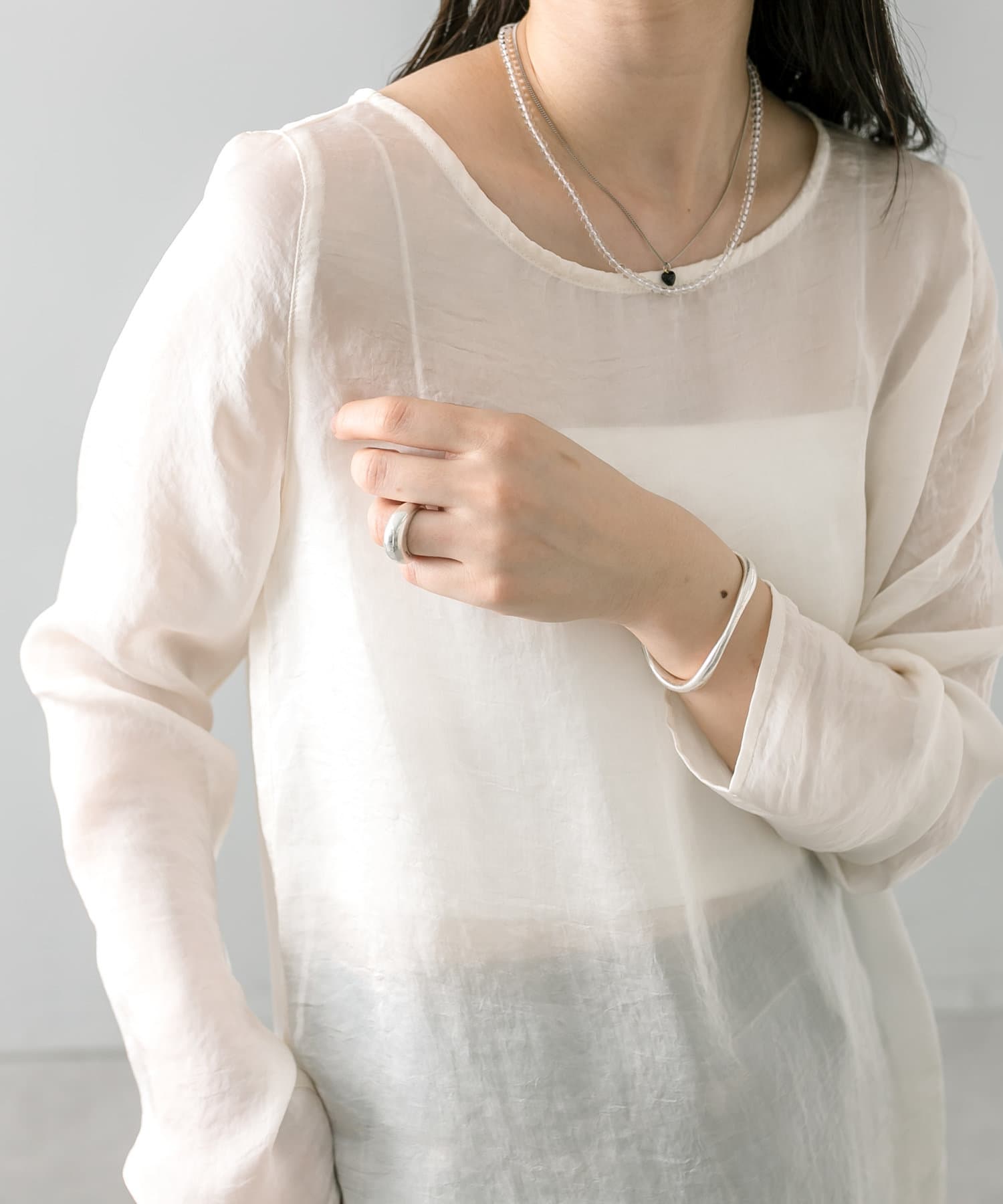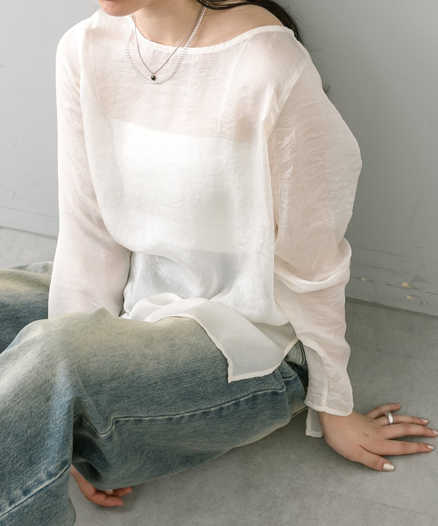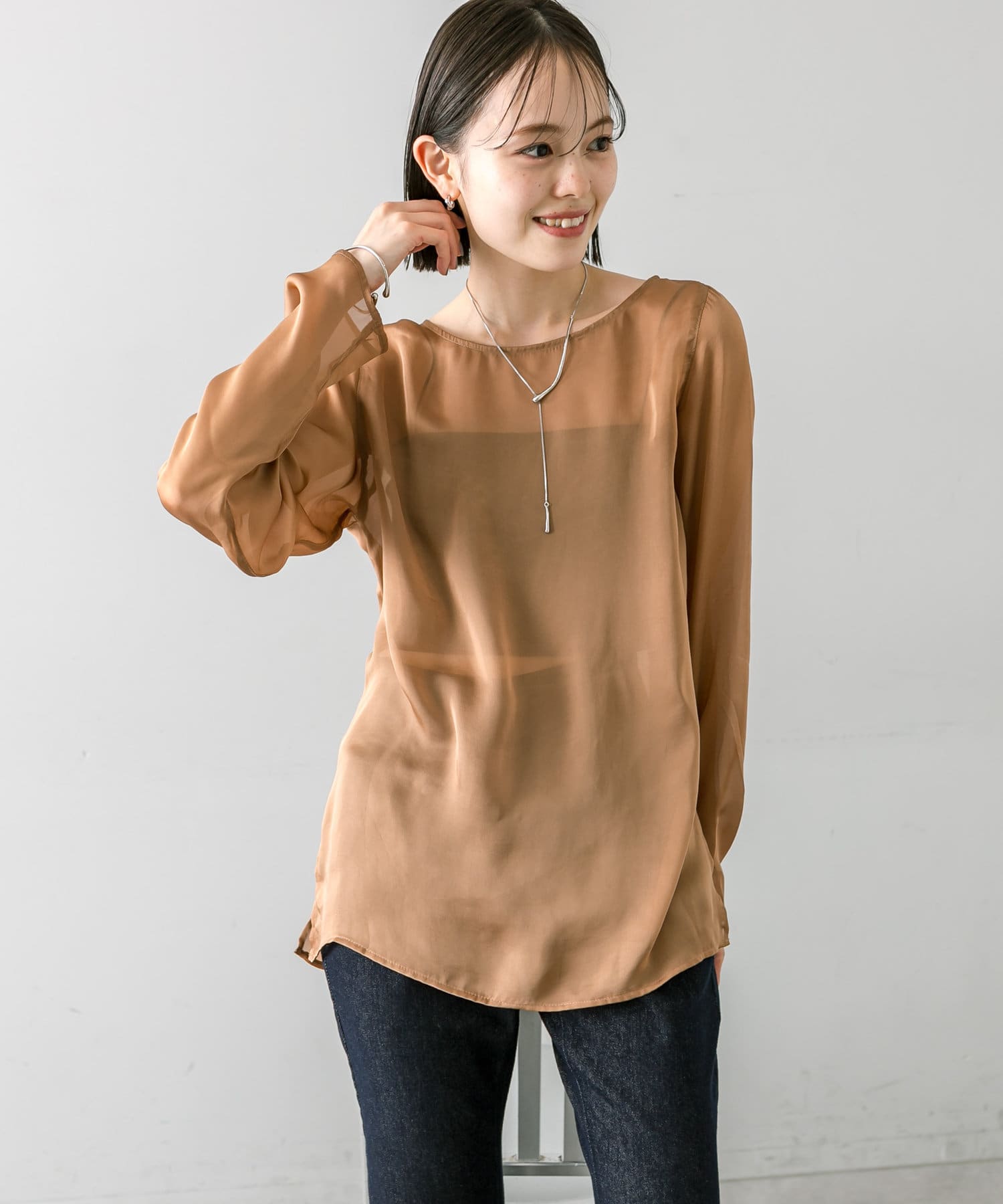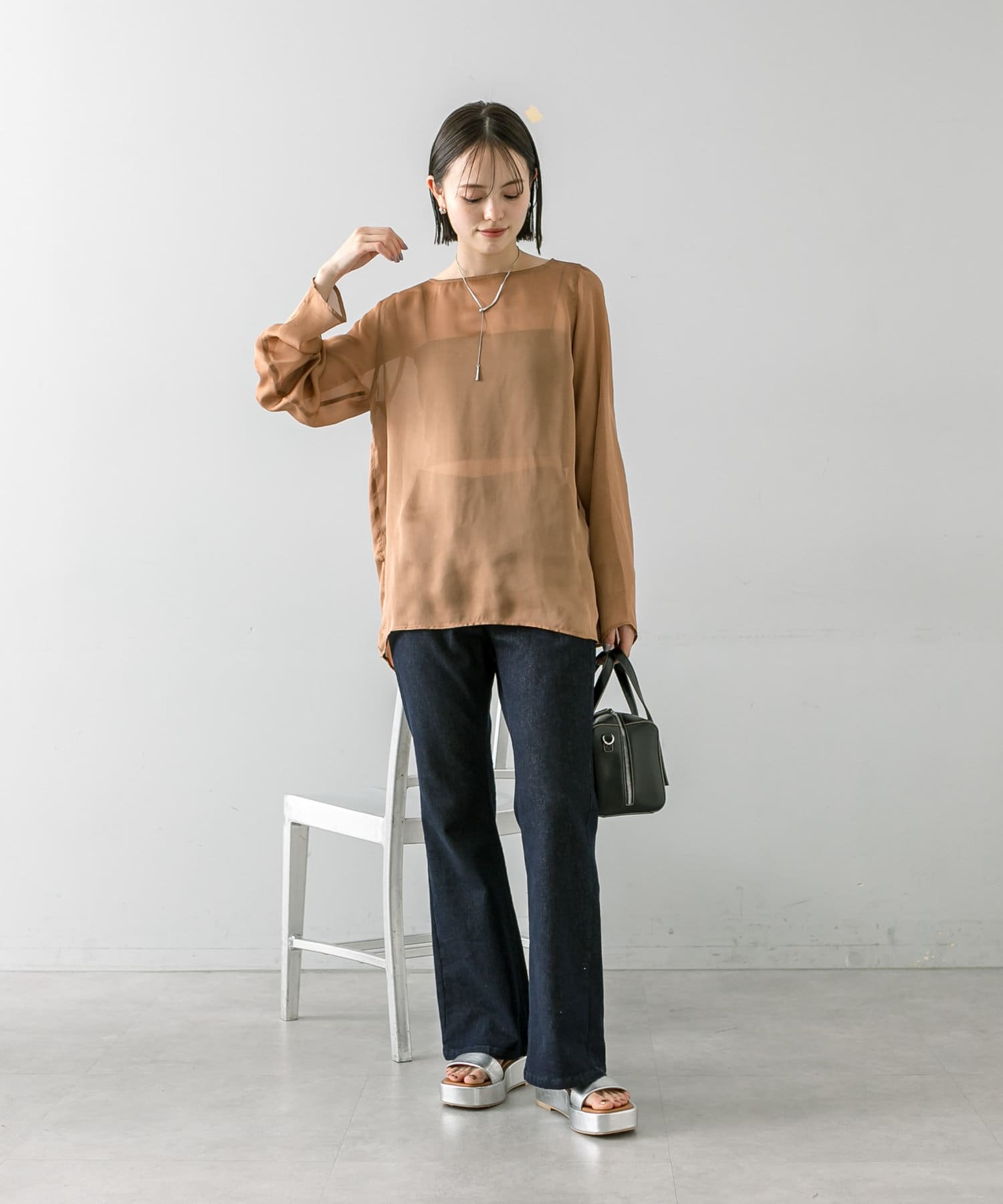 ・透け感あるトップスなのでインナー使いも楽しめます。