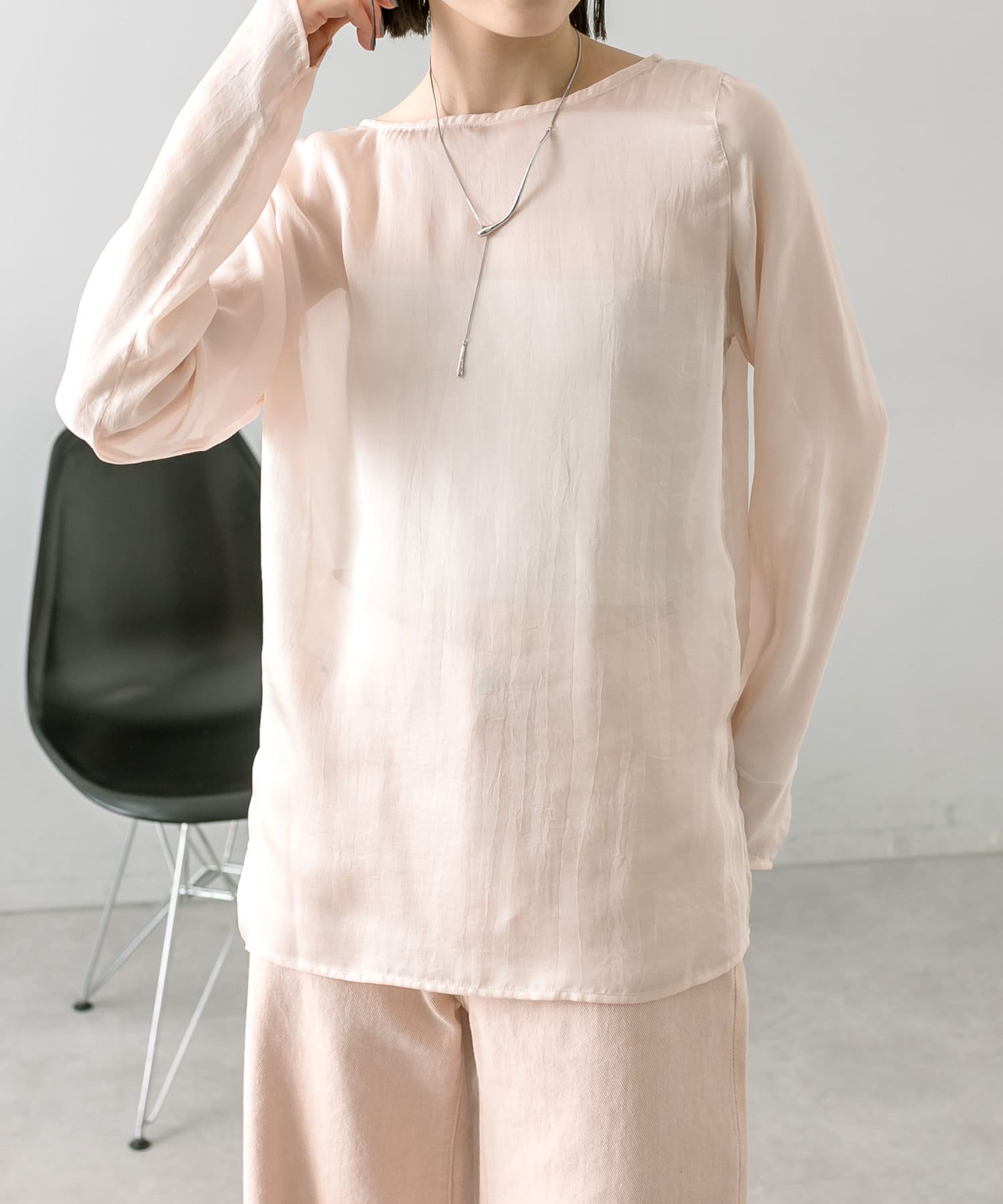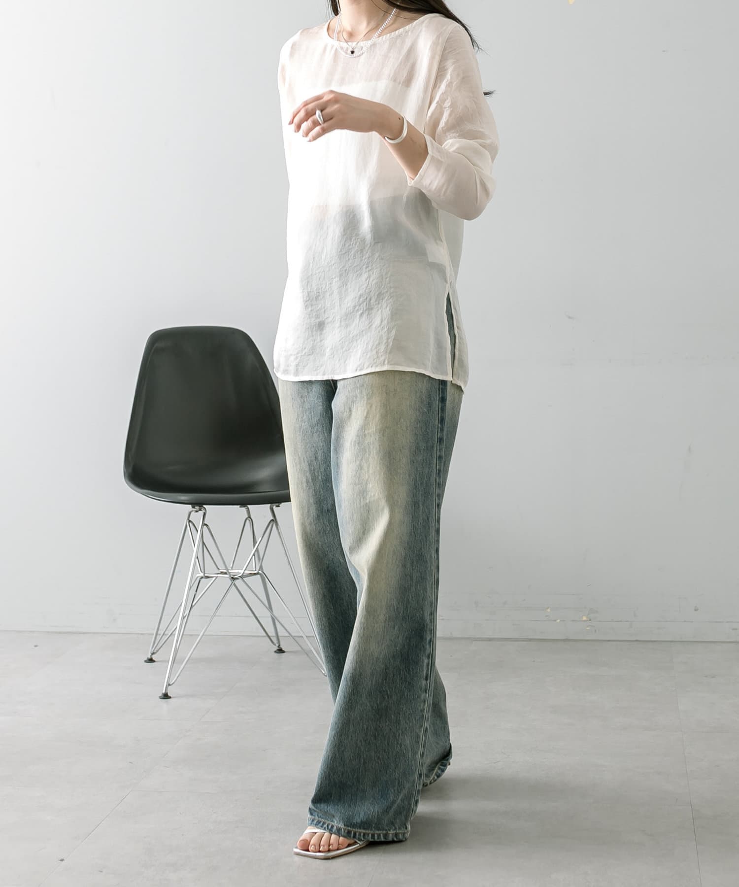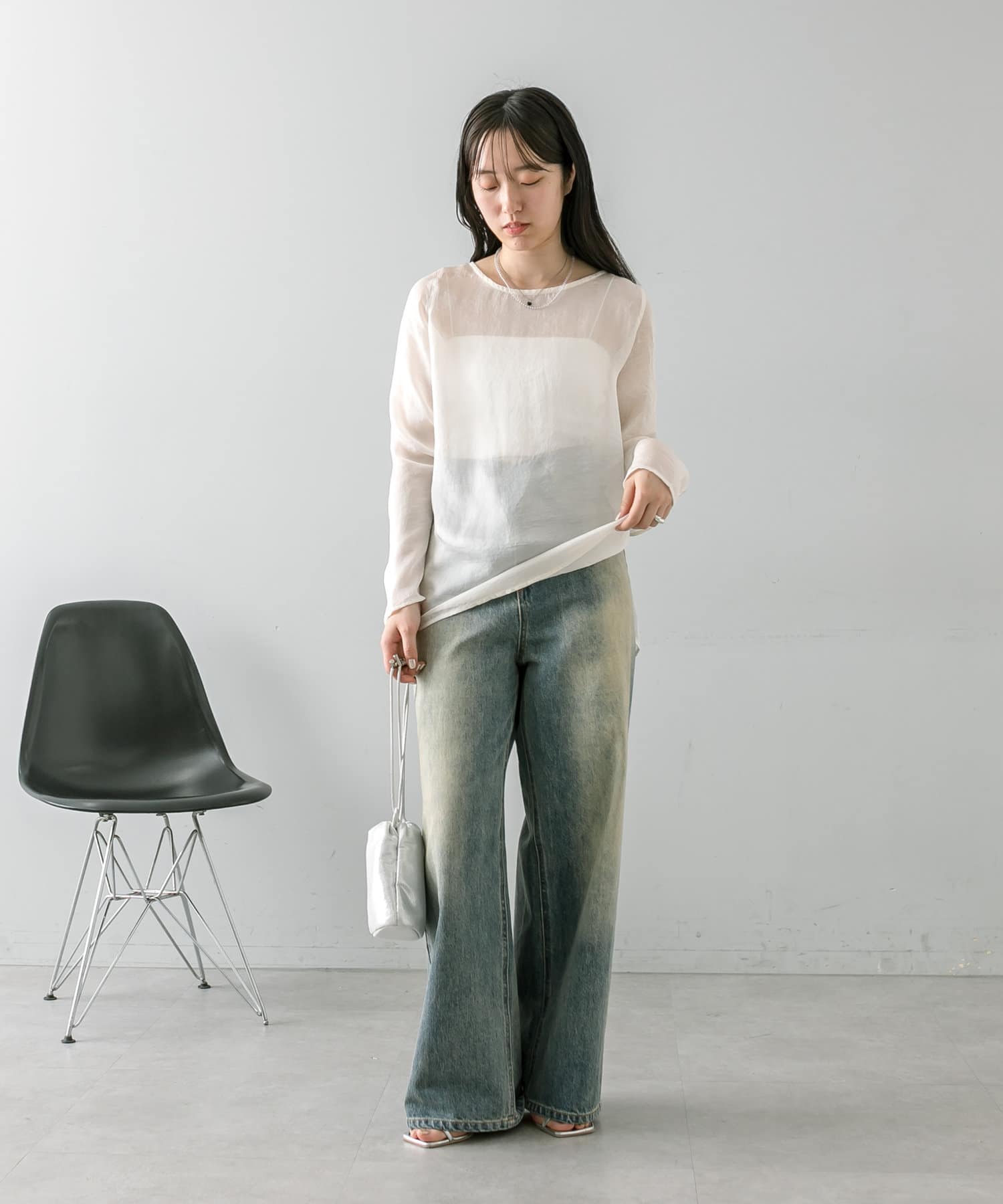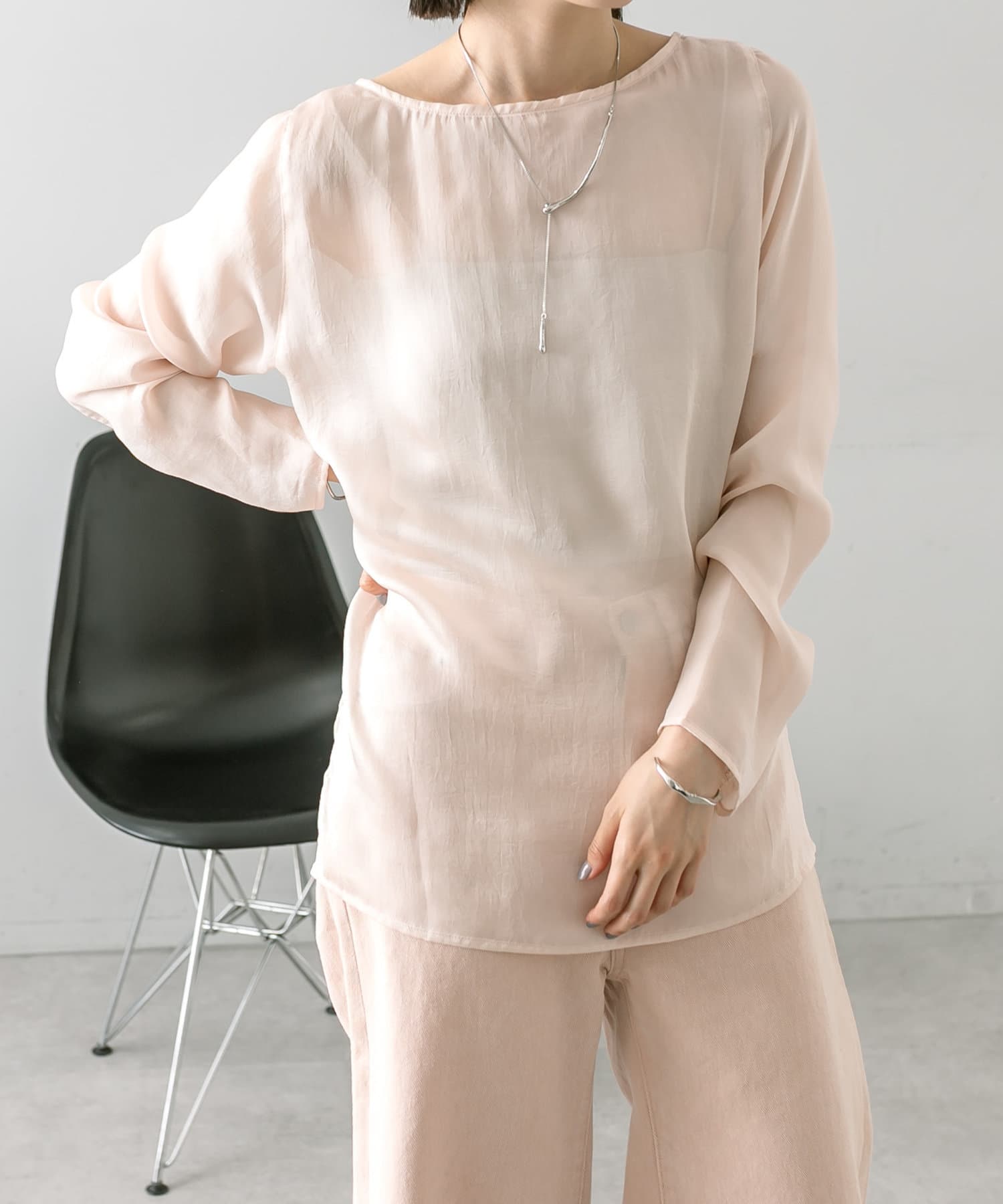 ・透け感あるトップスなのでインナー使いも楽しめます。