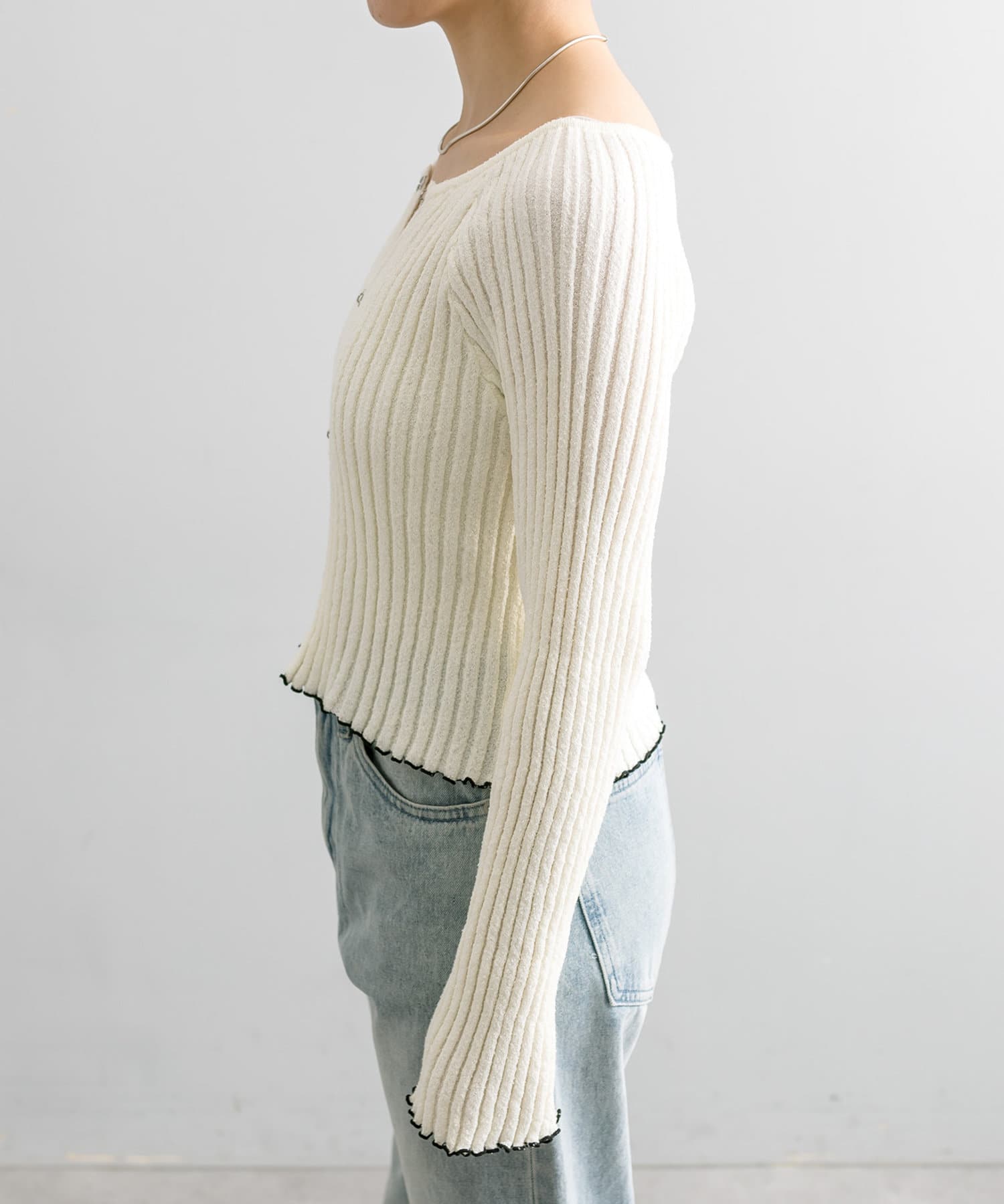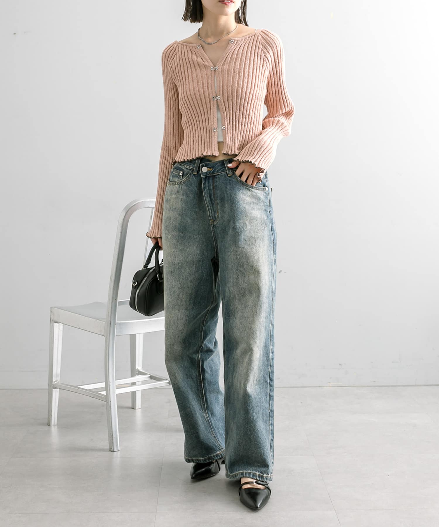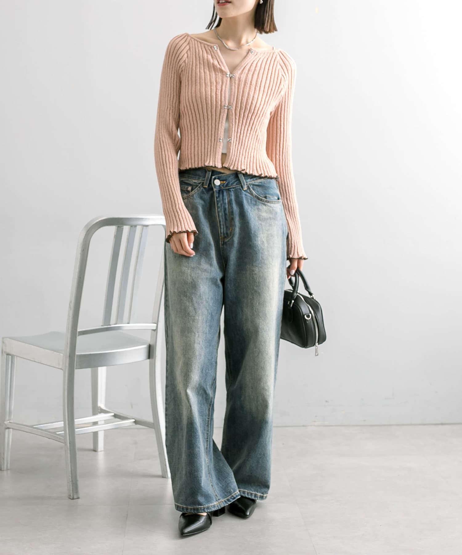 ホックを留めると体のラインをキュッと拾うので、ボトムスをゆるめ太めのデニムを履くとめちゃめちゃにかわいいです。ウェーブ向けなのかな?と思います。