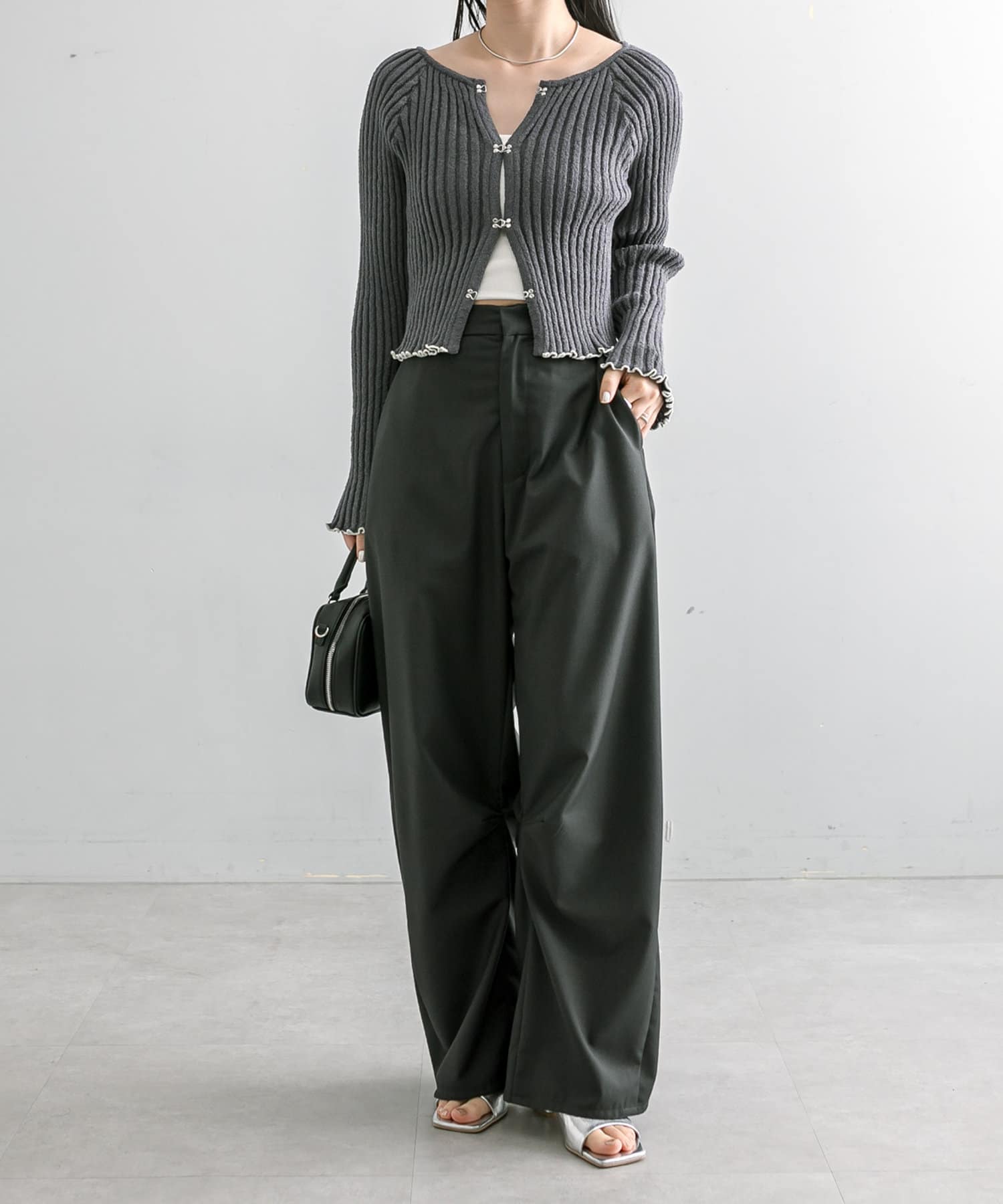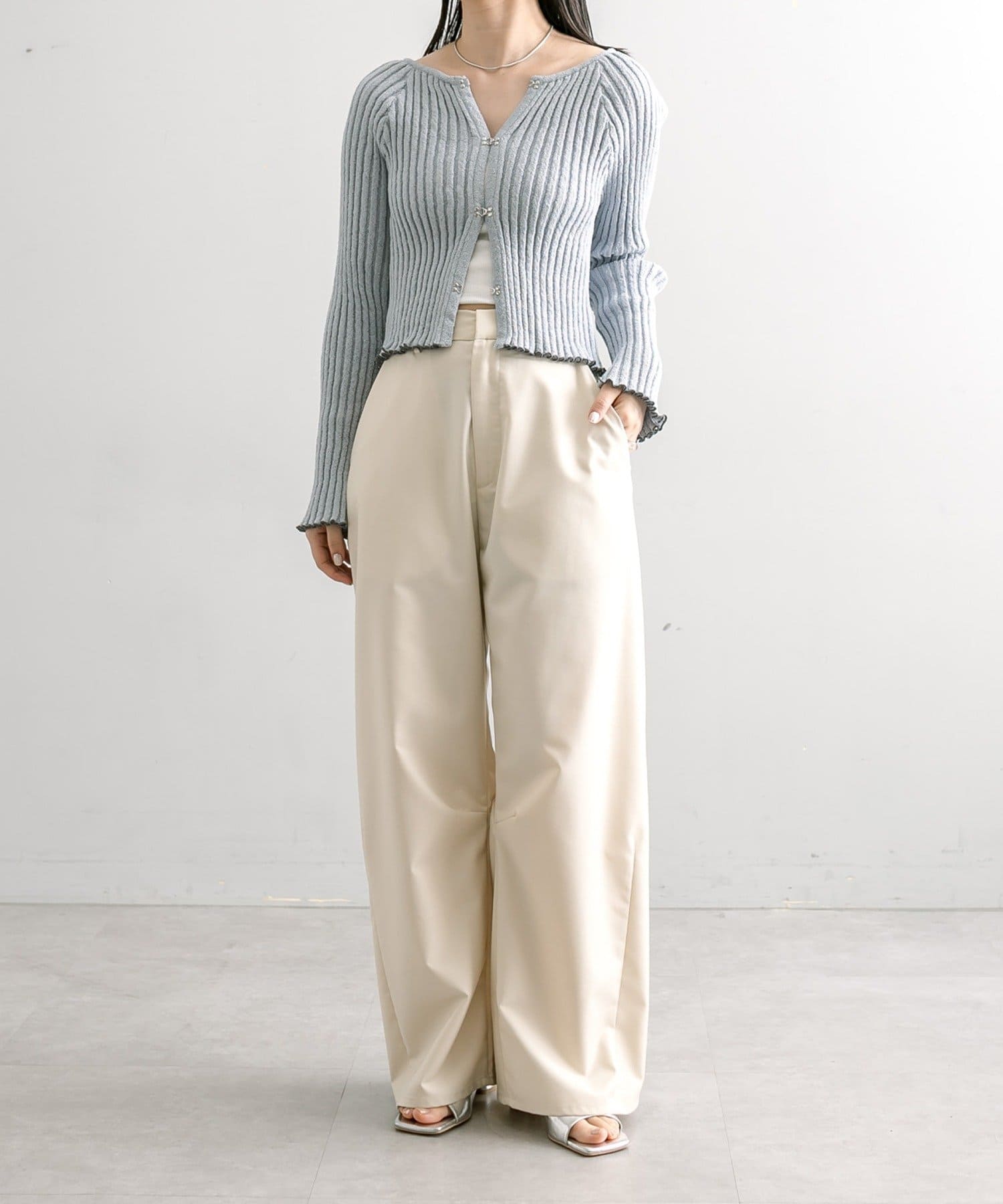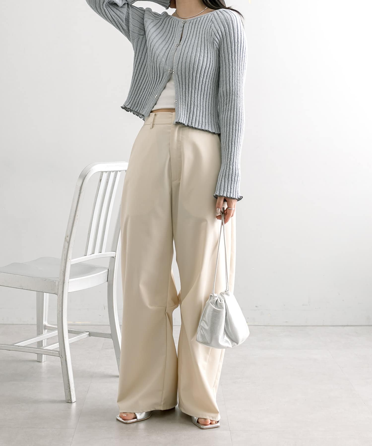 ・縦のリブ素材でスラックスやデニムとの合わせがおすすめ。