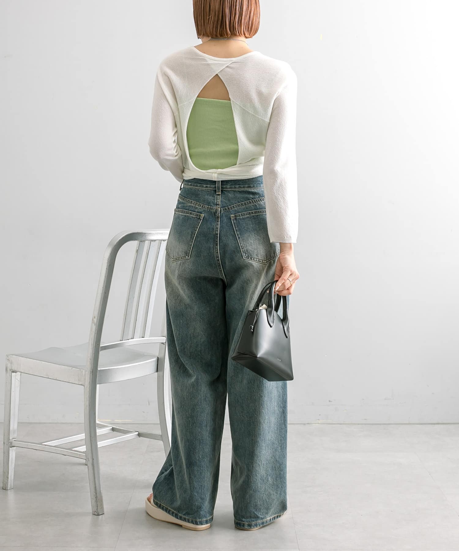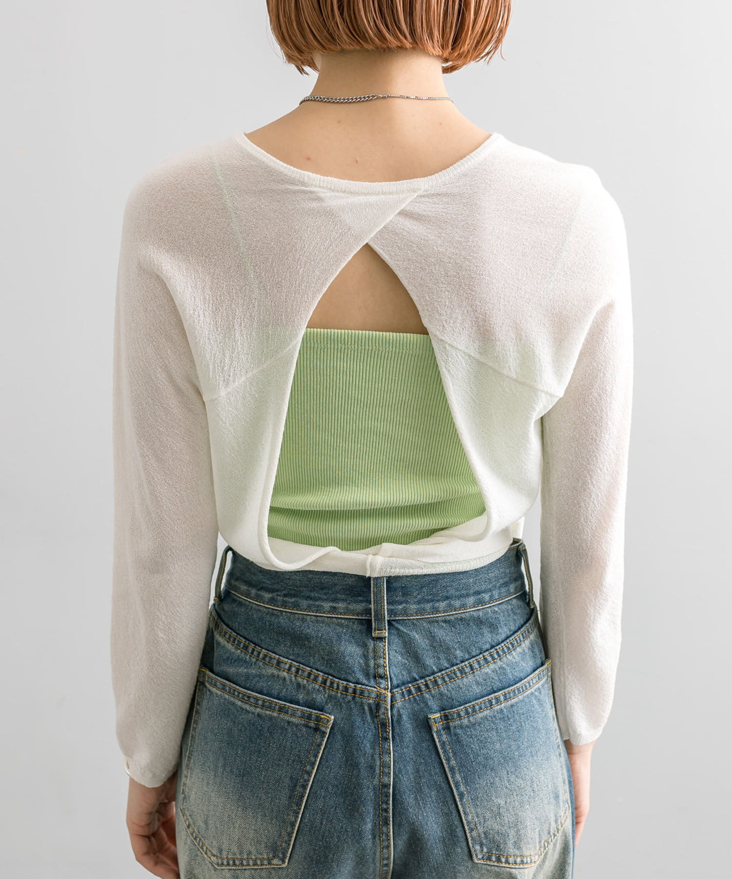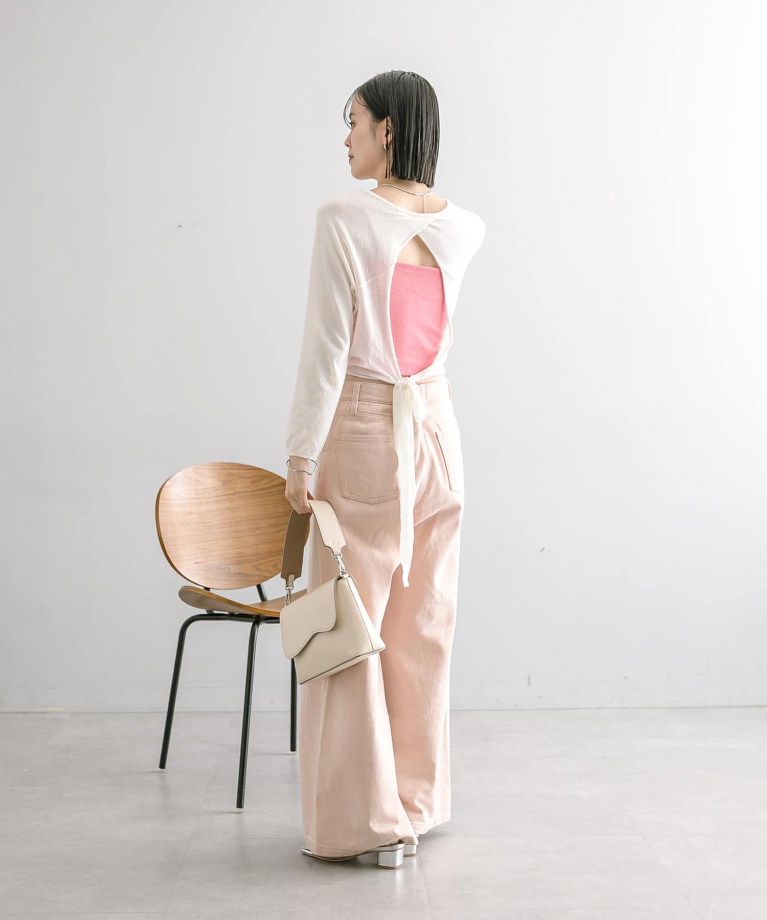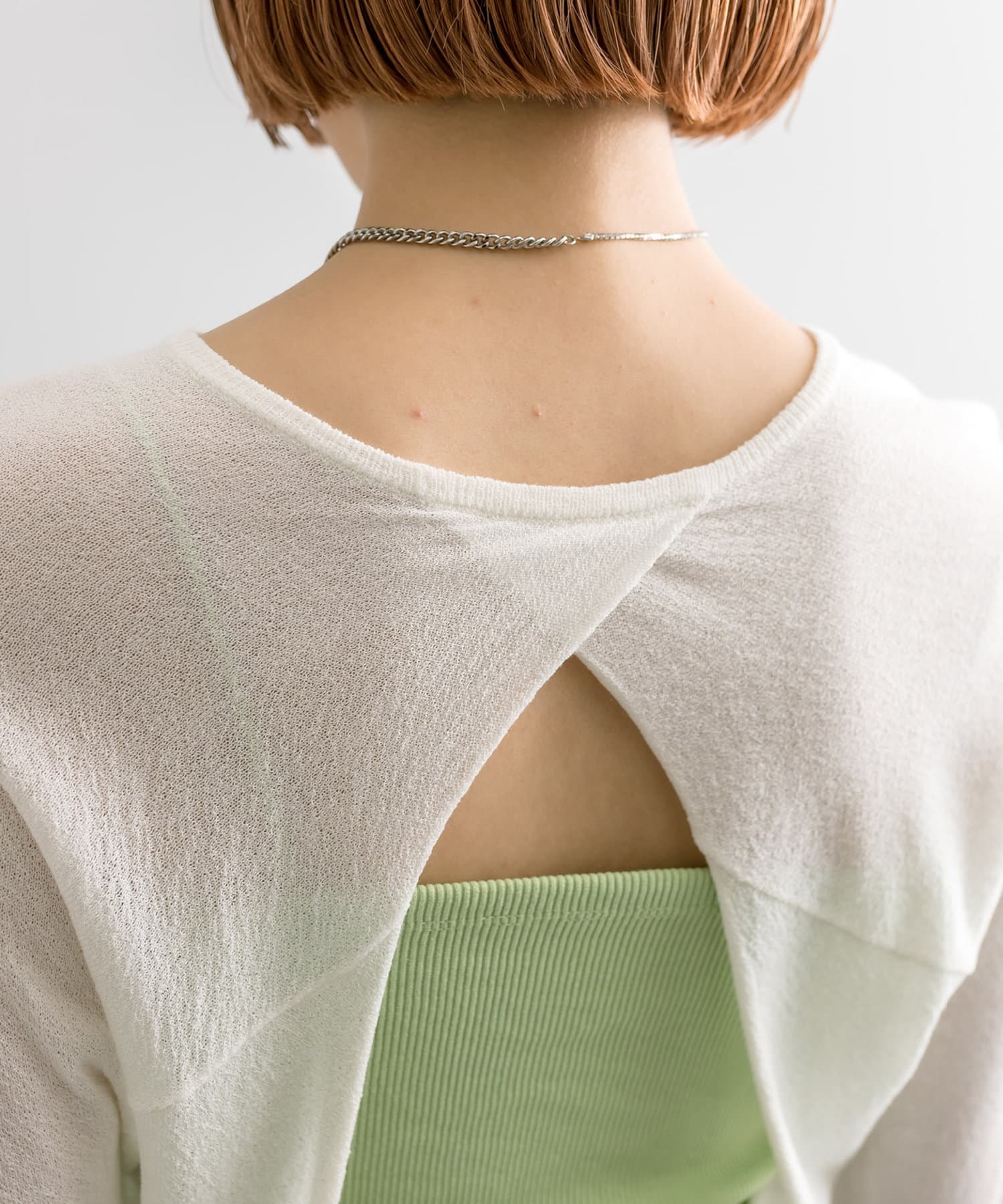 バックシャンデザインで後ろ姿も夏らしく決まるカラーニット。