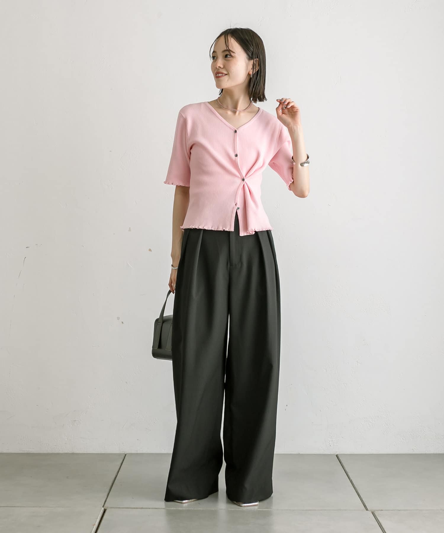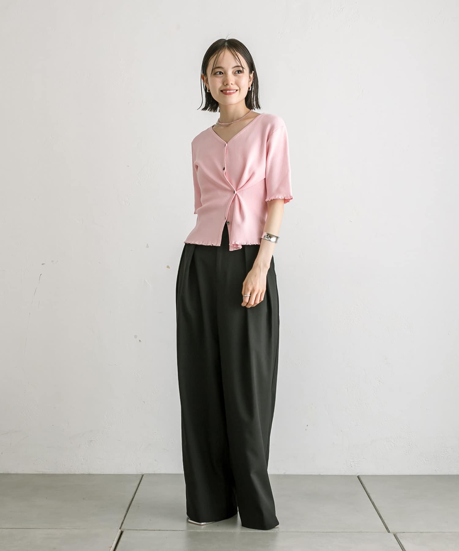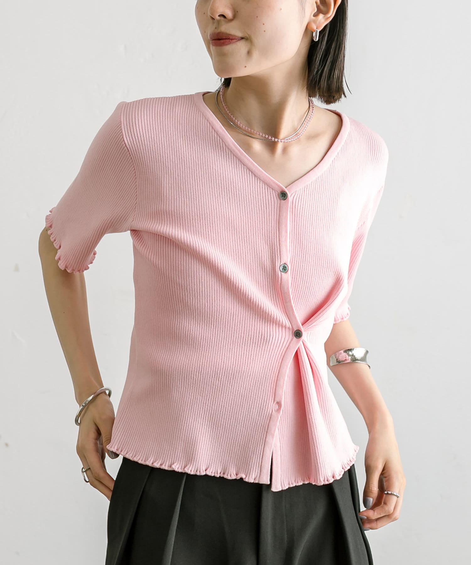 ・半袖には裾や袖口部分にフリルが付いており、レイヤードボタンカーディガンとは違った雰囲気で楽しんでいただけます。