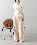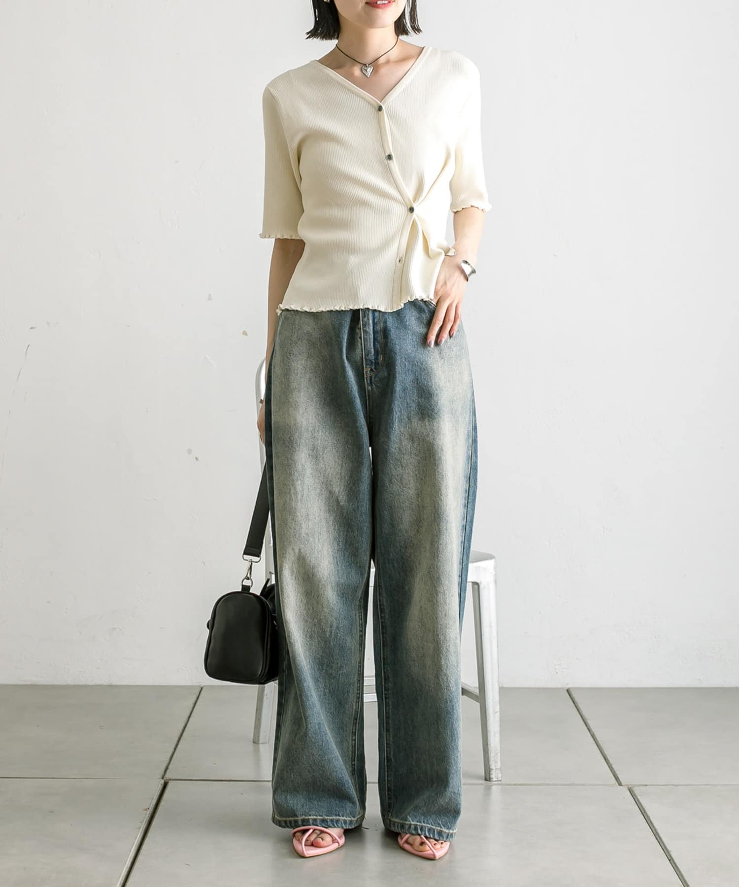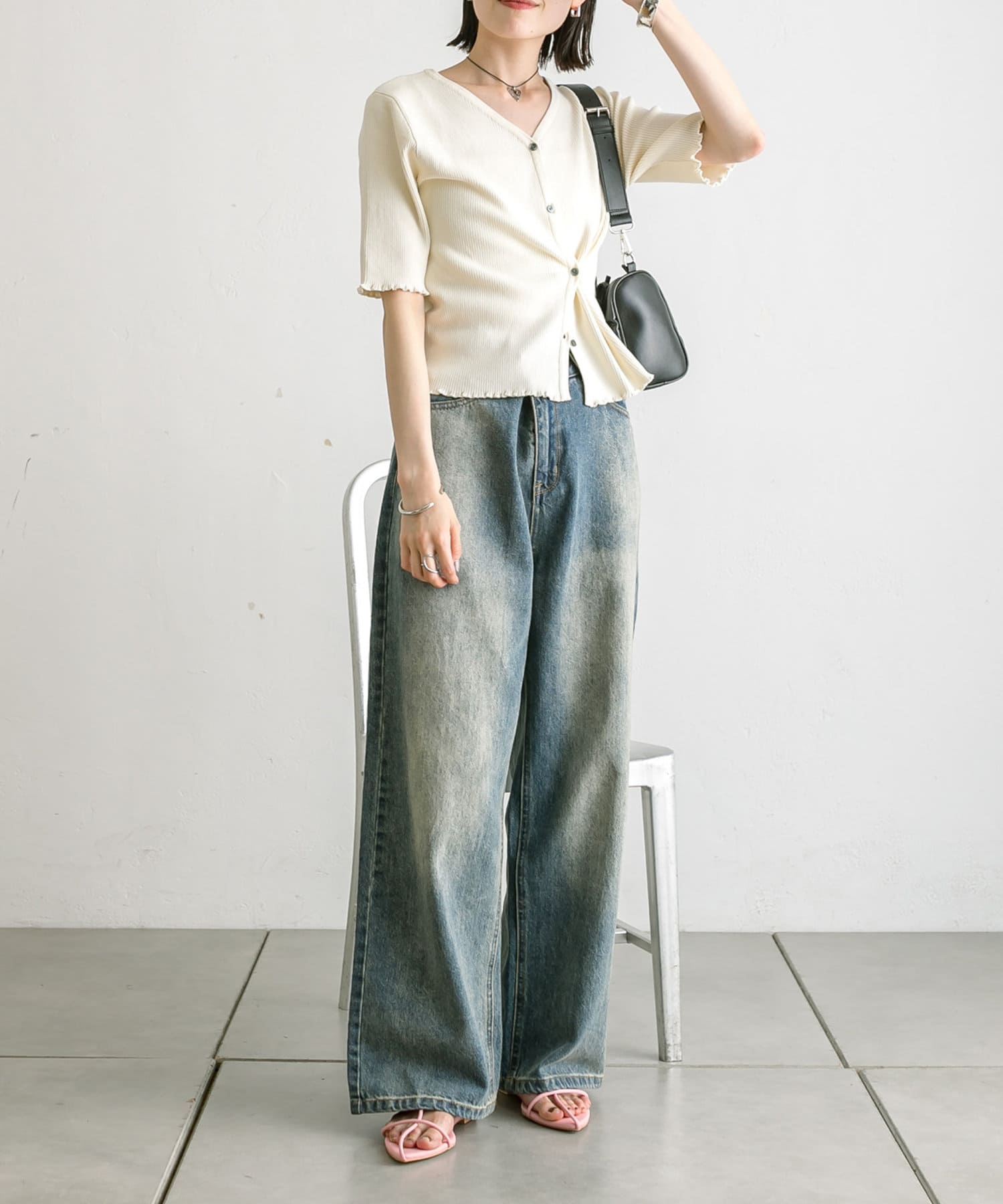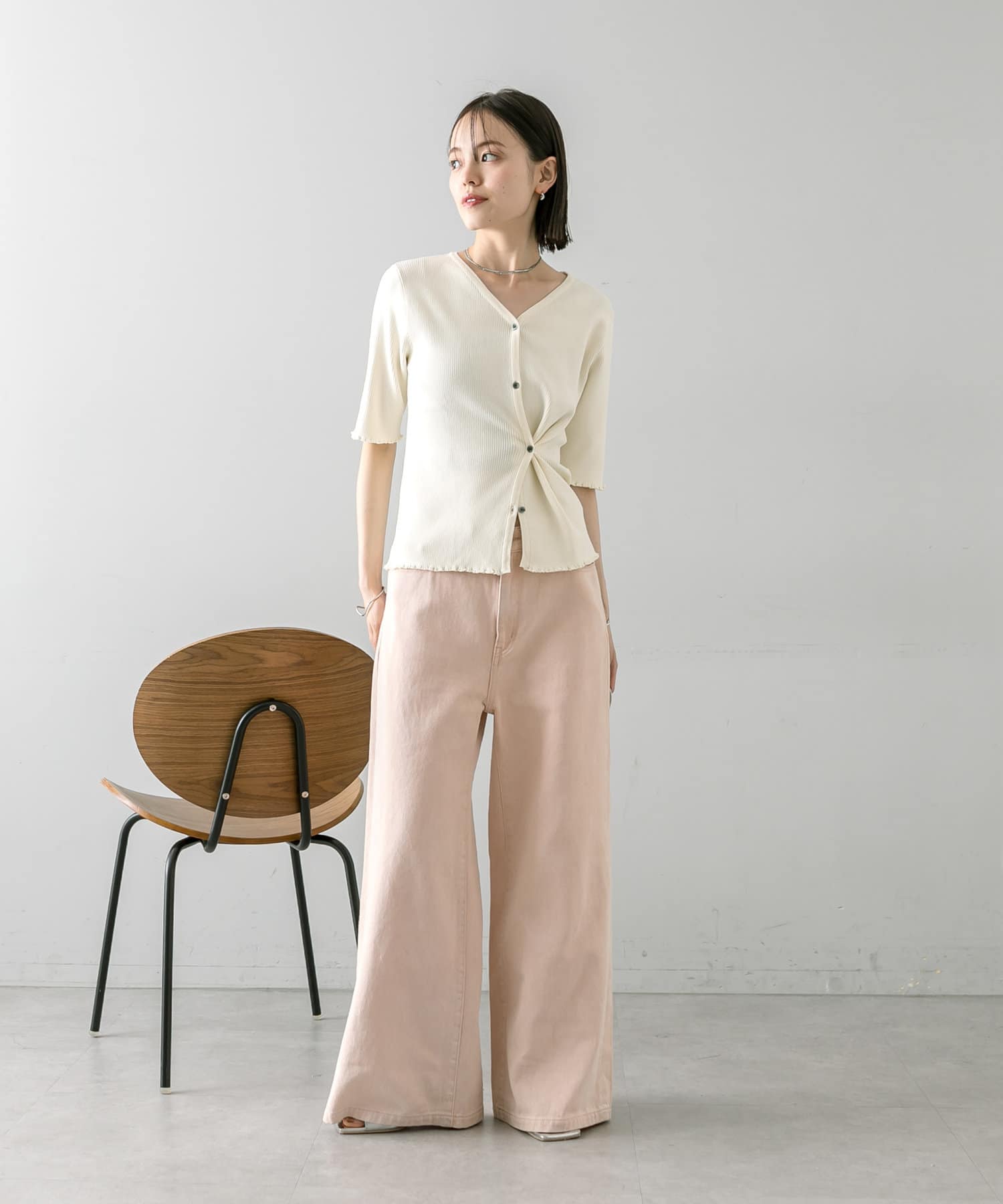 ・半袖には裾や袖口部分にフリルが付いており、レイヤードボタンカーディガンとは違った雰囲気で楽しんでいただけます。