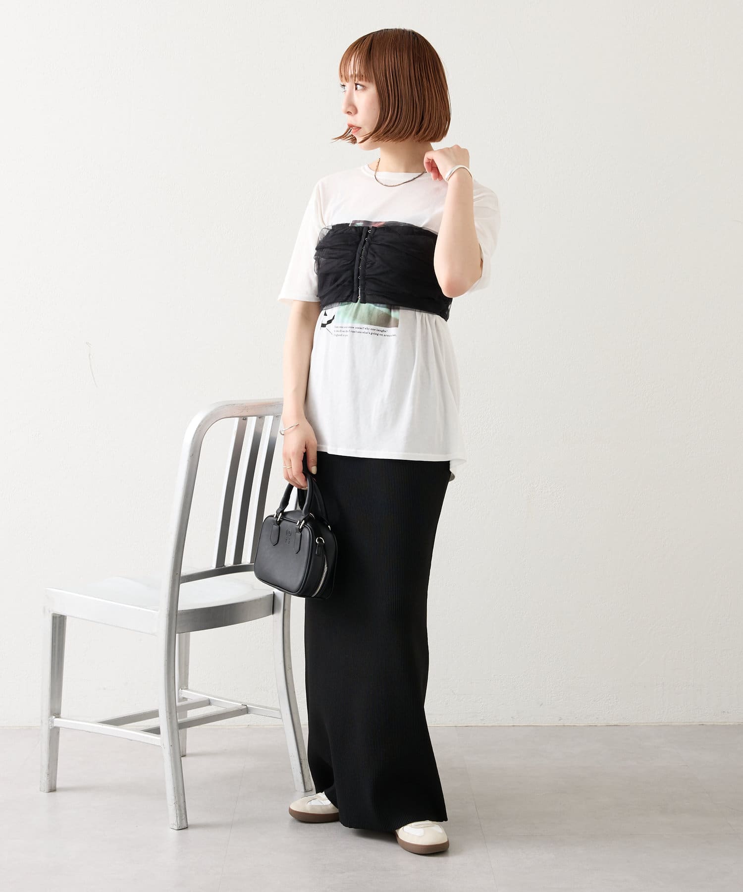・女性らしいアイテムやツヤ感のあるアイテムとスタイリングさせてもバランスの取れる一枚です◎