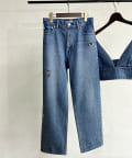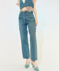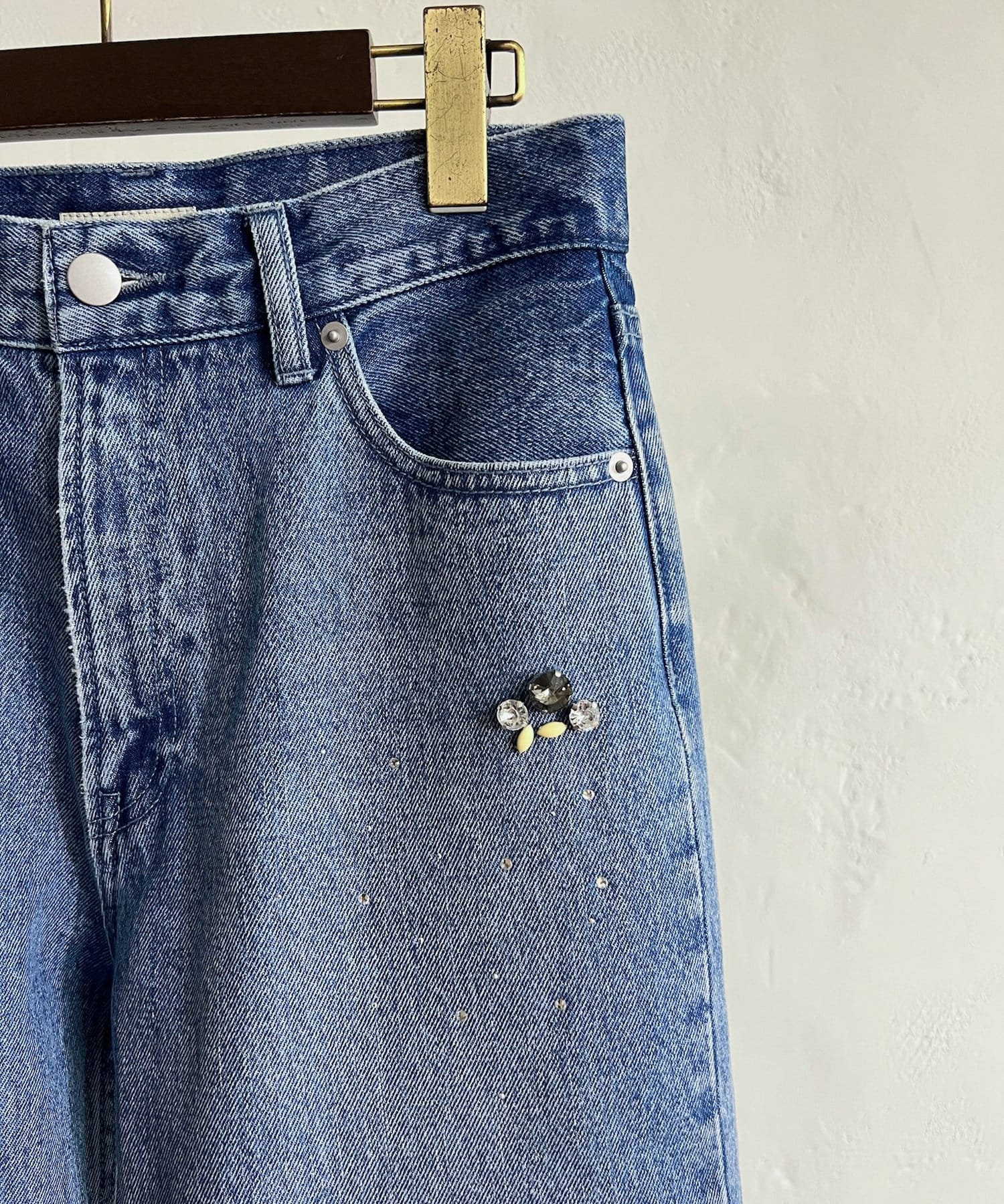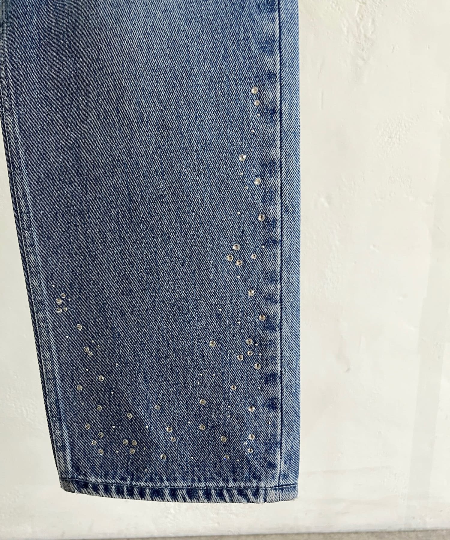 ・裾やもも付近に施されたビジューがベーシックなデニムと雰囲気を変えて着ていただけます。