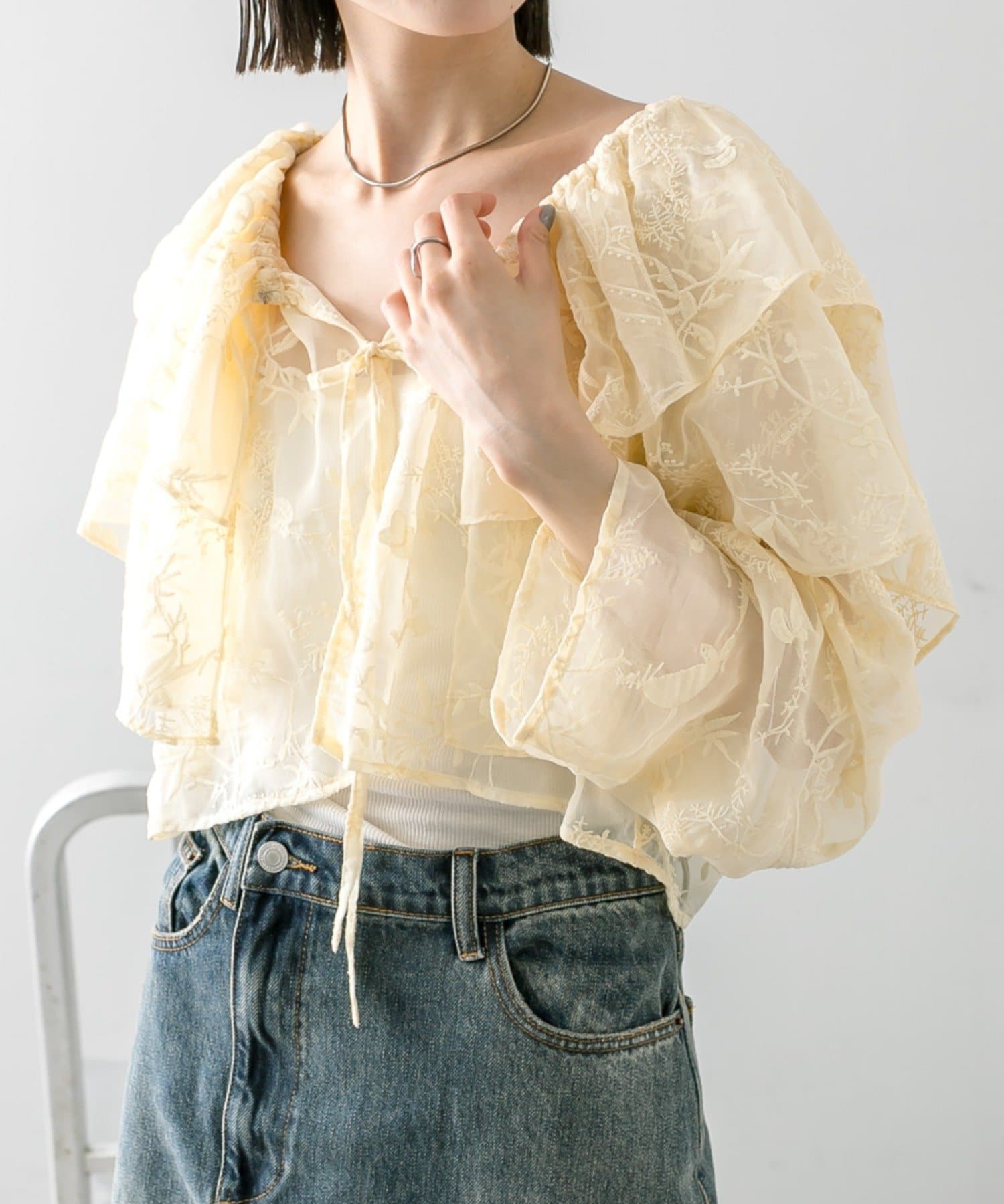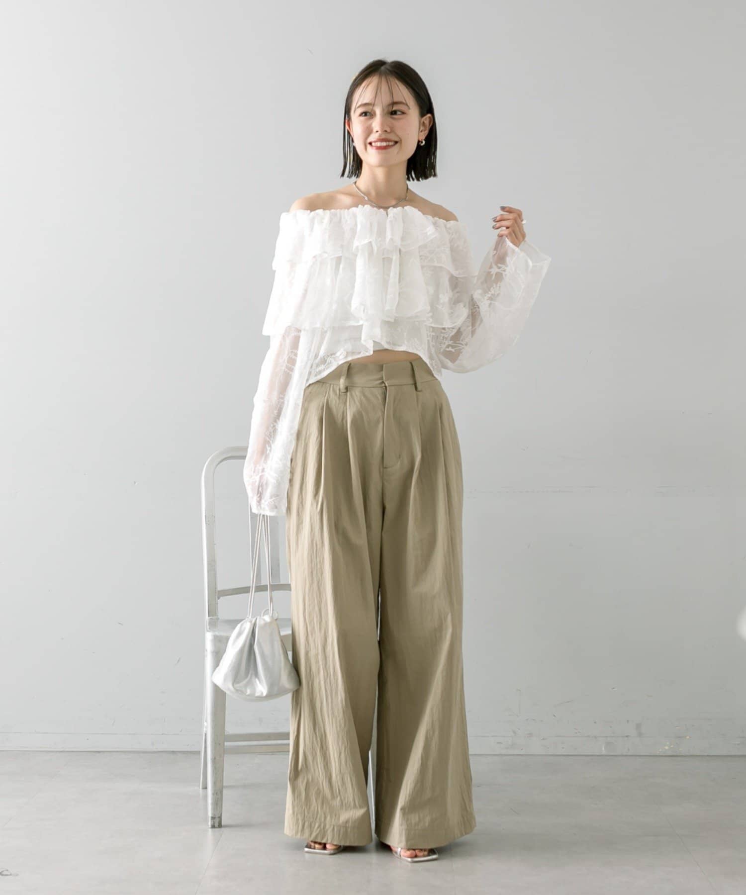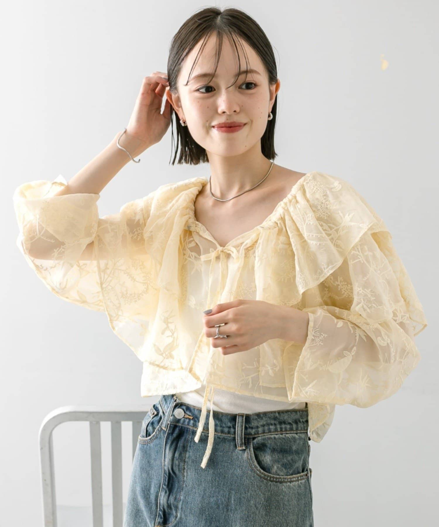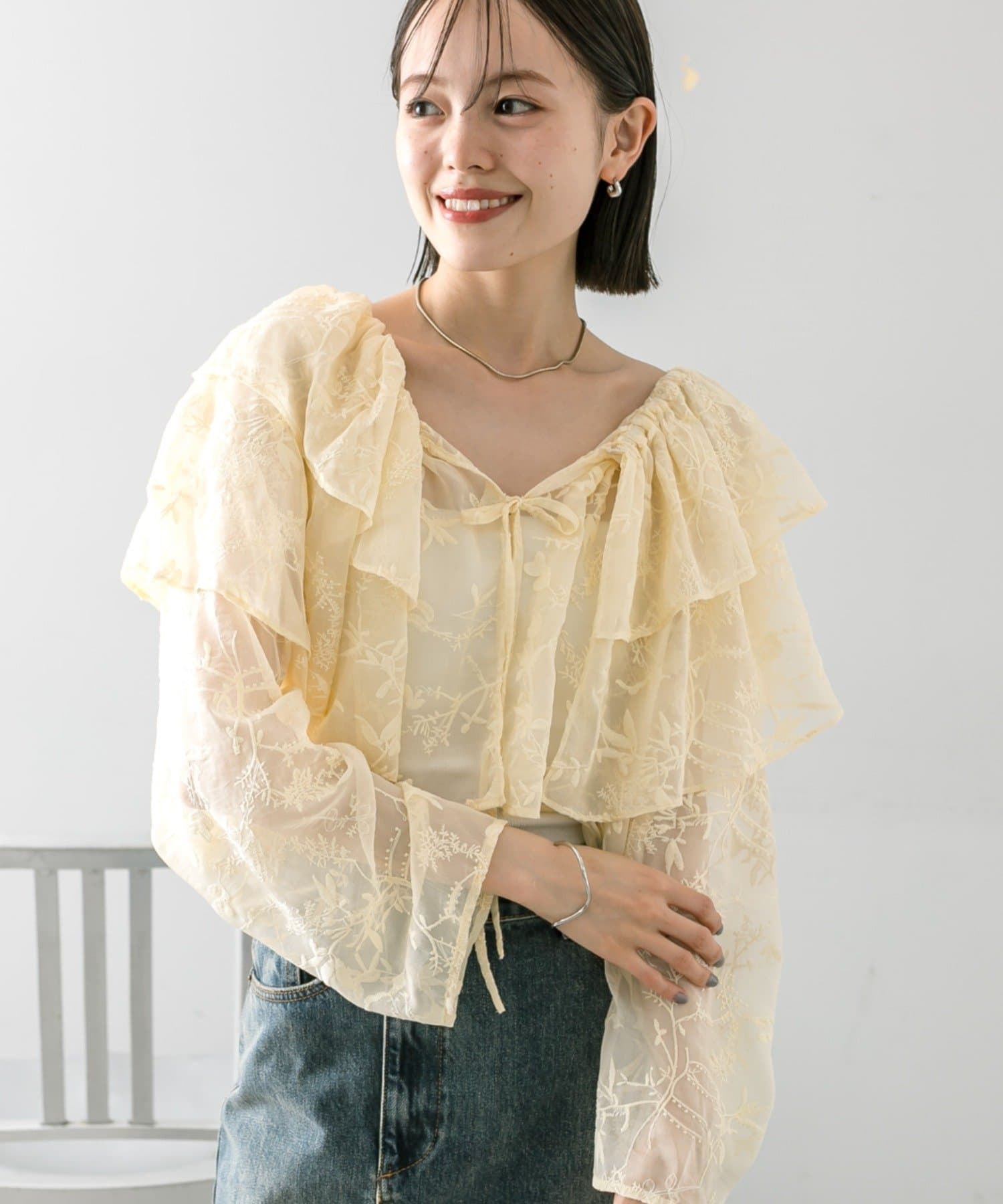 胸元のフリルが春らしい華やかさをプラスしてくれるブラウス。