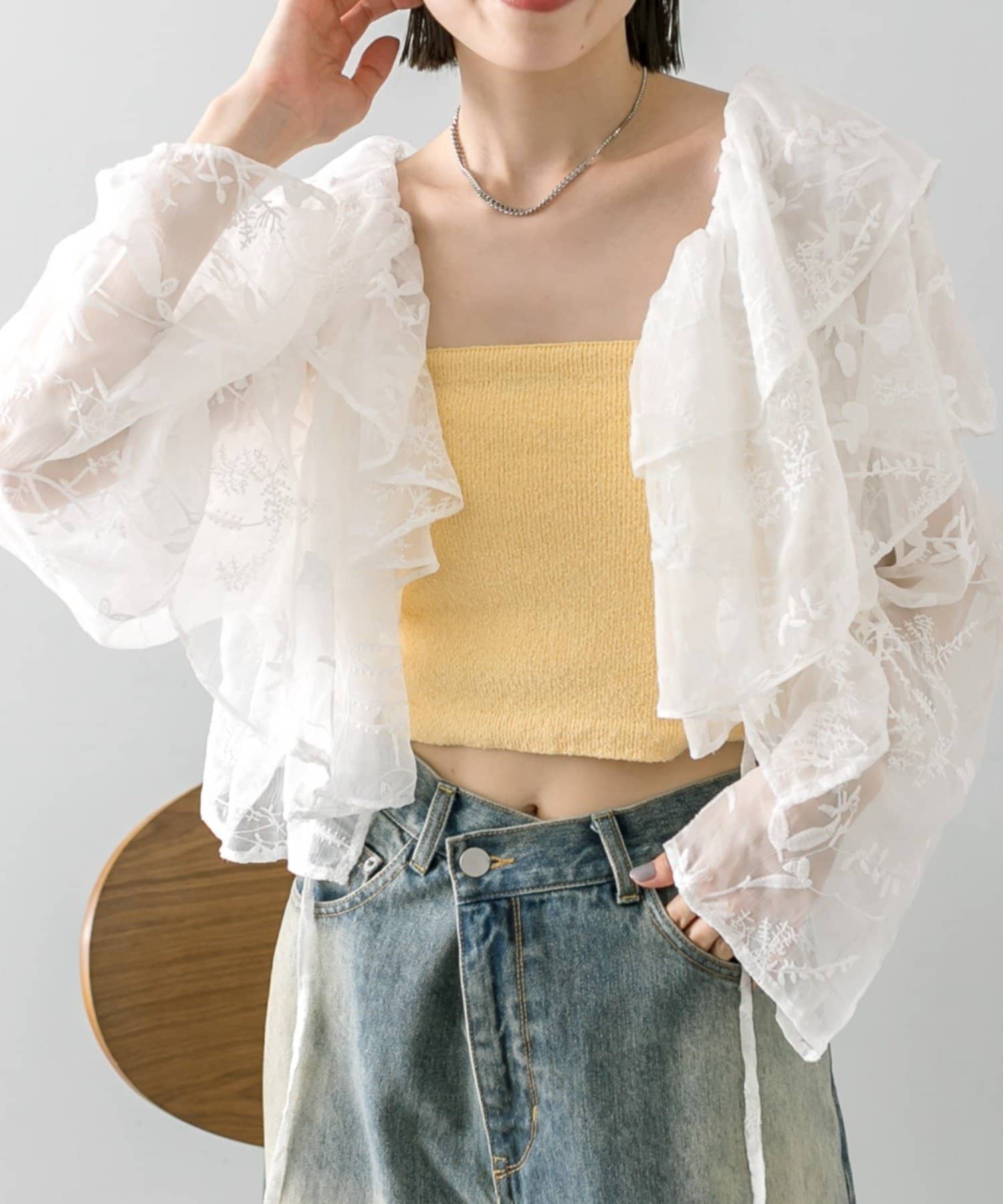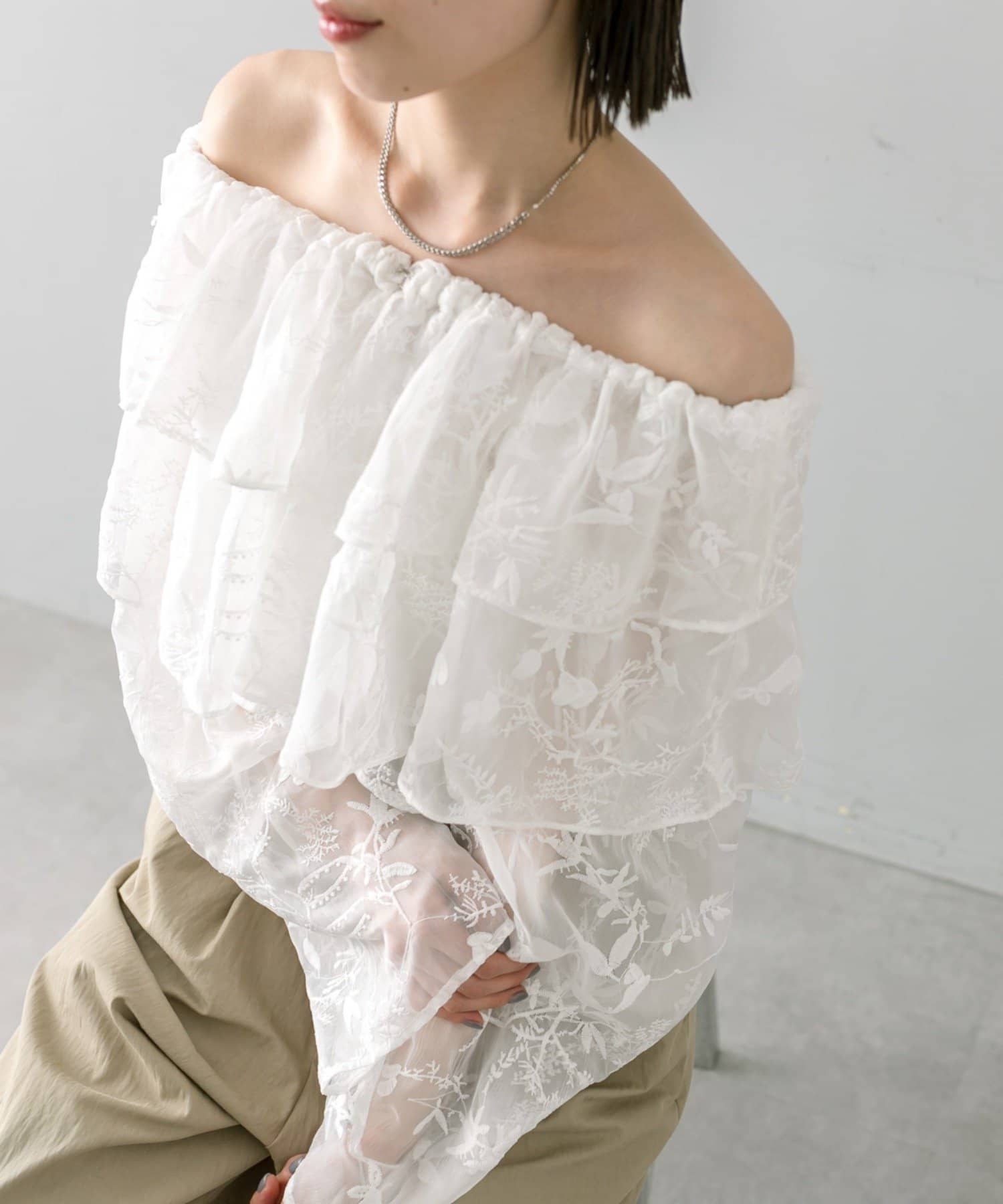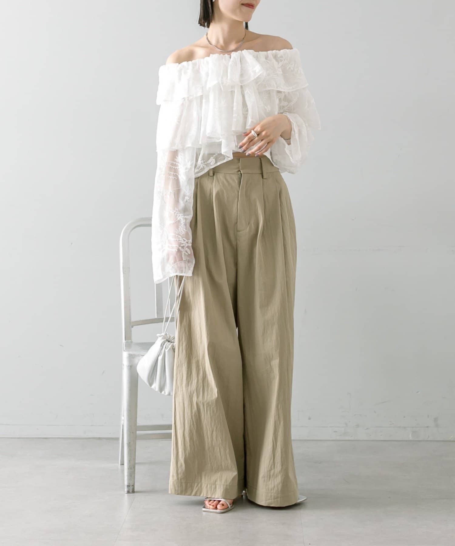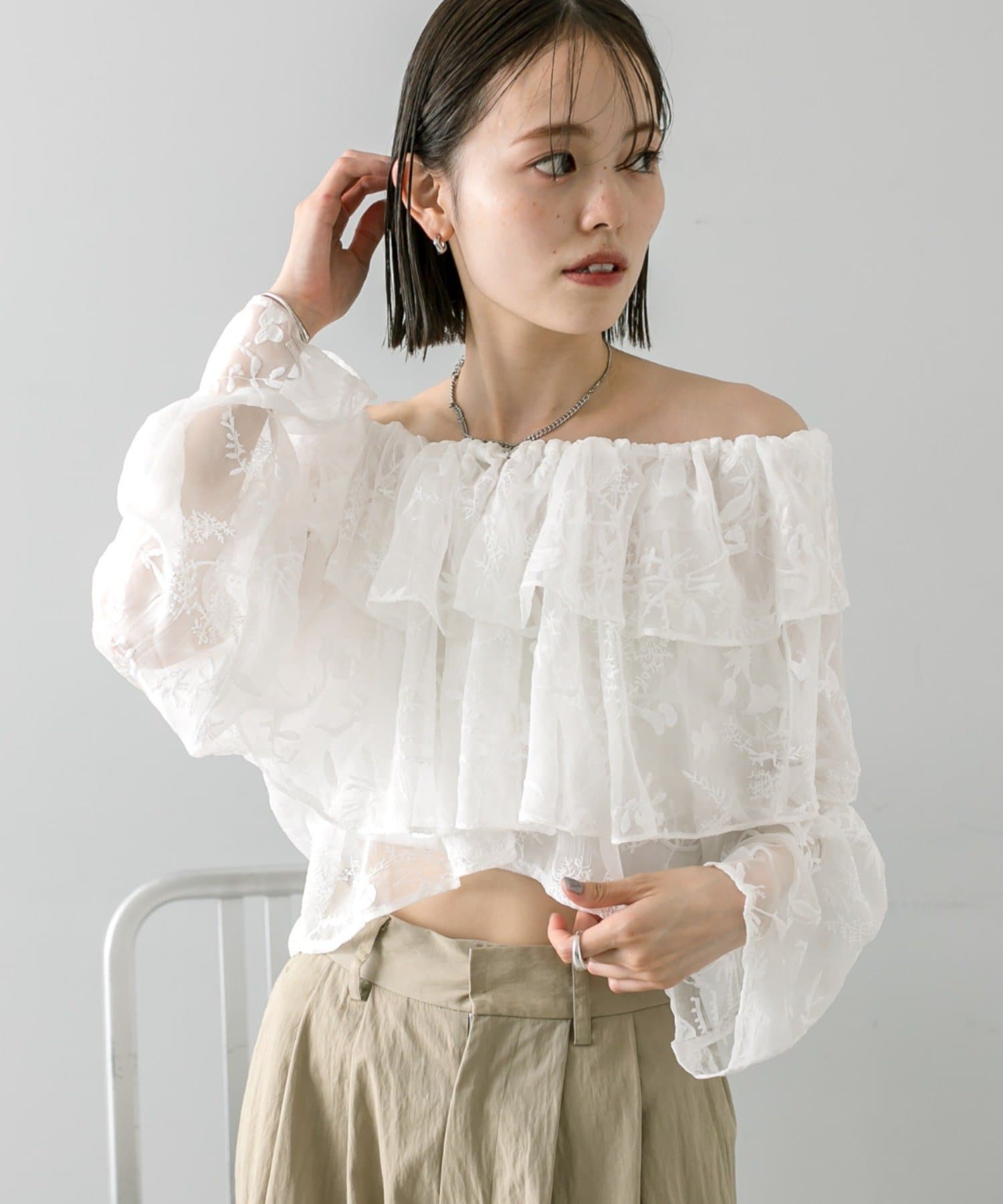 胸元のフリルが春らしい華やかさをプラスしてくれるブラウス。