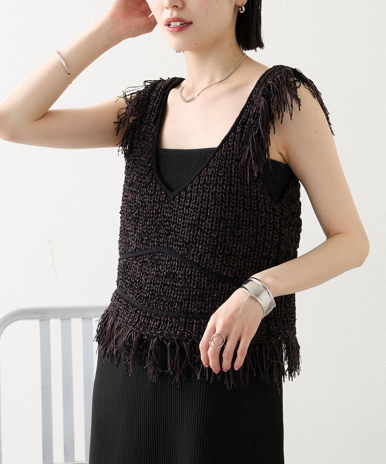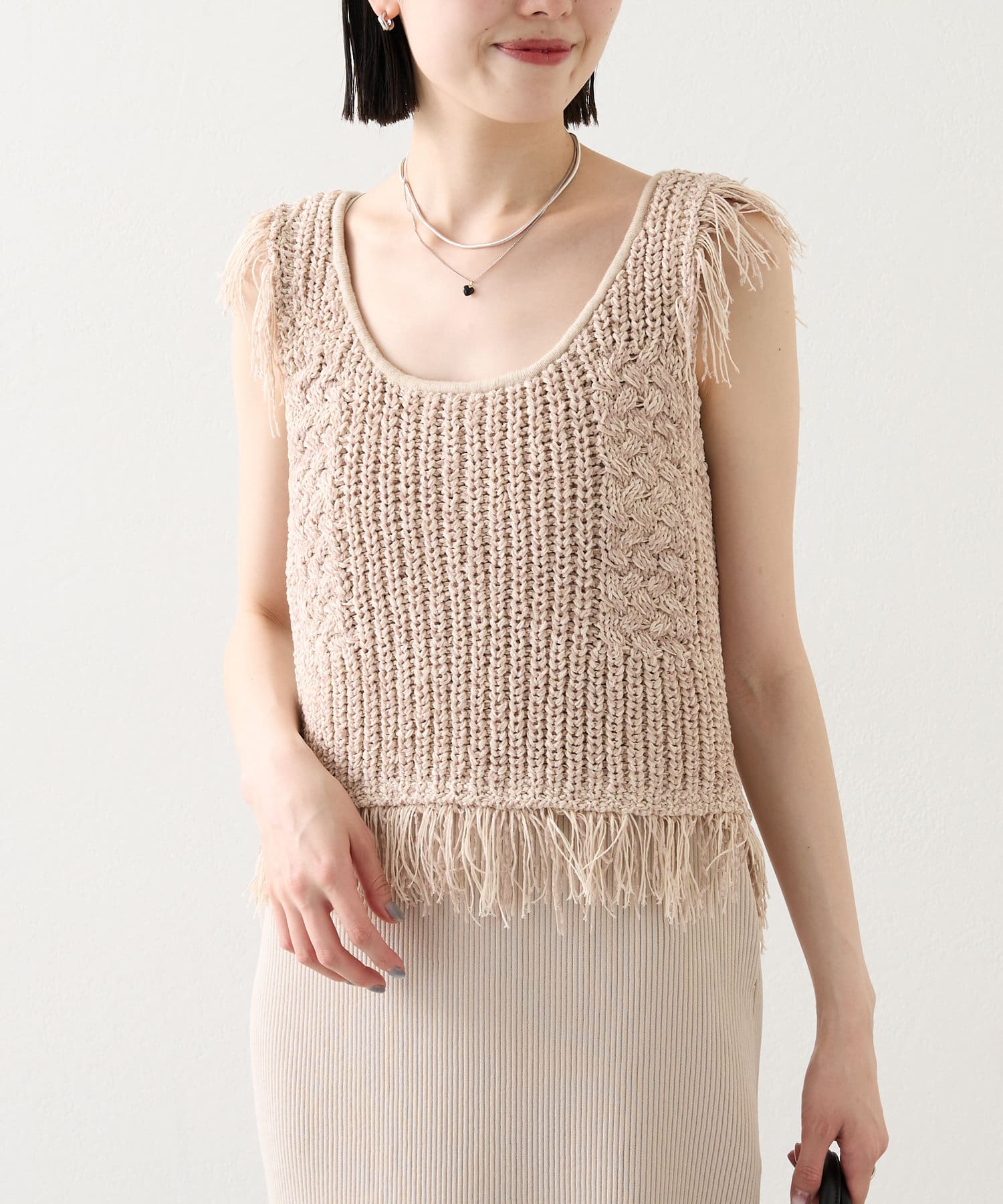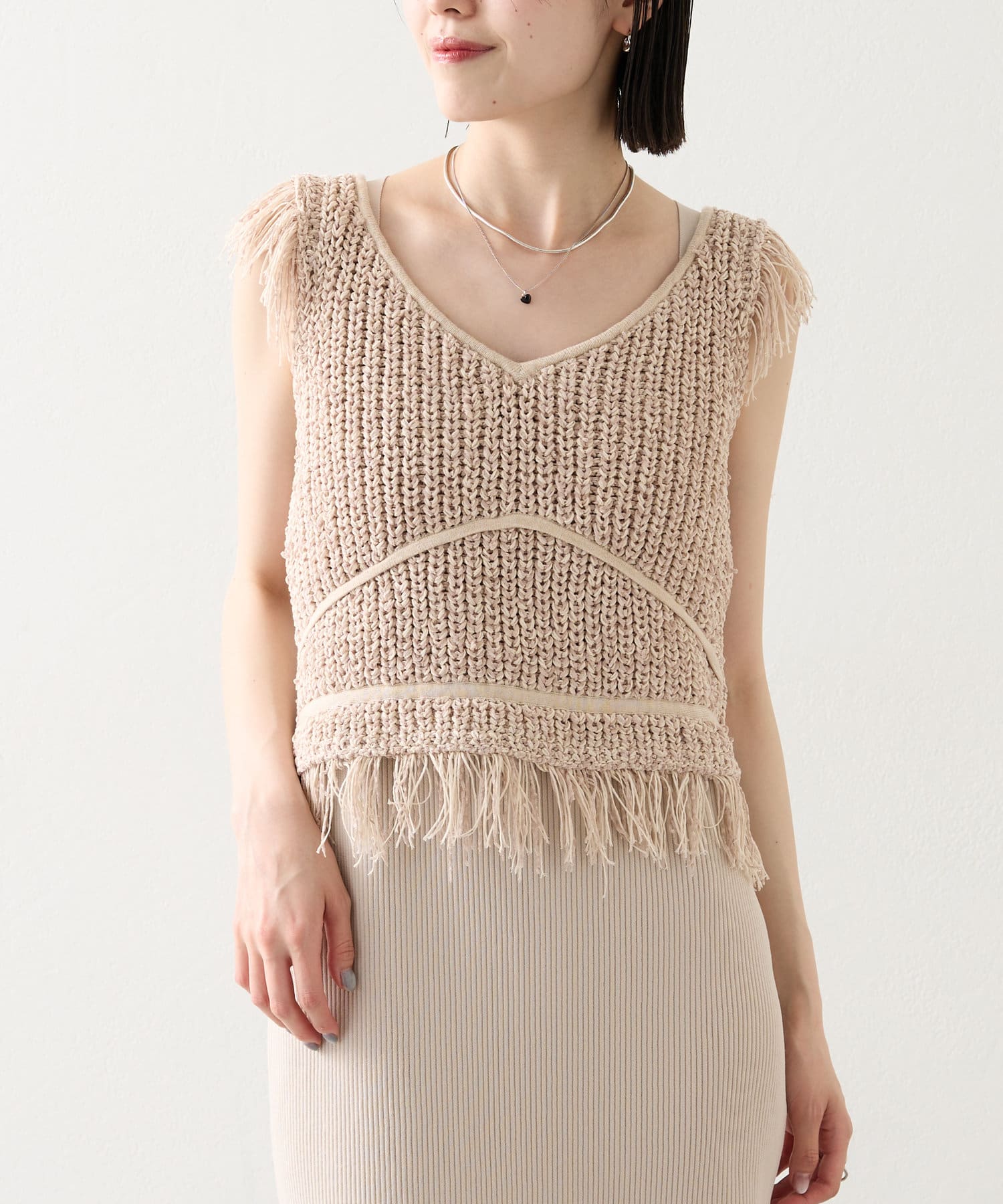 ・ショート丈のフリンジニットがセットアイテムとなっております。