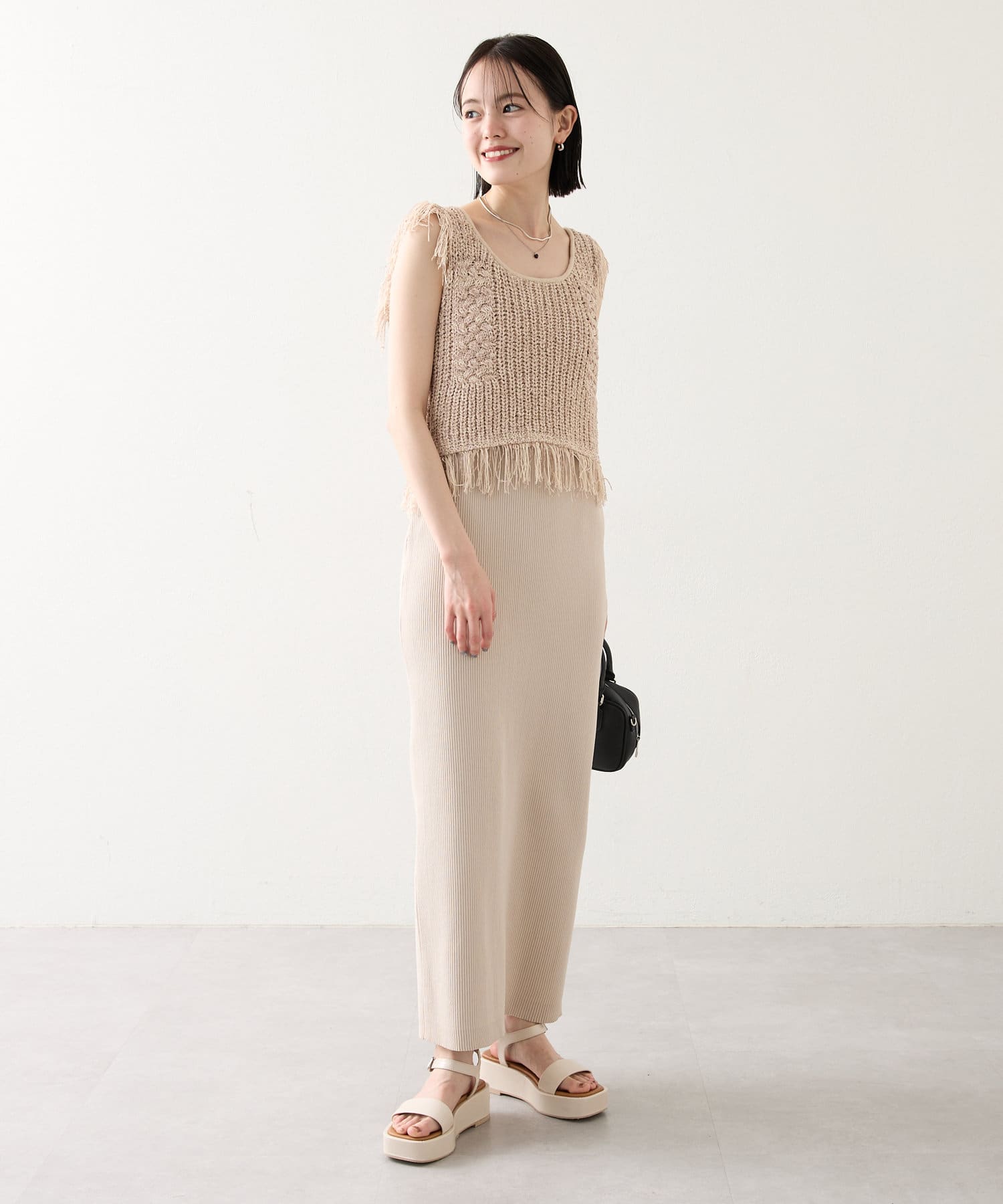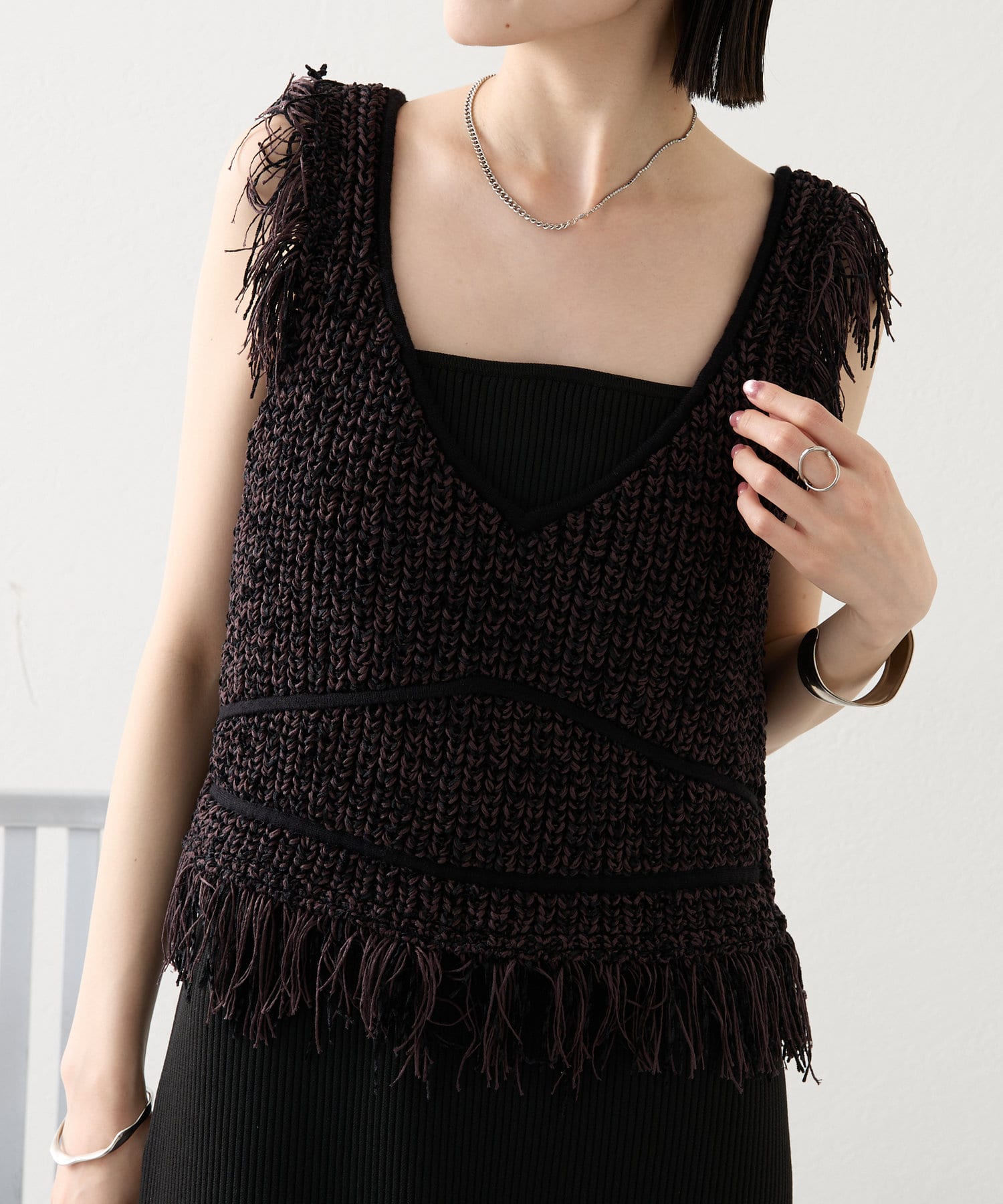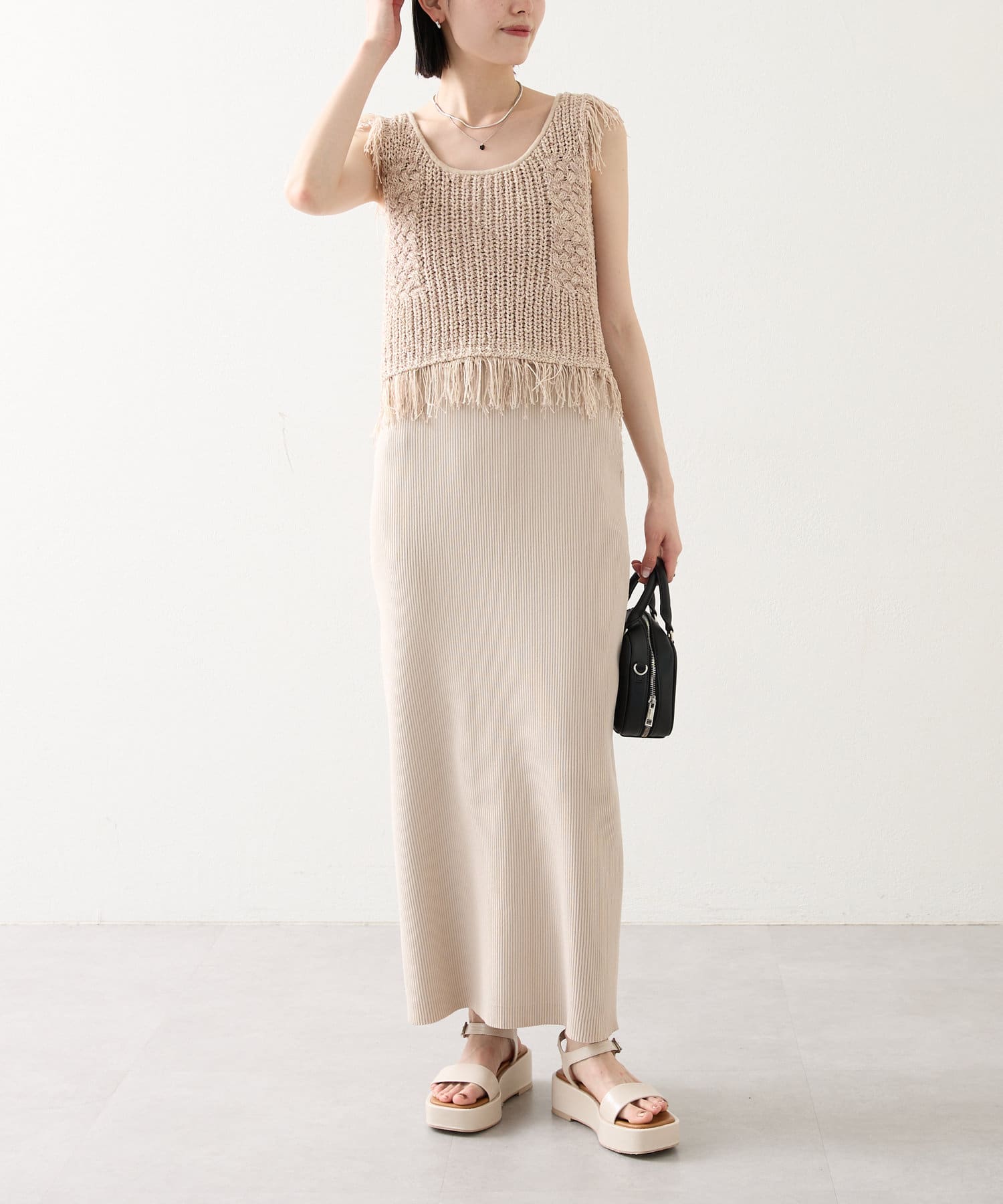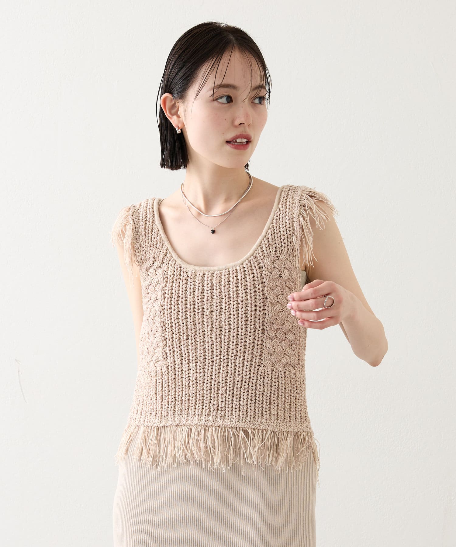 ・ショート丈のフリンジニットがセットアイテムとなっております。