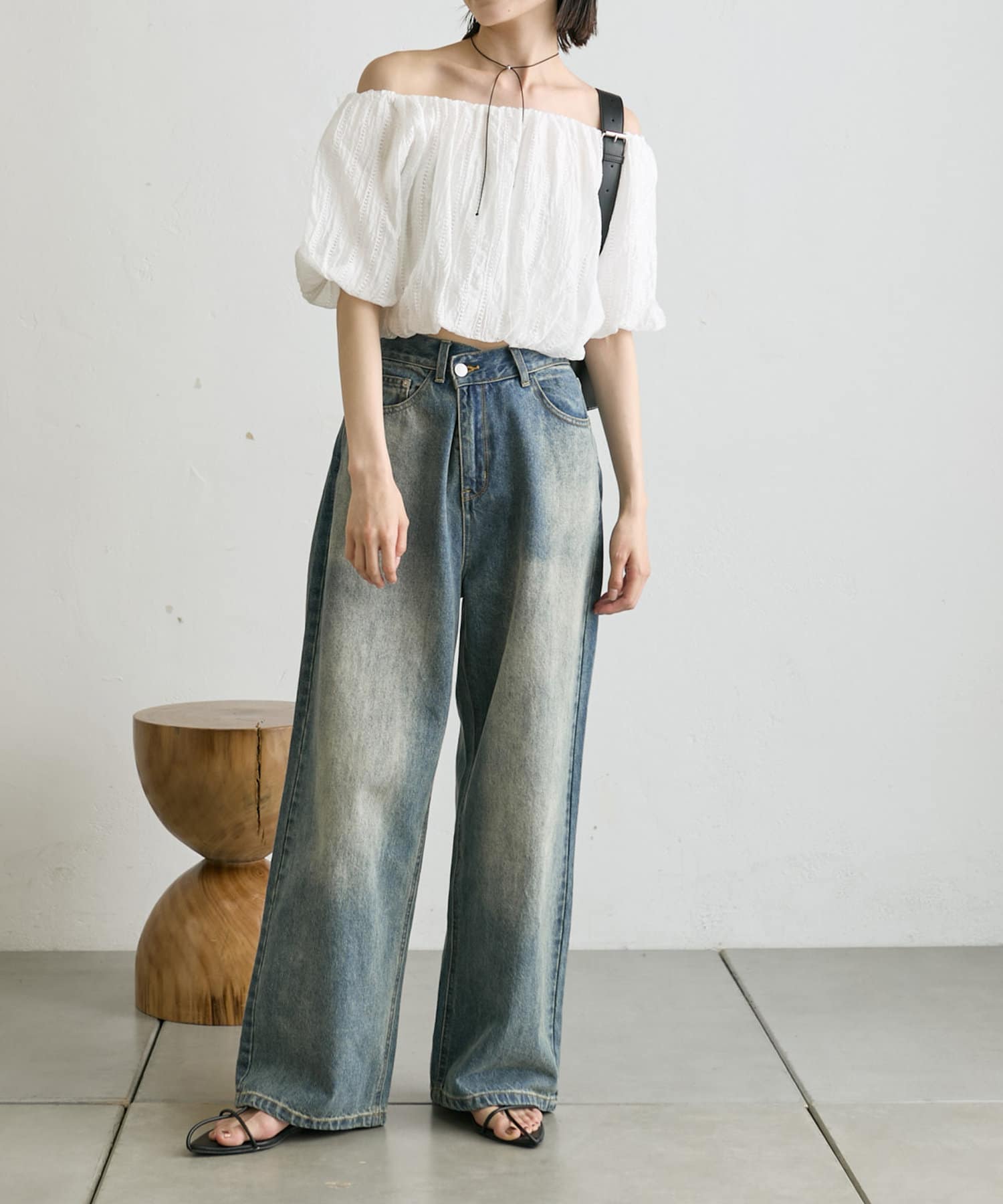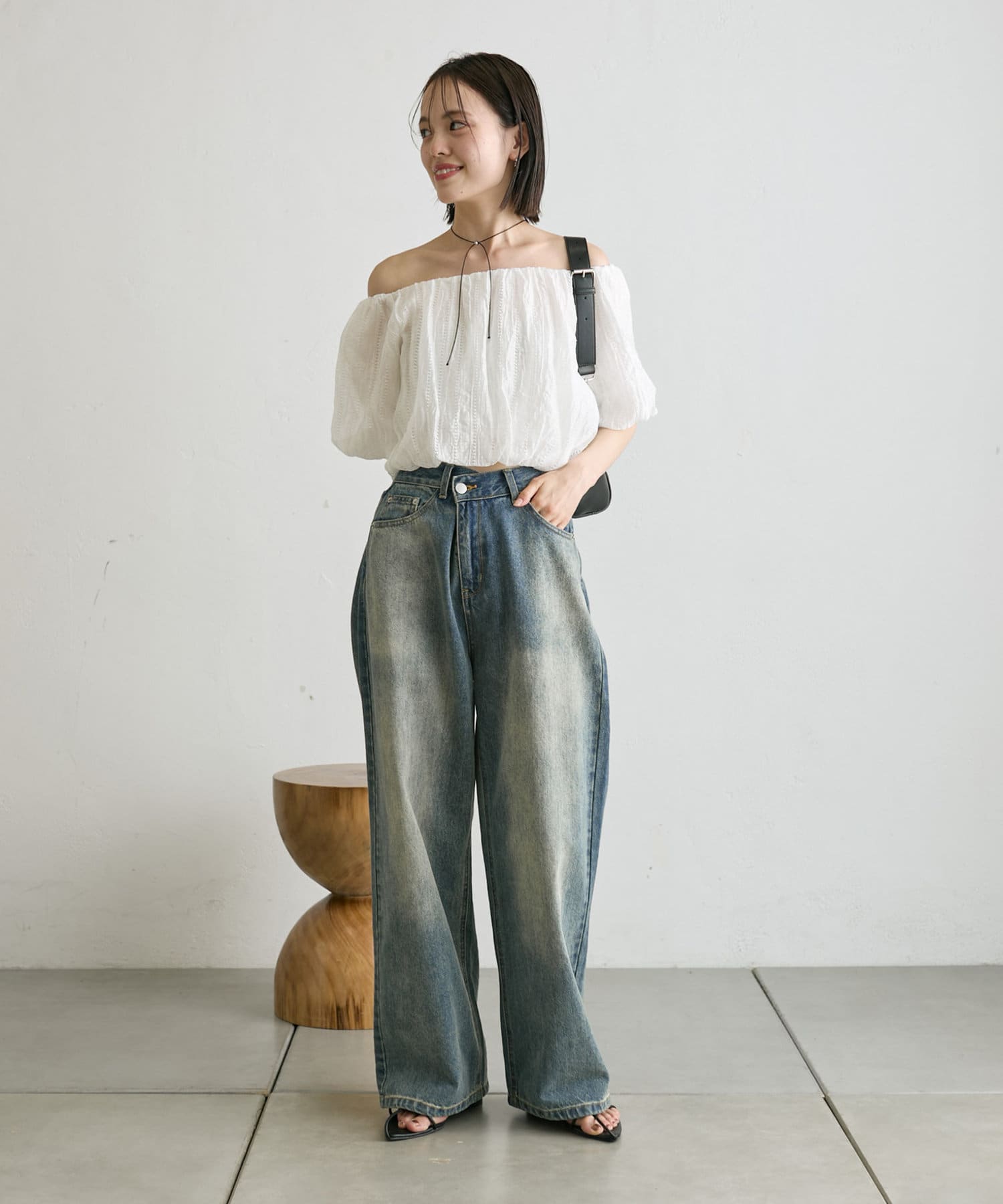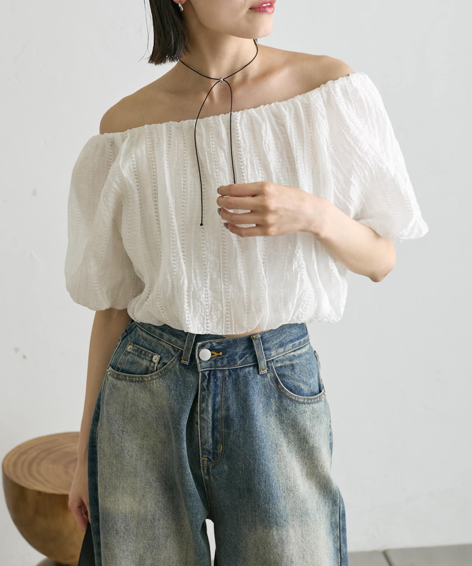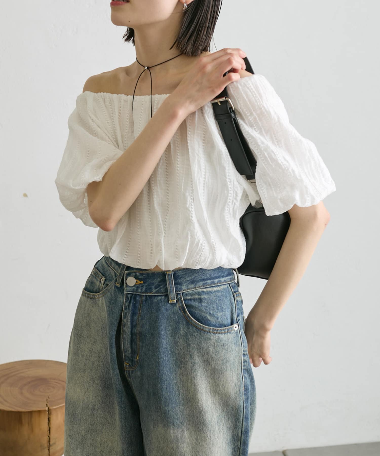 ・表面感のあるブラウスがカジュアルなボトムスでも女性らしく見せてくれます。